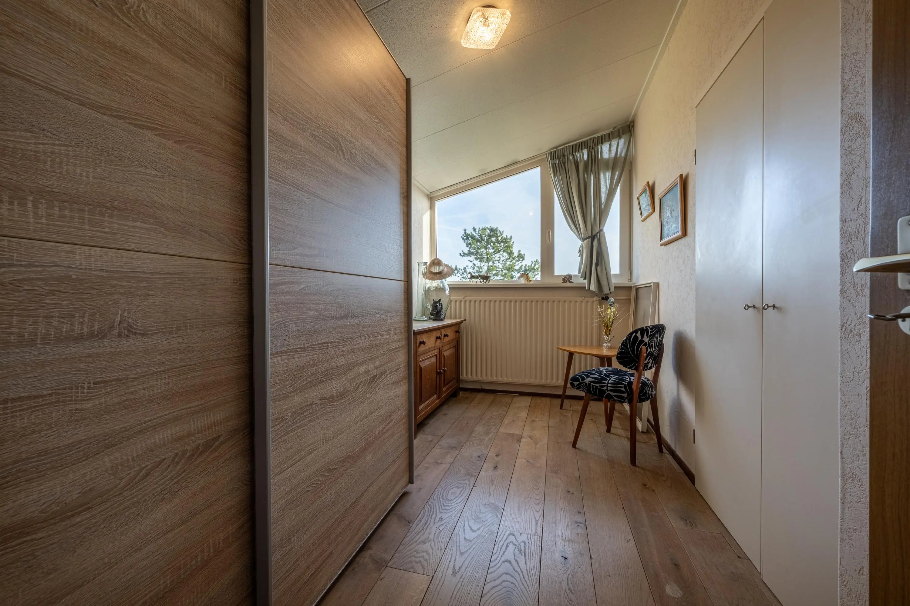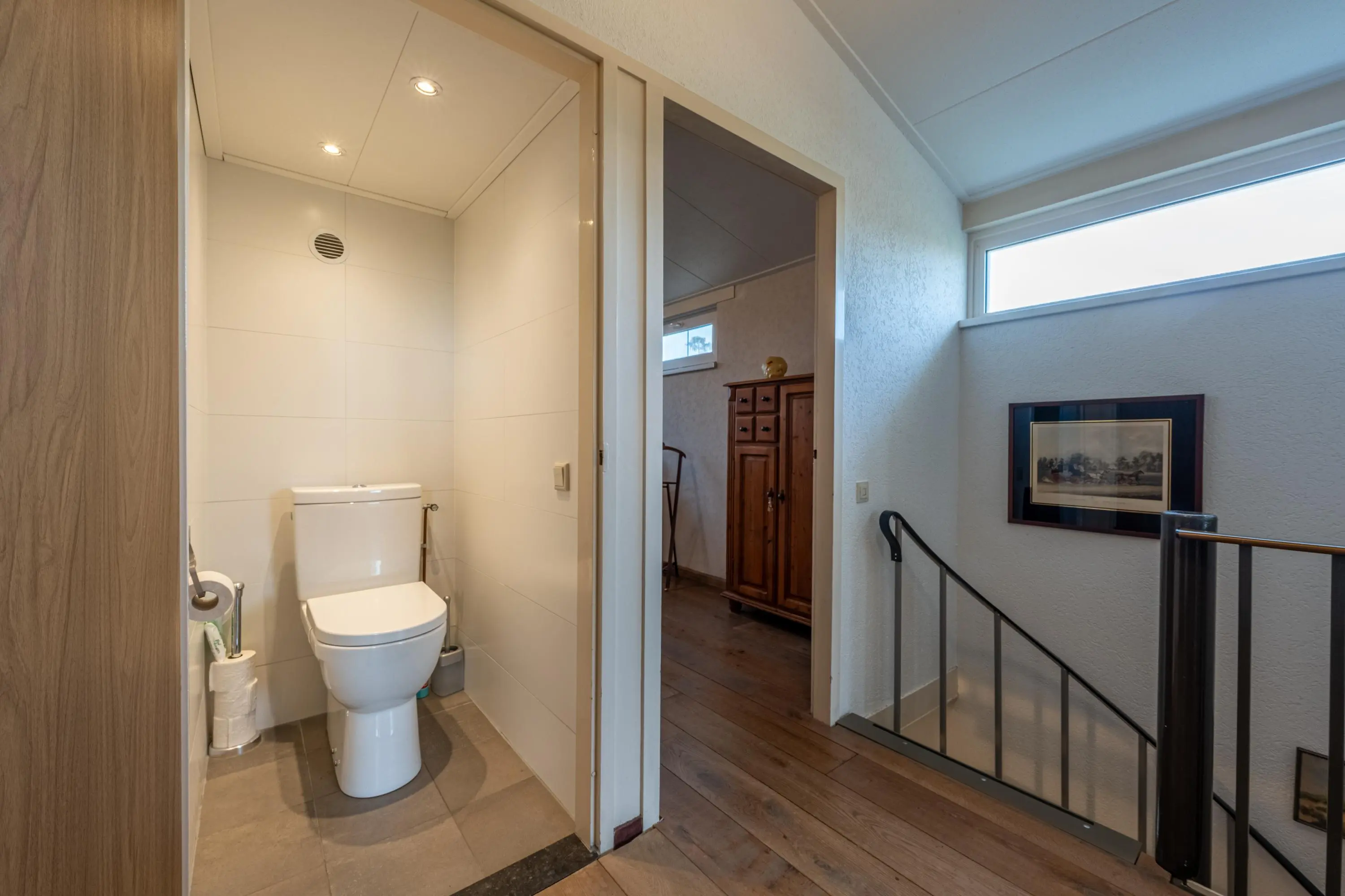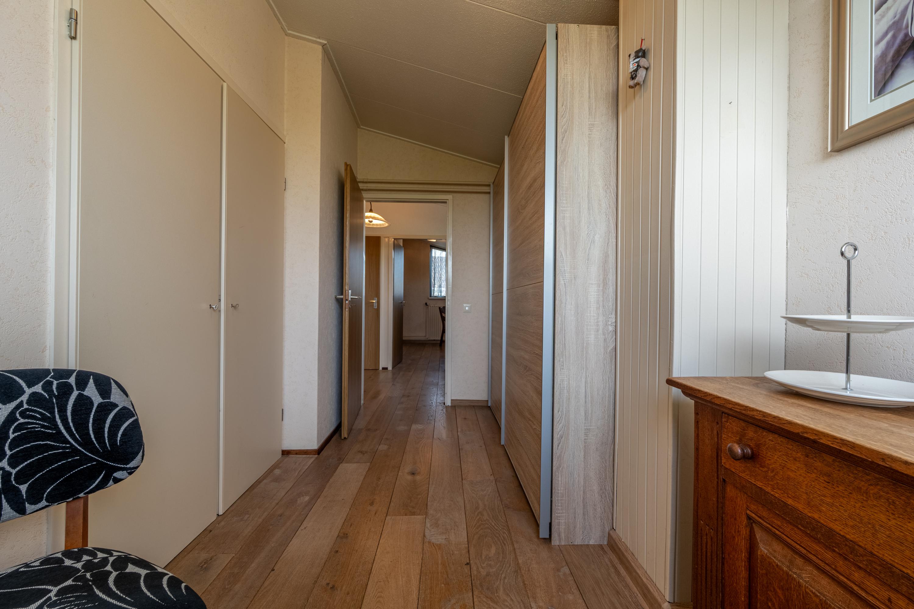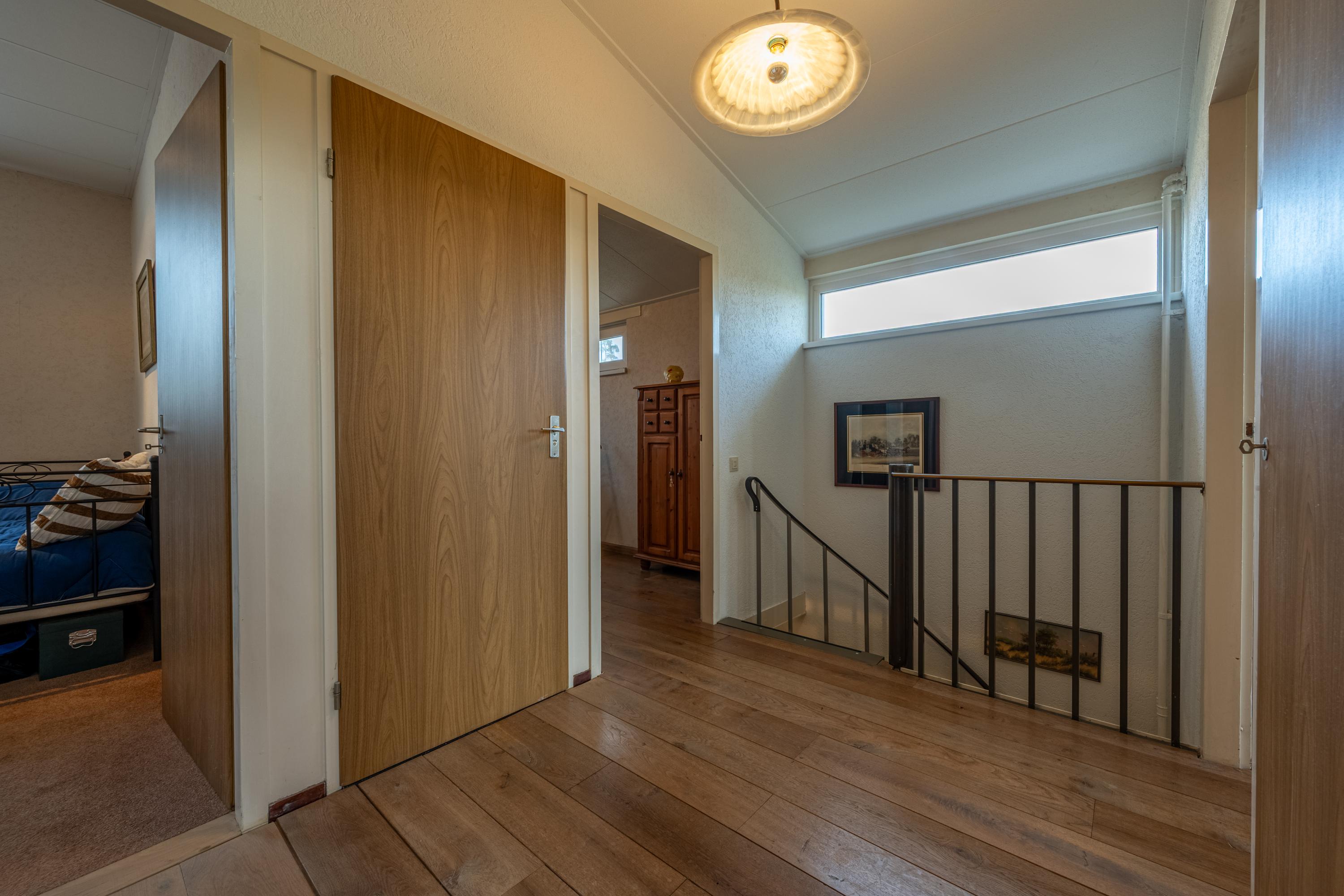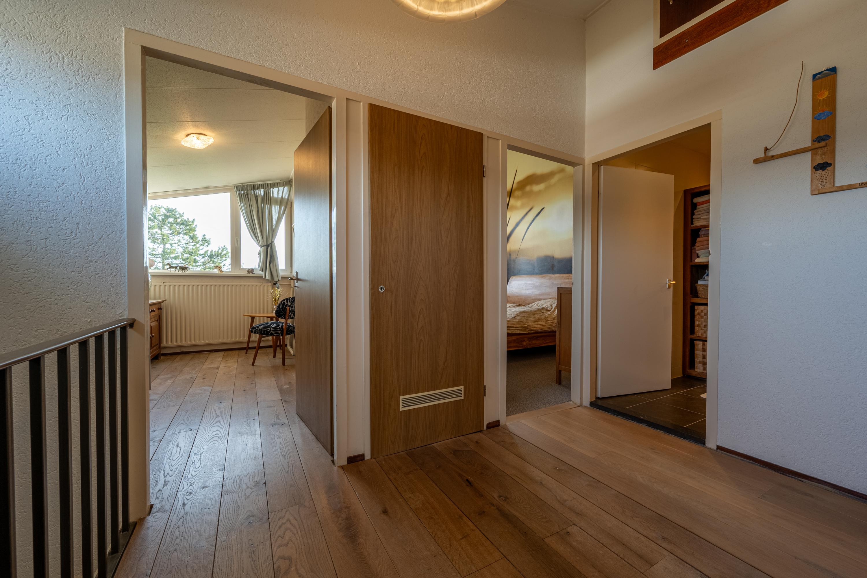 Via de overloop is er toegang tot vier slaapkamers, een badkamer, een separate toiletruimte en een vaste bergkast.