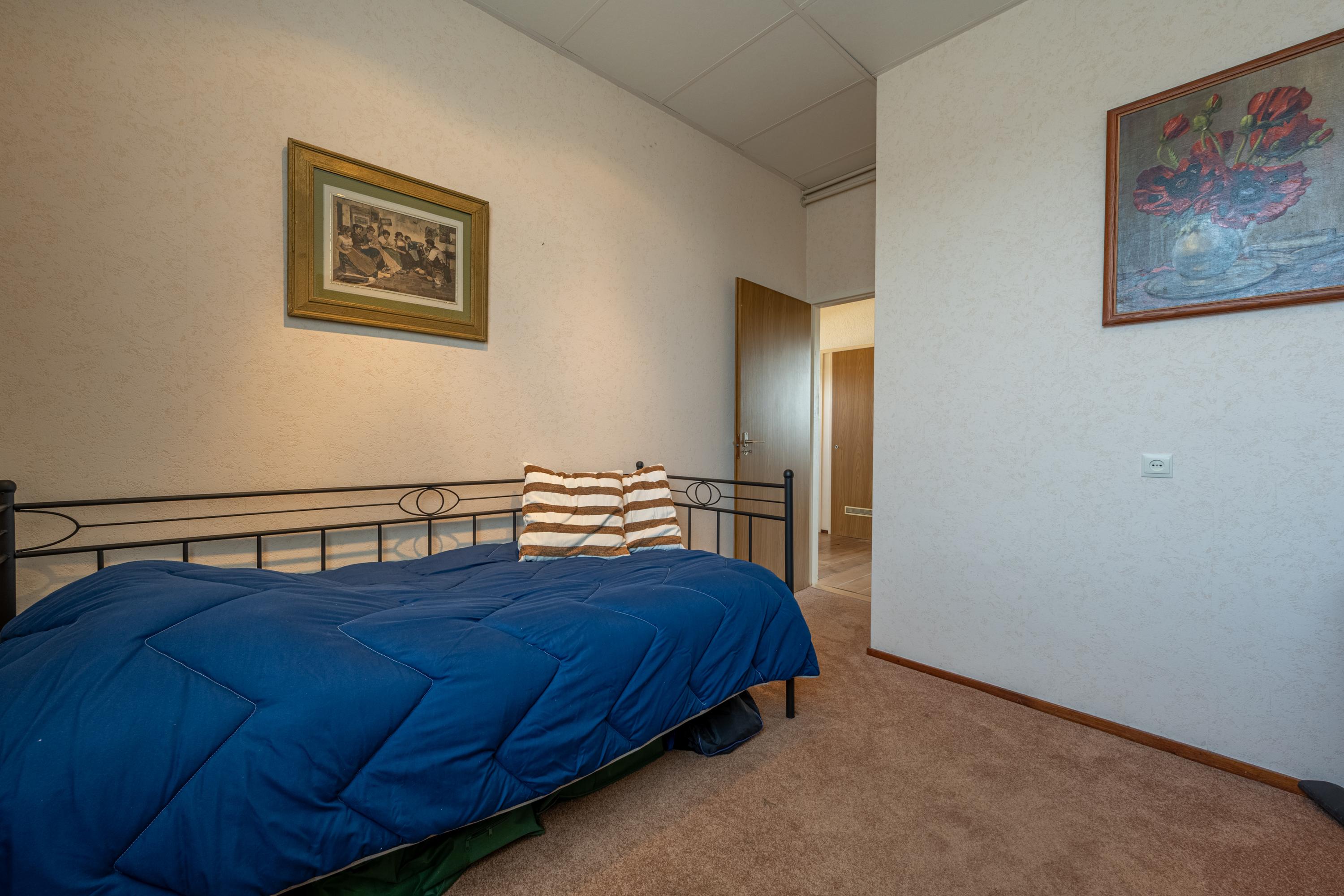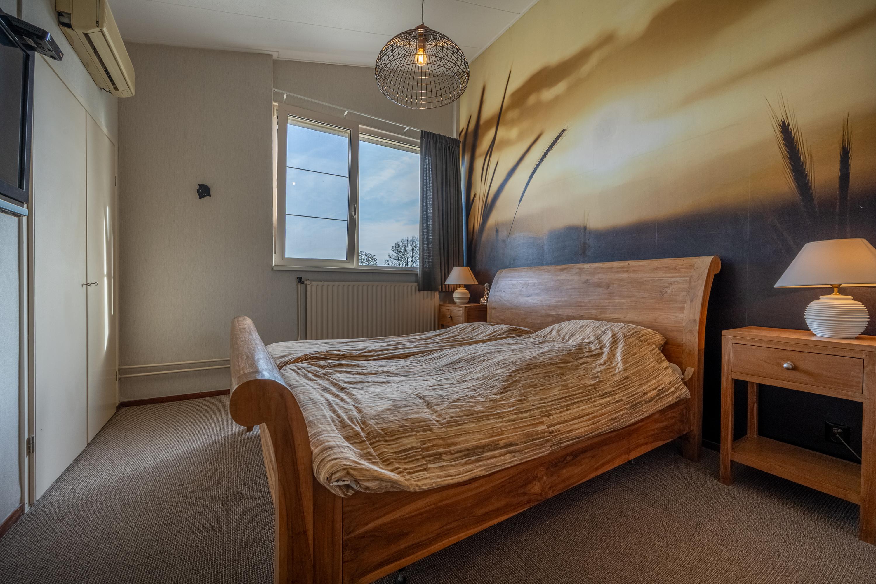 De hoofdslaapkamer is voorzien van vaste kasten, een airco-unit en een karakteristiek hoog plafond wat de ruimte extra allure geeft.
