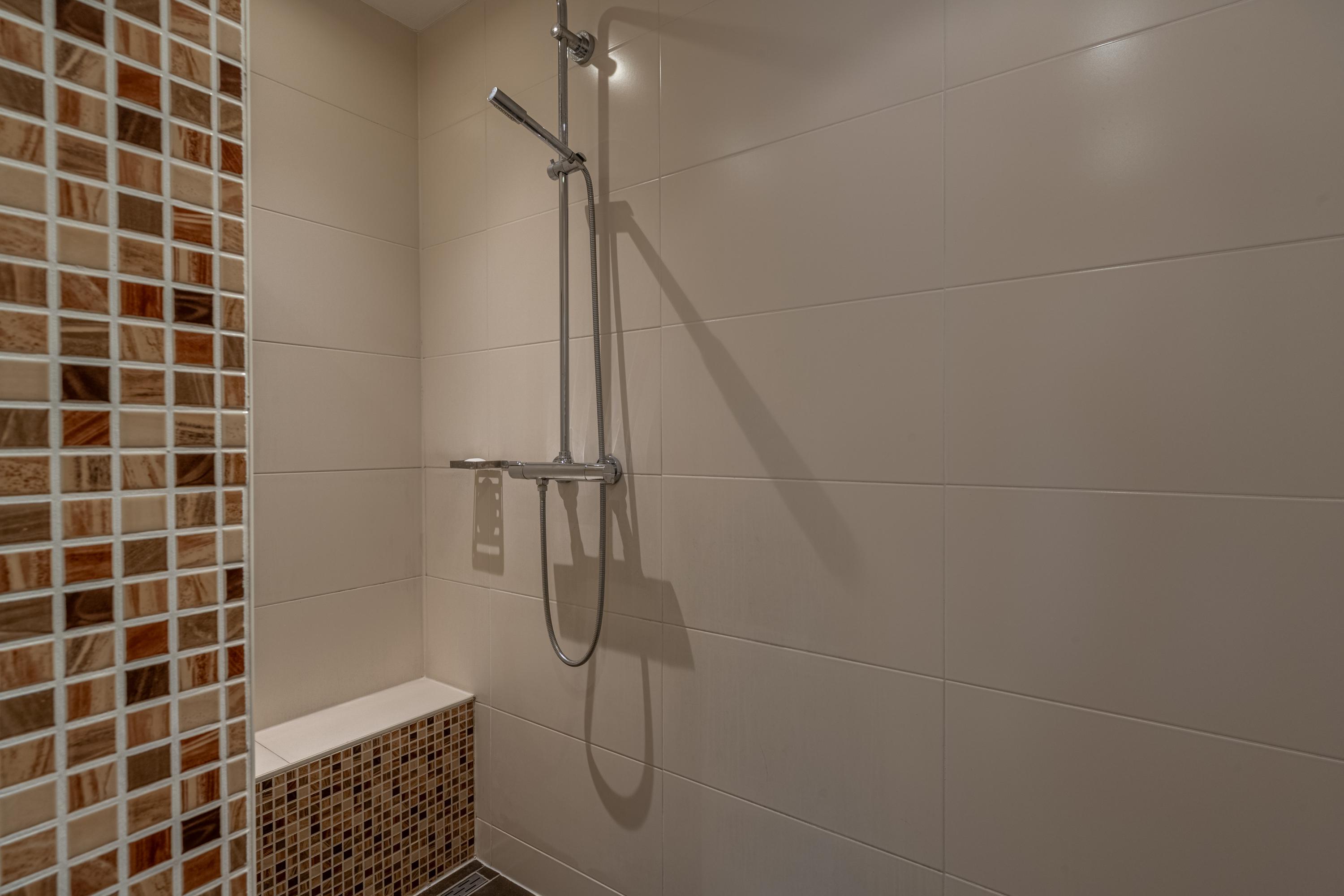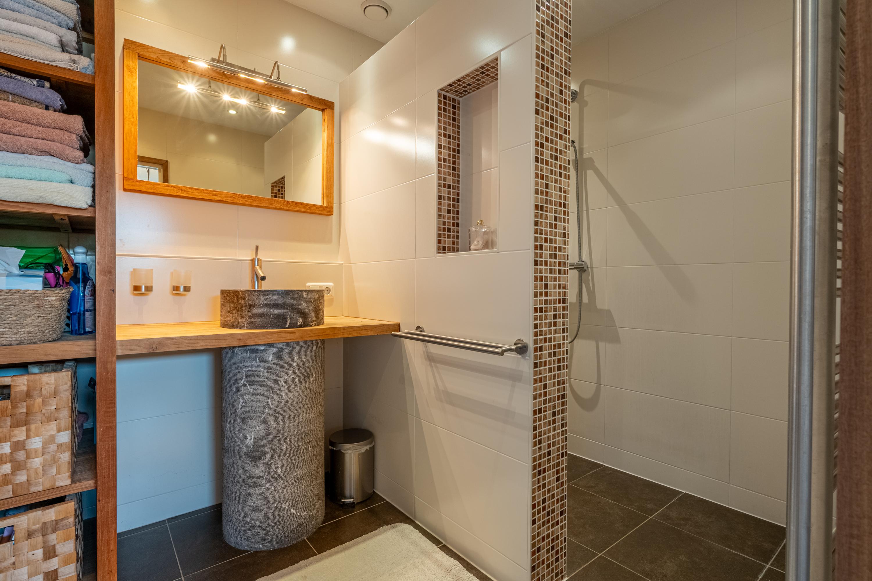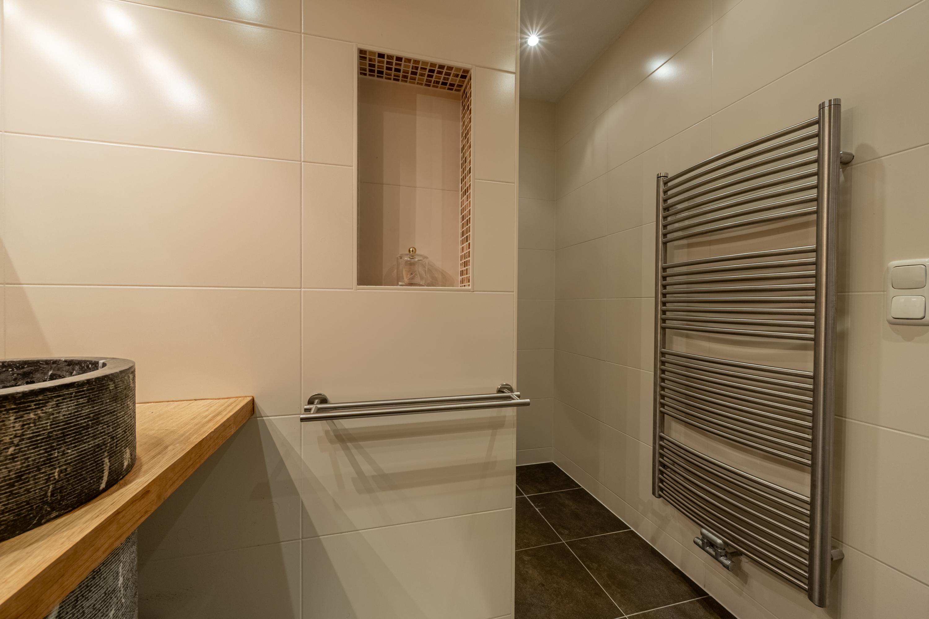De badkamer is netjes afgewerkt en uitgerust met een inloopdouche, wastafelmeubel, designradiator en mechanische ventilatie.