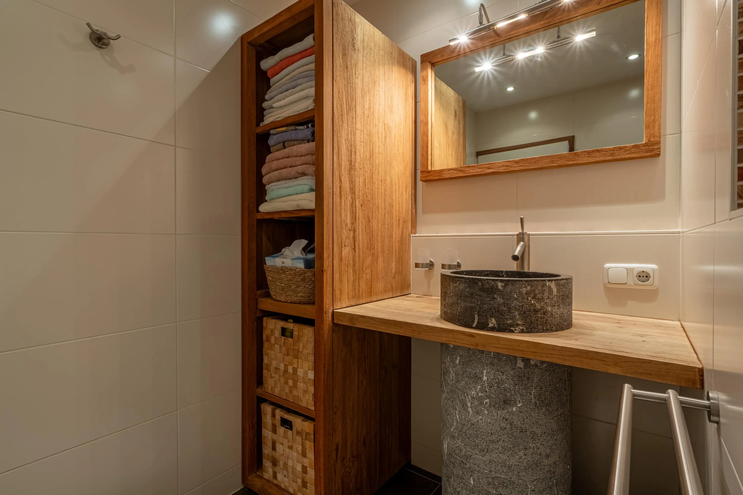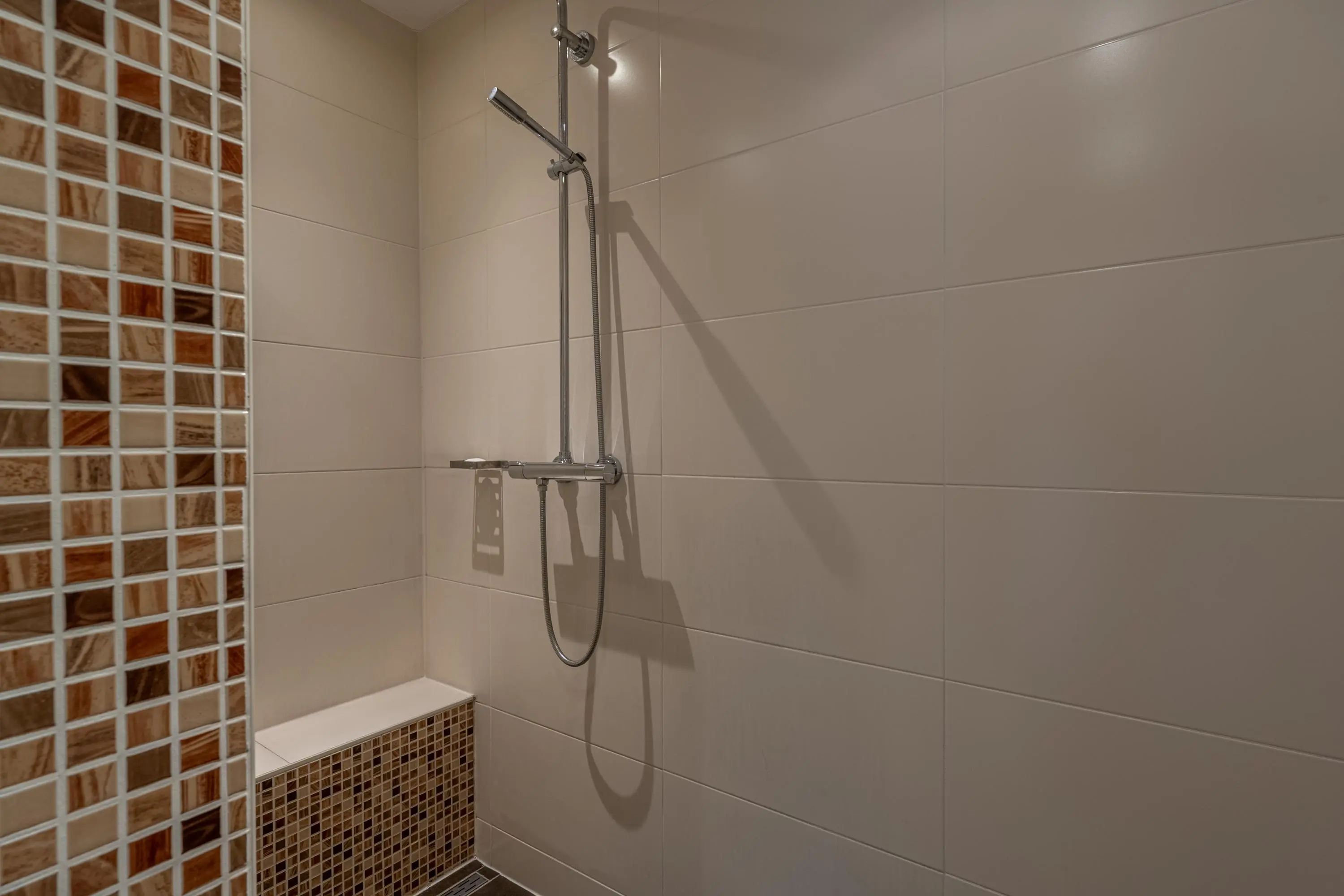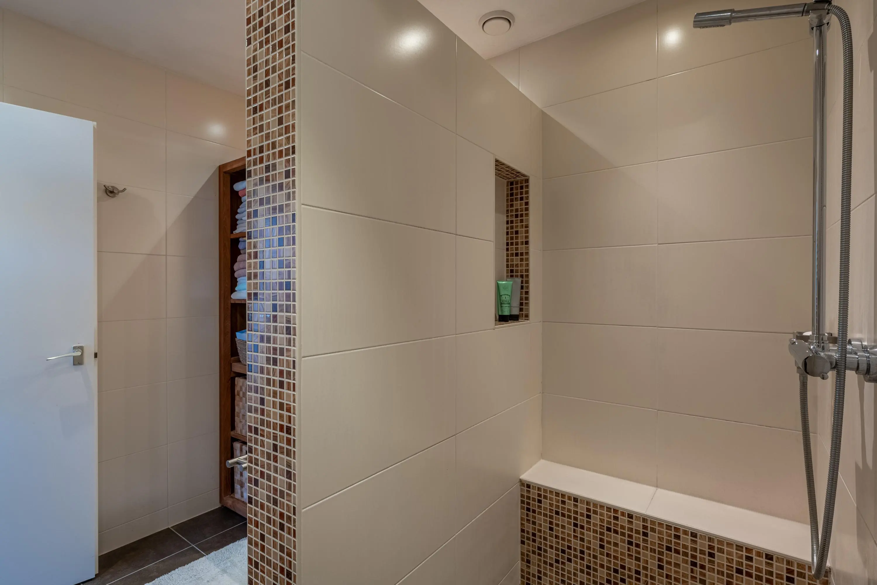 De badkamer is netjes afgewerkt en uitgerust met een inloopdouche, wastafelmeubel, designradiator en mechanische ventilatie.