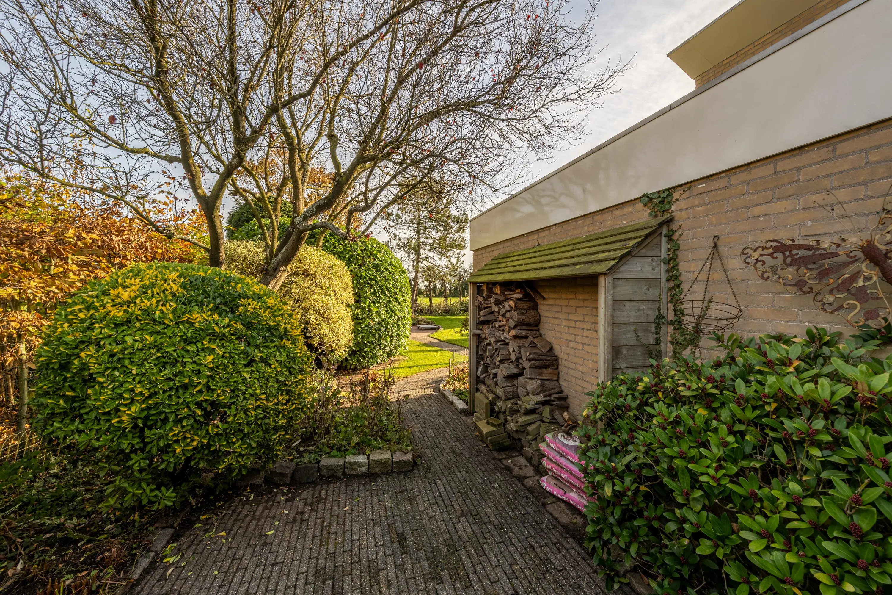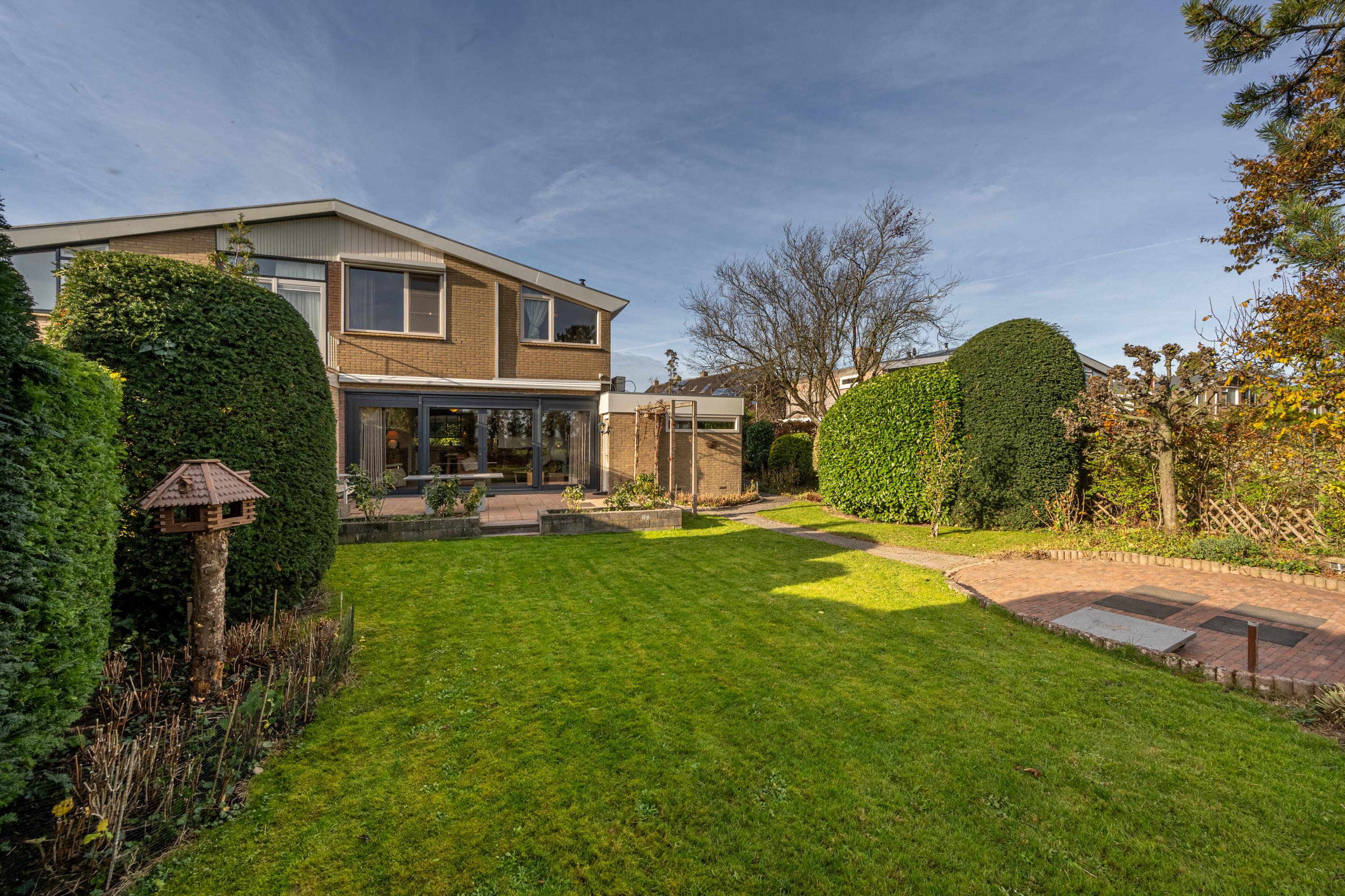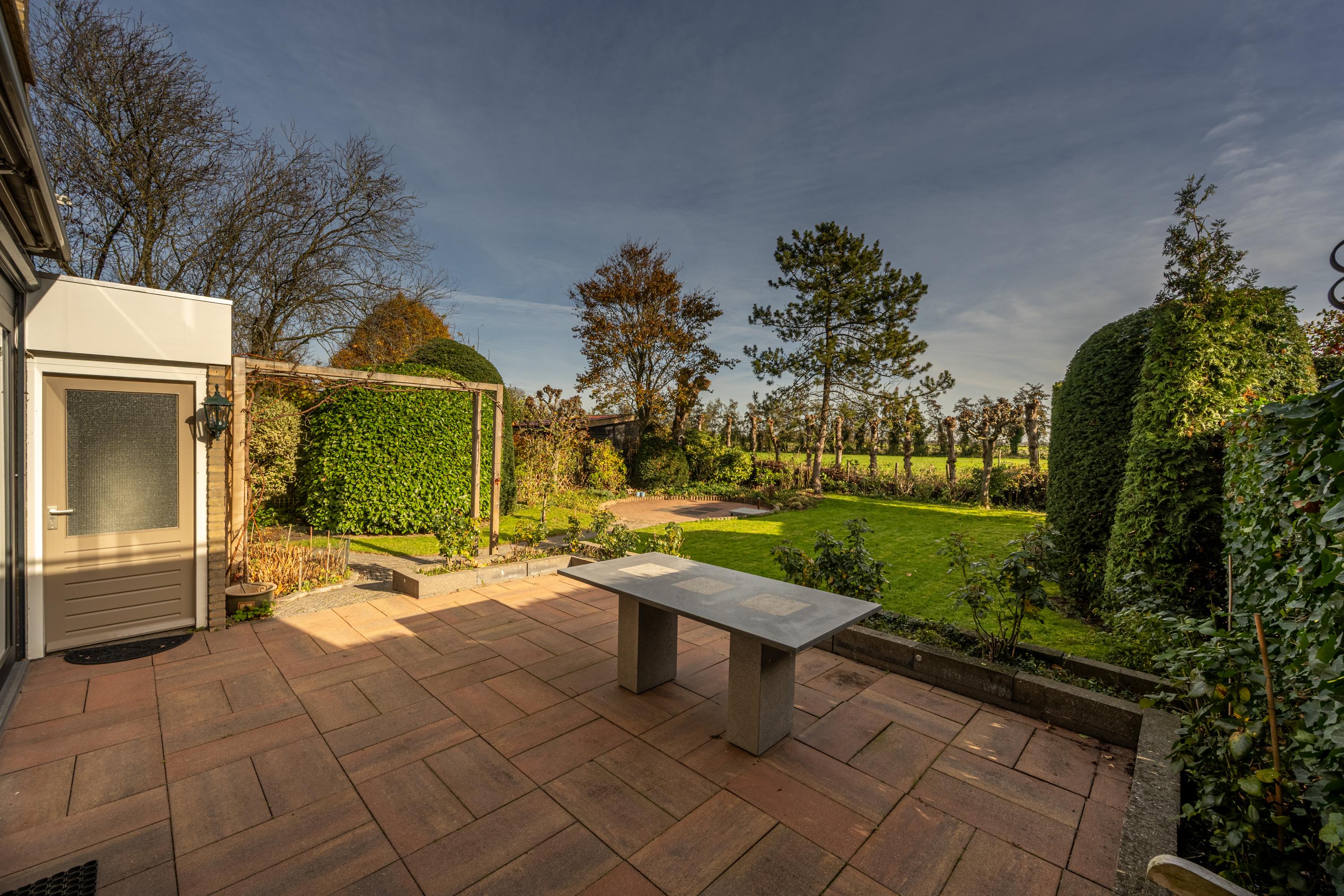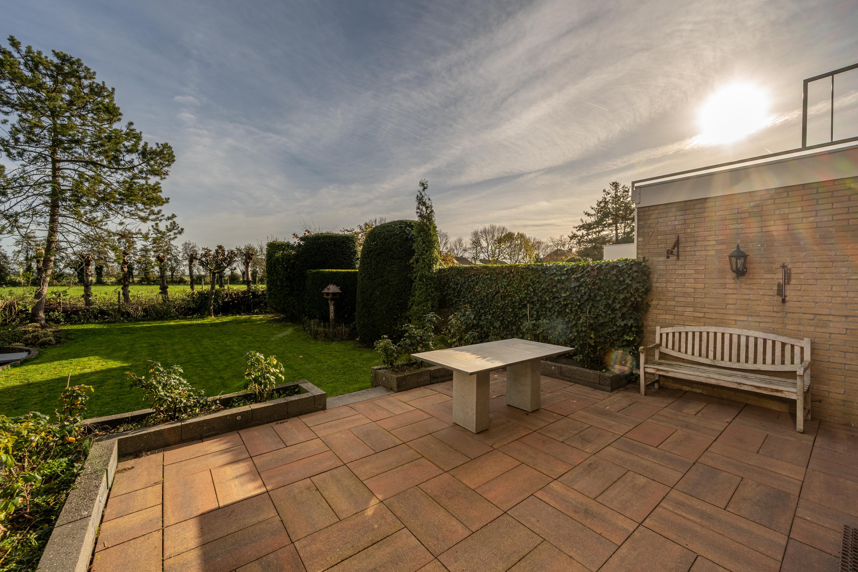 De achtertuin is royaal van opzet en beschikt over meerdere terrassen, een gazon, volwassen beplanting en een vrij uitzicht over de omgeving. Dankzij de gunstige ligging is er de hele dag zon, en het aanwezige zonnescherm zorgt voor een aangename schaduwplek op warme dagen. Ook is er een handige zij-om naar de voortuin aanwezig.