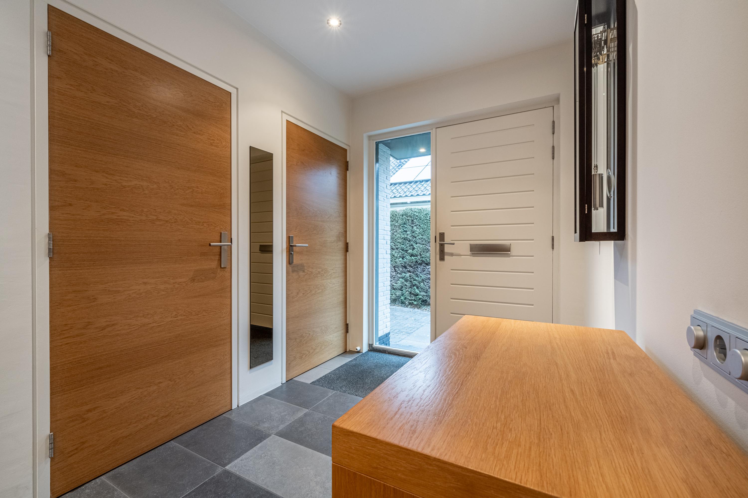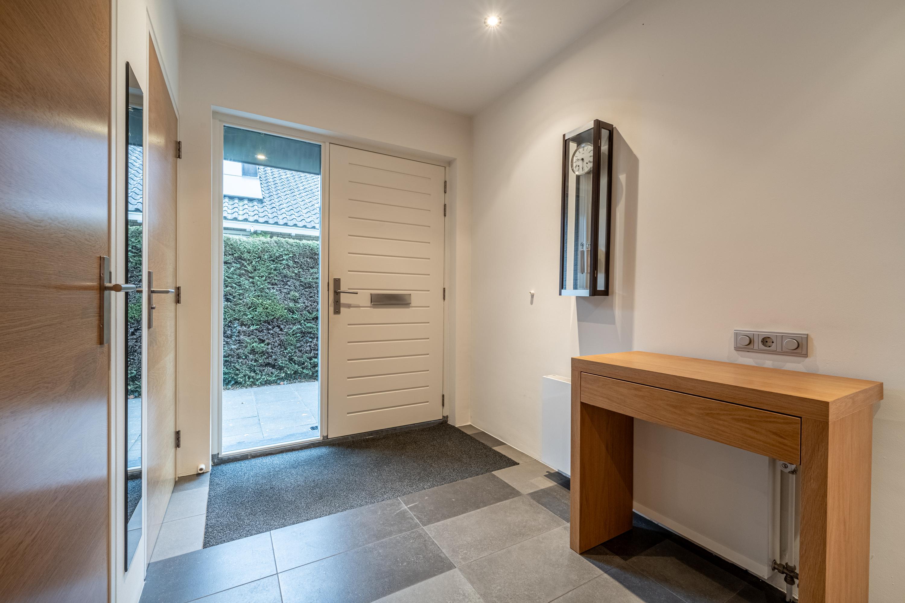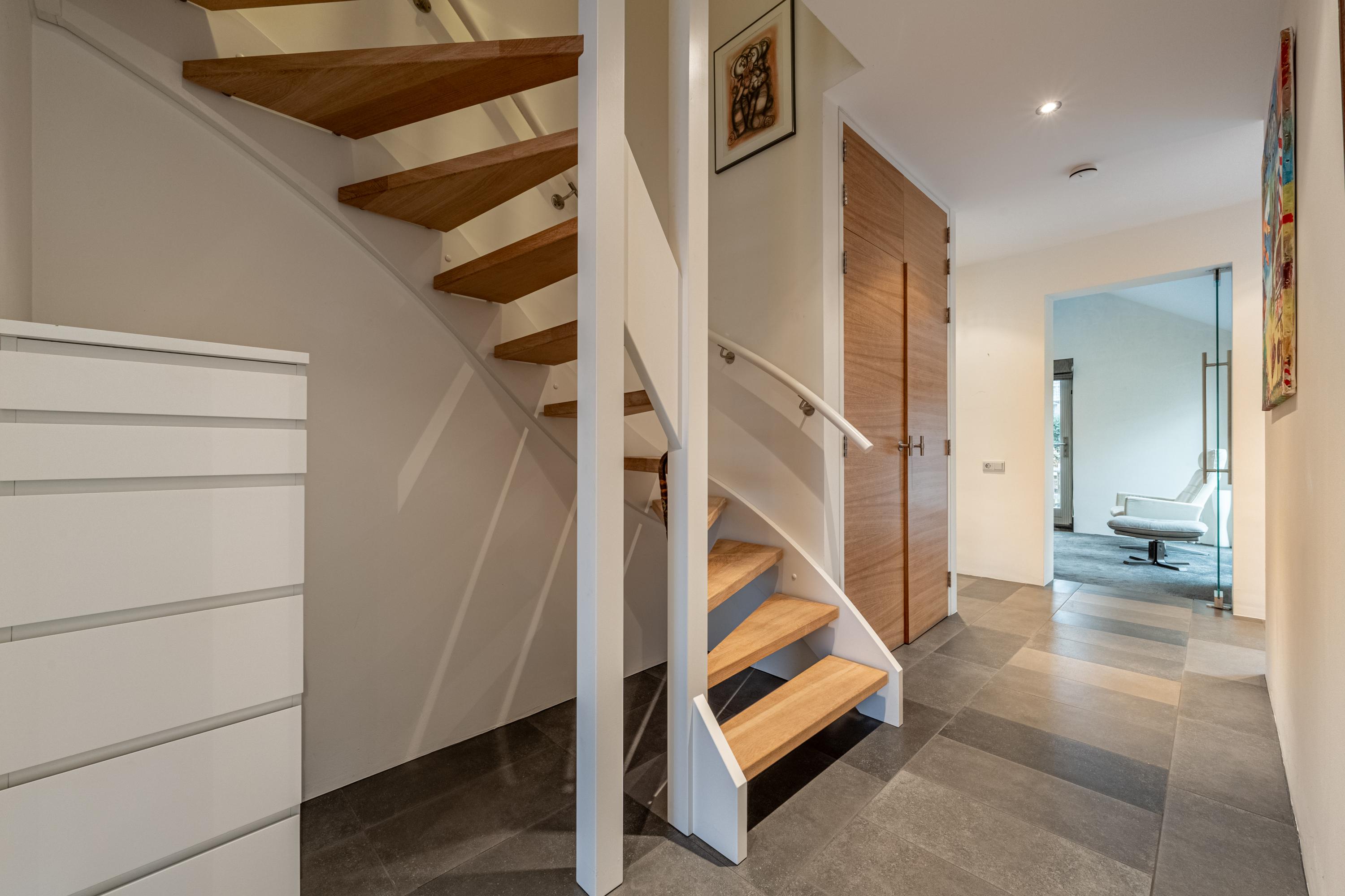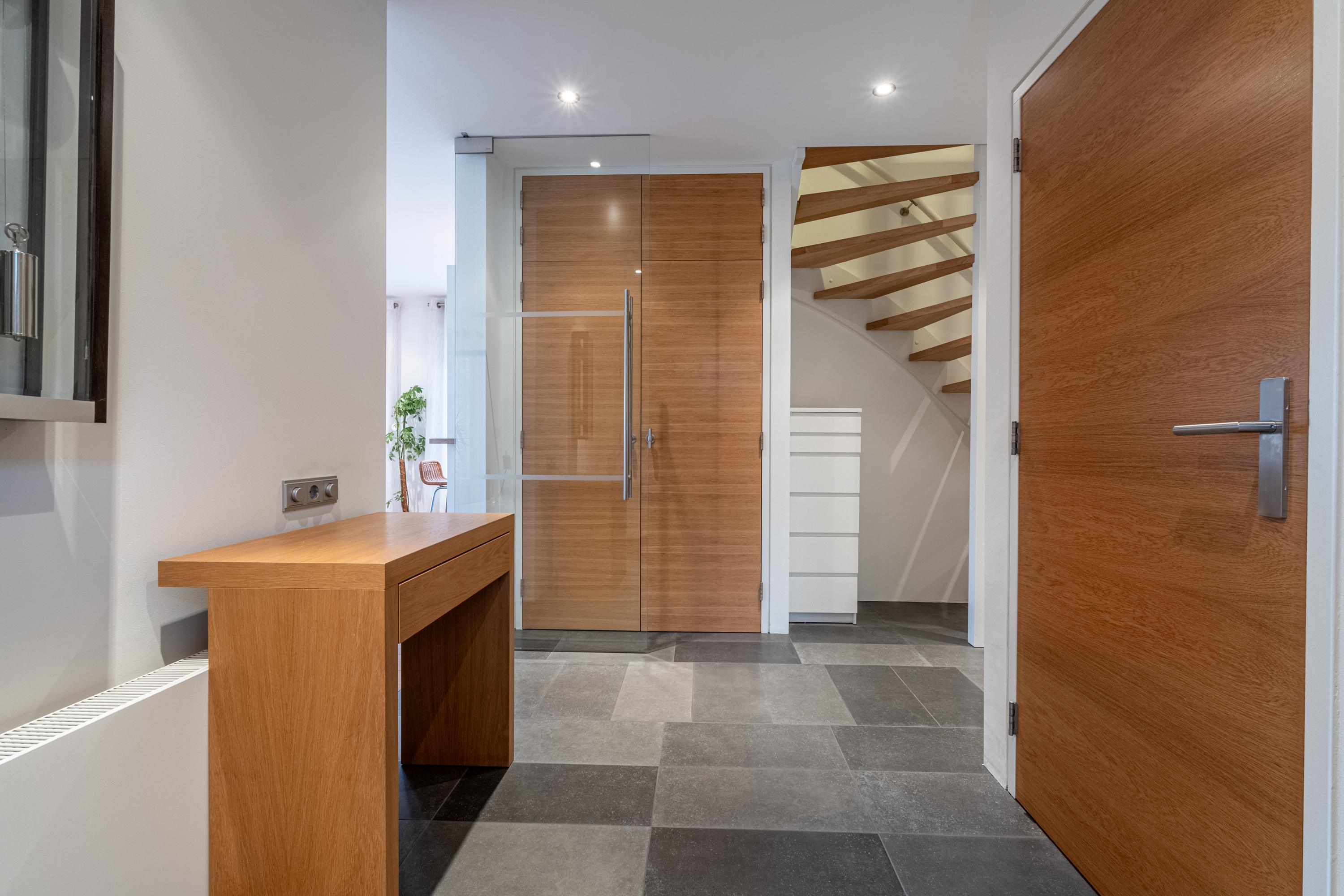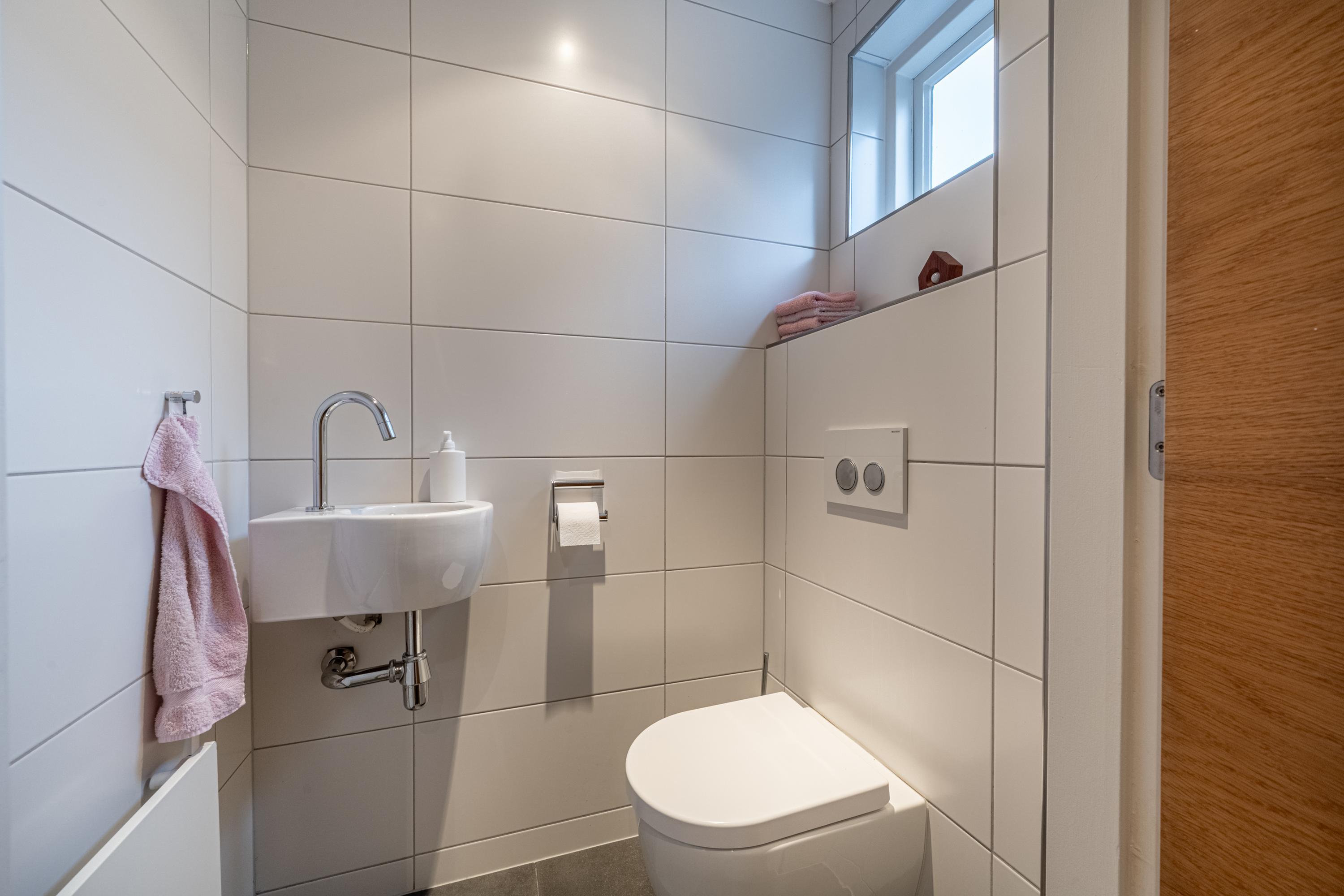 Via de entree komt u in de verzorgde hal met meterkast, vaste garderobekasten en een volledig betegelde toiletruimte met zwevend toilet en fonteintje. De hal is afgewerkt met een tegelvloer en vormt de centrale verbinding tussen de woonkamer en de keuken.