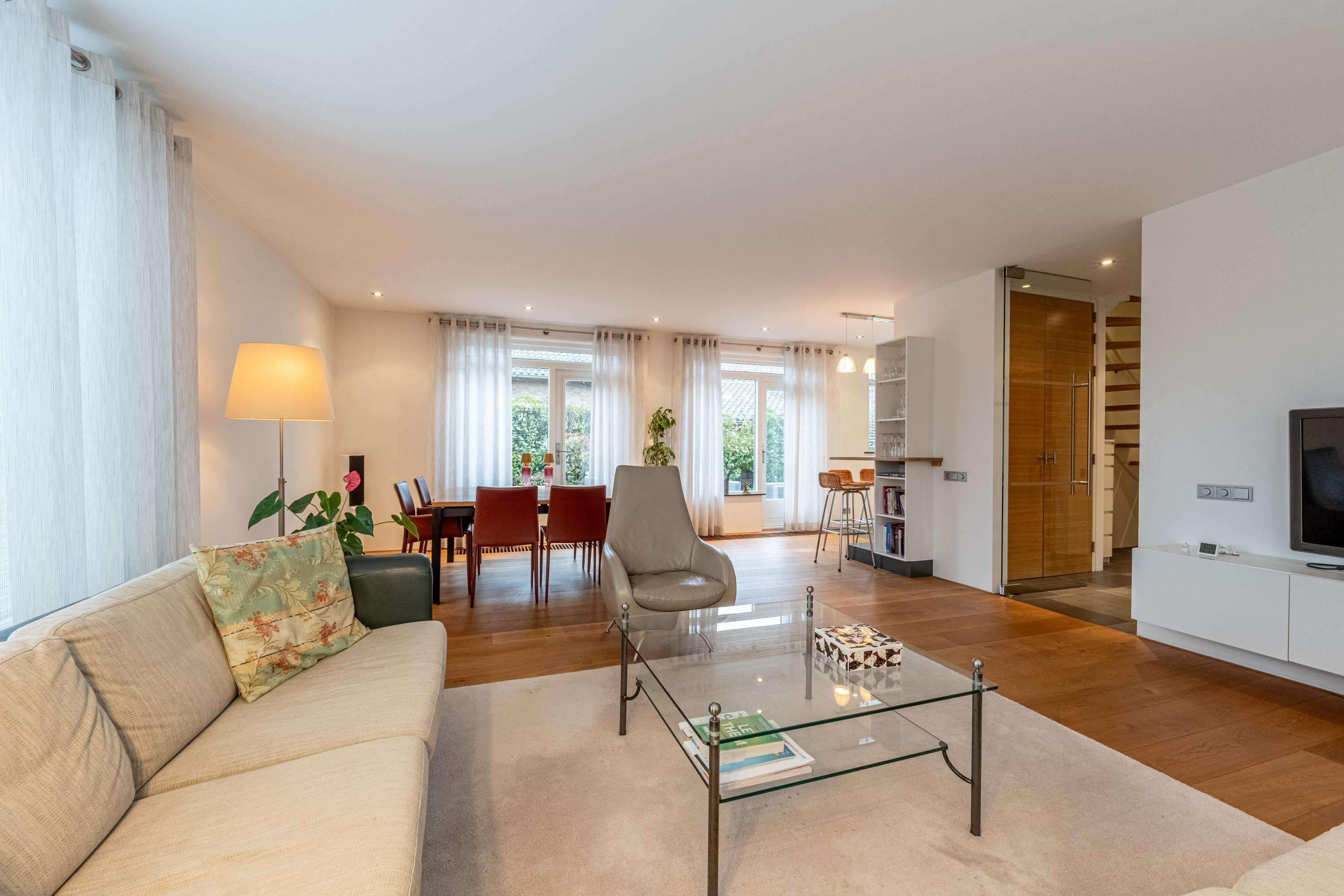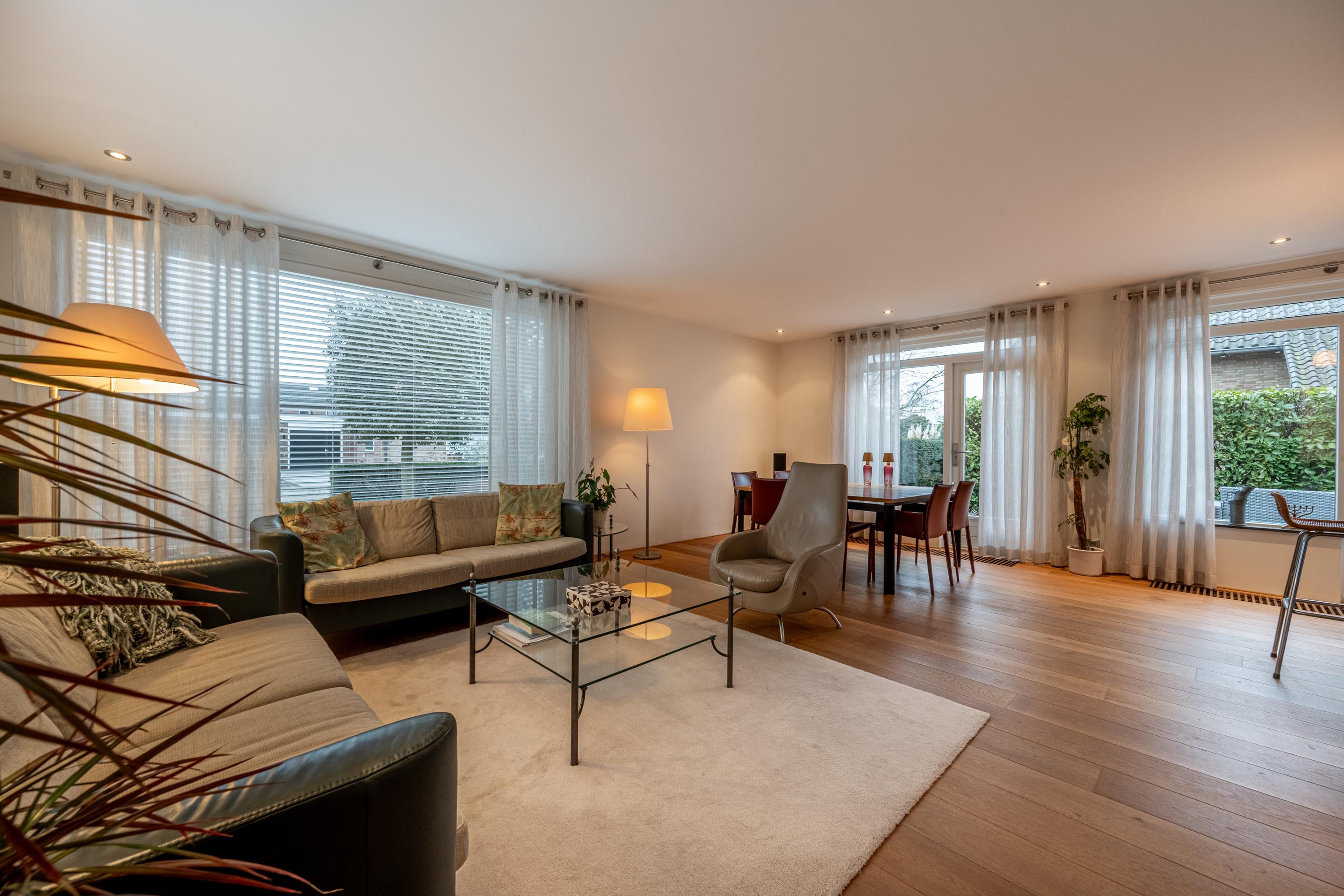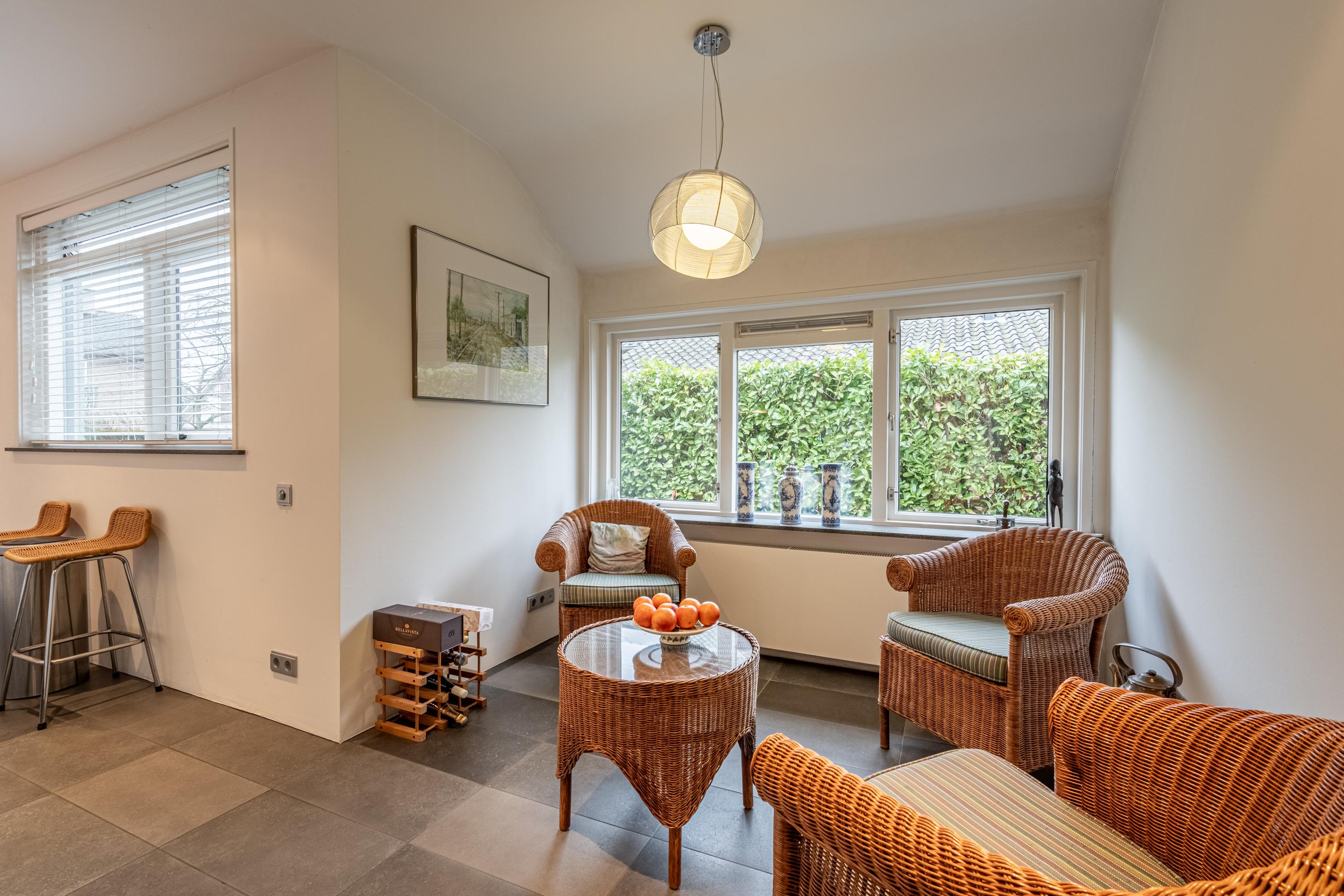 Vanuit de gezellige zithoek heeft u een prettig uitzicht op de tuin, wat zorgt voor een open en licht geheel.