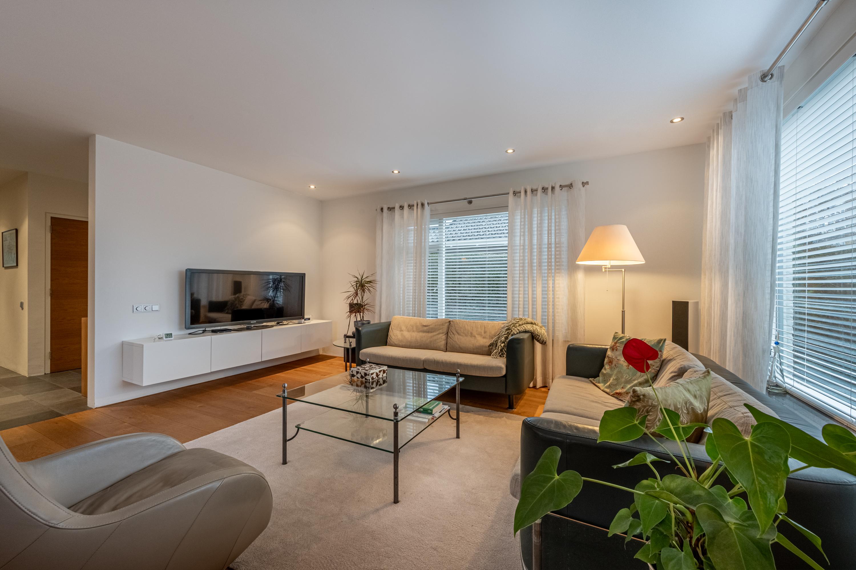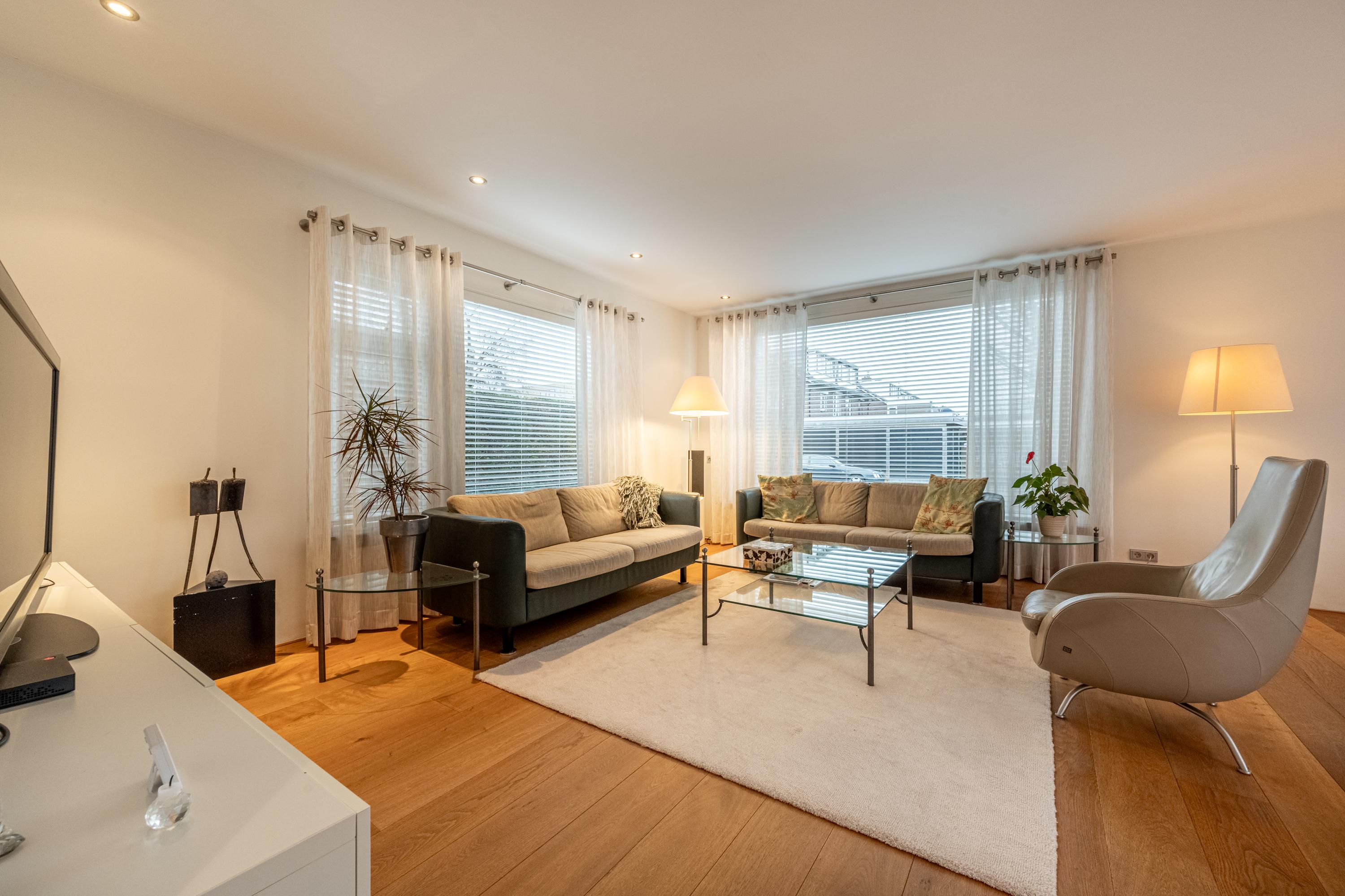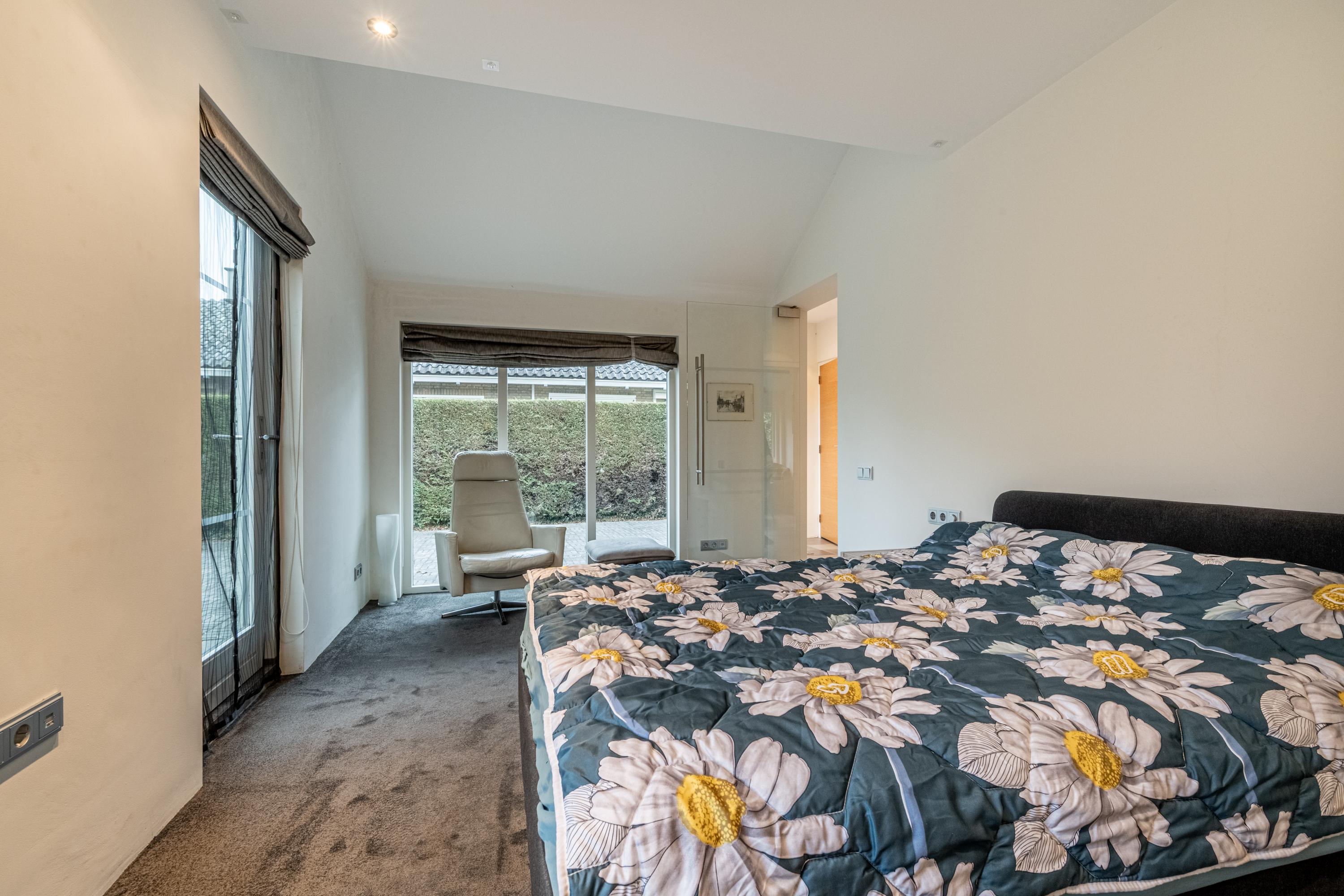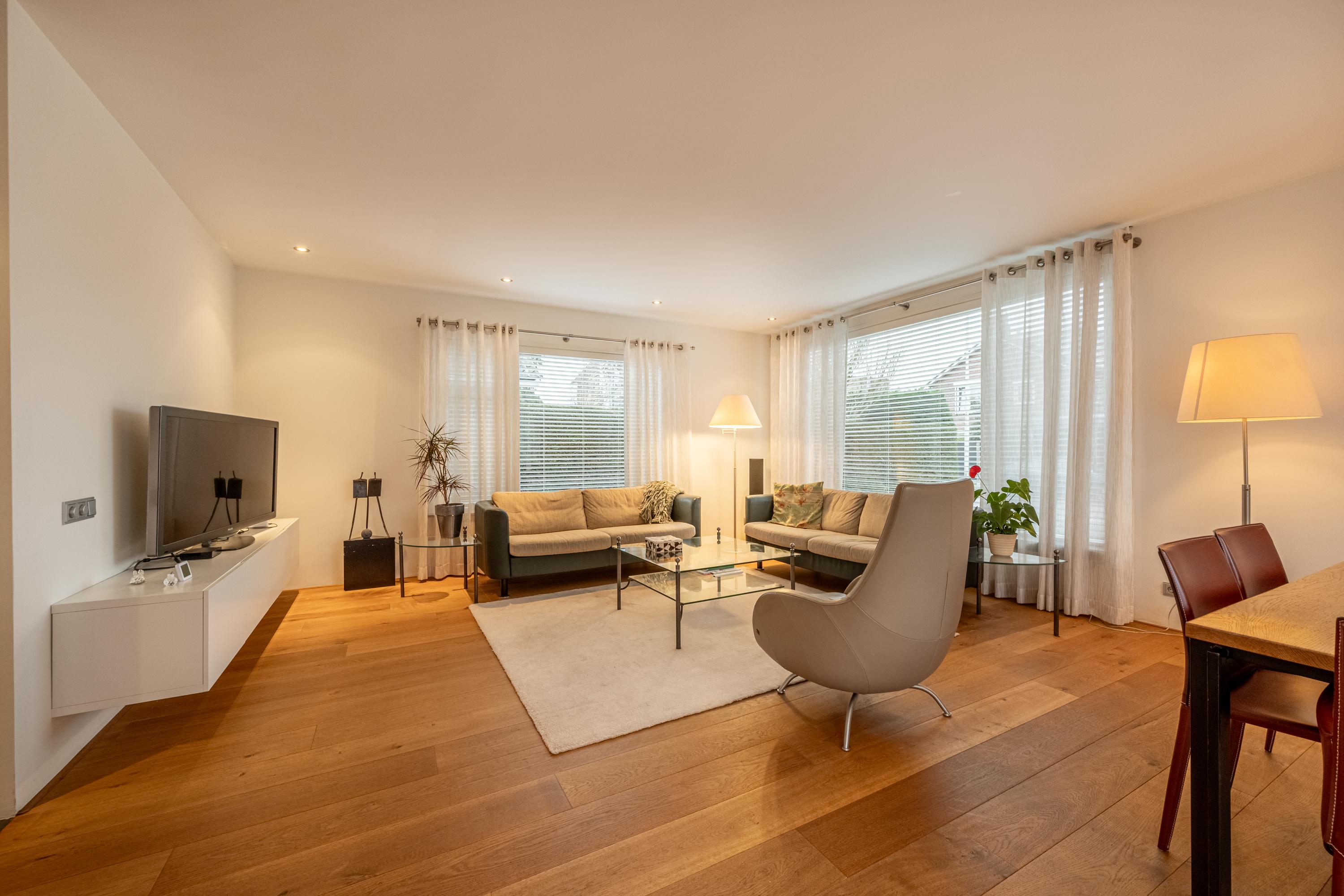Vanuit de gezellige zithoek heeft u een prettig uitzicht op de tuin, wat zorgt voor een open en licht geheel.