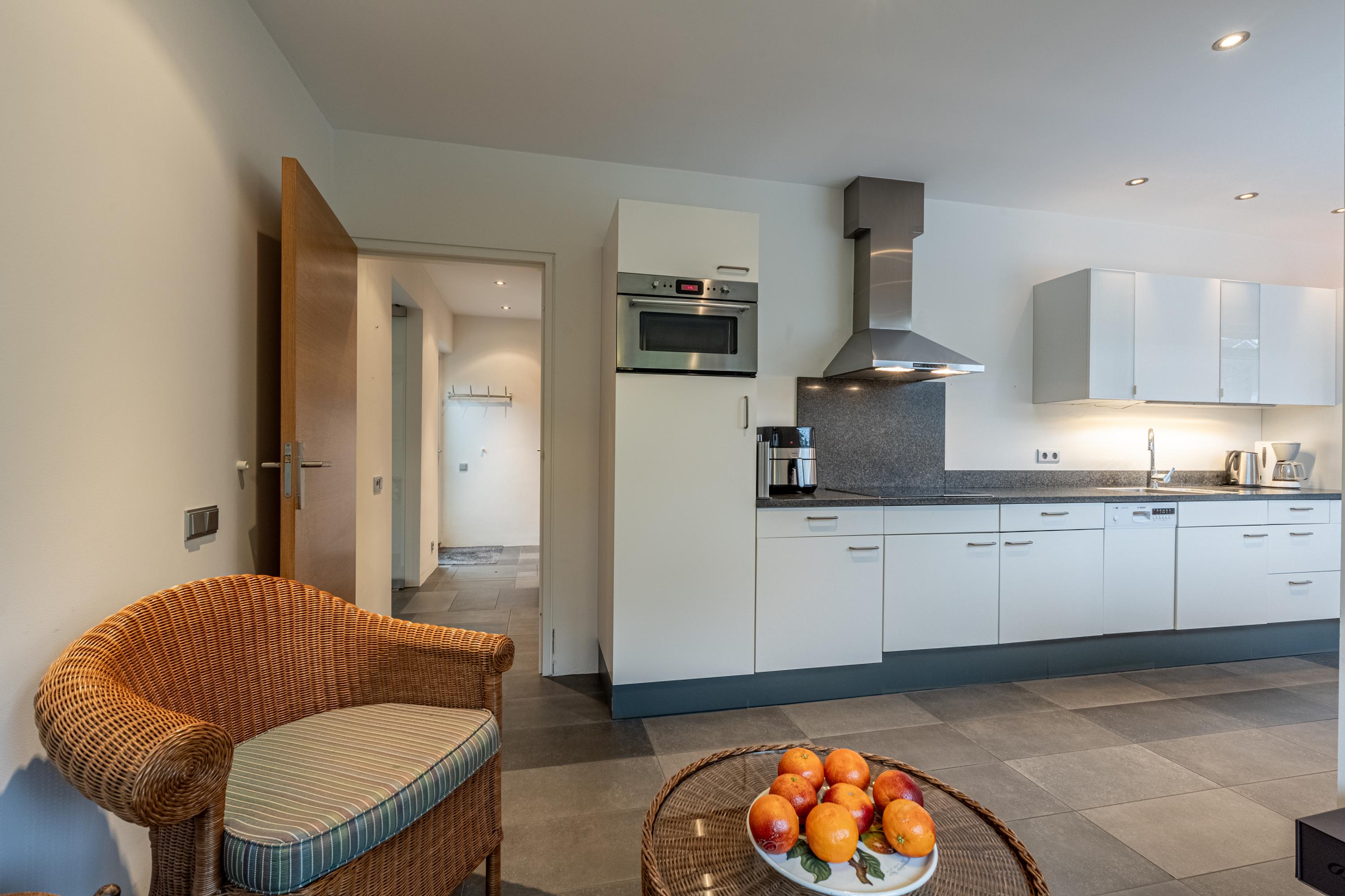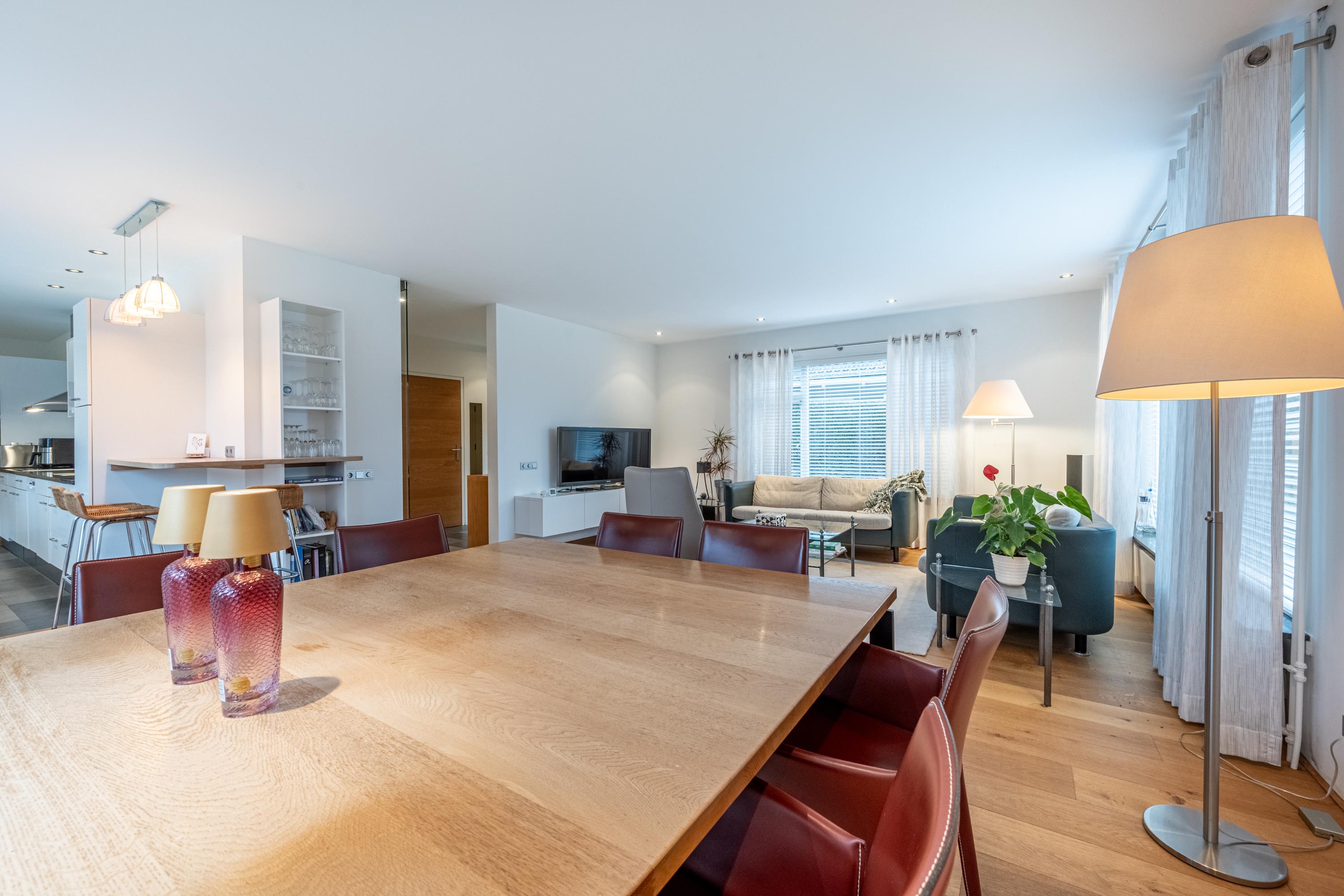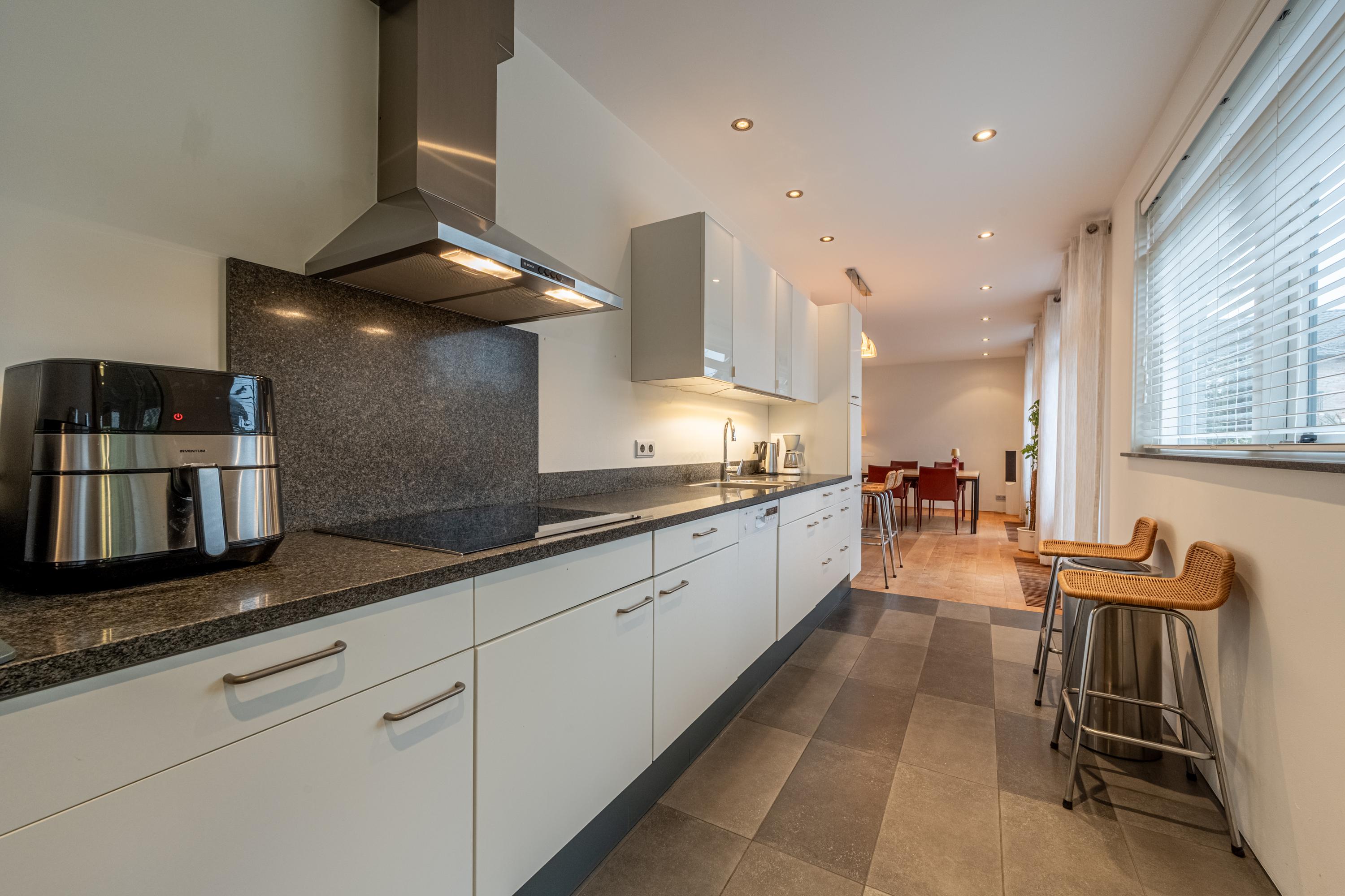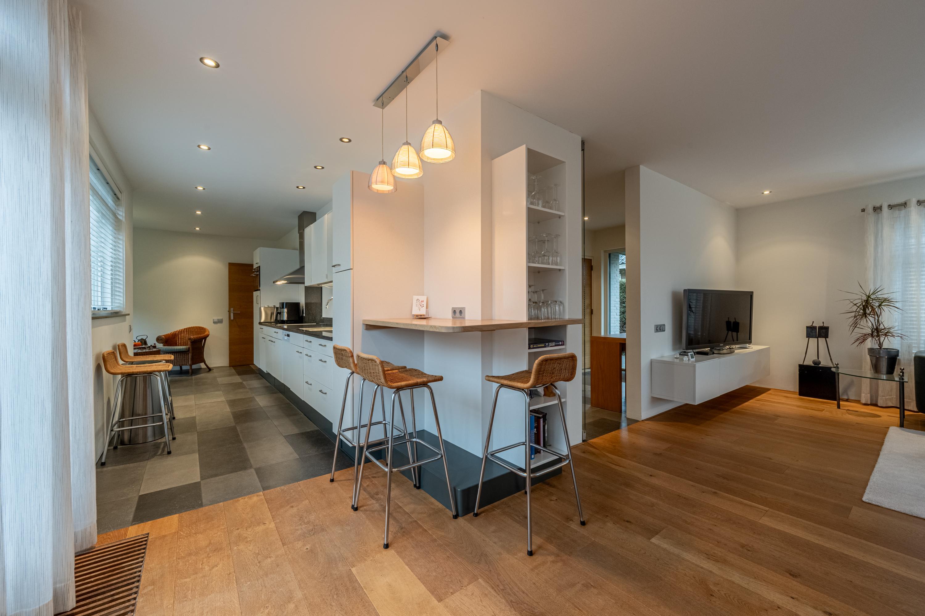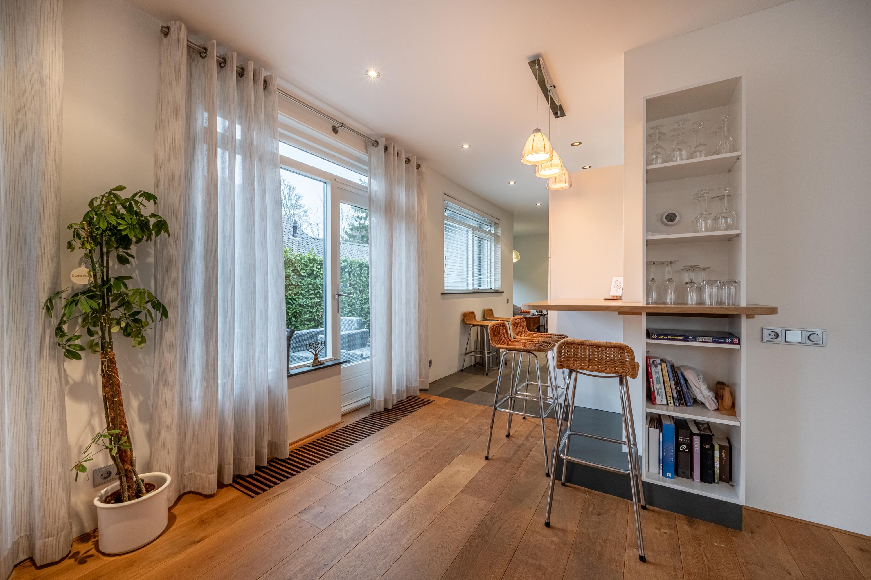 De woonkamer is sfeervol ingericht en voorzien van een warme houten vloer, inbouwspots en convectorputten aan de tuinzijde. Bij binnenkomst springt direct de bar met opbergkast in het oog, die op speelse wijze een natuurlijke scheiding vormt tussen het zitgedeelte en de keuken. De keuken sluit hier naadloos op aan en is uitgerust met een inductiekookplaat met afzuigkap, magnetron, vaatwasser, koelkast en spoelbak.