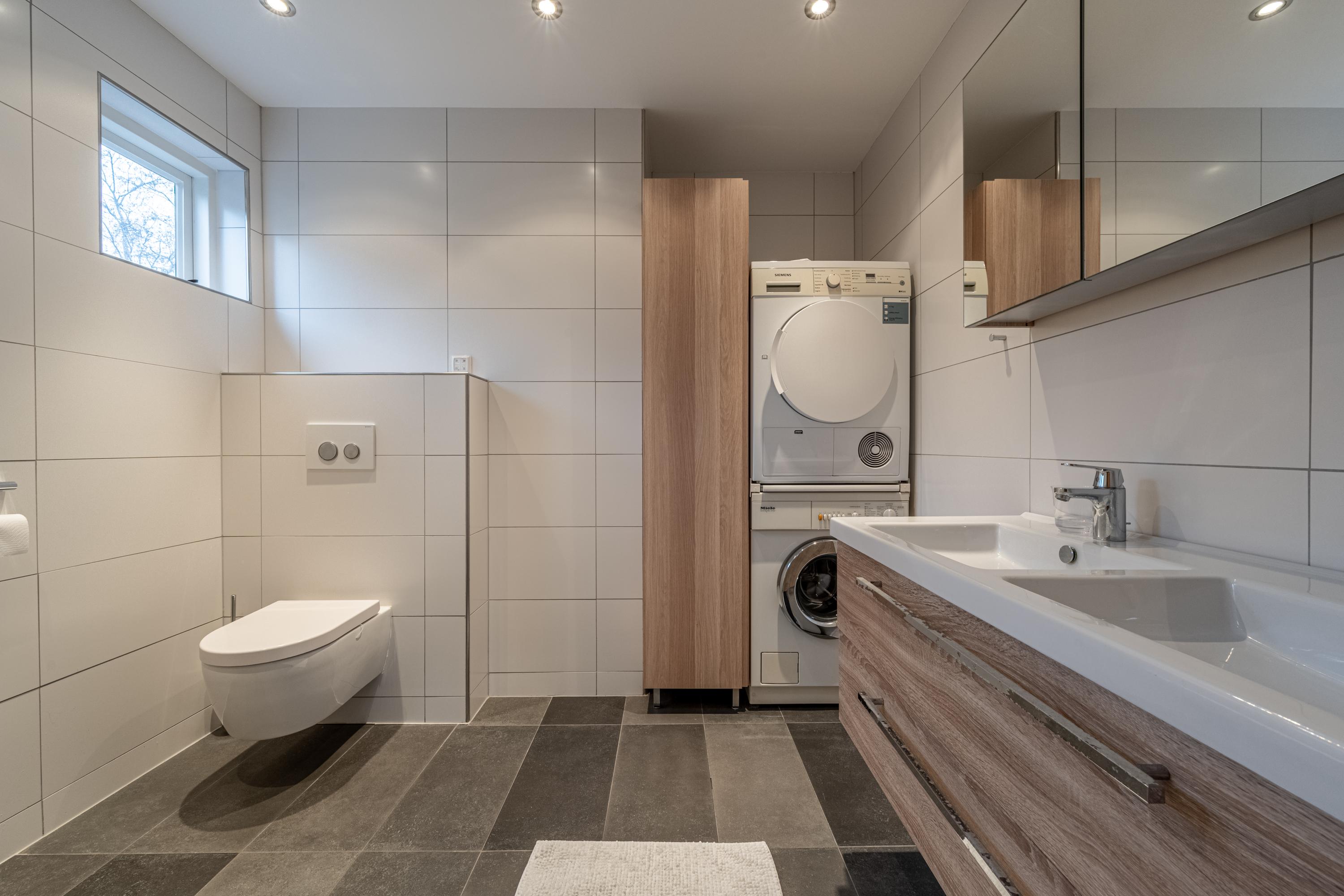 De moderne badkamer op de begane grond is bereikbaar vanuit de hal en beschikt over een dubbele wastafel met spiegelkast, een inloopdouche met hand- en regendouche, een zwevend toilet, designradiator en aansluitingen voor wasmachine en droger. Extra kastruimte zorgt voor praktisch gebruiksgemak.