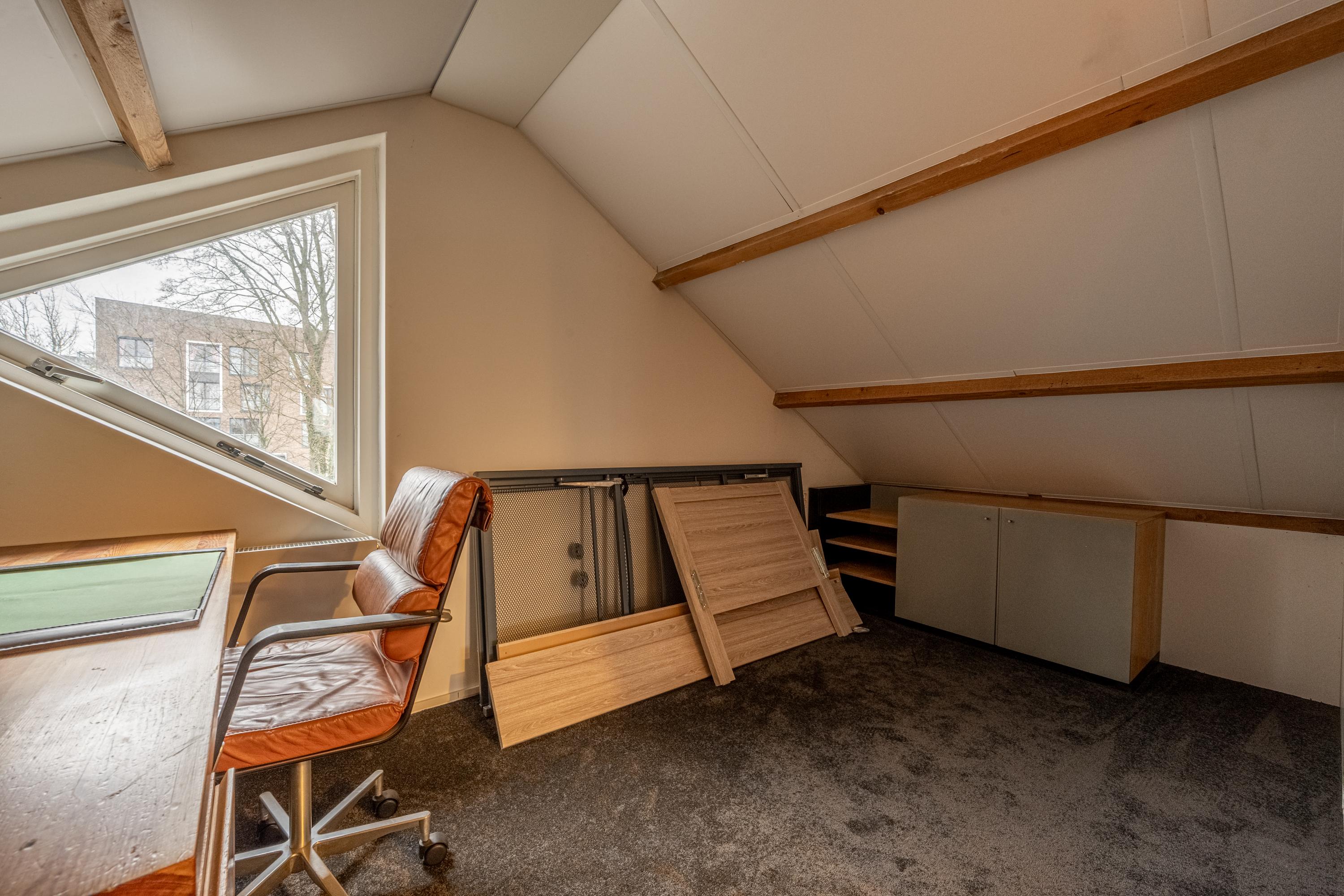 Aan de linkerzijde ligt een ruime werkkamer, eveneens met bergruimte achter de knieschotten. Hier is tevens de CV-installatie geplaatst.
