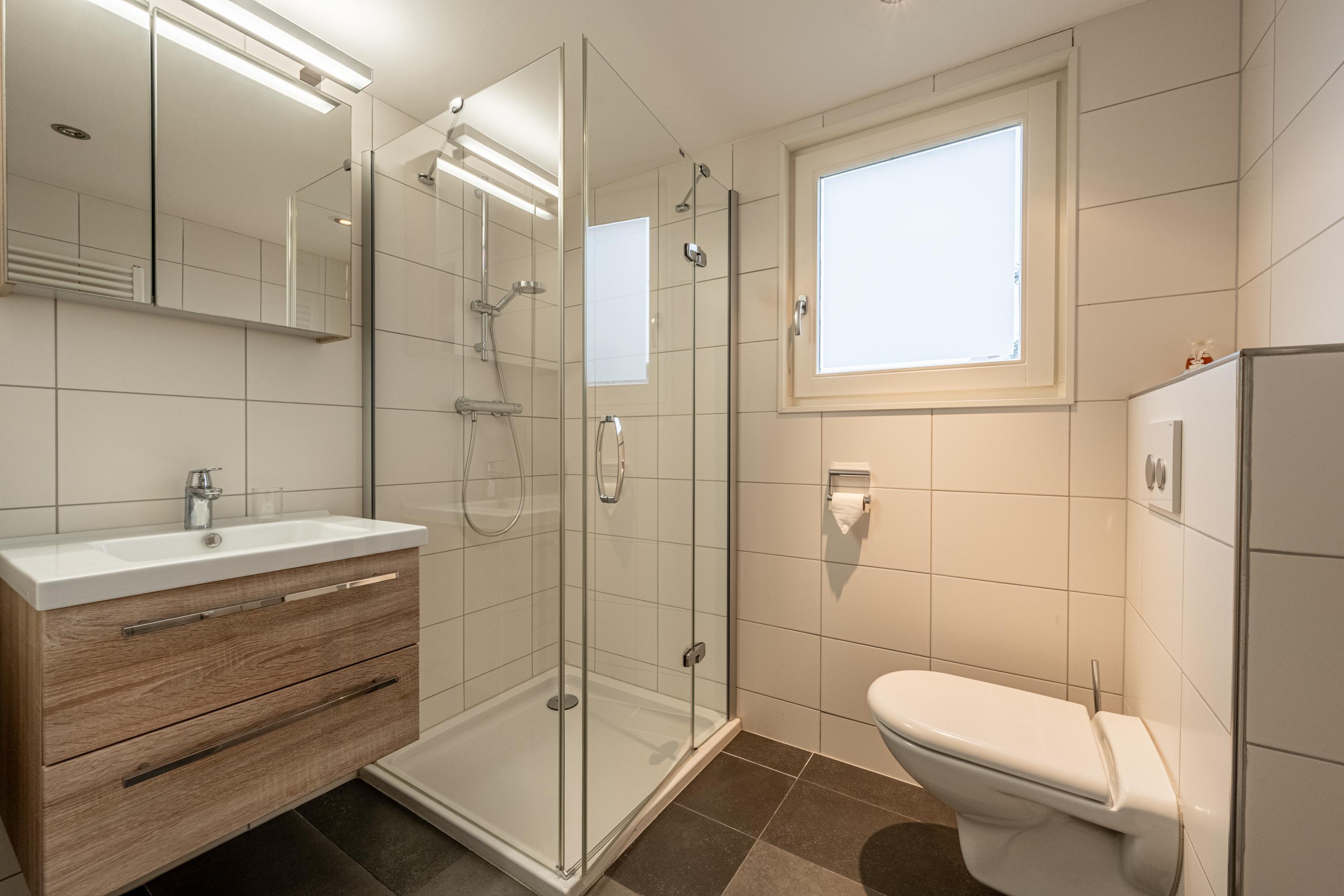 De tweede badkamer is volledig betegeld en ingericht met een zwevend toilet, wastafel met spiegelkast, douche en een raam dat zorgt voor daglicht en natuurlijke ventilatie.