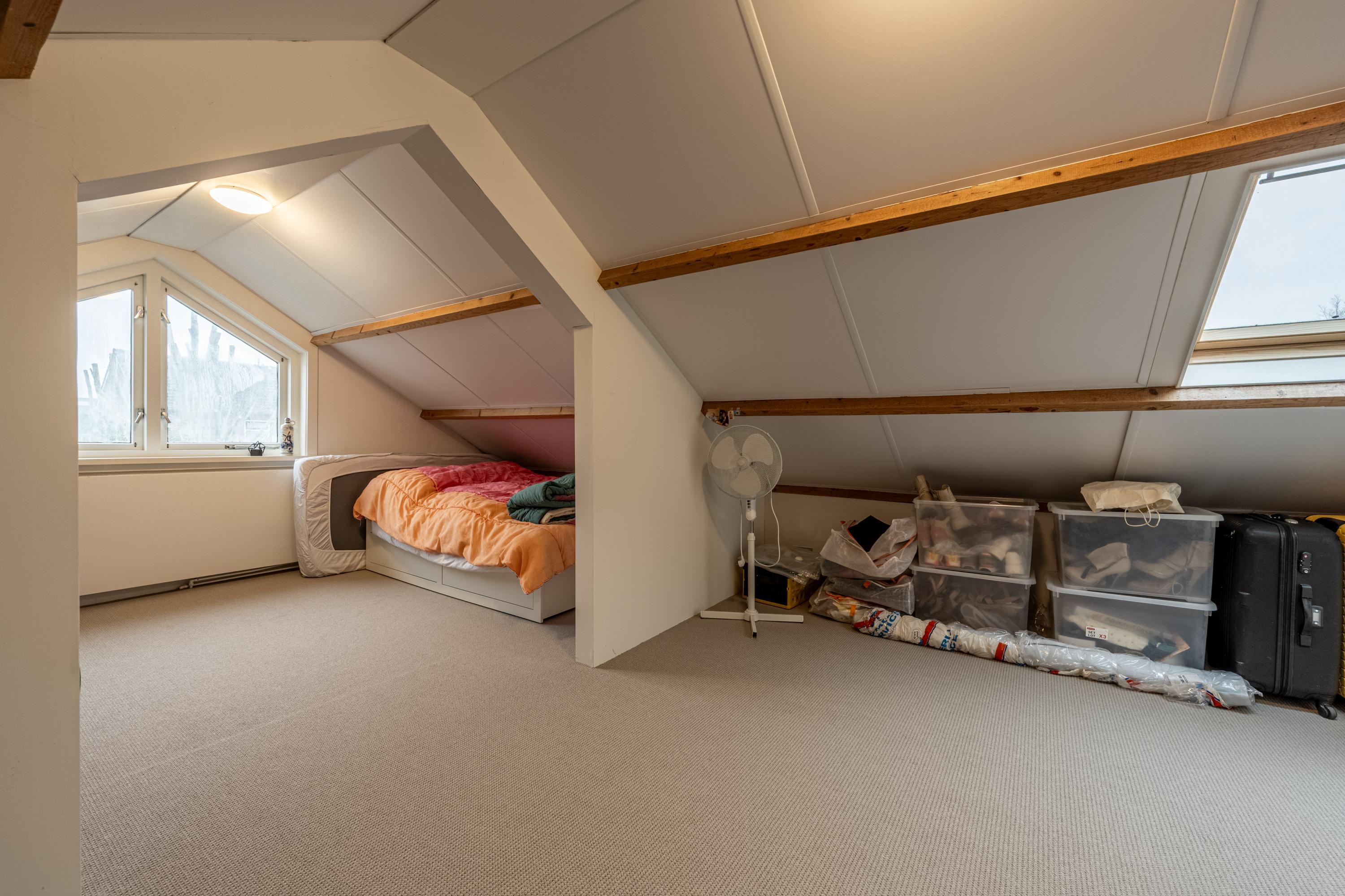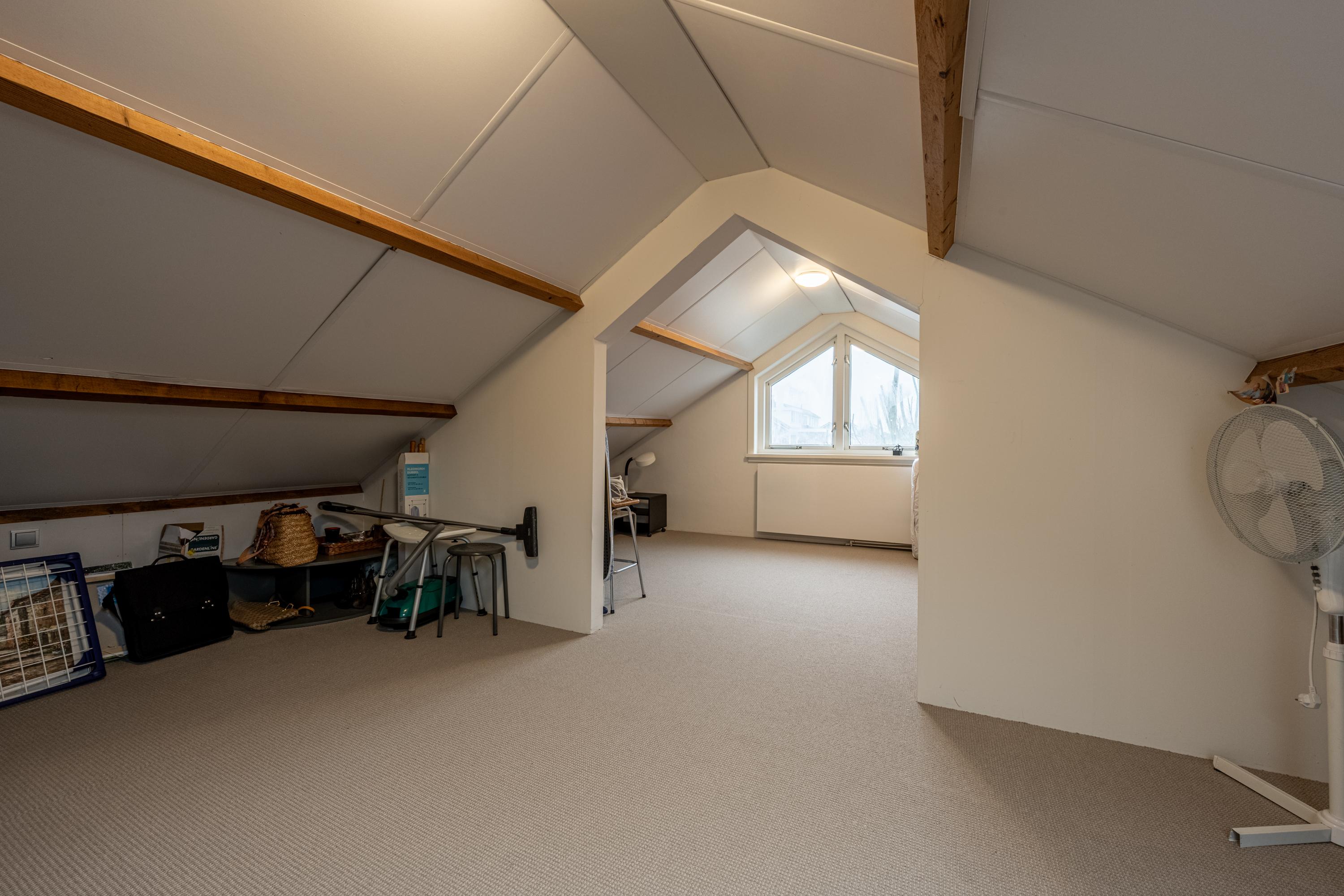 Een vaste trap leidt naar de eerste verdieping, die grotendeels is voorzien van vloerbedekking en veel bergruimte achter de knieschotten biedt. Aan de rechterzijde bevindt zich de tweede slaapkamer, voorzien van een radiator en extra bergruimte. De zichtbare houten balken geven deze verdieping een warme, karaktervolle uitstraling.