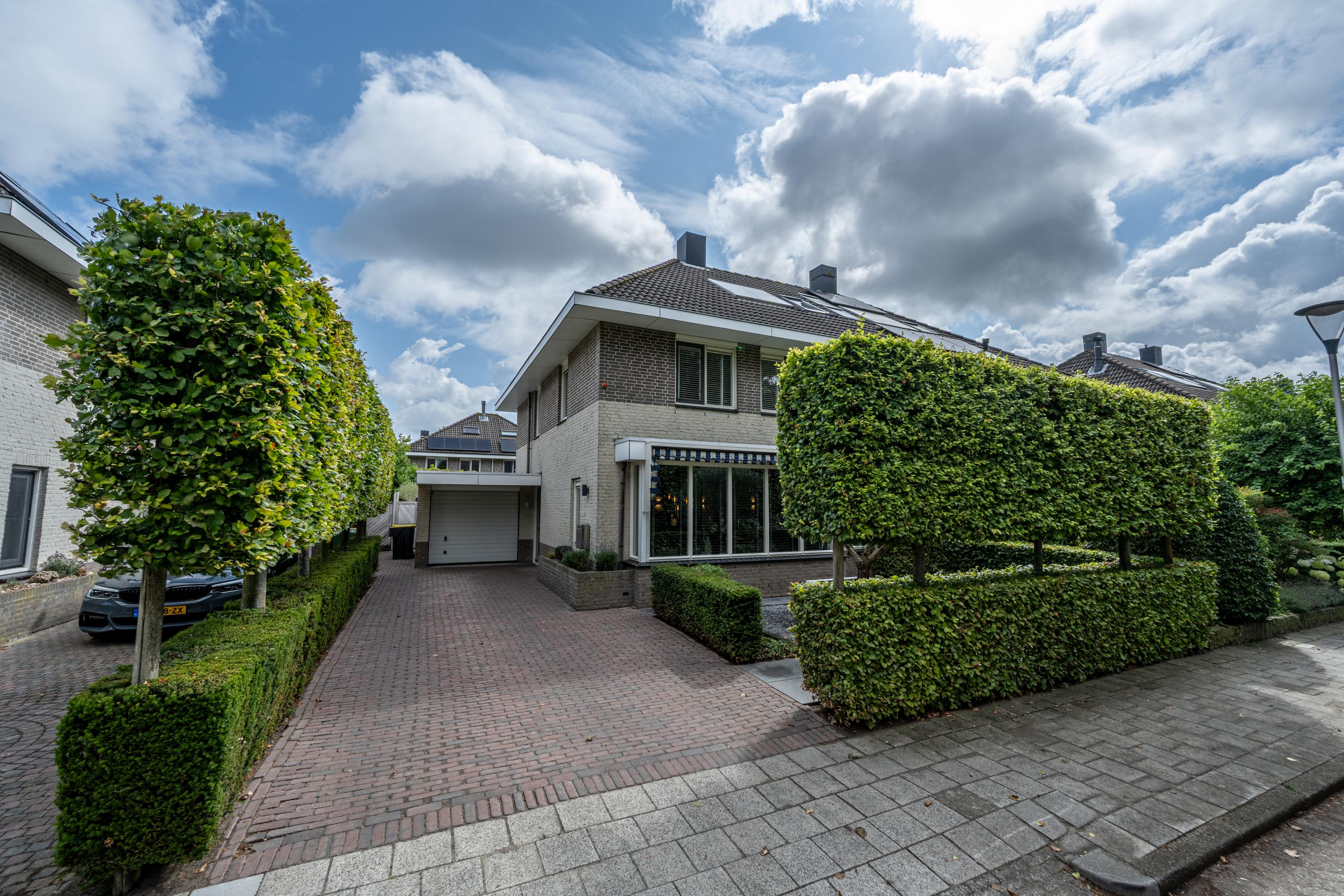 Aan de voorzijde van de woning zorgen de ruime voortuin en oprit voor een comfortabele afstand tot de straat en parkeergelegenheid op eigen terrein.