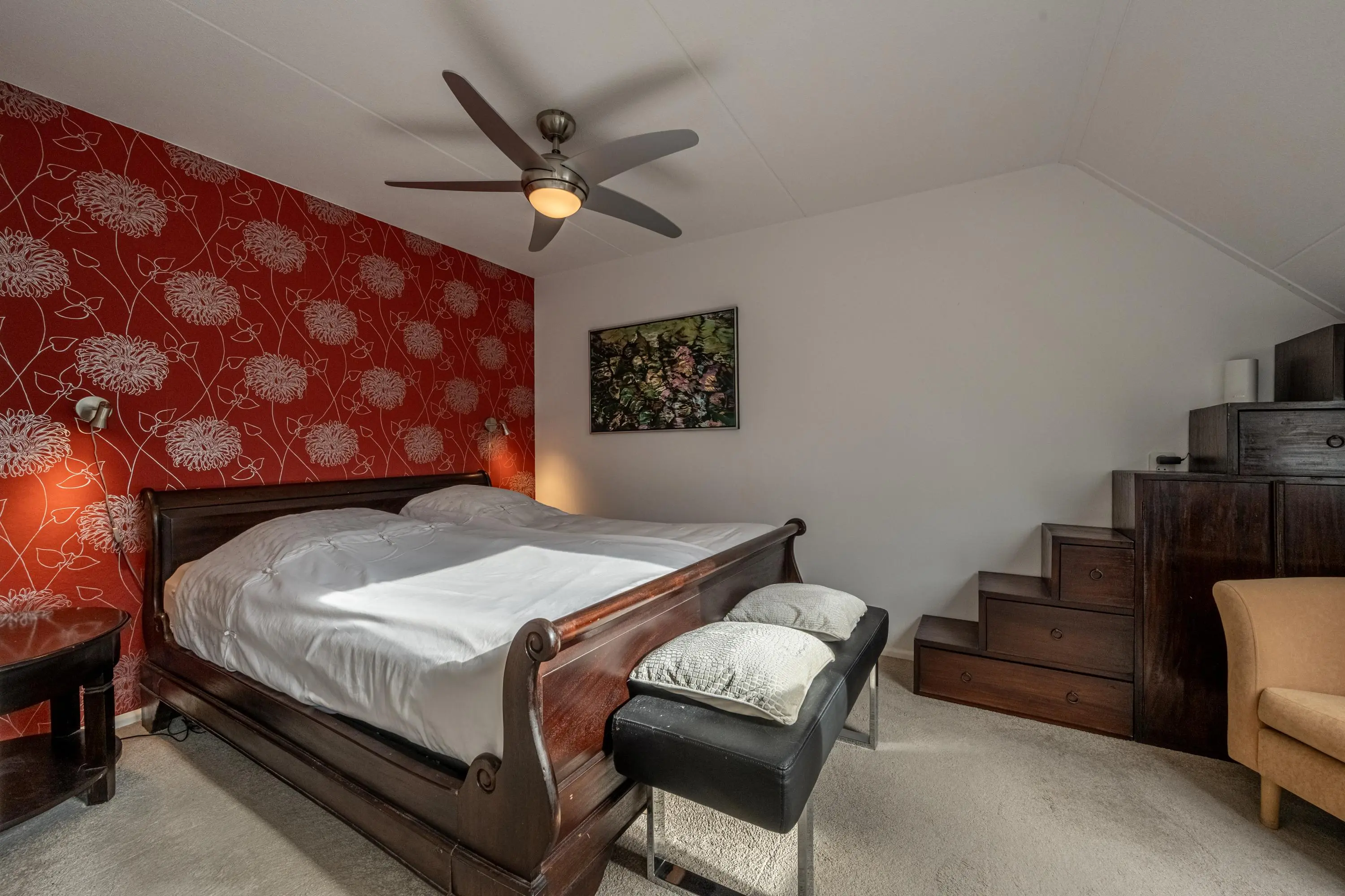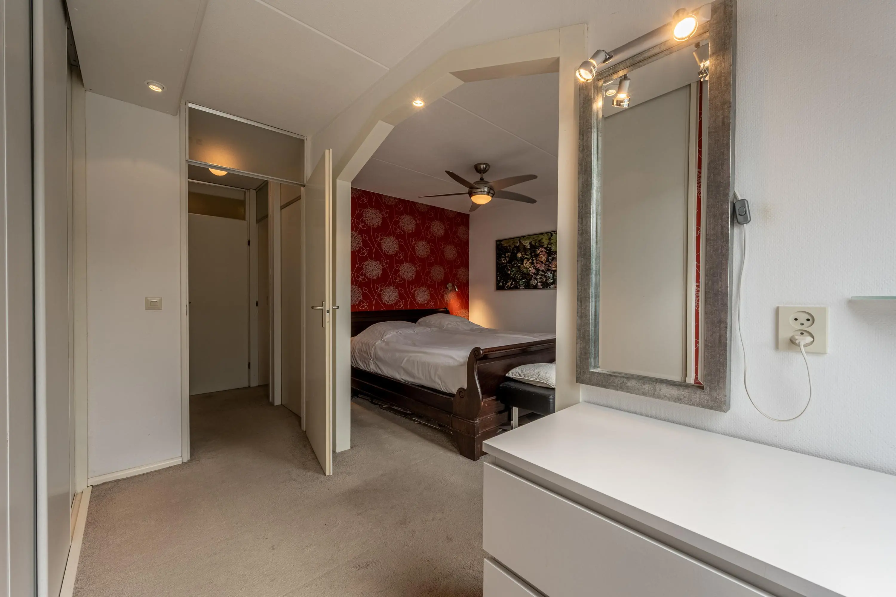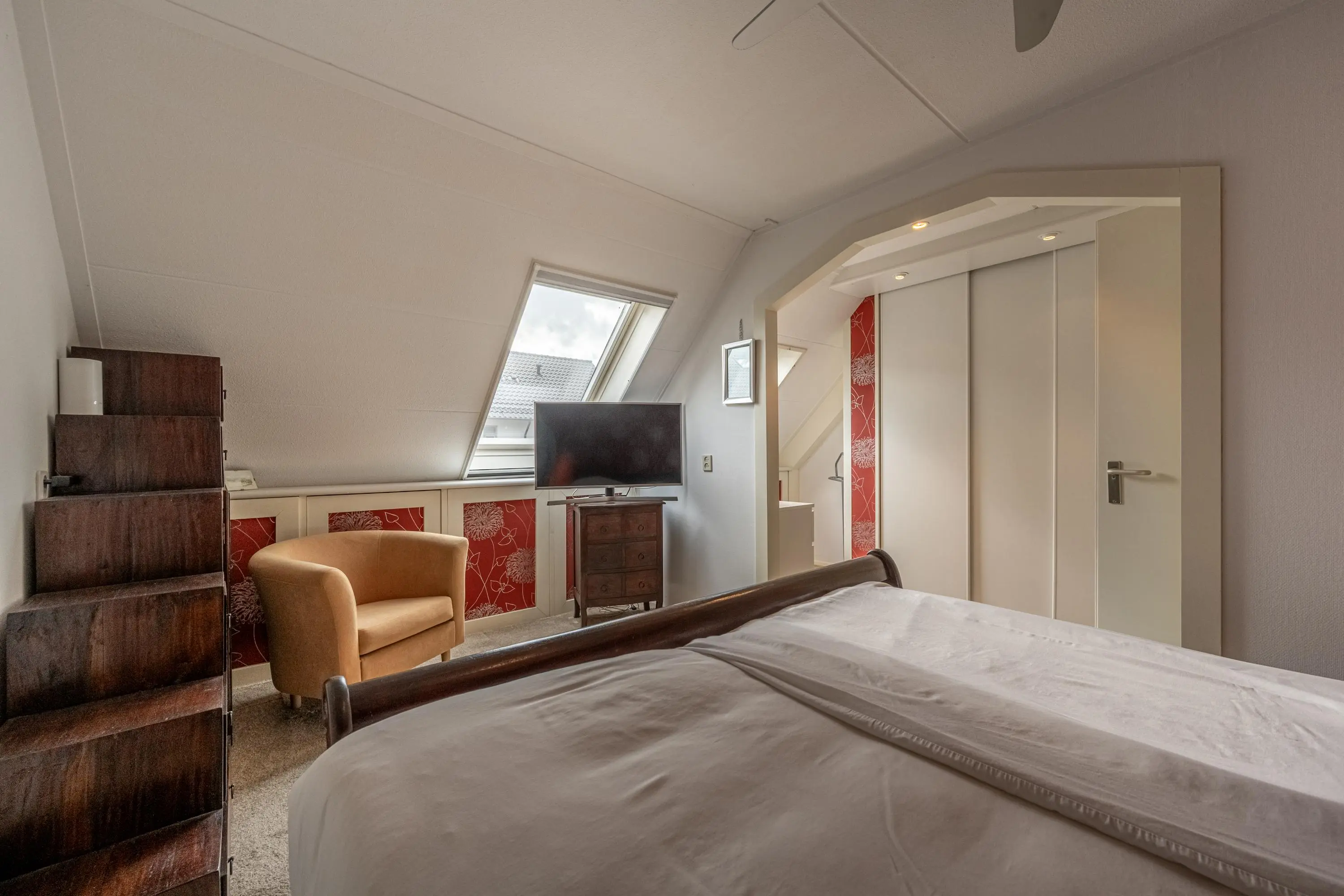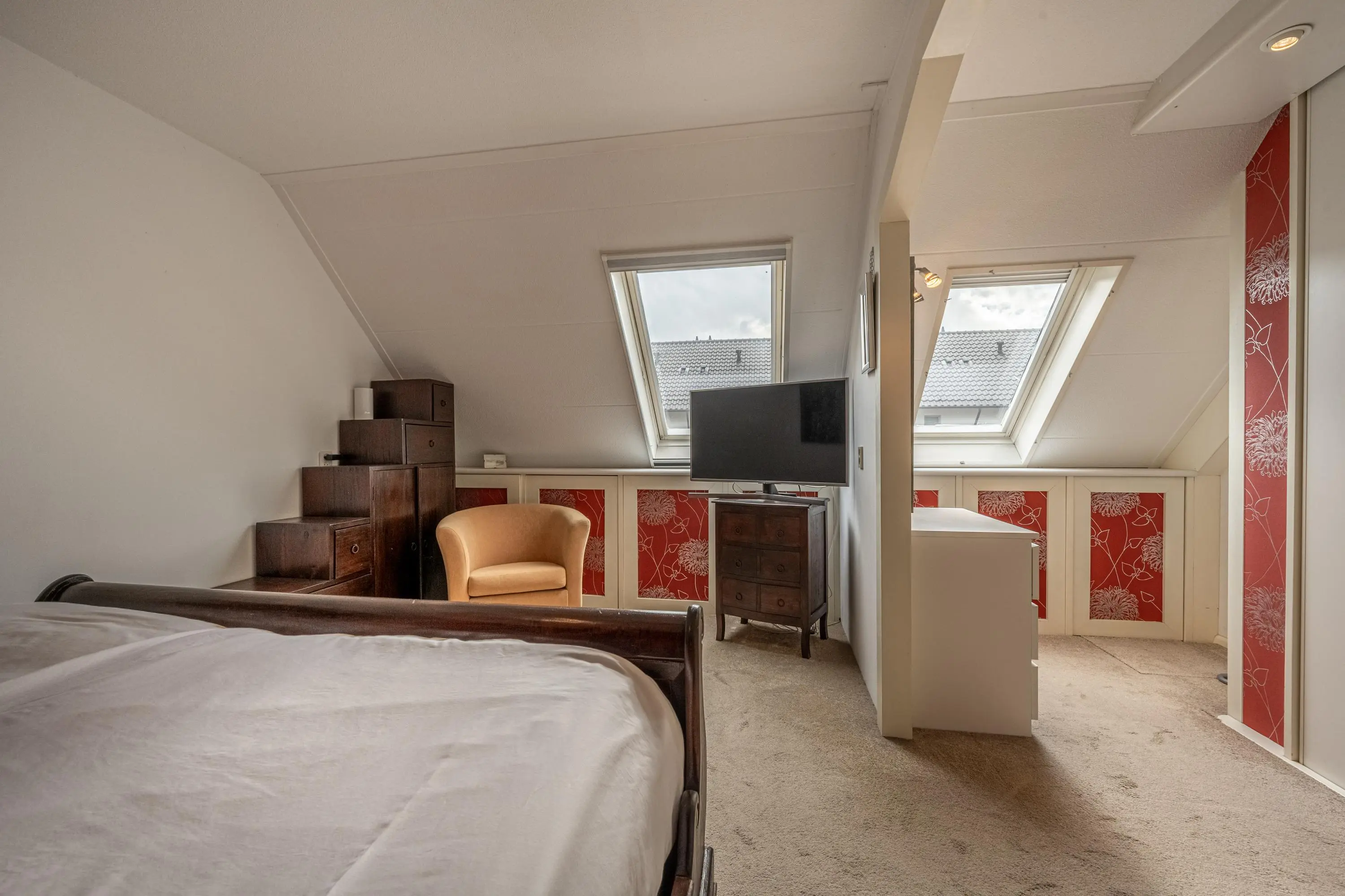 De overloop geeft toegang tot 2 slaapkamers en de badkamer. De slaapkamer aan de achterzijde is aanzienlijk vergroot en biedt daardoor ruimte voor het realiseren van een walk-in closet. Indien gewenst, kan de oorspronkelijke indeling met twee slaapkamers eenvoudig worden hersteld.