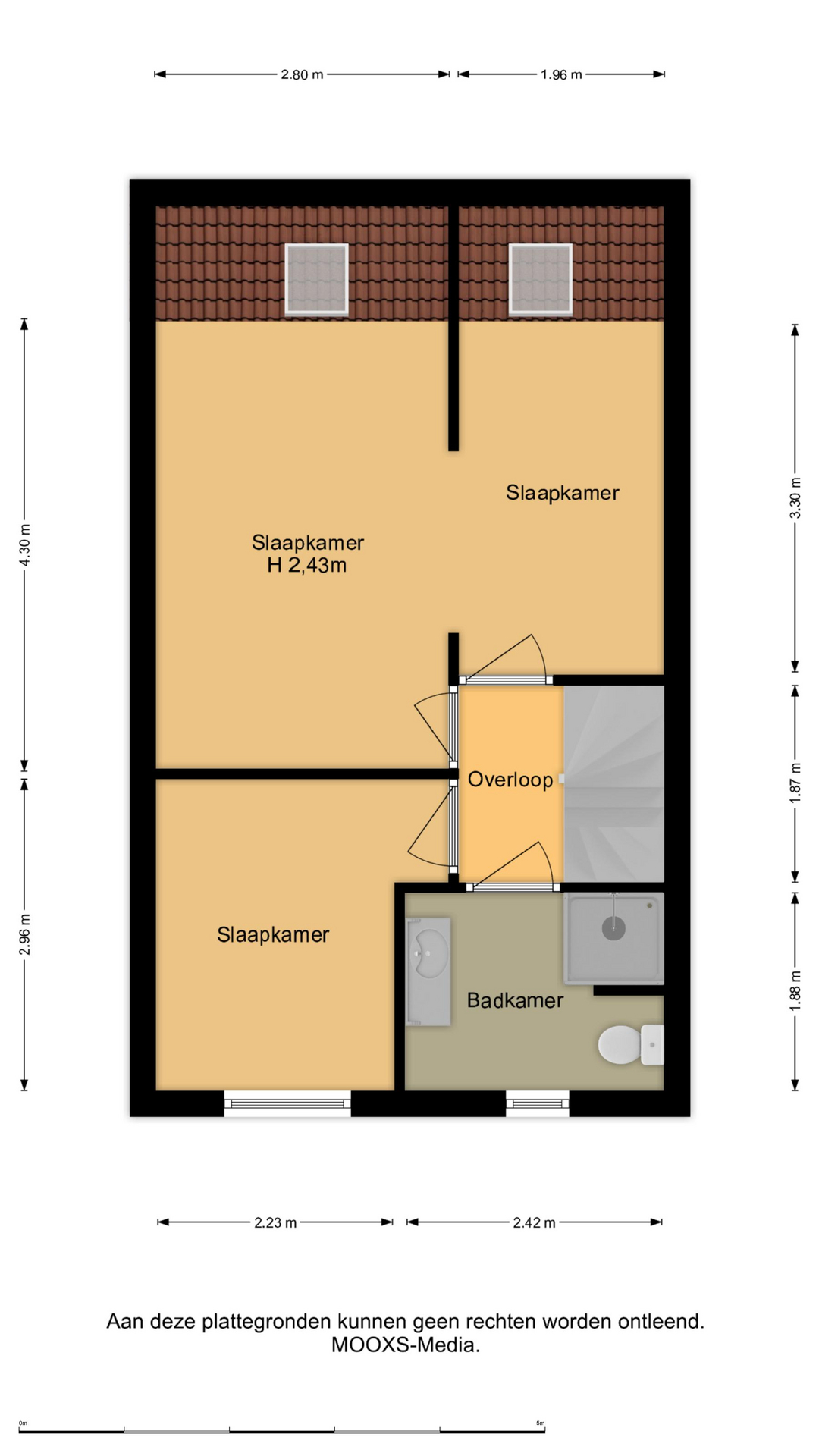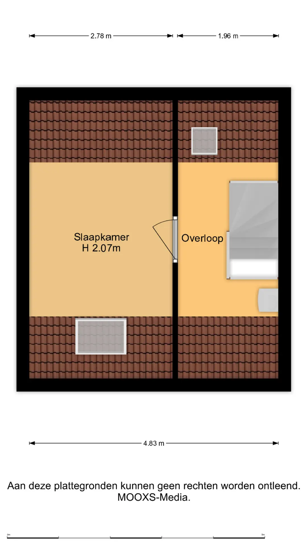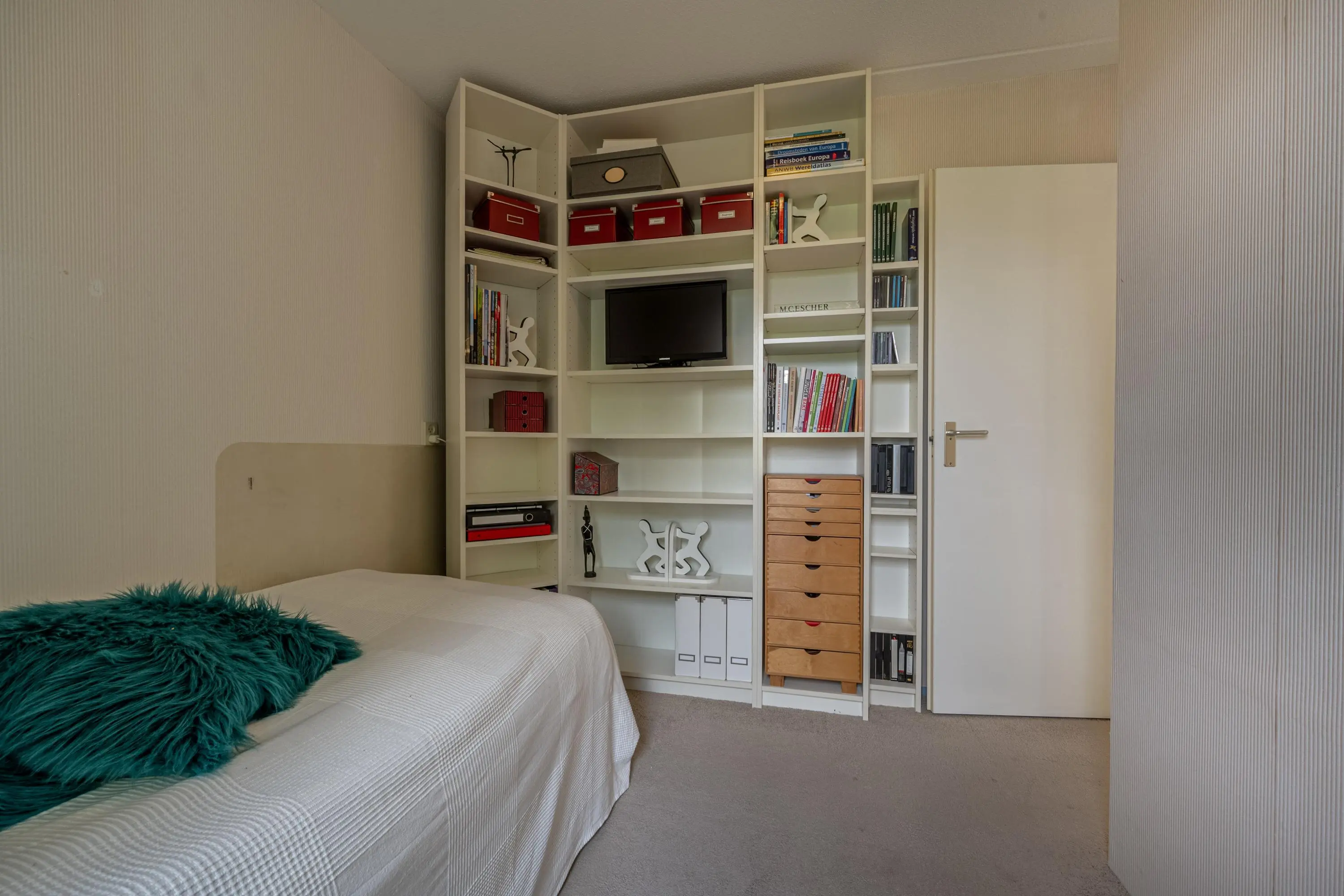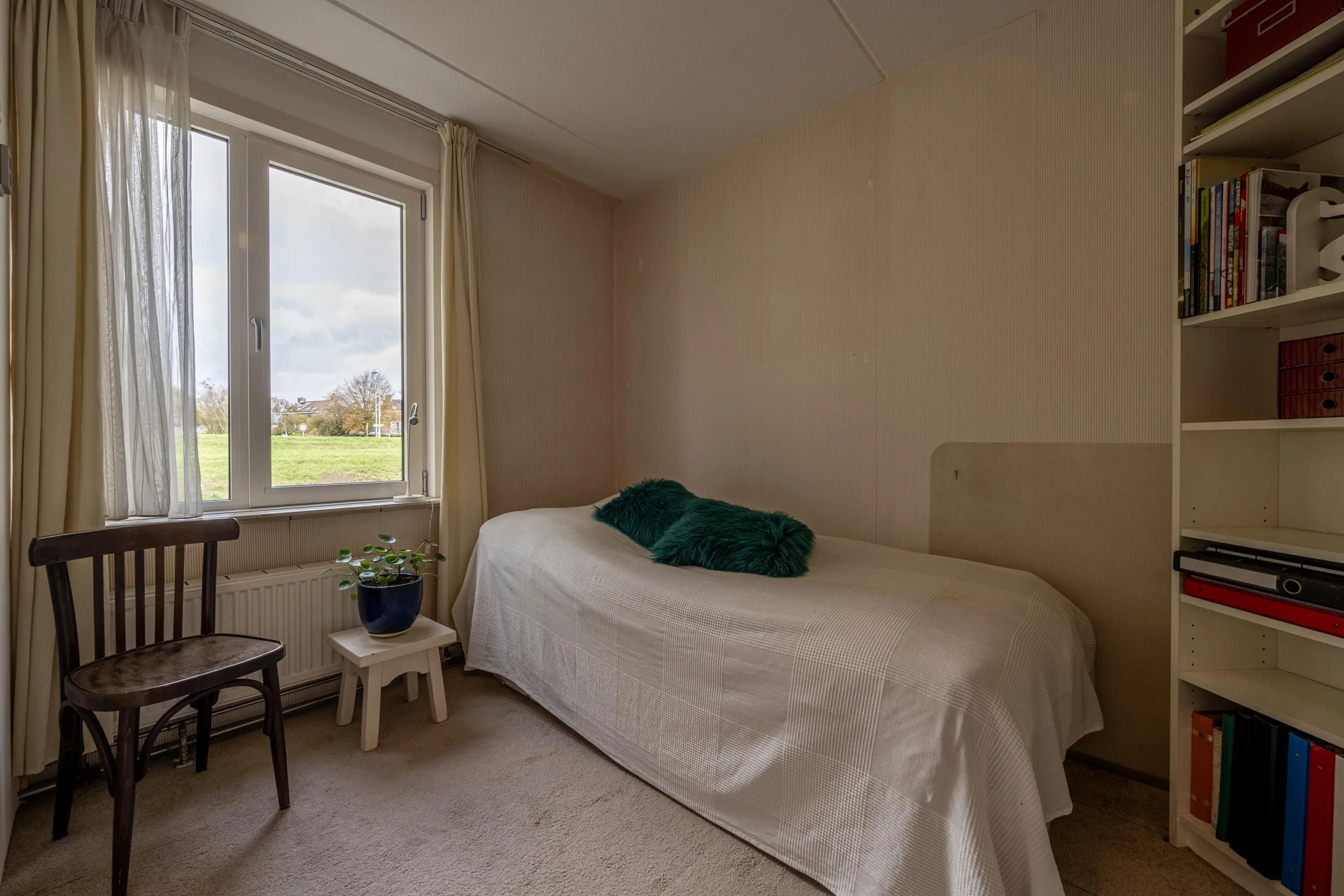 De overloop geeft toegang tot 2 slaapkamers en de badkamer. De slaapkamer aan de achterzijde is aanzienlijk vergroot en biedt daardoor ruimte voor het realiseren van een walk-in closet. Indien gewenst, kan de oorspronkelijke indeling met twee slaapkamers eenvoudig worden hersteld.