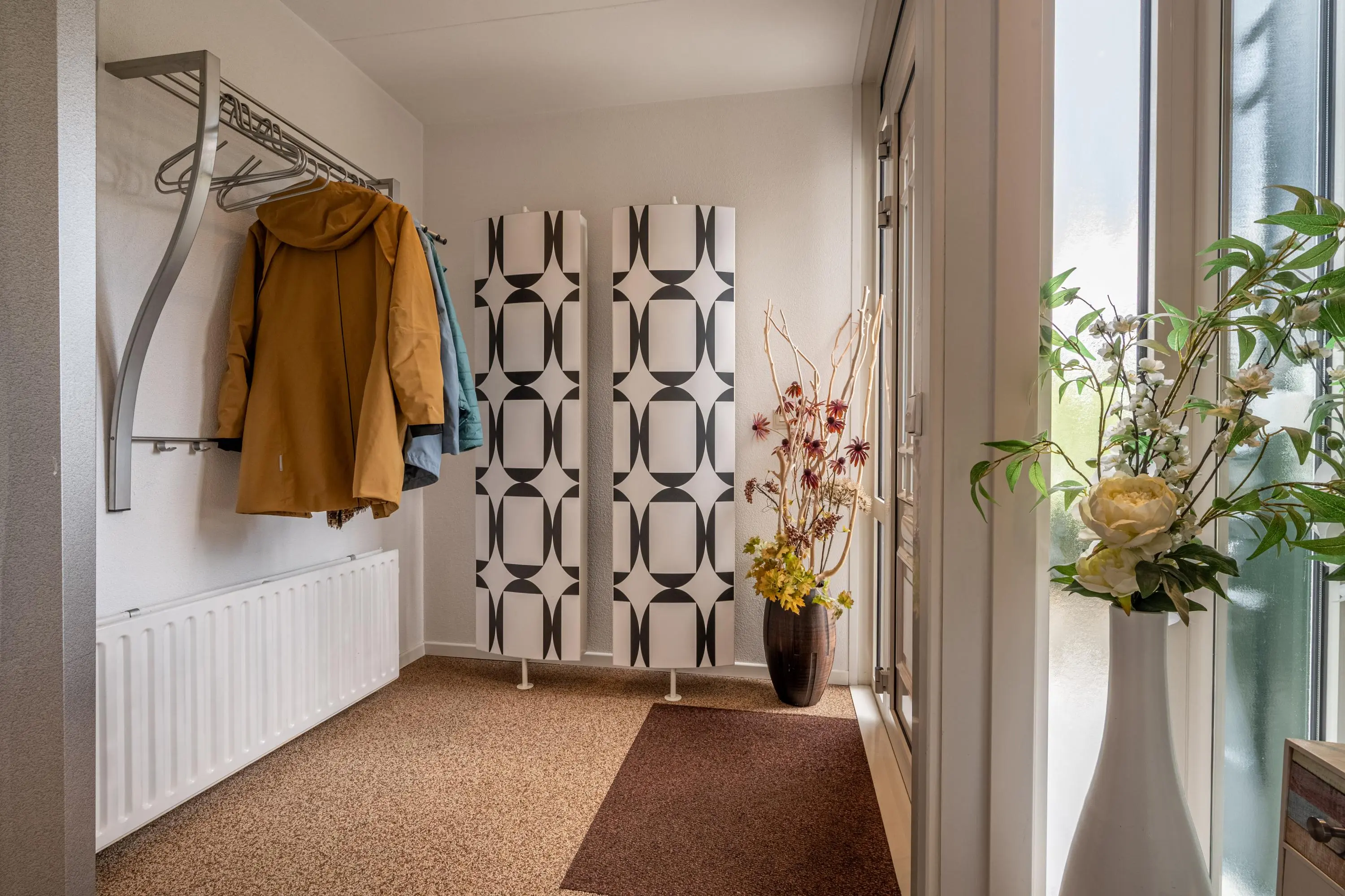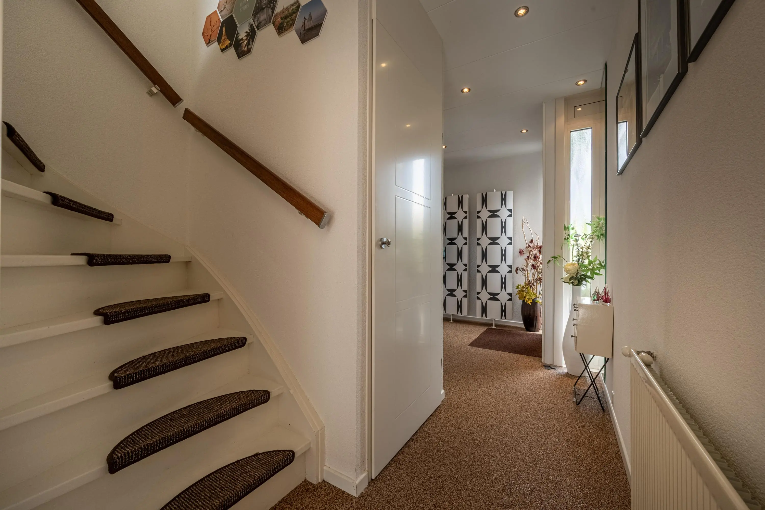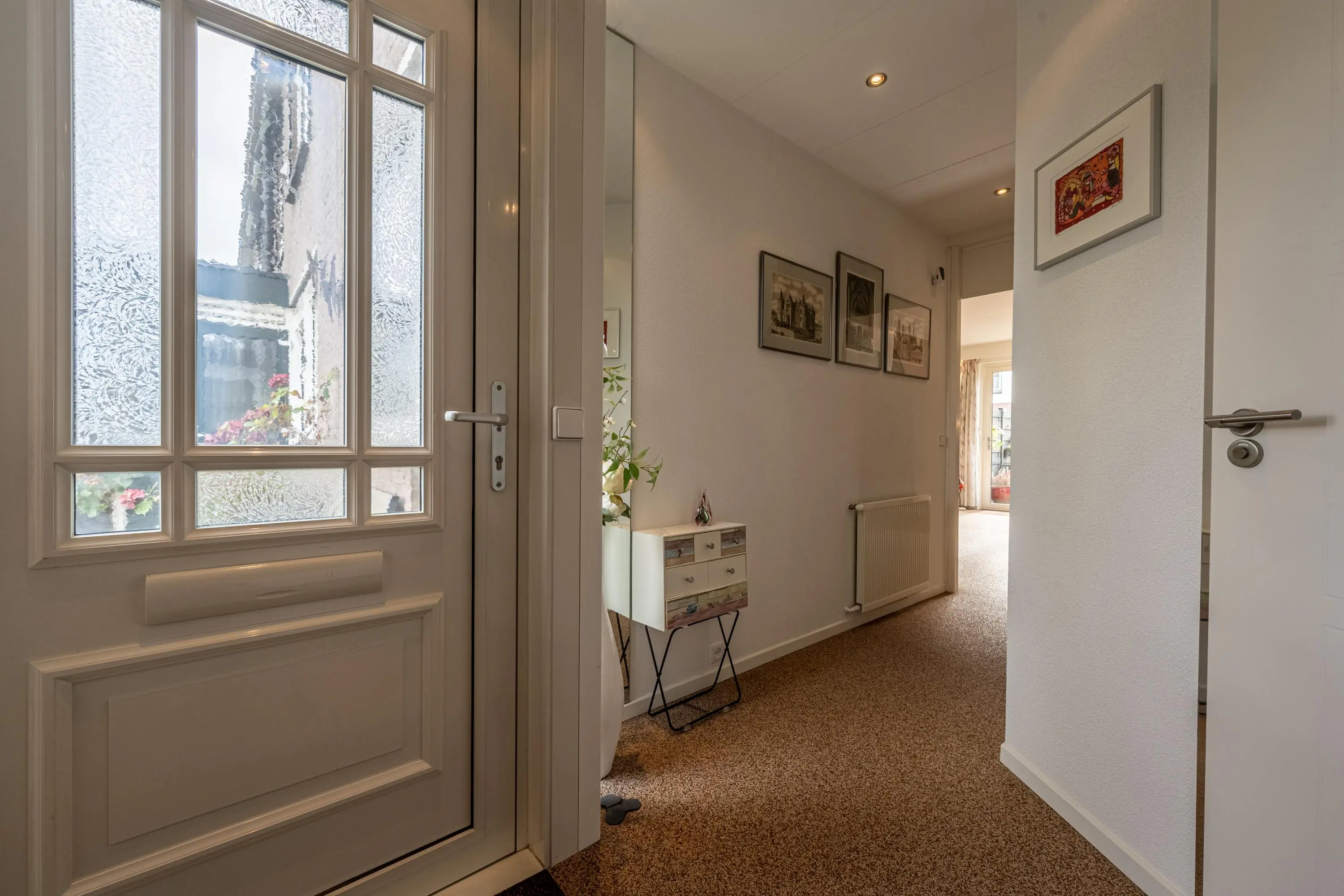 De vergrote hal geeft toegang tot de tuingerichte woonkamer met een aluminium schuifpui naar de riante achtertuin.