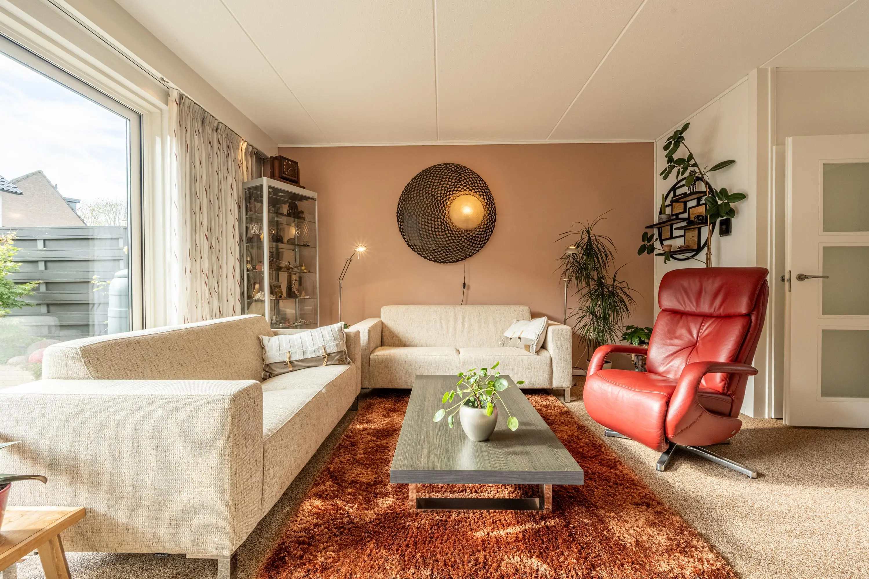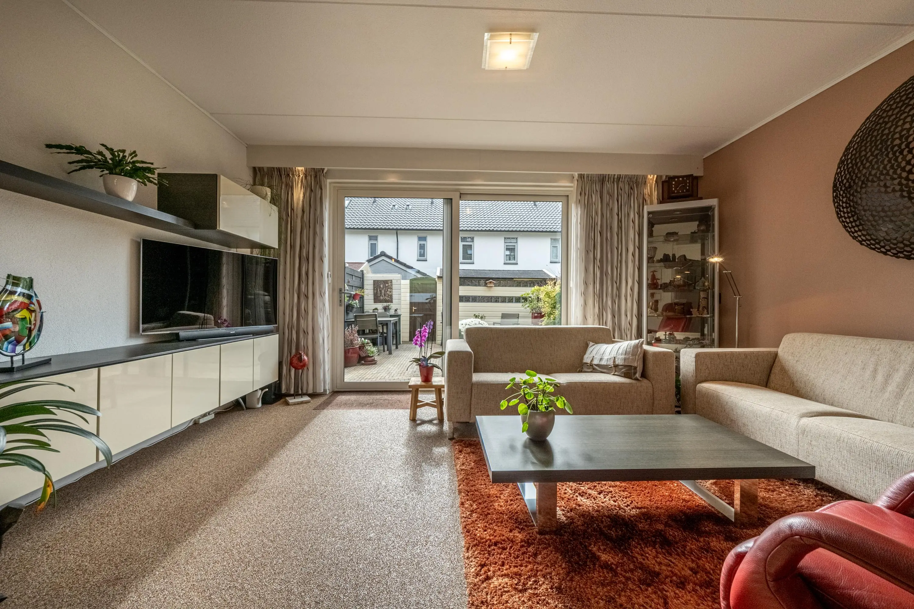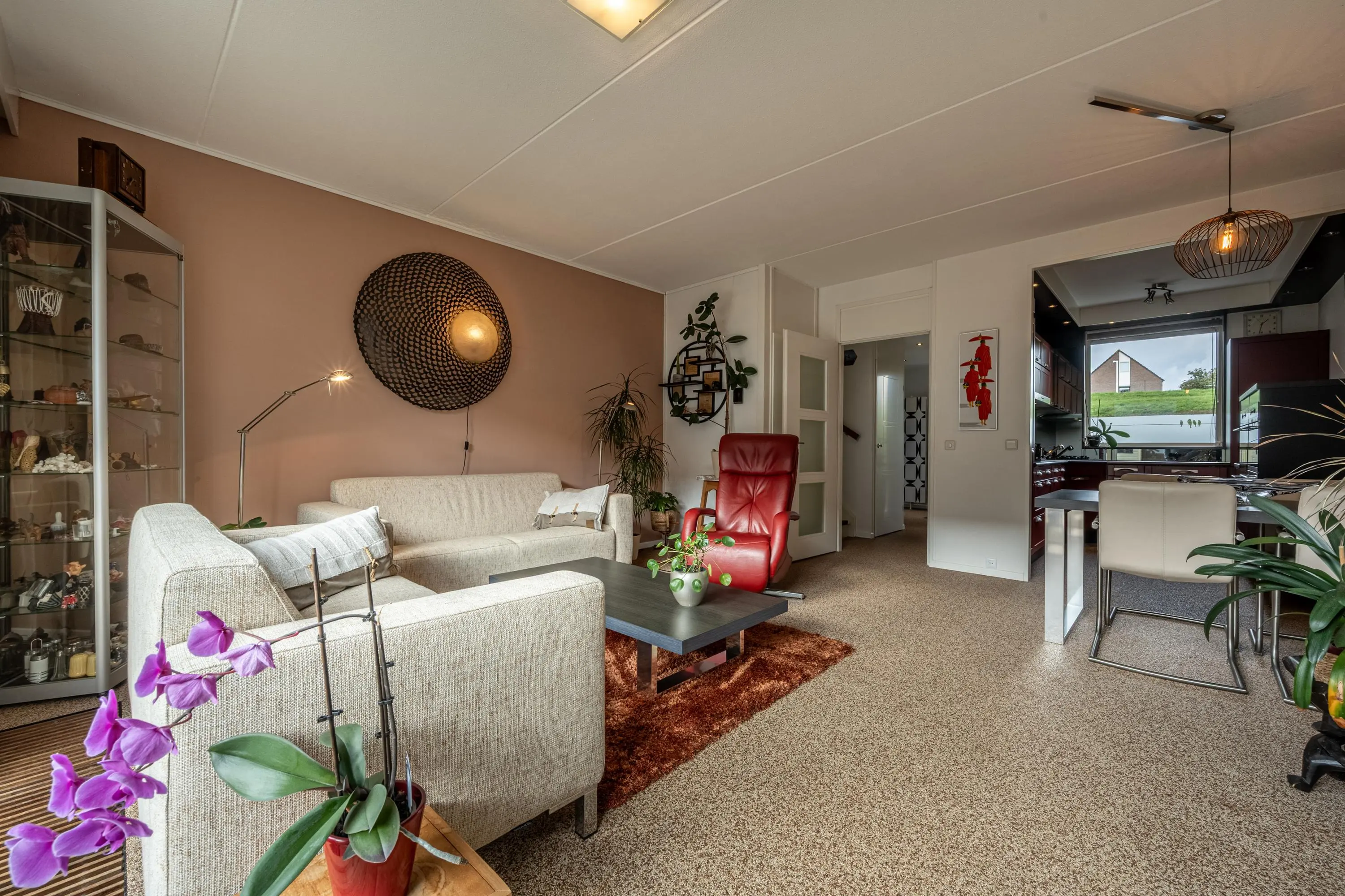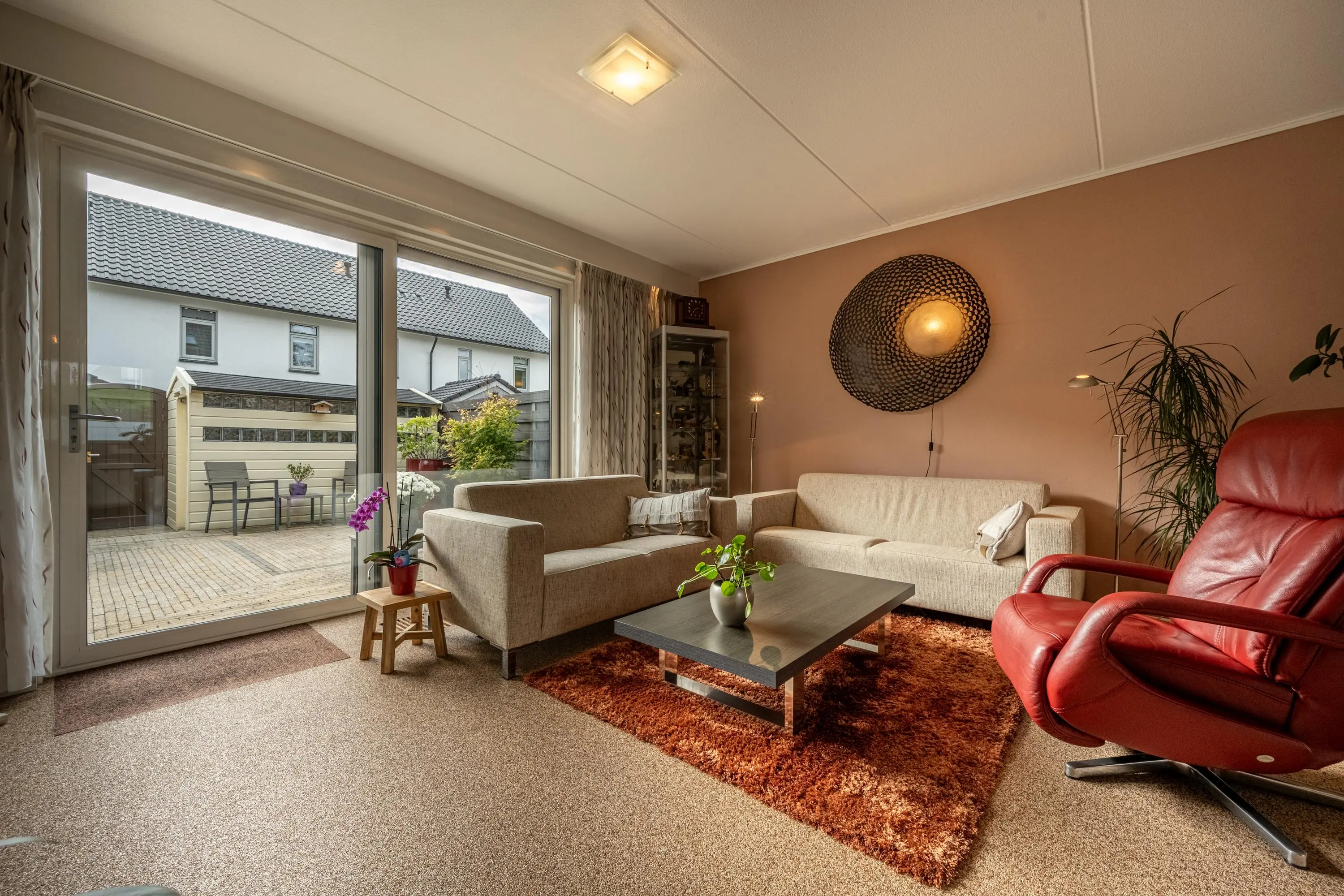 De vergrote hal geeft toegang tot de tuingerichte woonkamer met een aluminium schuifpui naar de riante achtertuin.