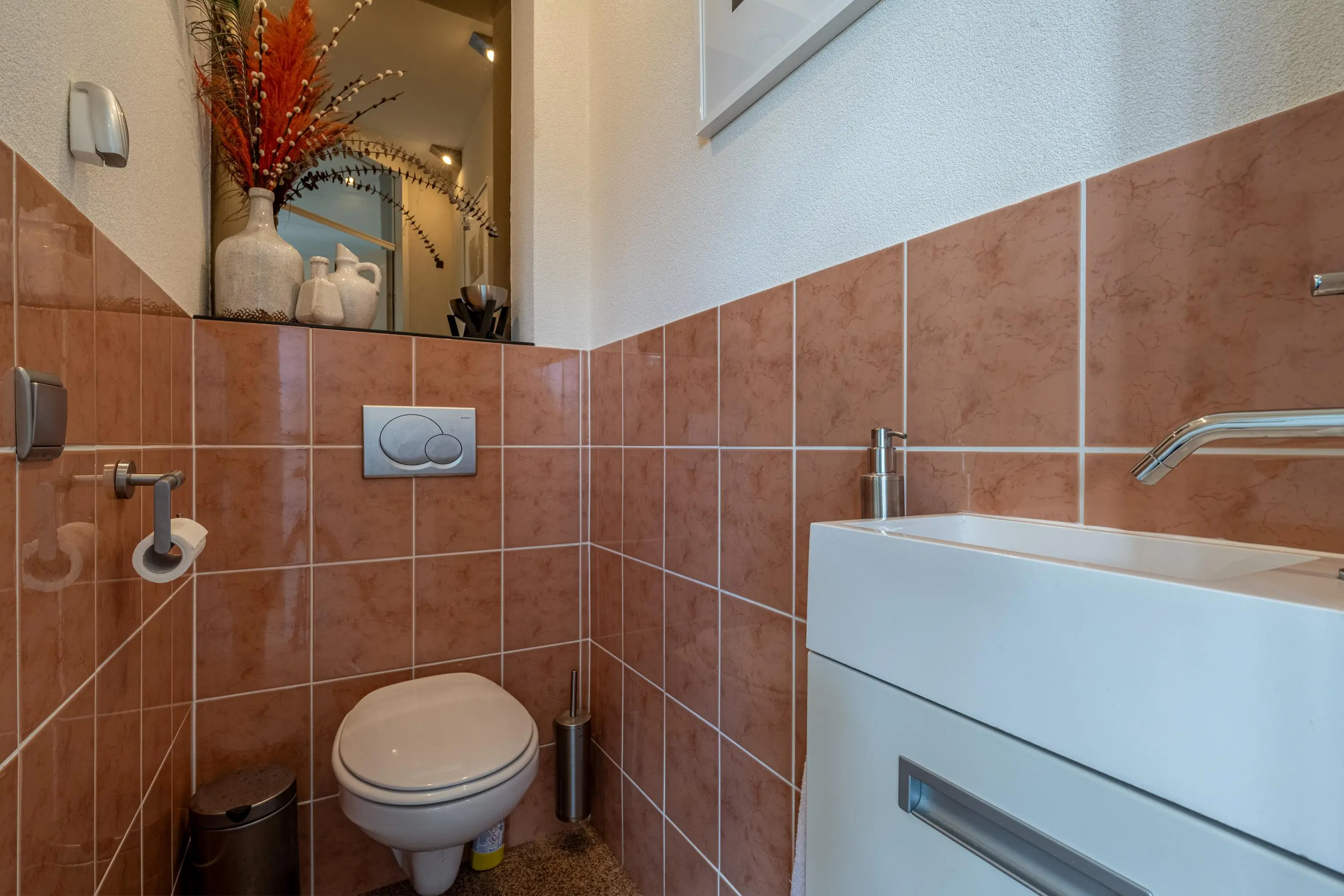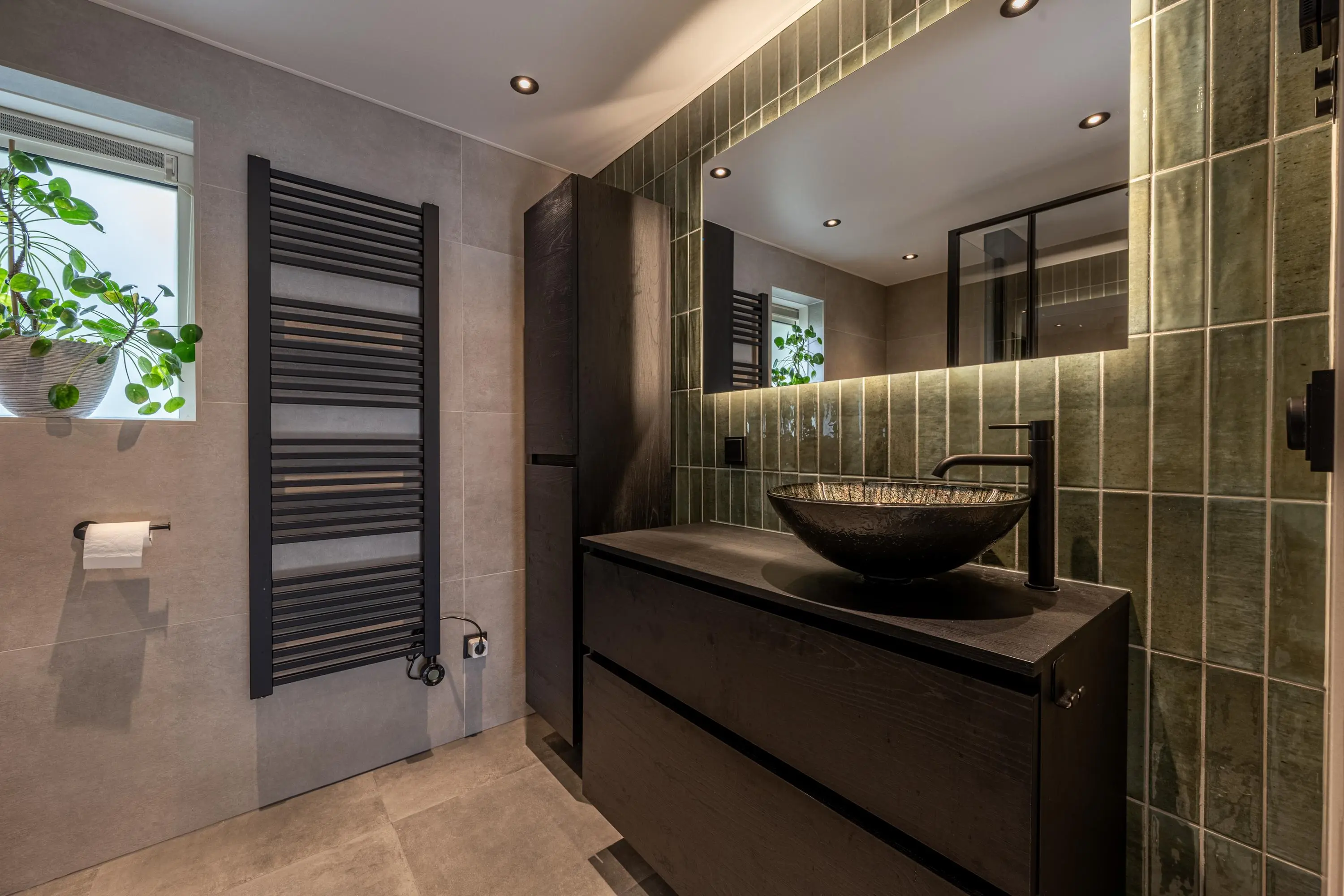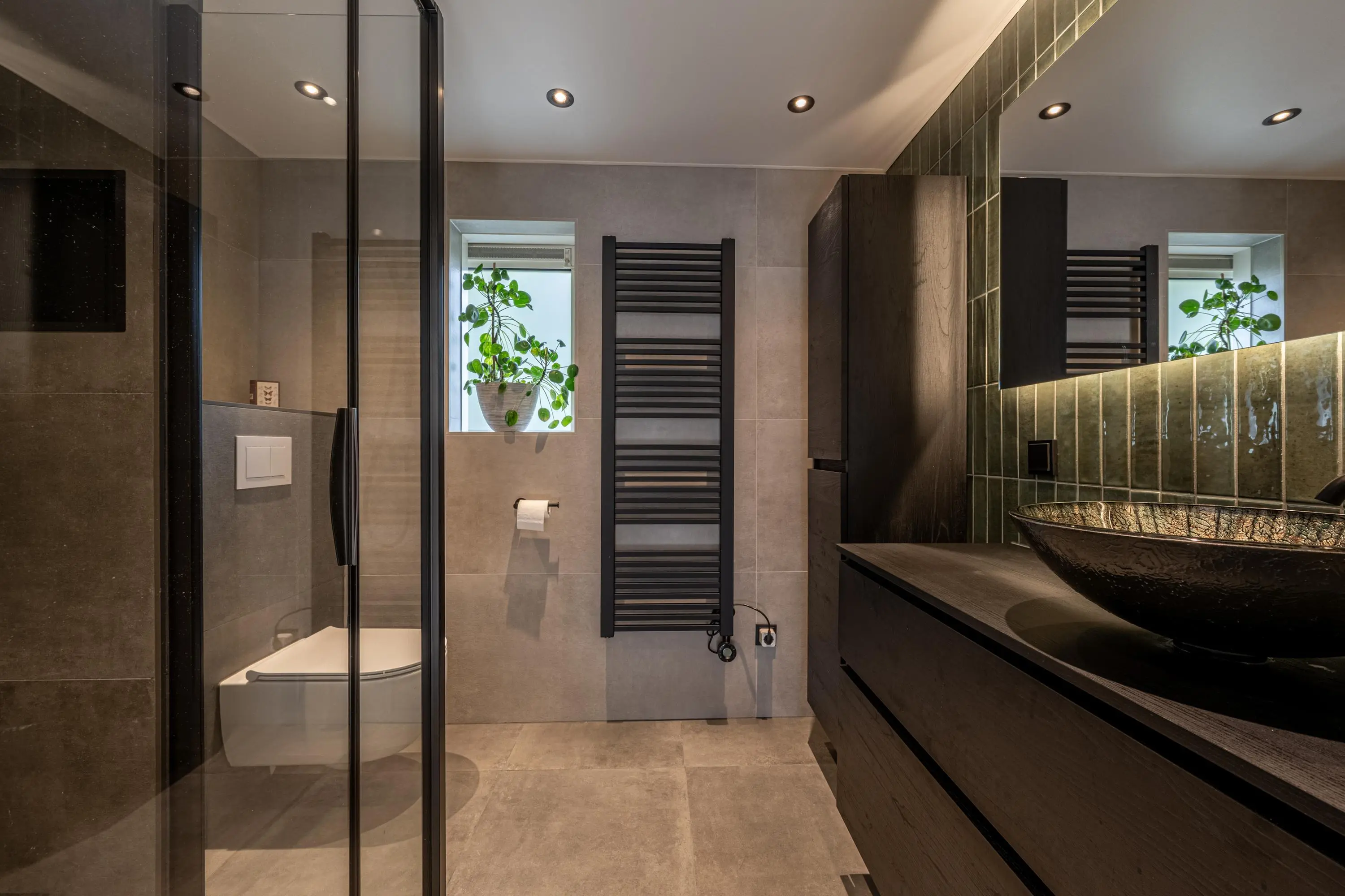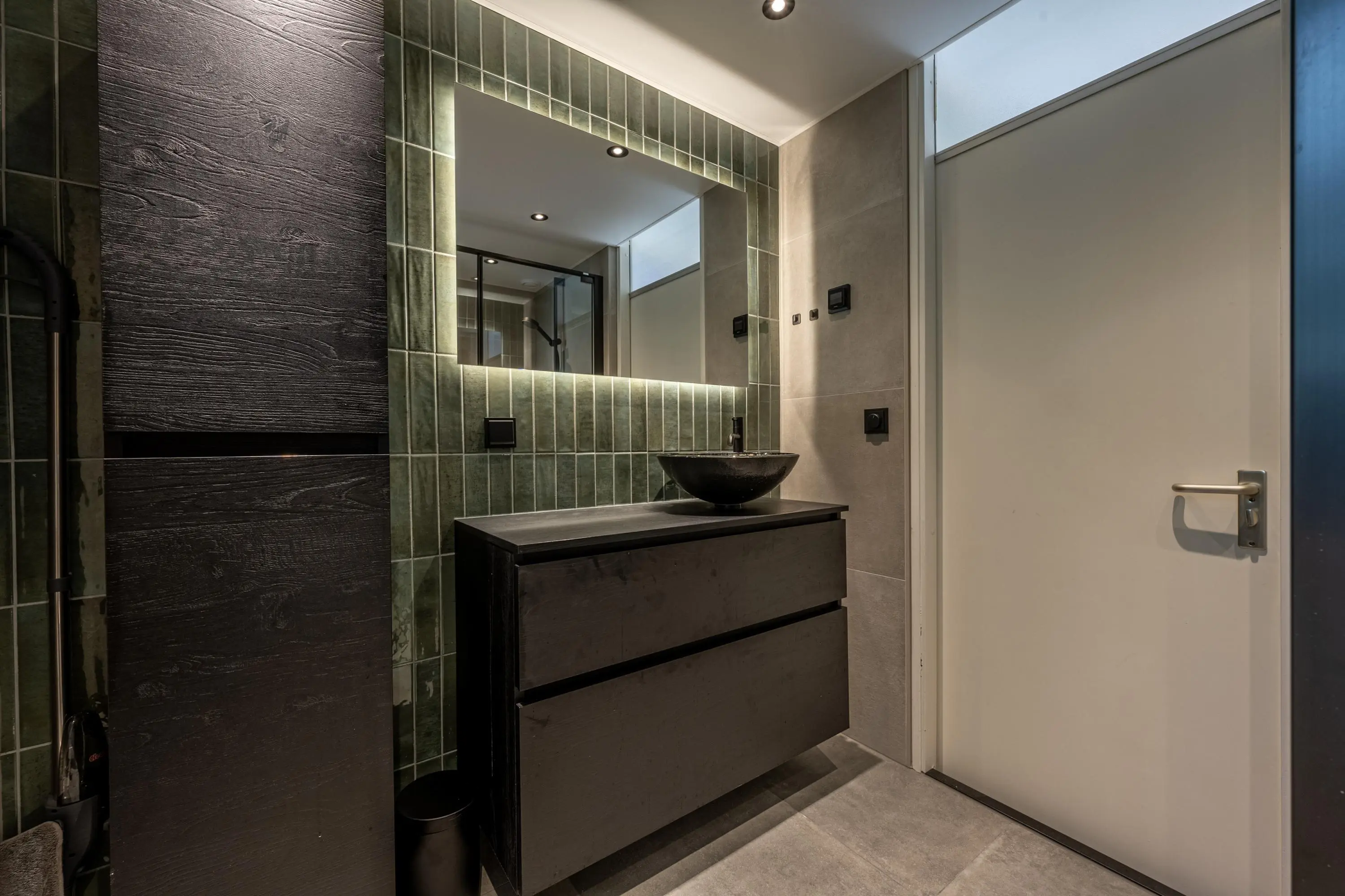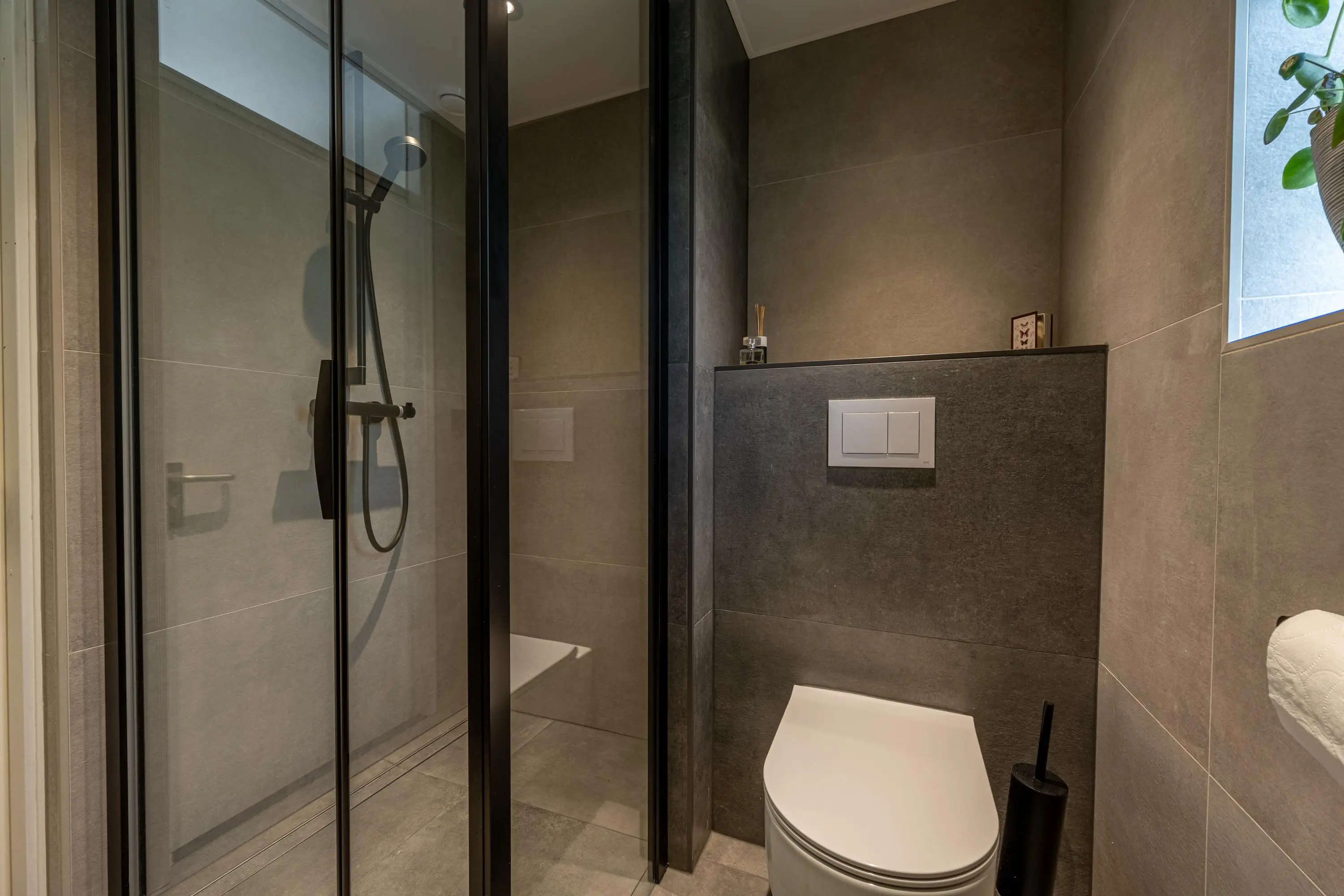 De badkamer (2024) is een echte blikvanger: modern, stijlvol en tot in de puntjes afgewerkt. Het geheel is voorzien van een elegant wastafelmeubel met trendy waskom, een 2e toilet, een ruime douchecabine en een designradiator. Dankzij de dimbare inbouwspots en de comfortabele vloerverwarming ademt de badkamer luxe en ontspanning.