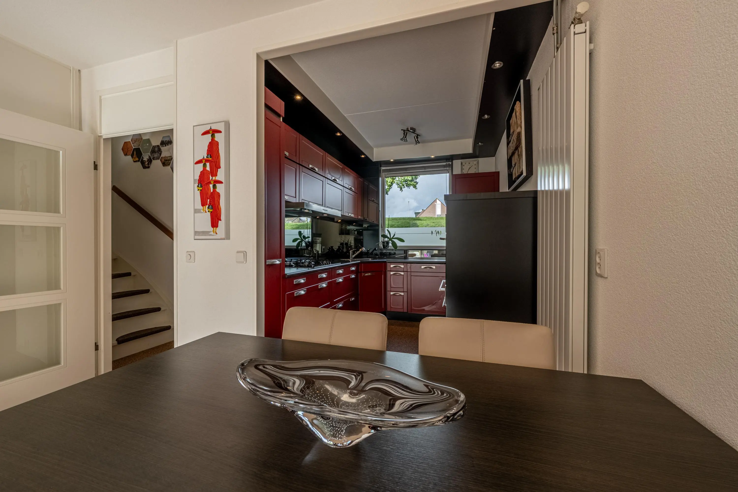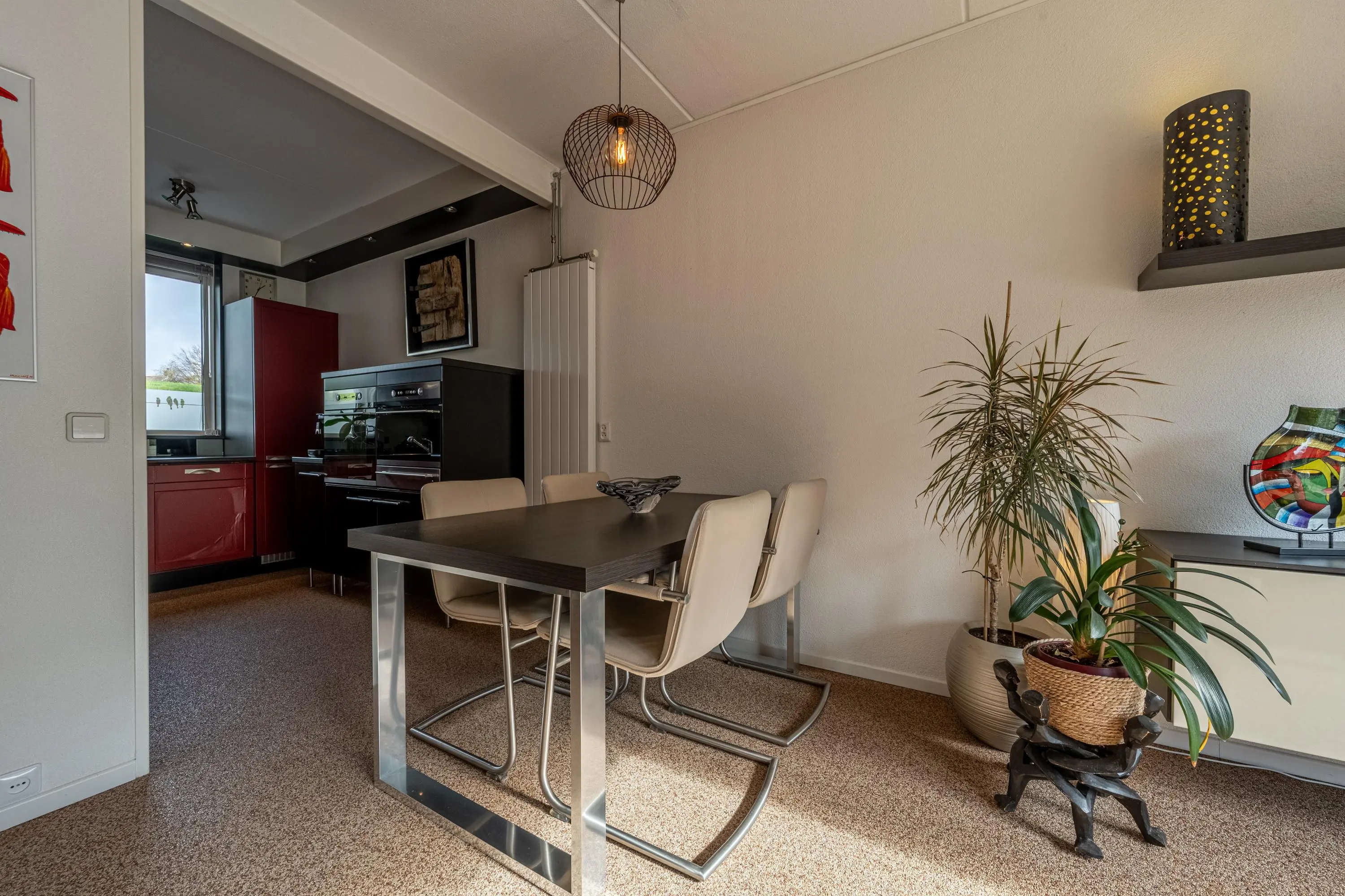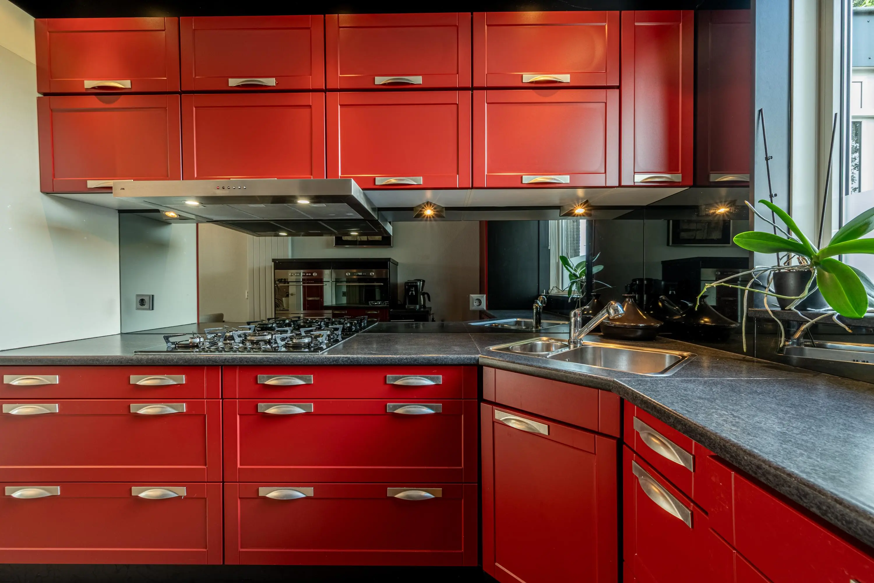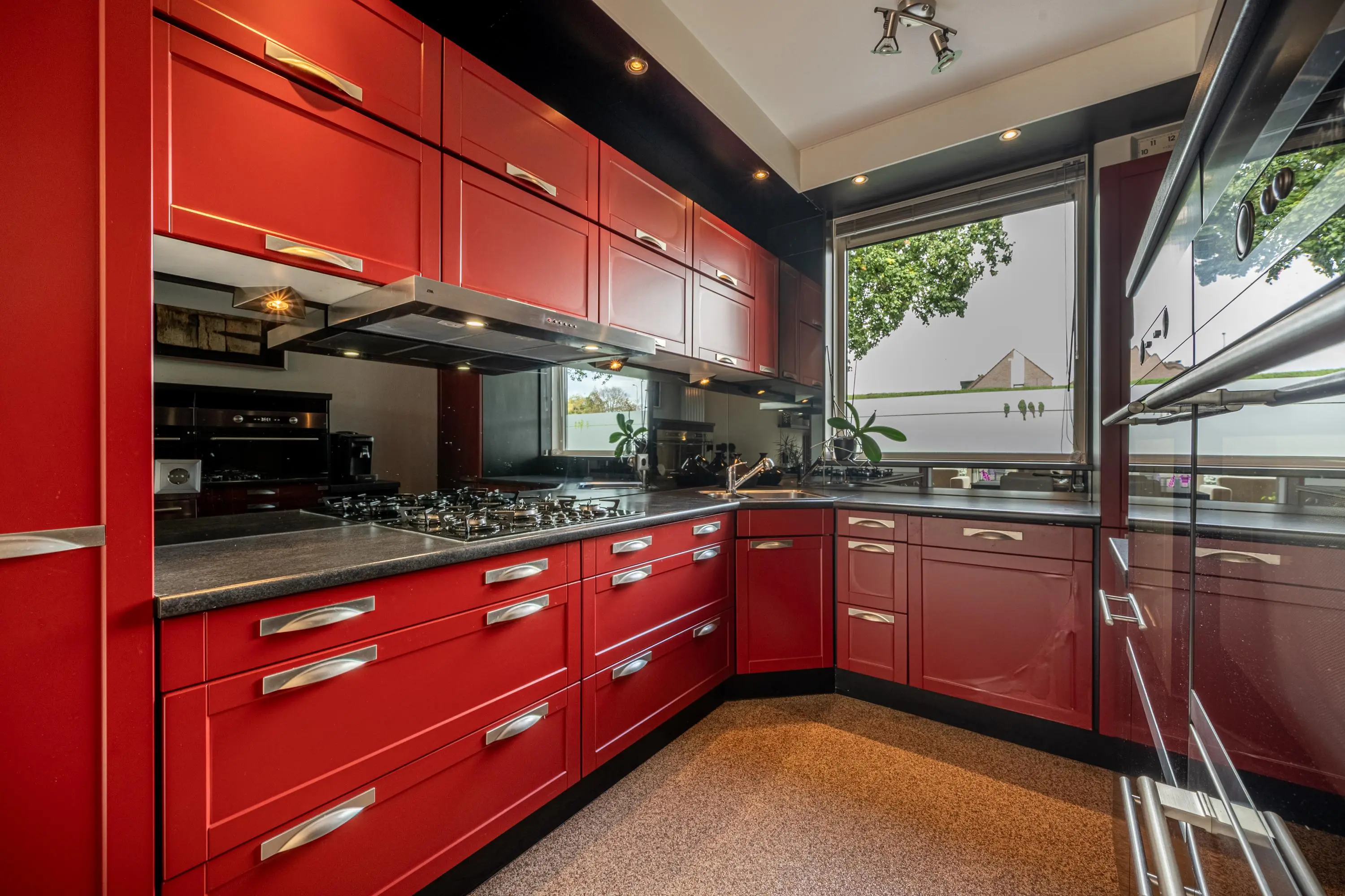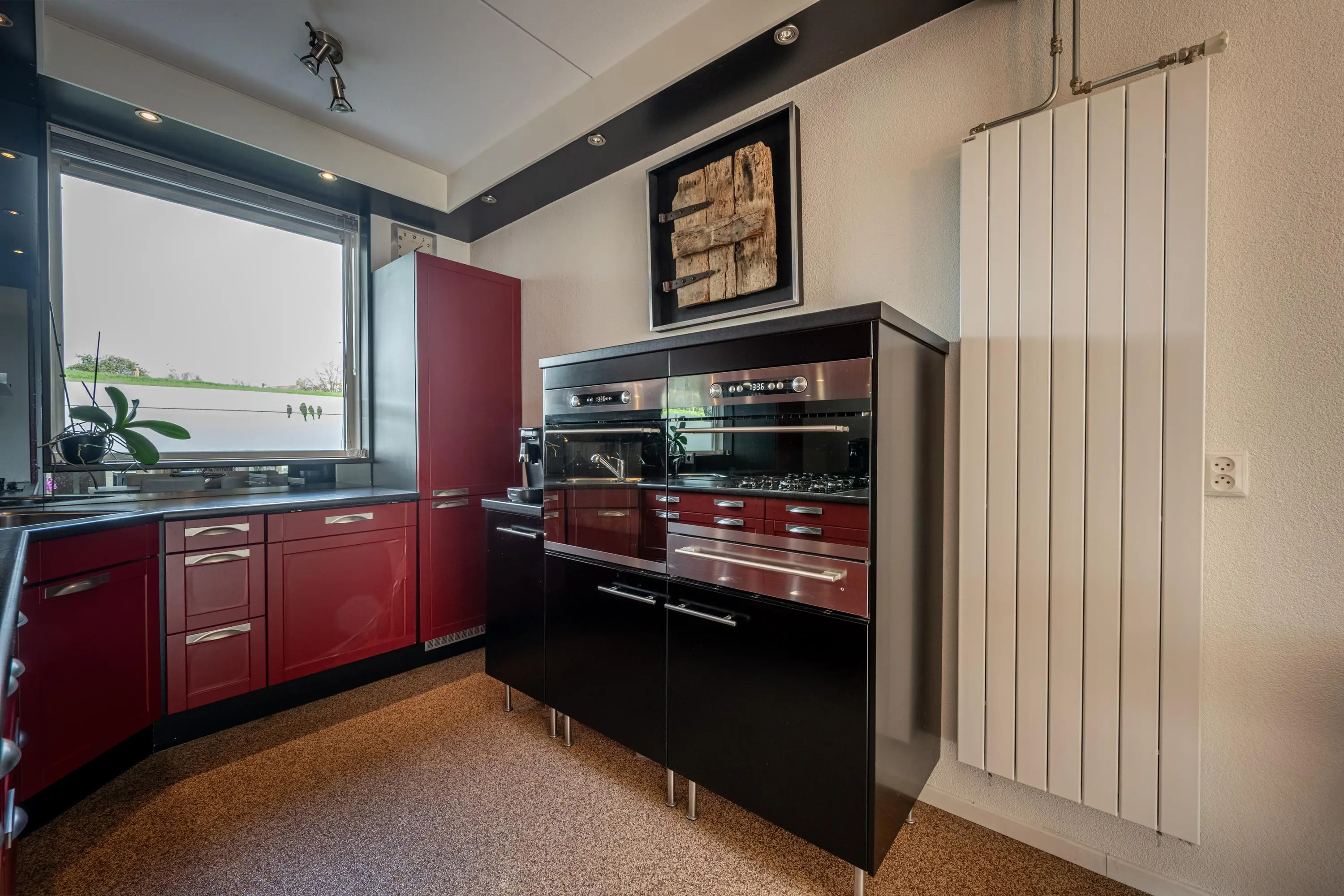 Aan de voorzijde van de woning bevindt zich de complete keuken in wandopstelling, uitgerust met diverse inbouwapparatuur, waaronder een 5-pits gasfornuis, afzuigkap, oven, combimagnetron, warmhoudlade, vaatwasser en koel-/vriescombinatie. De praktische apothekerskast biedt extra bergruimte en vanuit het raam is er uitzicht op de groene Spuidijk.