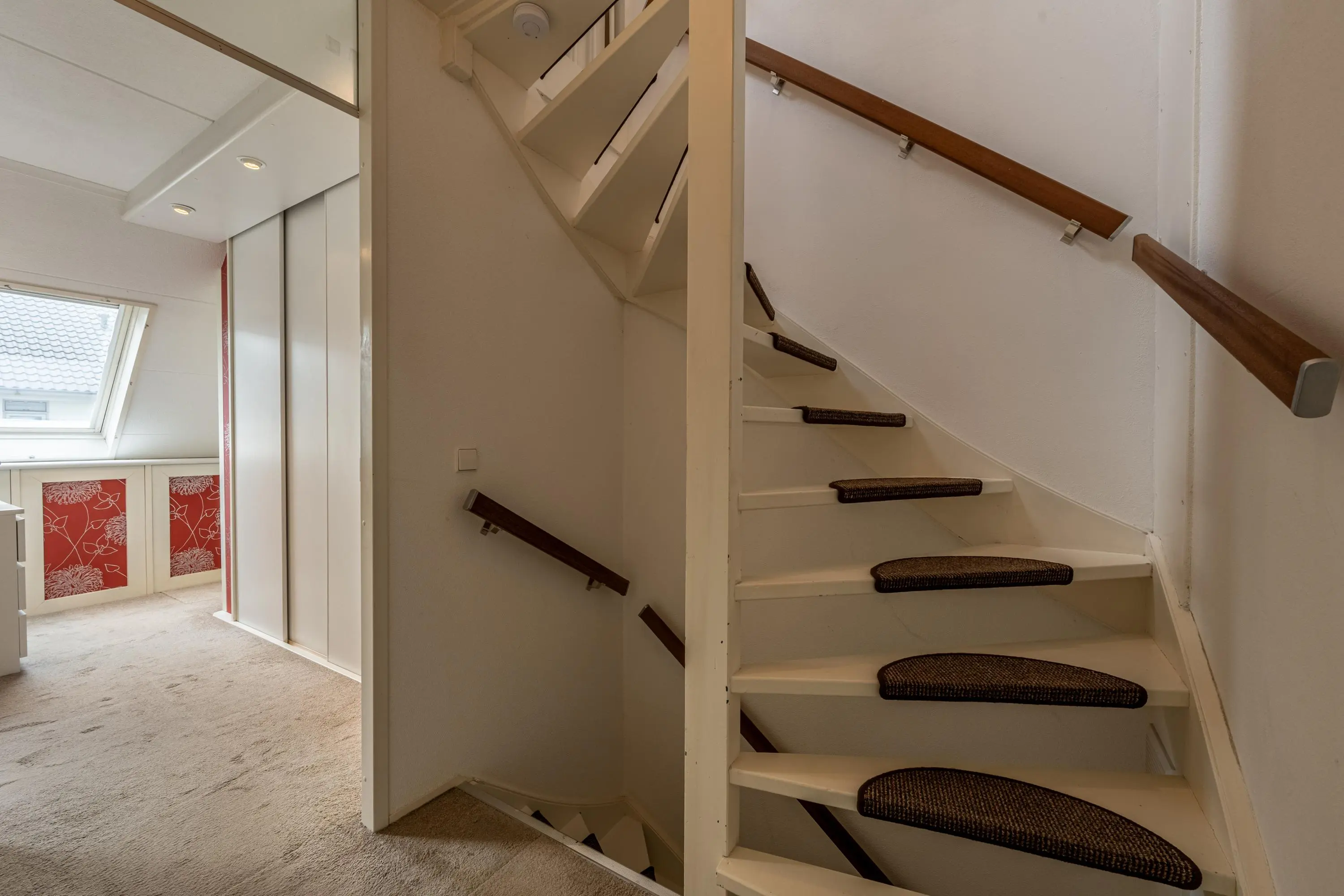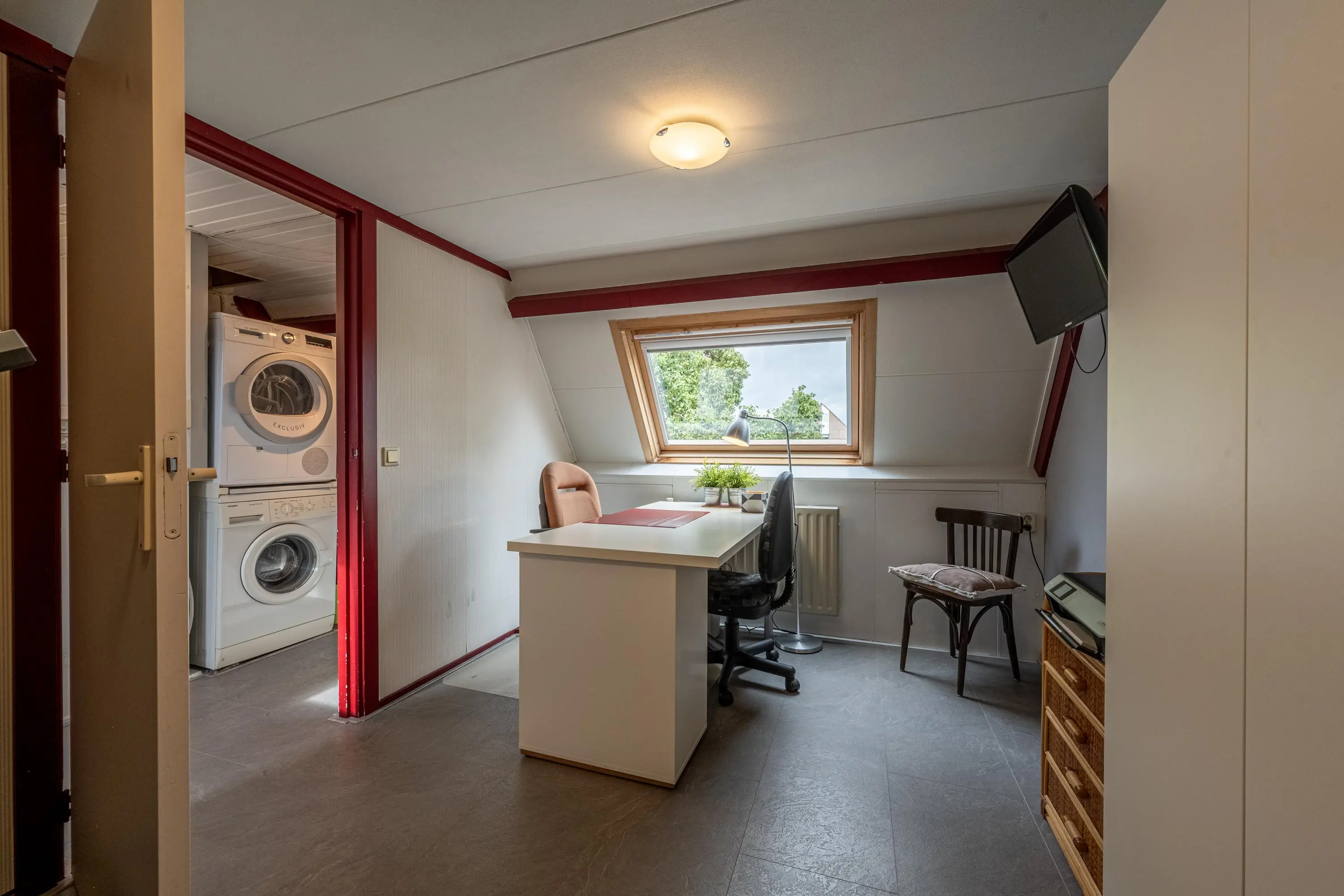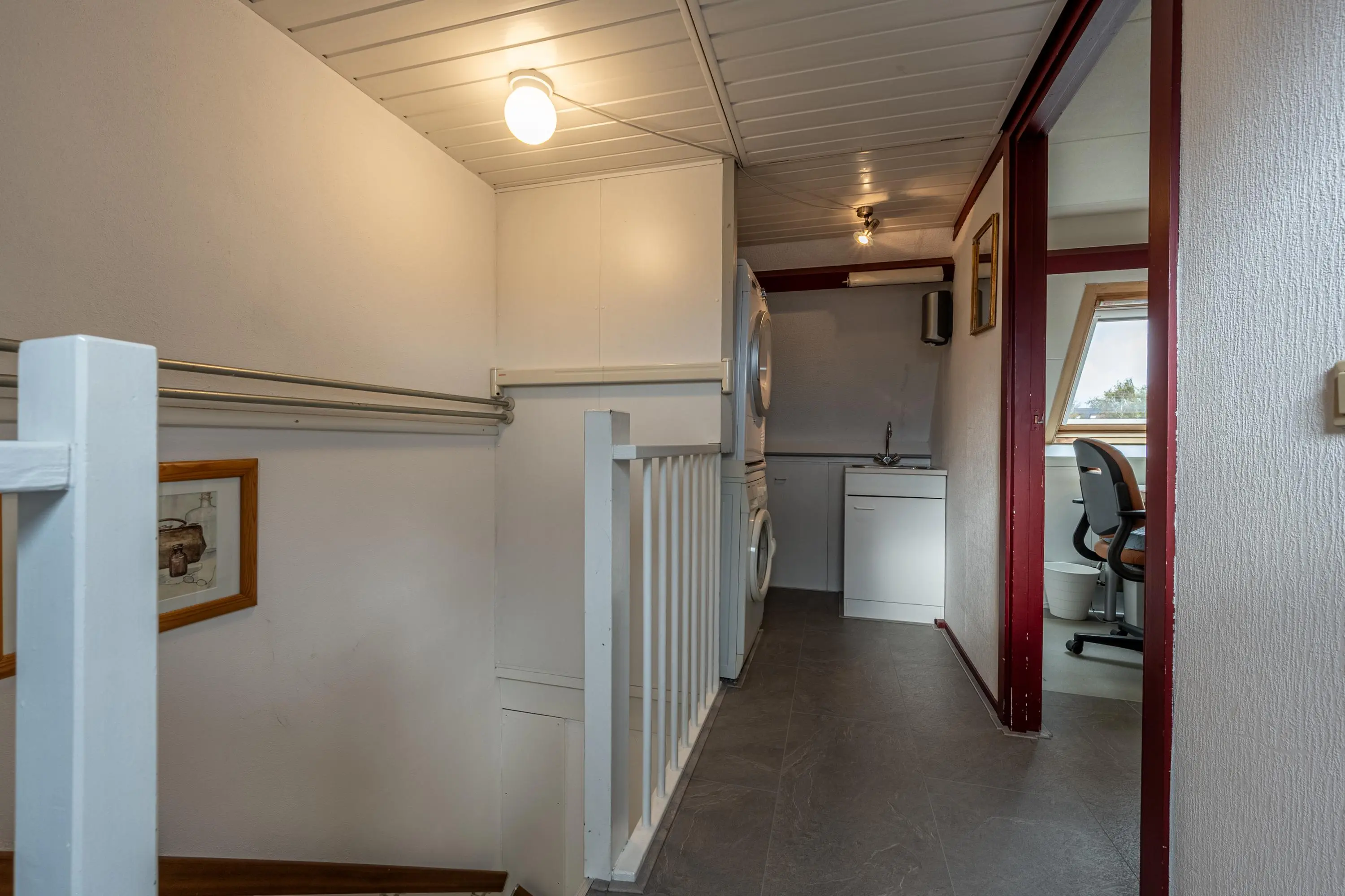 Middels een vaste trap bereikt u de voorzolder met veel bergruimte, een handige spoelbak, aansluitingen en opstelplaatsen voor wasmachine, droger en de cv-combiketel. Er is toegang tot een ruime slaapkamer, voorzien van een Velux dakraam.