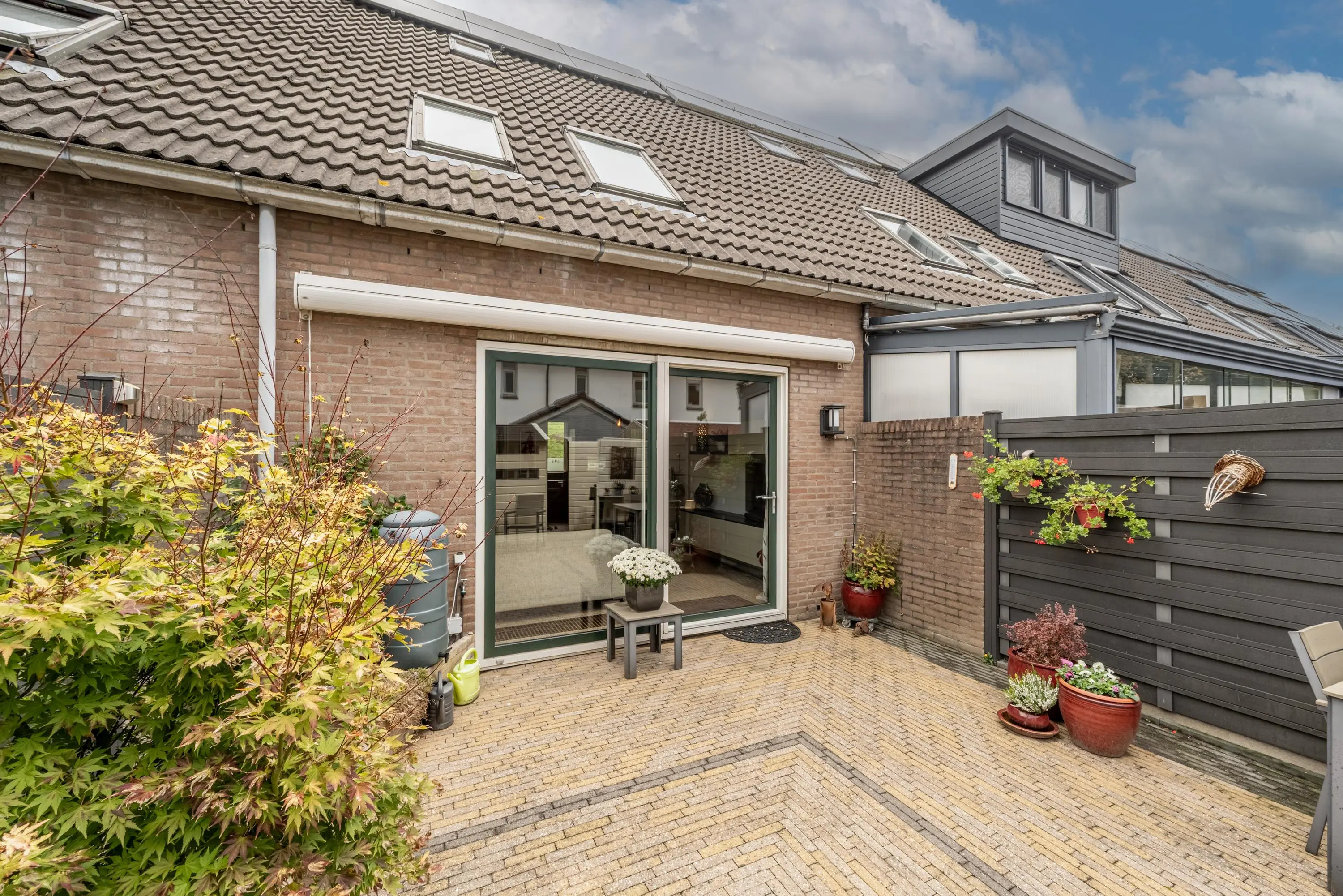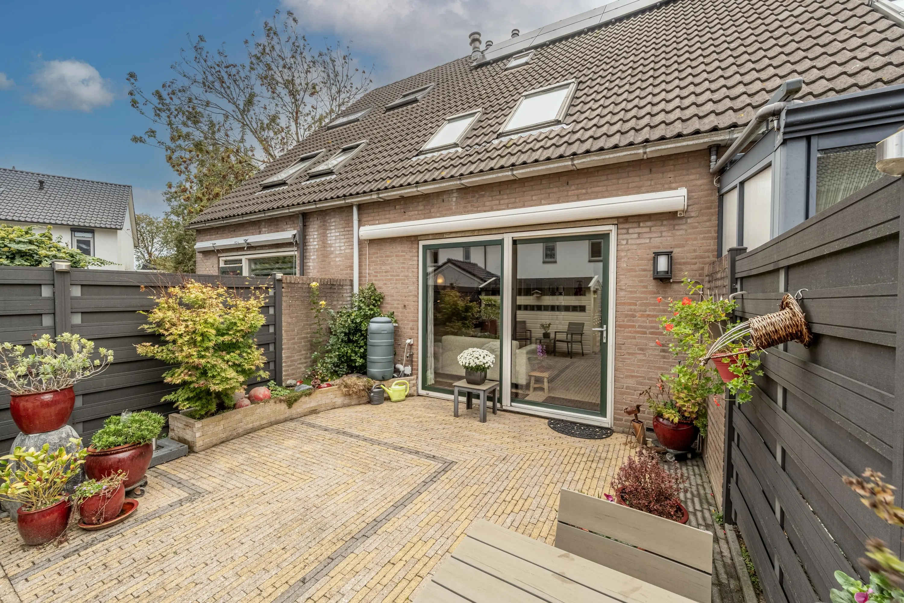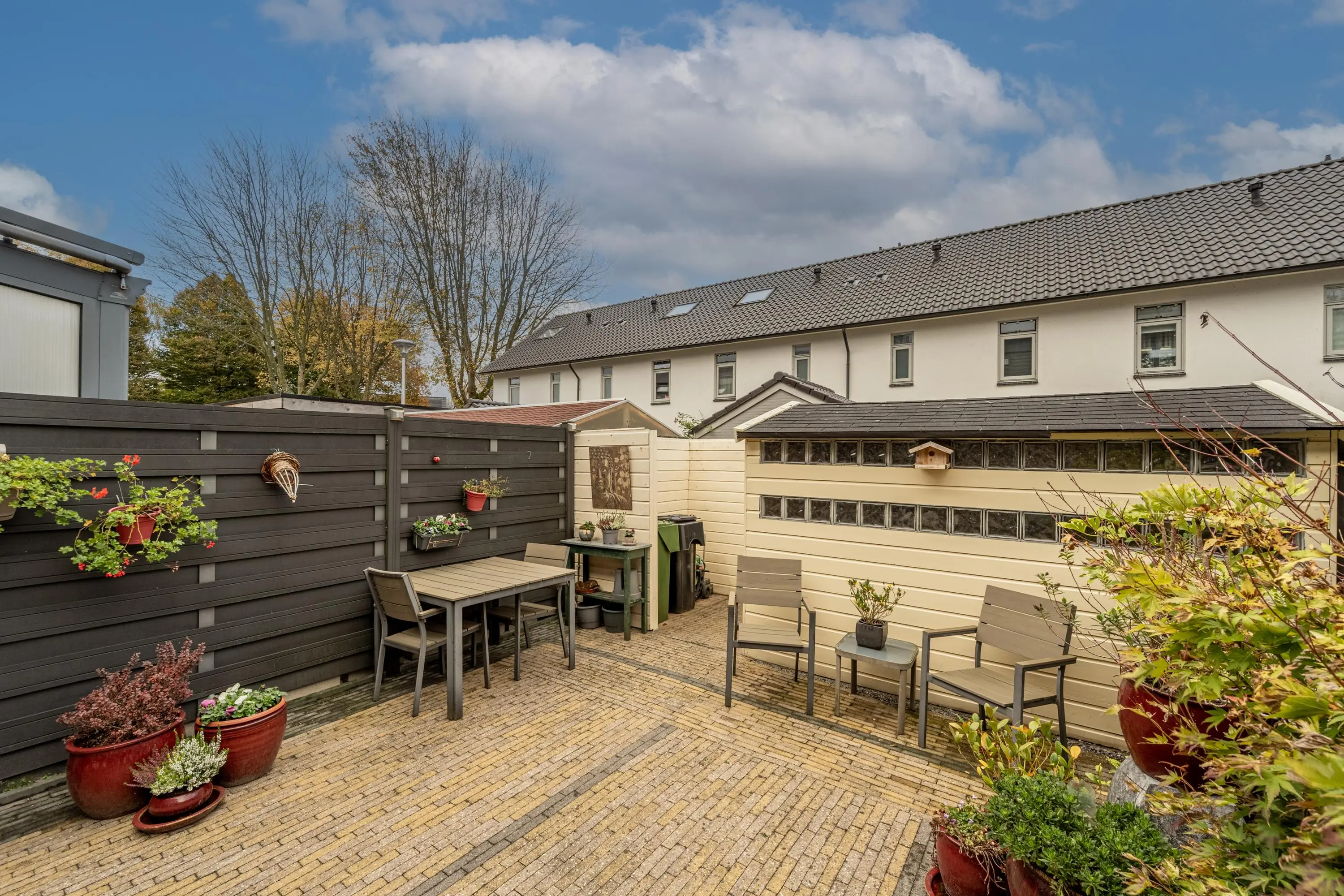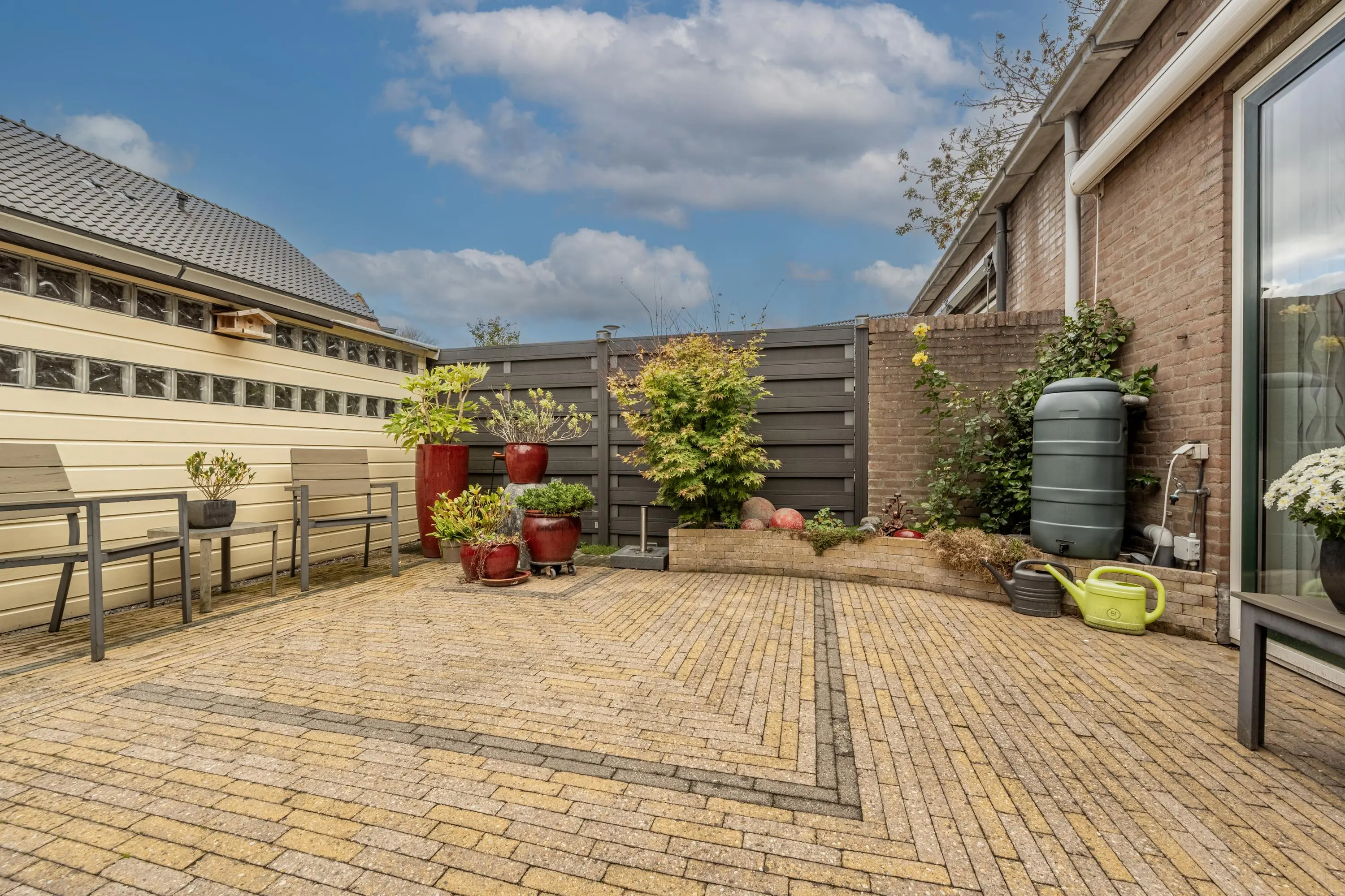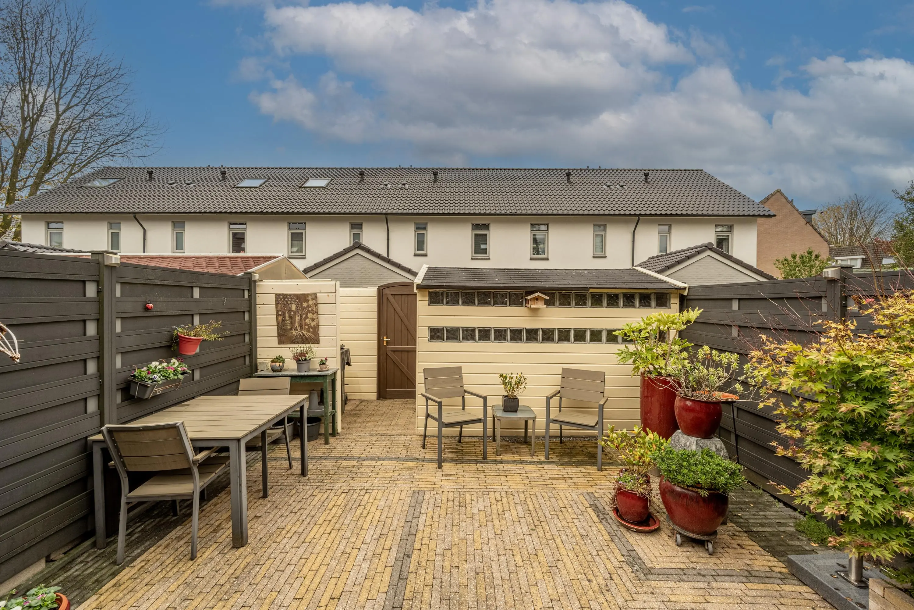 De gezellige achtertuin met achterom is gunstig gelegen op het zuiden en uitgerust met sierbestrating, vaste beplanting, nette borders en een waterkraan. Een elektrisch zonnescherm biedt schaduw op warme dagen. Achterin de tuin staat een houten schuur met voldoende ruimte voor fietsen en/of tuingereedschap.