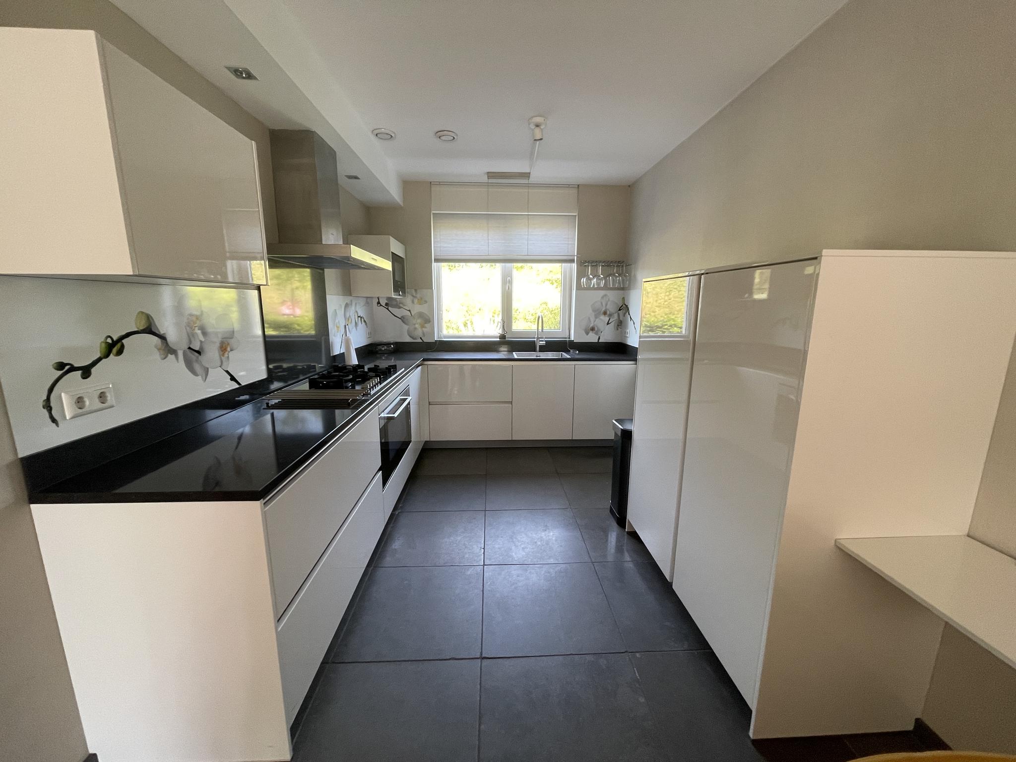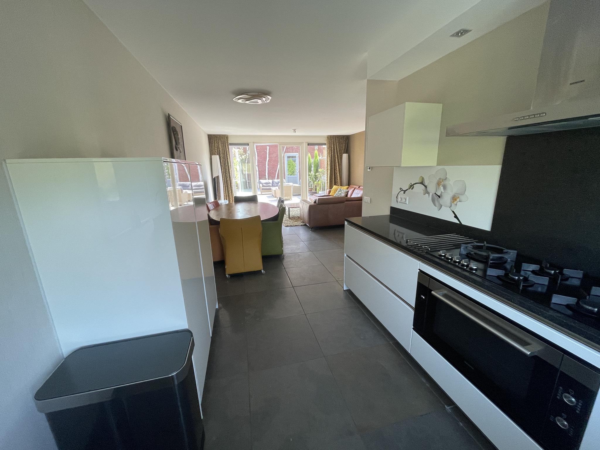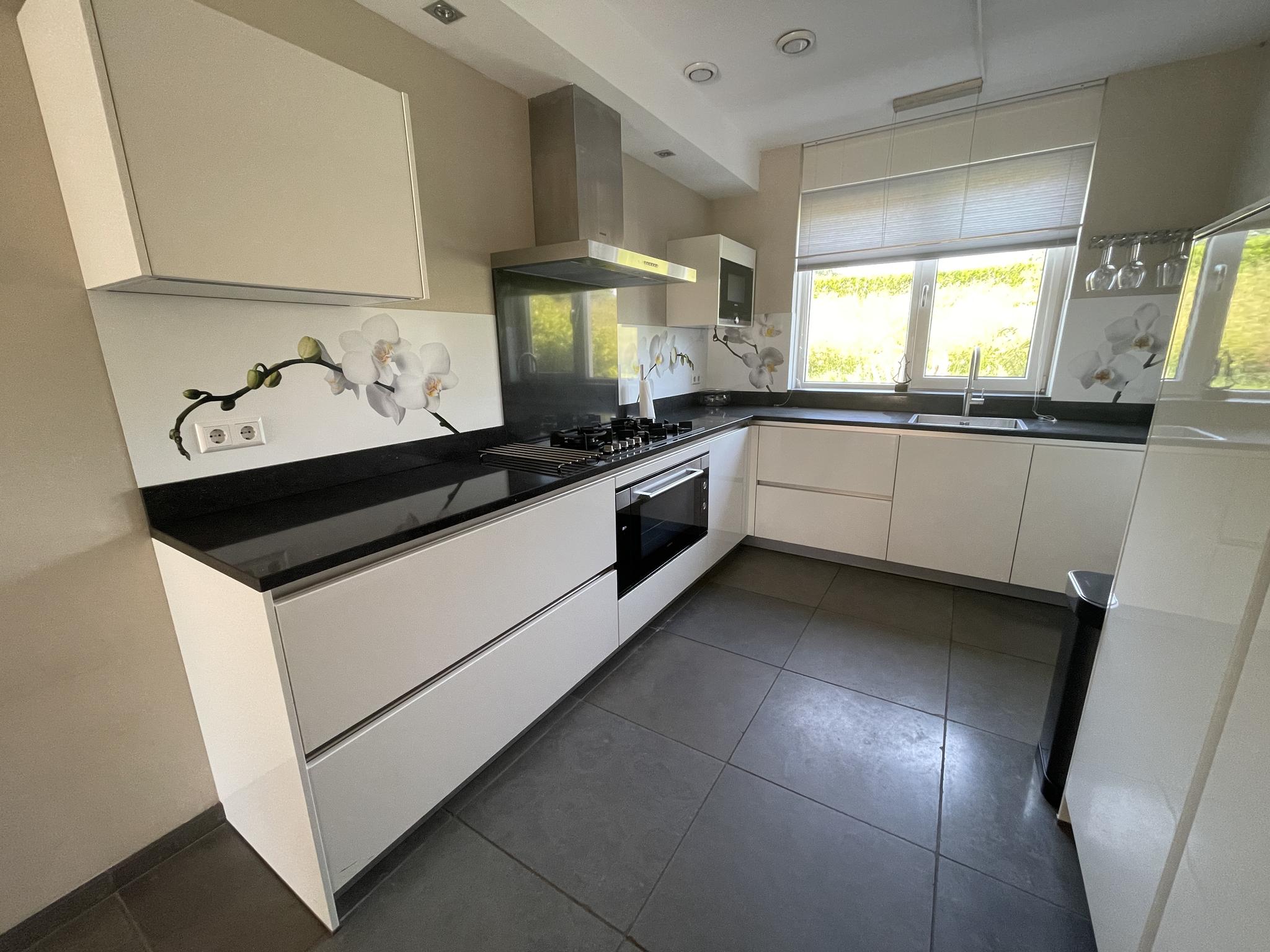 De keuken is aan de voorzijde is gelegen en uitgevoerd in een L-opstelling met een granieten aanrechtblad en diverse inbouwapparatuur zoals; een 5-pits gaskookplaat, een koelkast, een vrieskast, een vaatwasmachine, een Quooker, een oven, een magnetron en een afzuigkap. De keukenlades beschikken over een soft-close systeem.