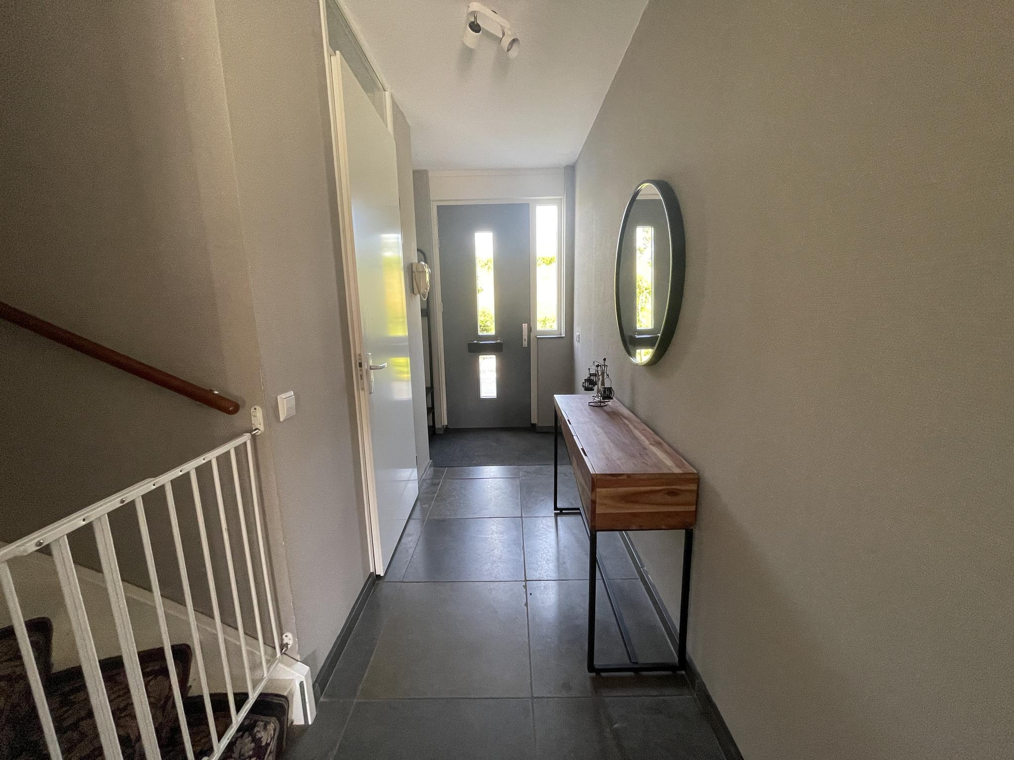 Middels de entree aan de voorzijde van deze instapklare woning bereikt men een ruime hal voorzien van een garderobe, een meterkast, een toiletruimte en een trapopgang. De nette toiletruimte is volledig betegeld en heeft een zwevend toilet en een fonteintje.