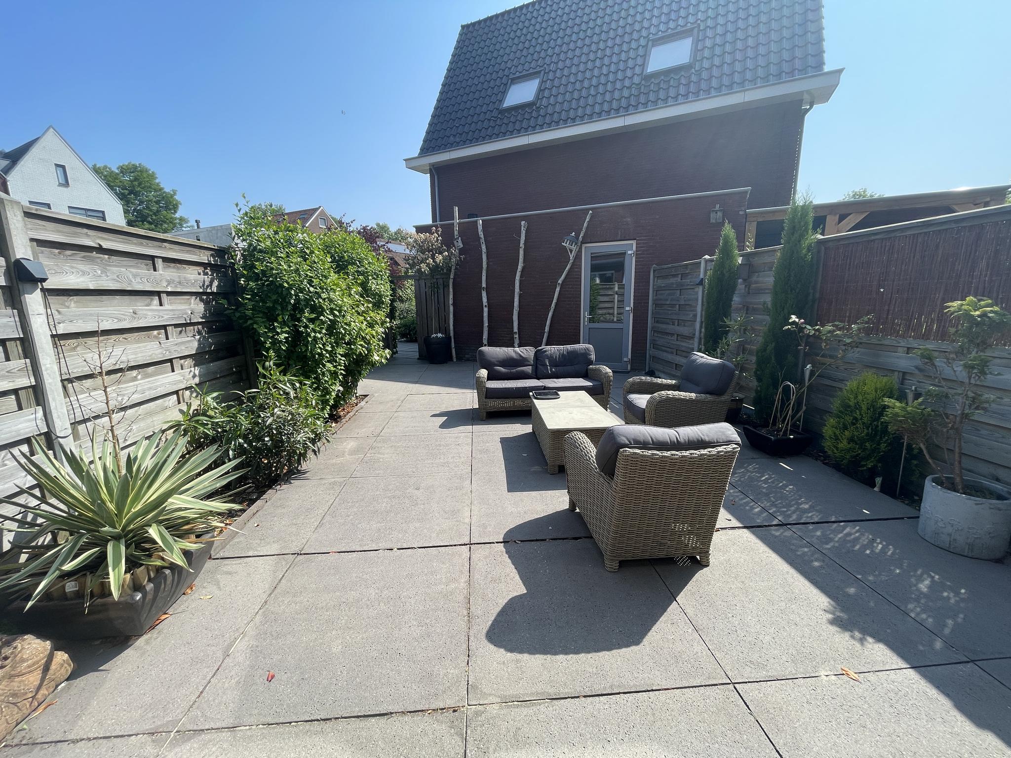 De achtertuin met achterom is fraai aangelegd en ingericht met siertegels, beplanting, houten erfafscheidingen met betonnen palen, een elektrisch zonnescherm, In-lite tuinverlichting en een buitenkraan.