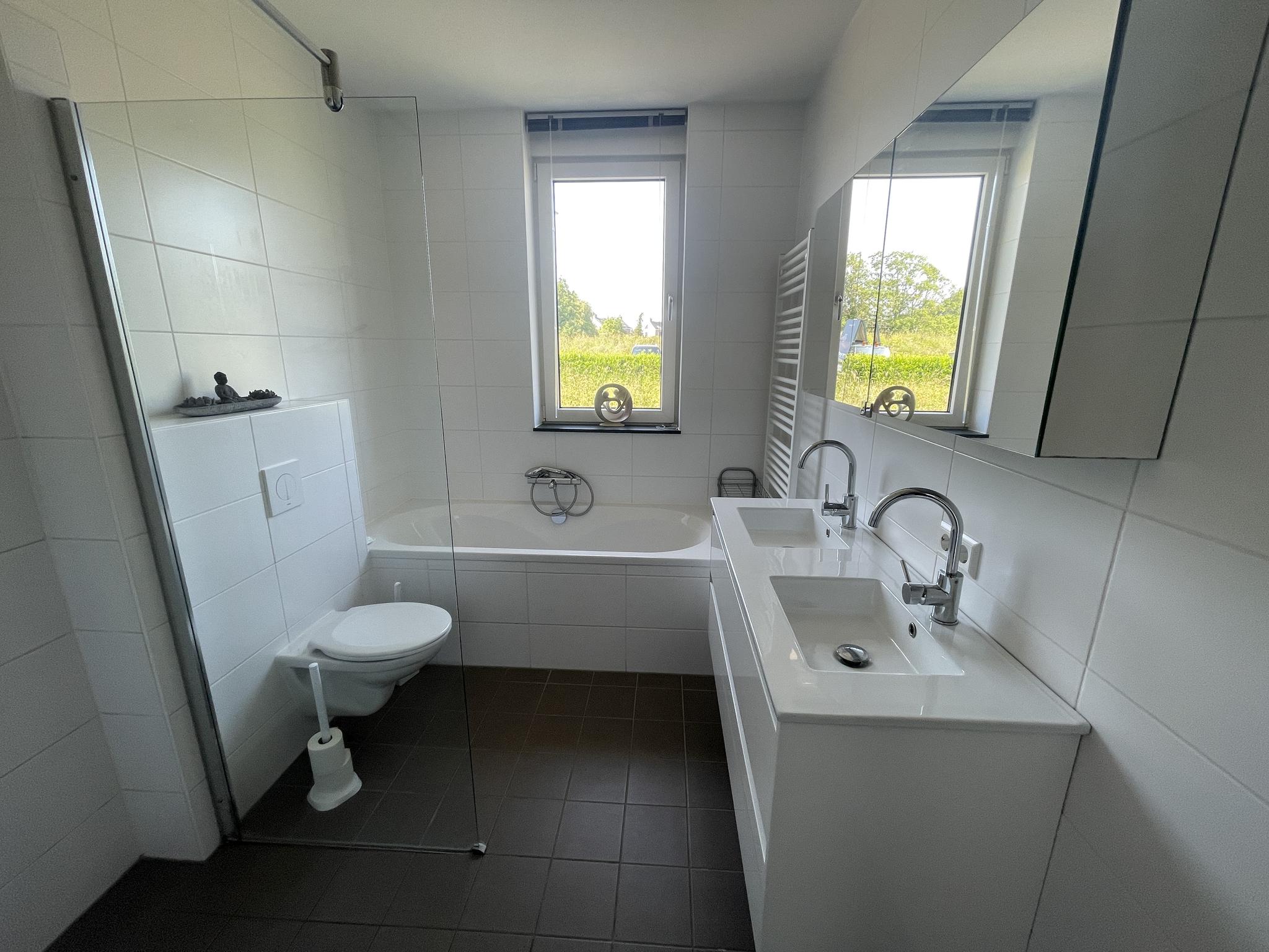 De volledig betegelde badkamer is voorzien van een inloopdouche, een ligbad, een dubbele wastafelmeubel, een designradiator, een zwevend toilet en mechanische ventilatie.