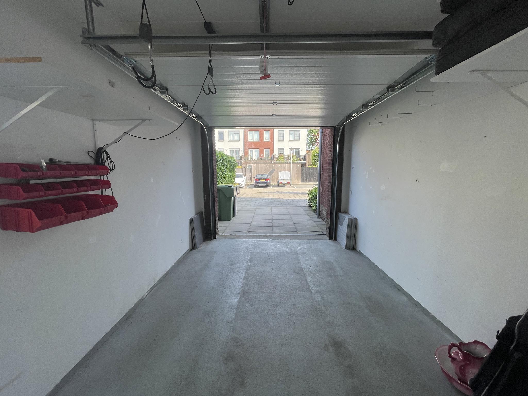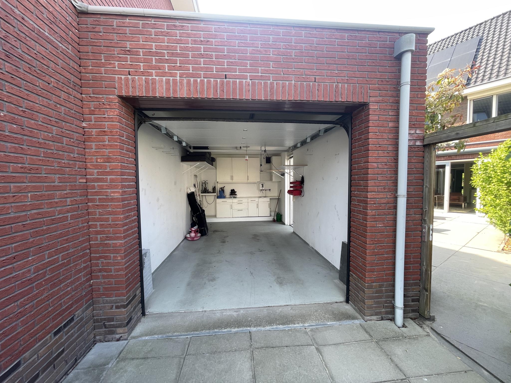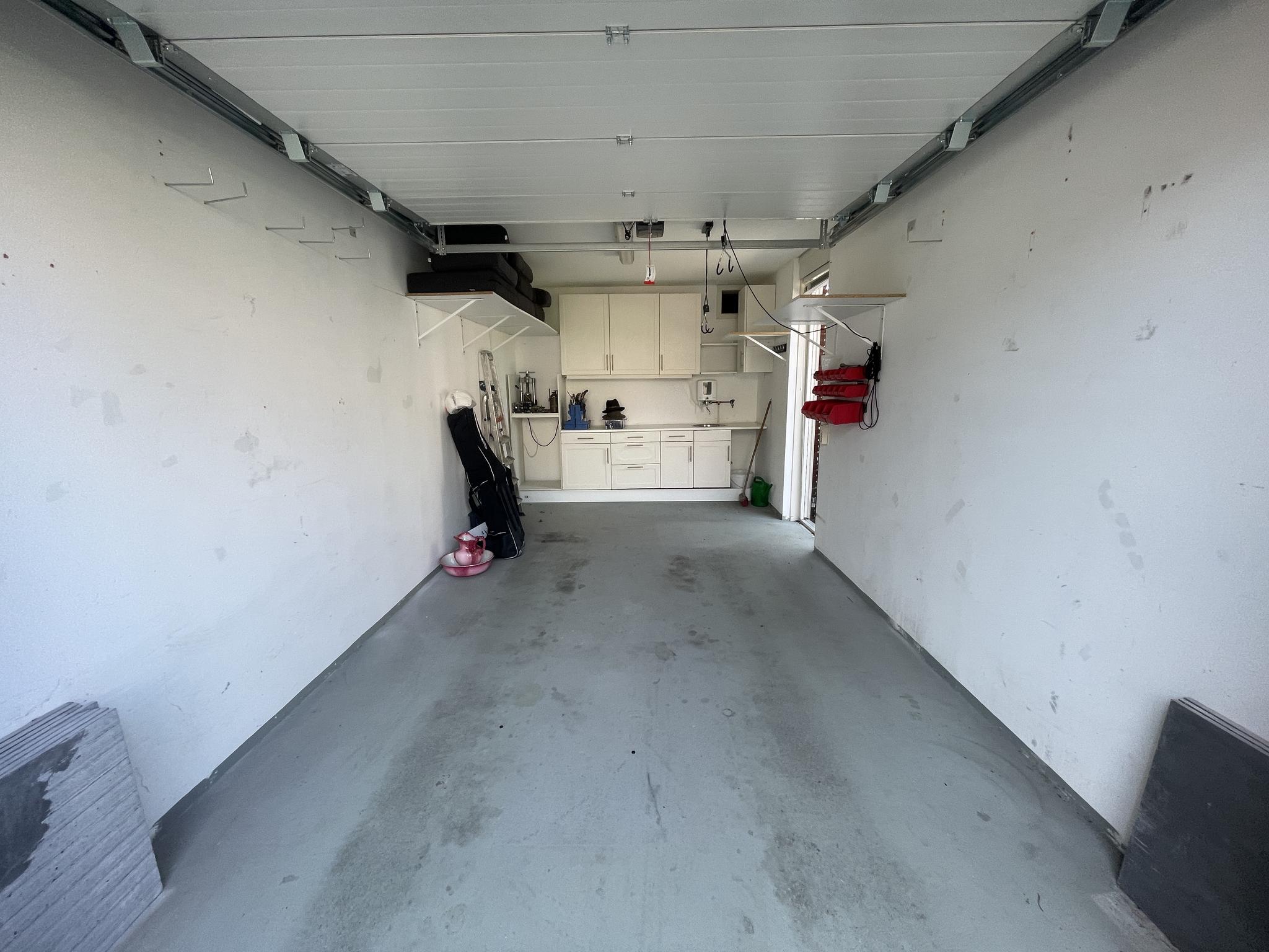 Aan de achterzijde van de tuin staat een stenen garage met elektra, wateraansluiting en een elektrische garagedeur. Voor de garage is er parkeergelegenheid voor 2 auto’s.