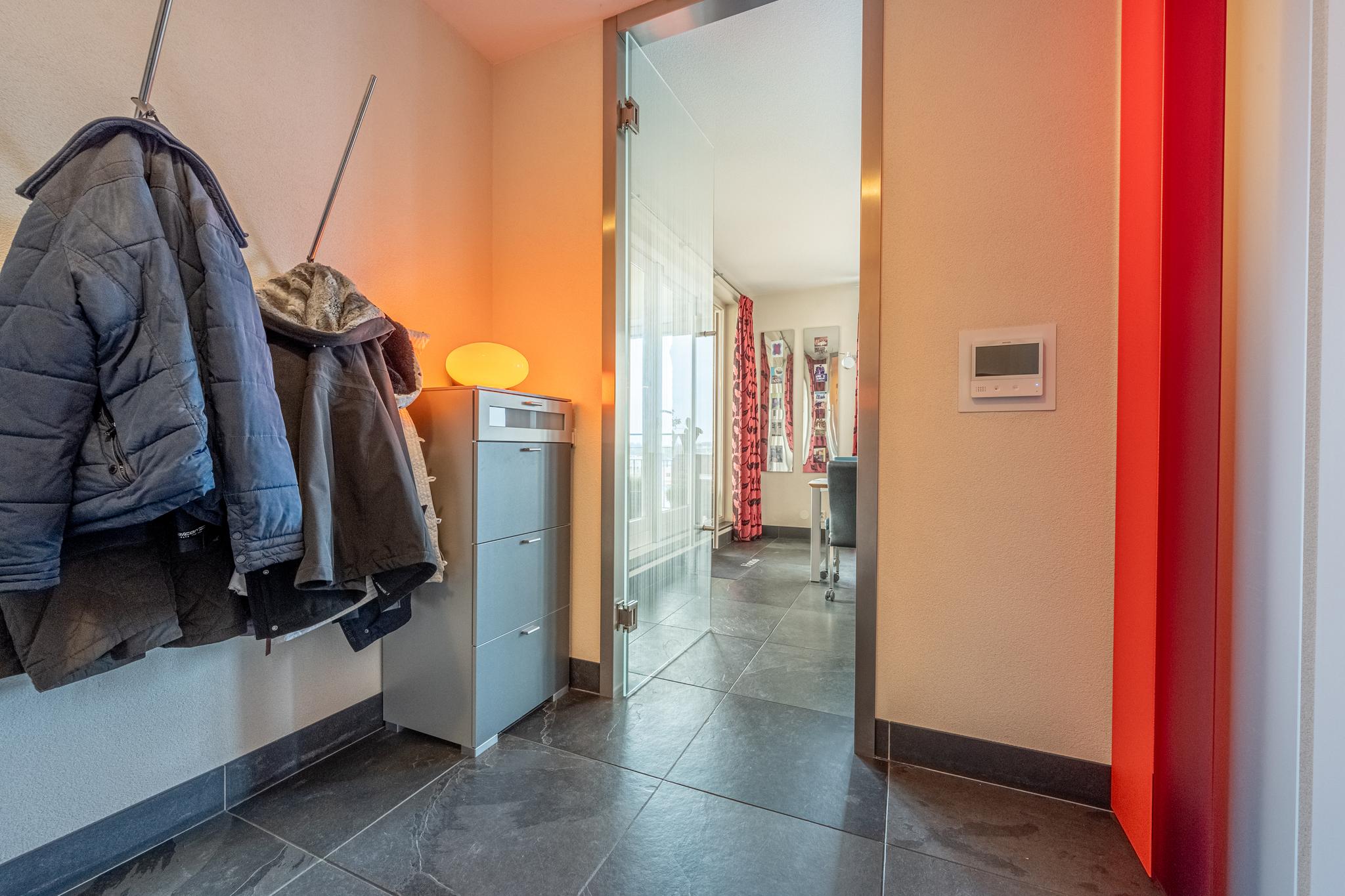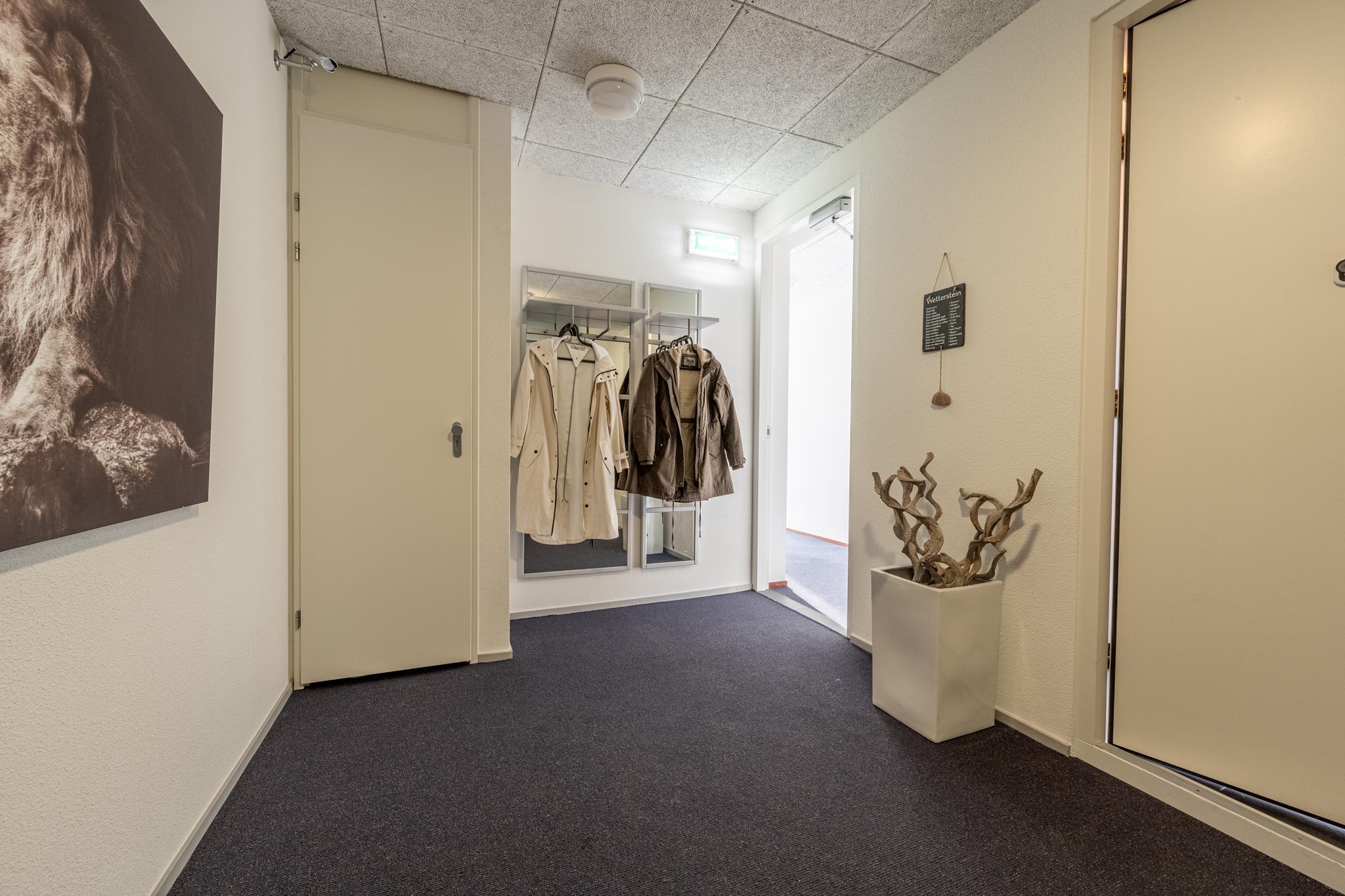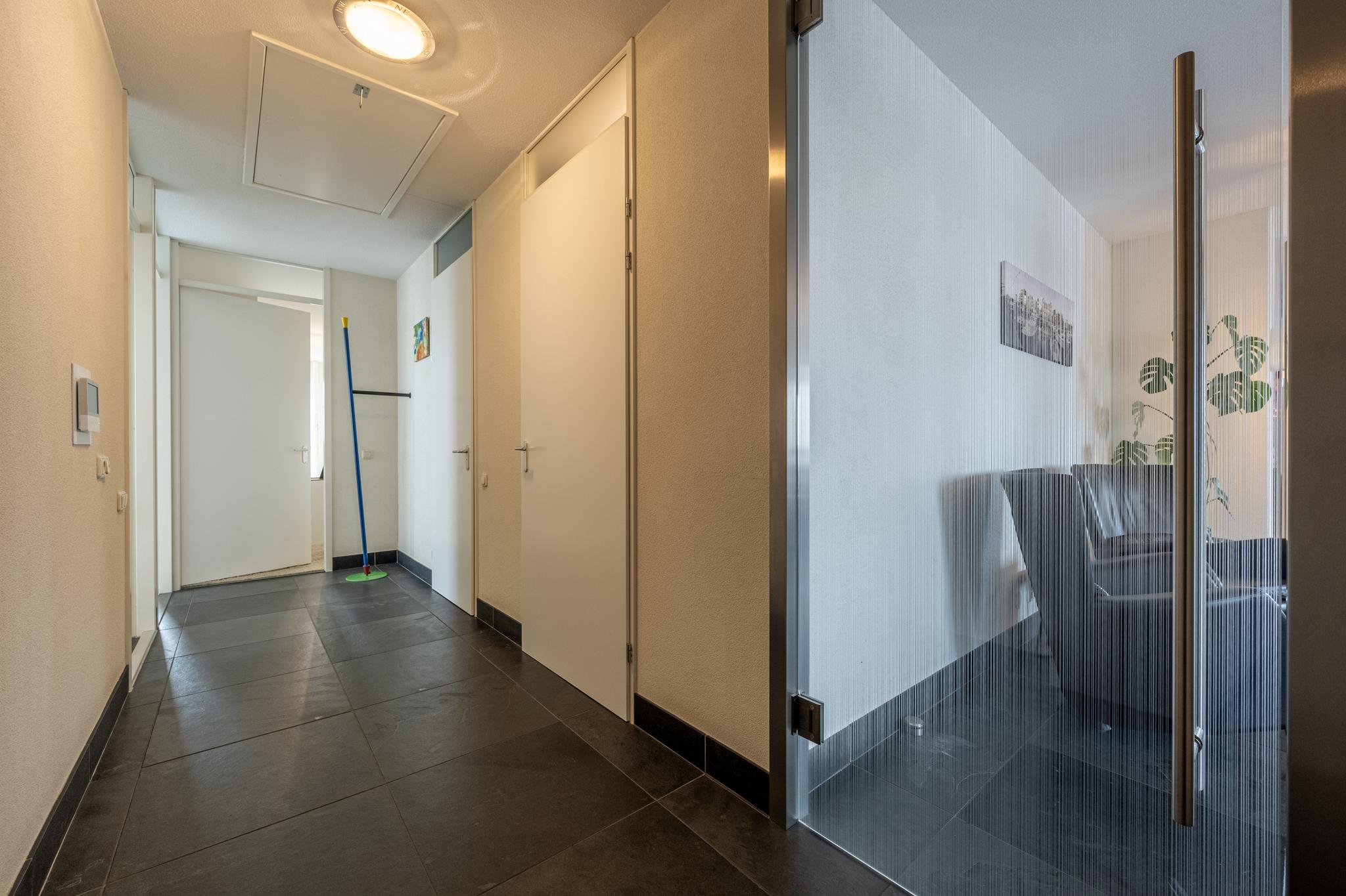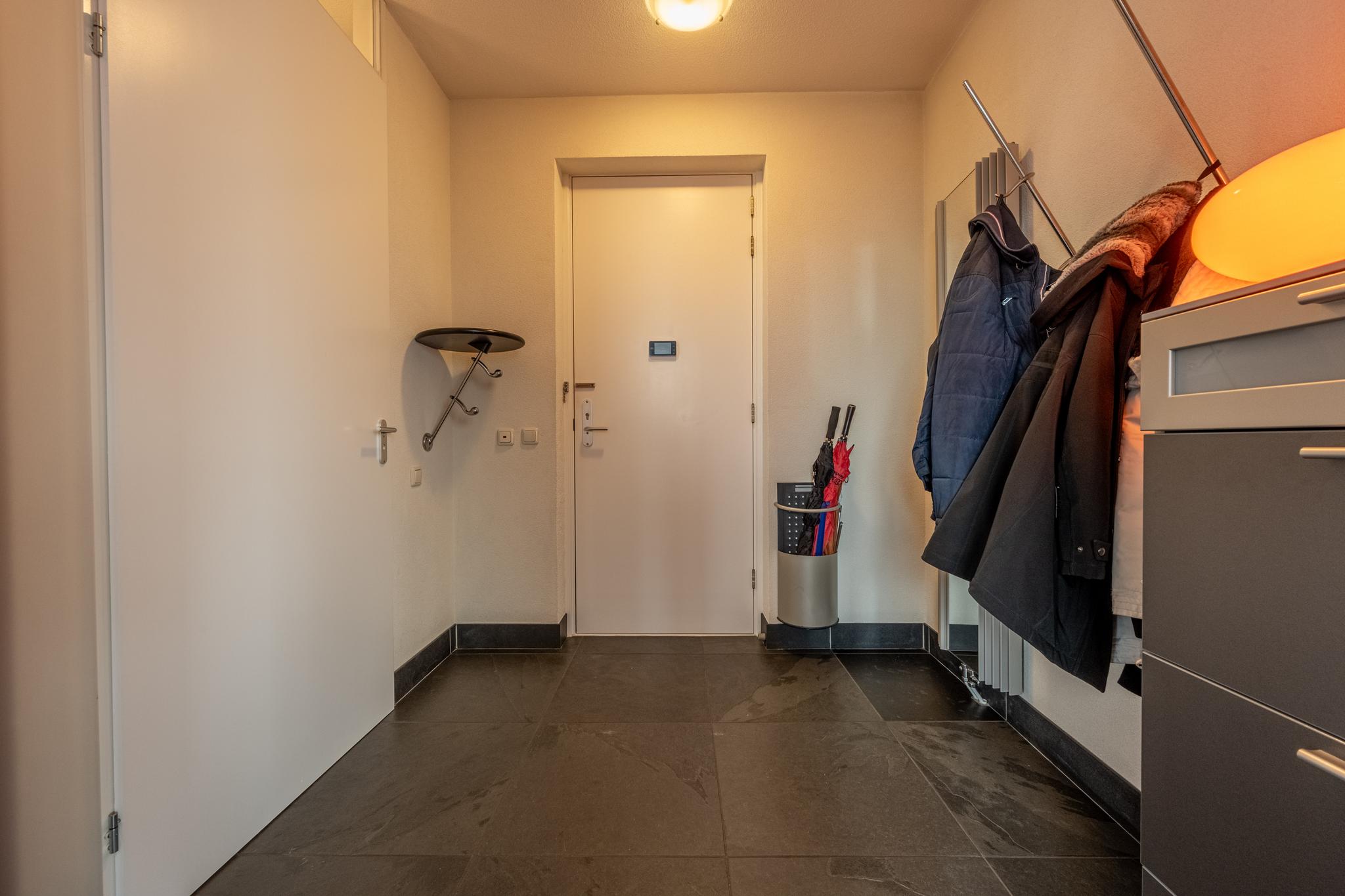 Via de eigen entree op de 5e verdieping van dit complex komt men in de hal terecht welke voorzien is van een garderobe en een toiletruimte met zwevend toilet en fonteintje. Vanuit de hal is het geriefelijke leefgedeelte te bereiken.