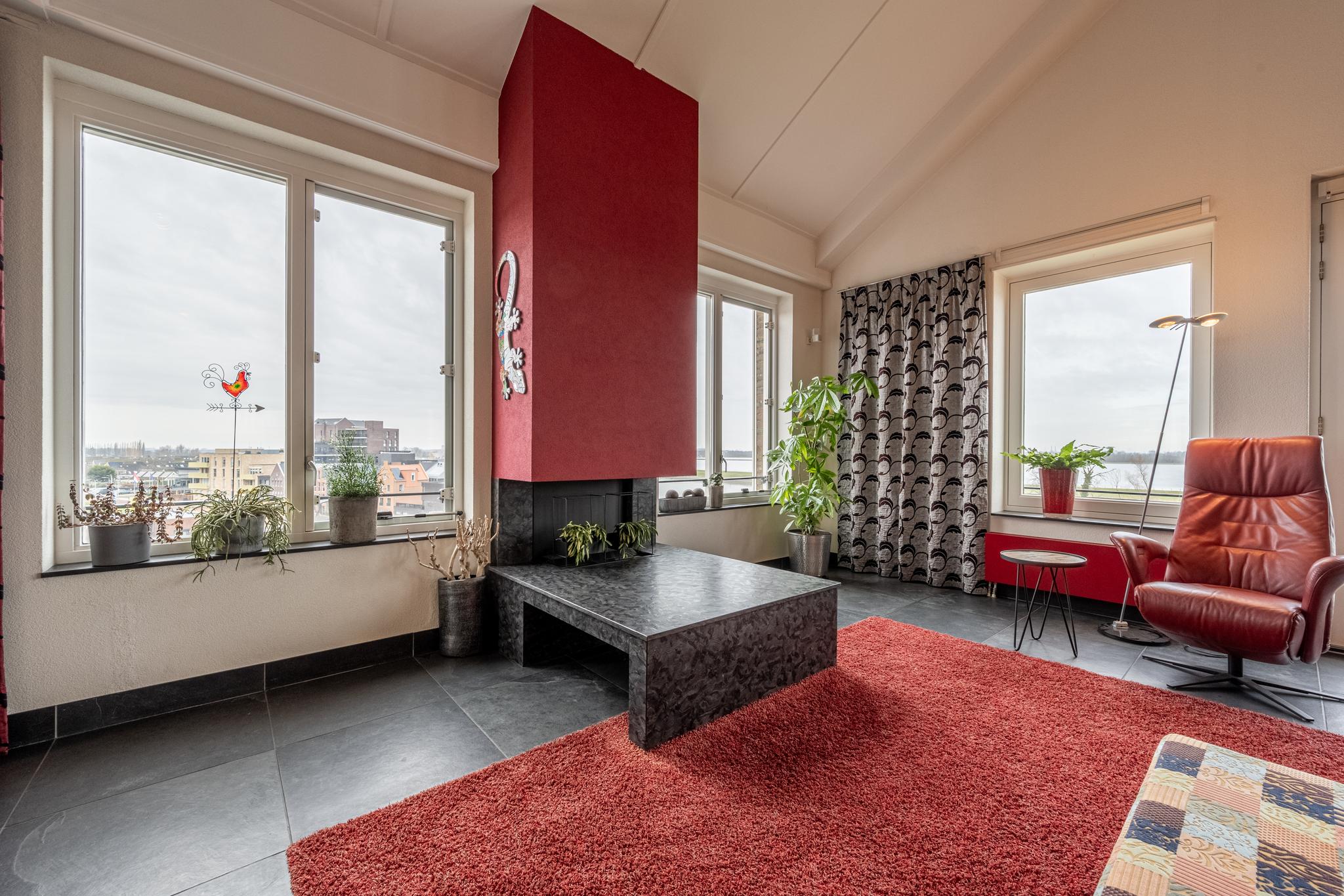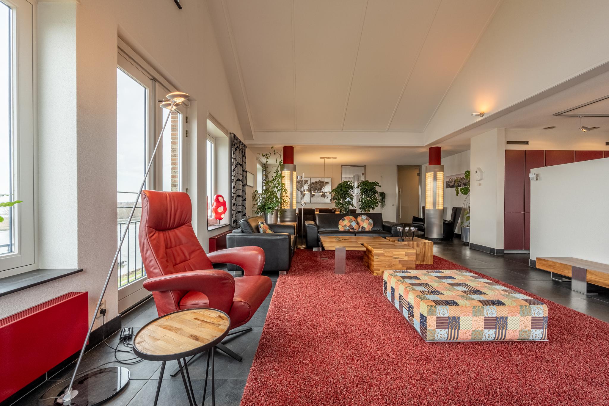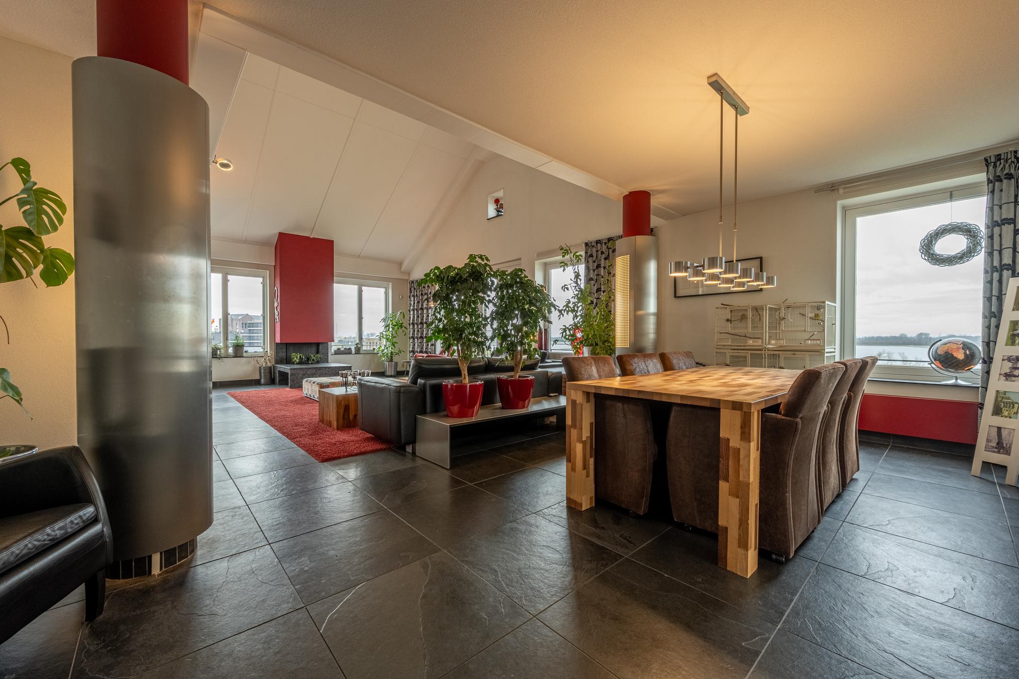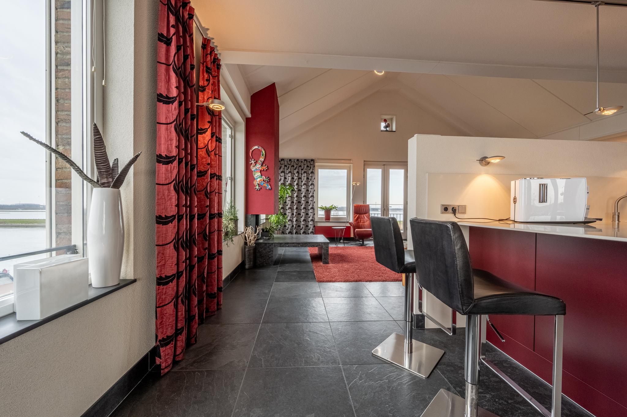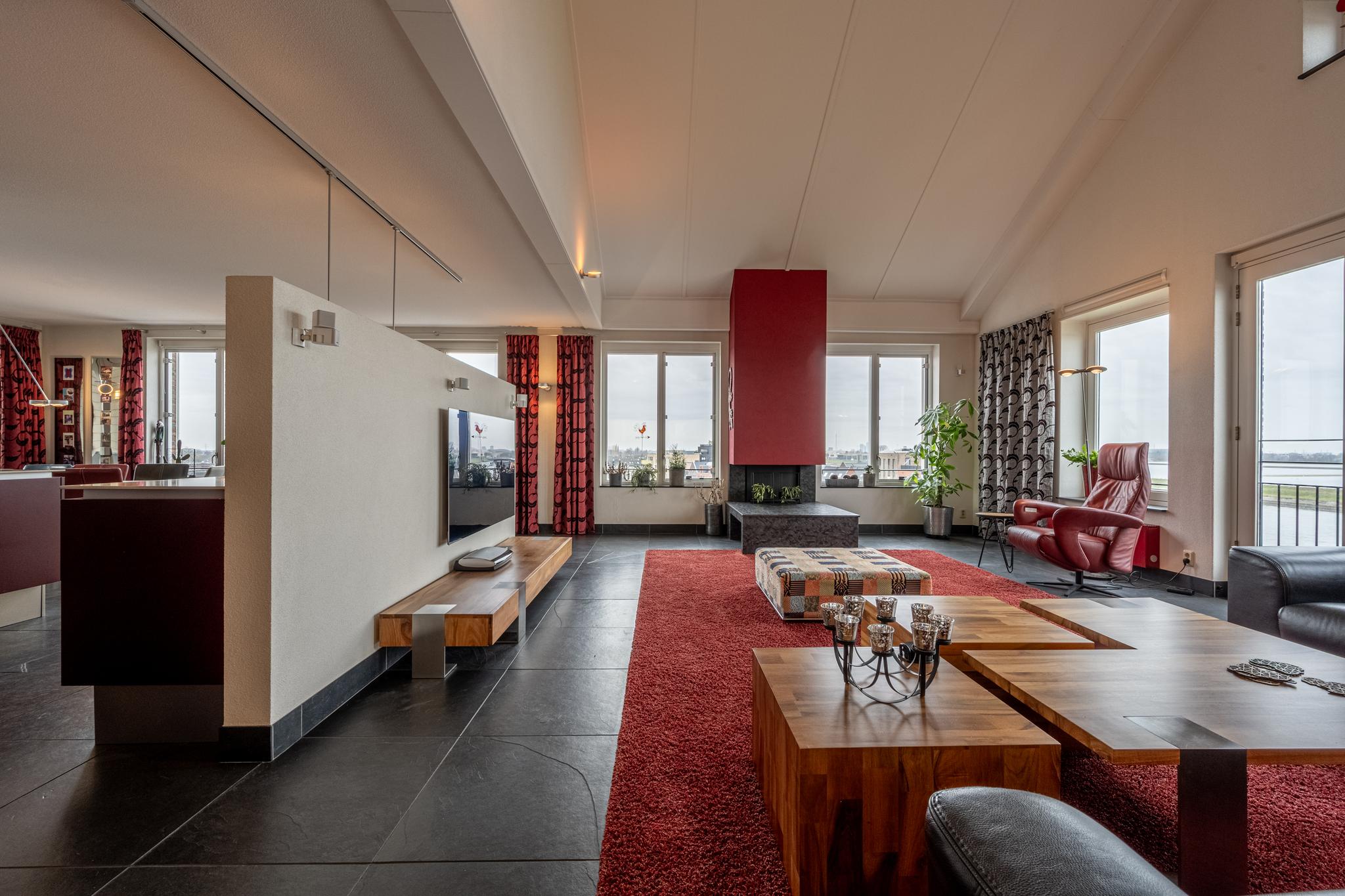 De indrukwekkende living van maar liefst ca. 127 m² (!) springt in het oog dankzij de overvloedige lichtinval door de vele raampartijen, die tevens een prachtig uitzicht bieden over het water van de rivier het Spui. De woonkamer is gerust sfeervol te noemen met een gashaard, een Frans balkon en een hoog plafond, dat bovendien zorgt voor een heerlijk ruimtelijk gevoel. Het geheel is afgewerkt met een onderhoudsvrije vloer van leisteen.