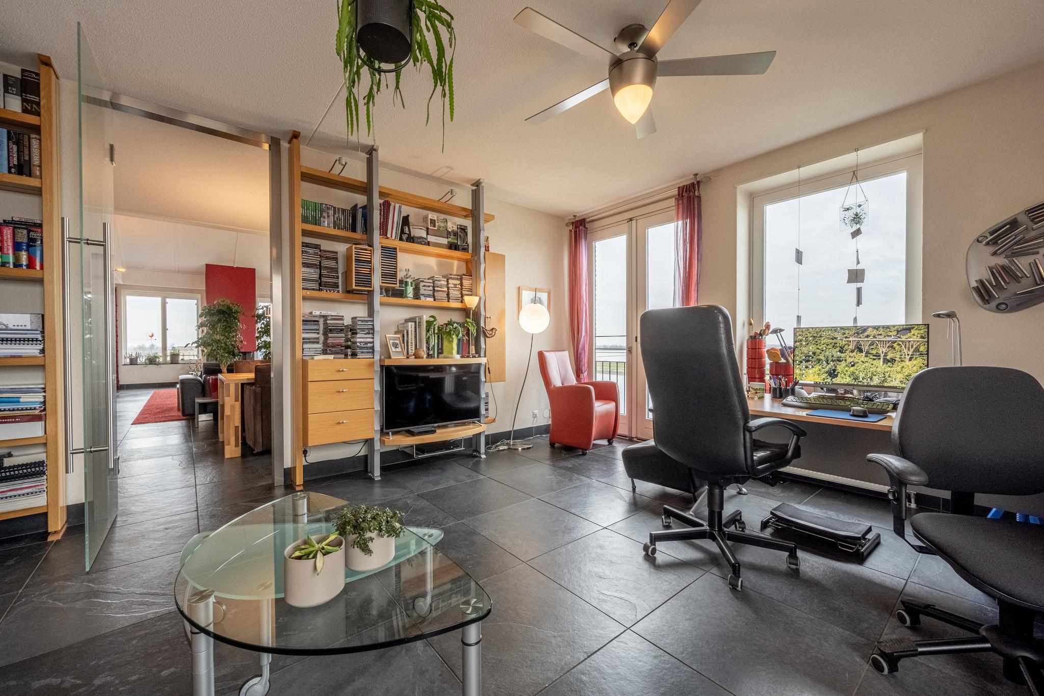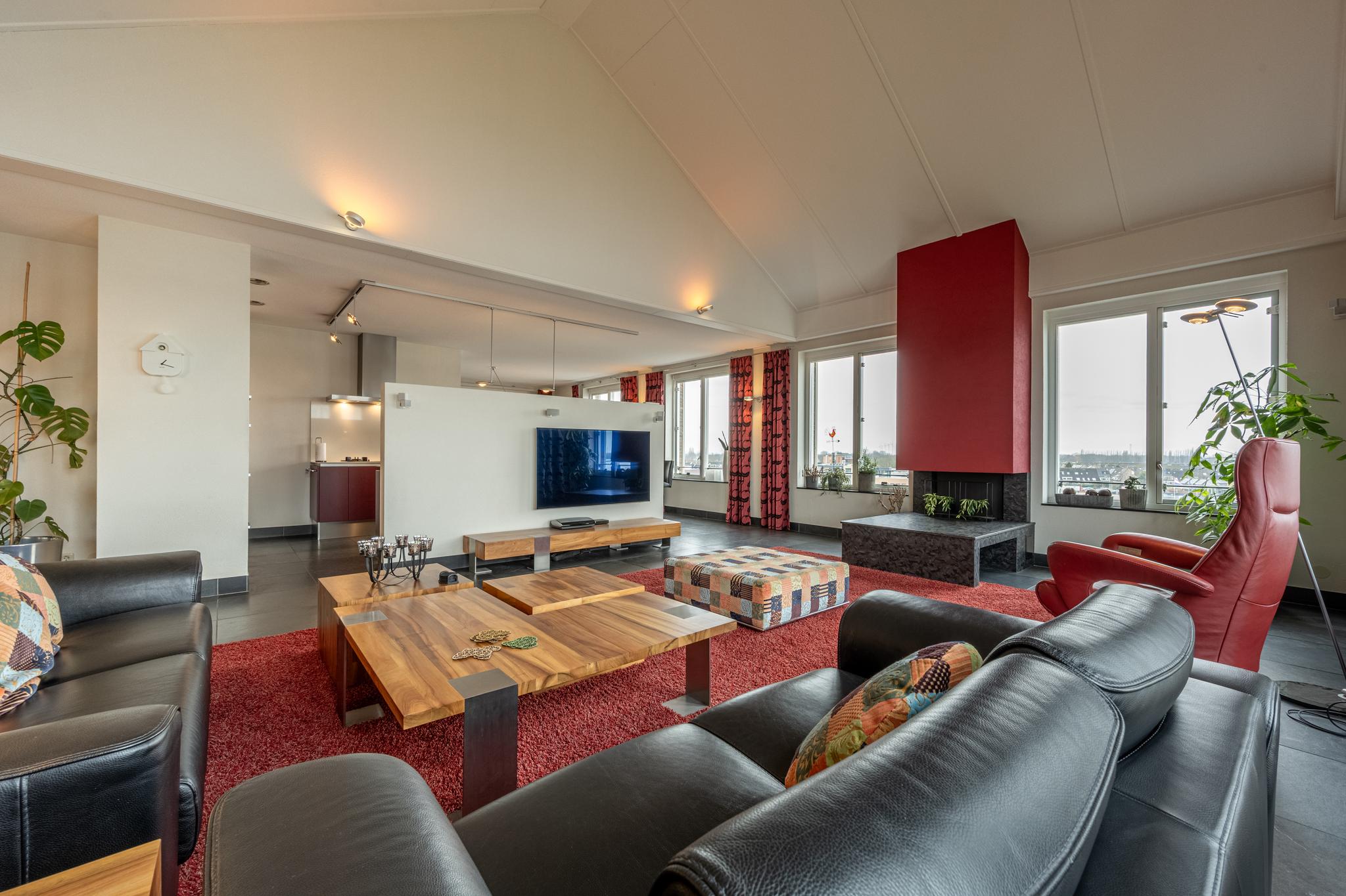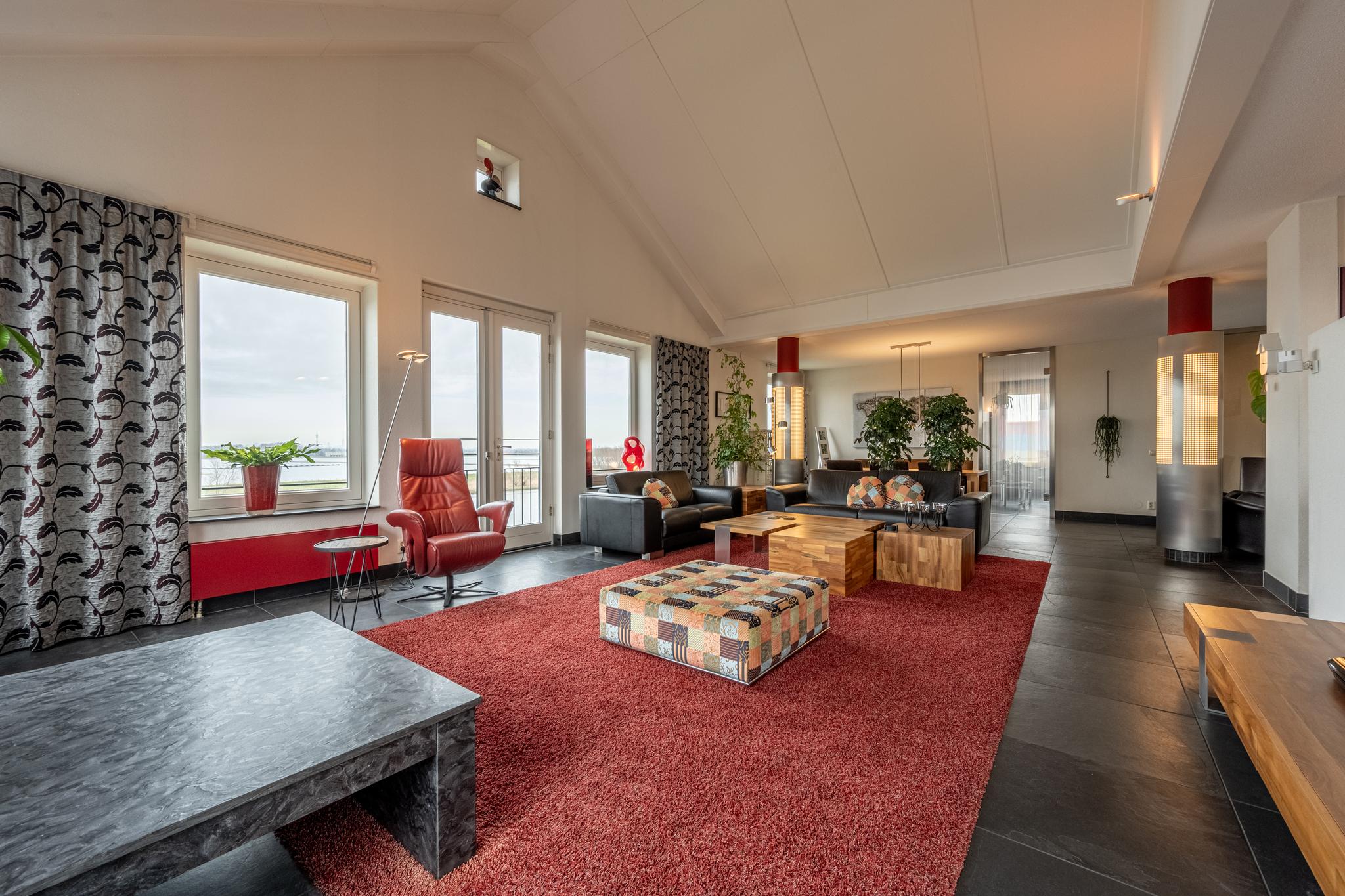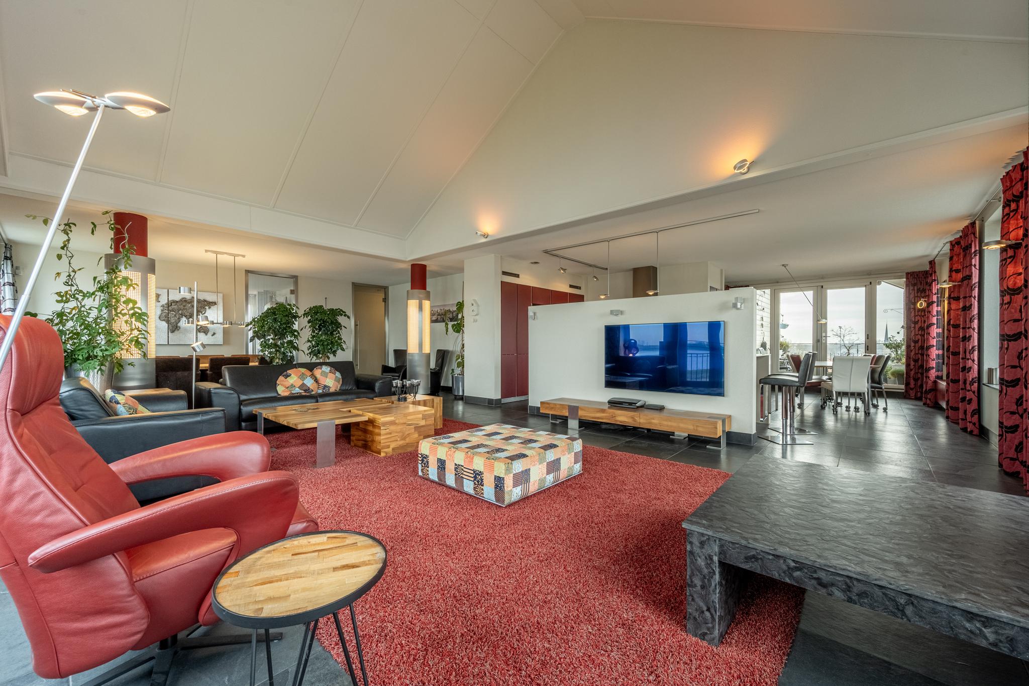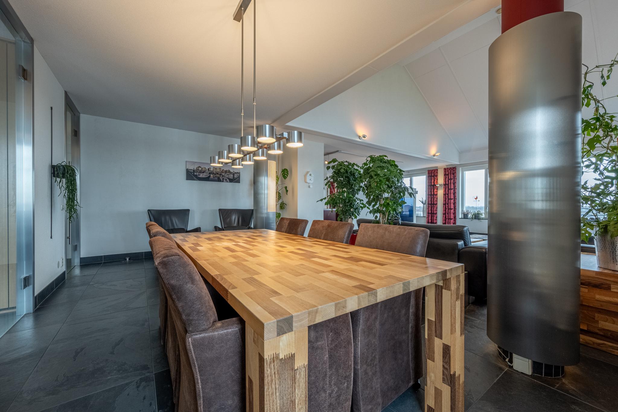 De indrukwekkende living van maar liefst ca. 127 m² (!) springt in het oog dankzij de overvloedige lichtinval door de vele raampartijen, die tevens een prachtig uitzicht bieden over het water van de rivier het Spui. De woonkamer is gerust sfeervol te noemen met een gashaard, een Frans balkon en een hoog plafond, dat bovendien zorgt voor een heerlijk ruimtelijk gevoel. Het geheel is afgewerkt met een onderhoudsvrije vloer van leisteen.