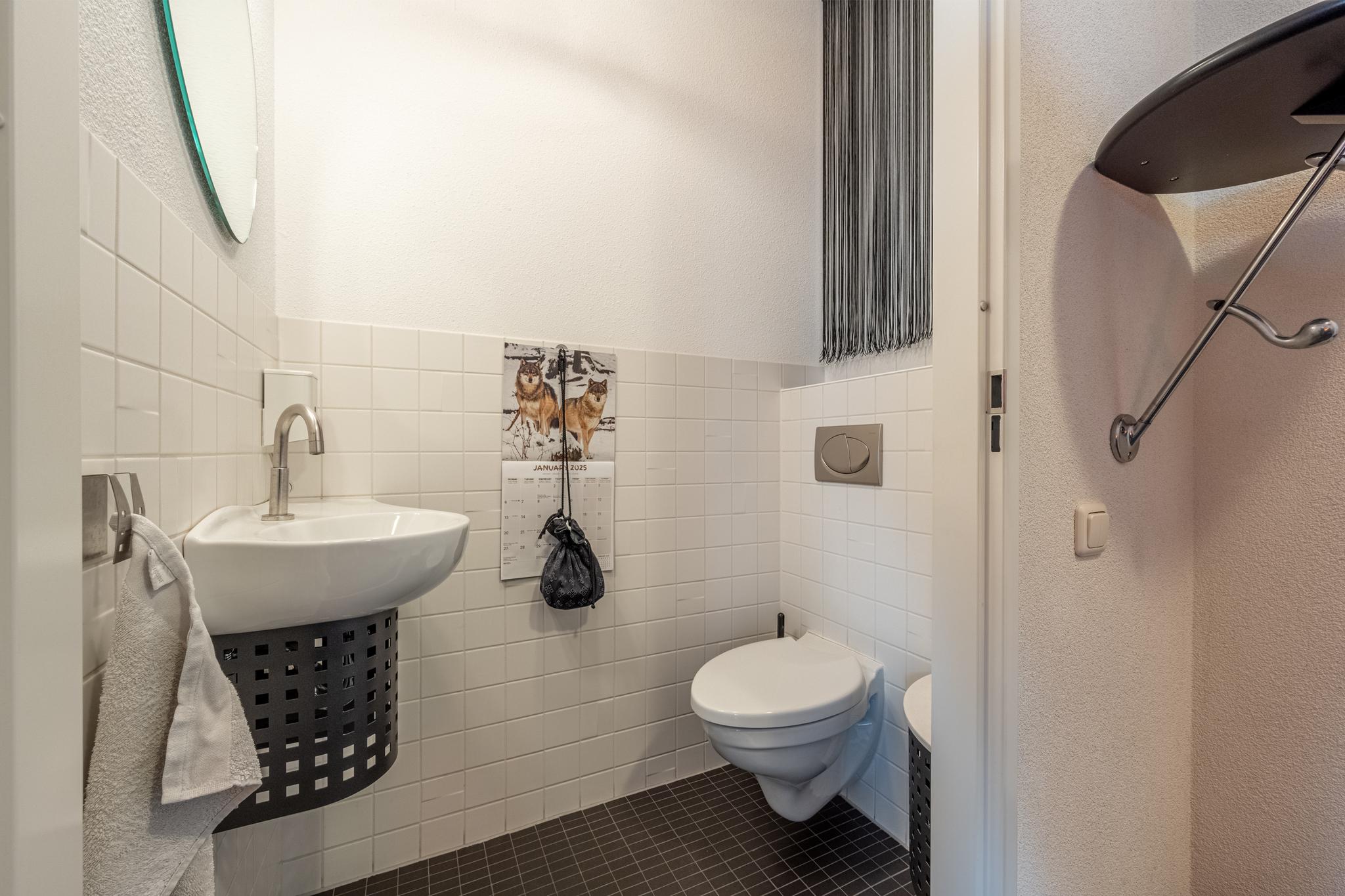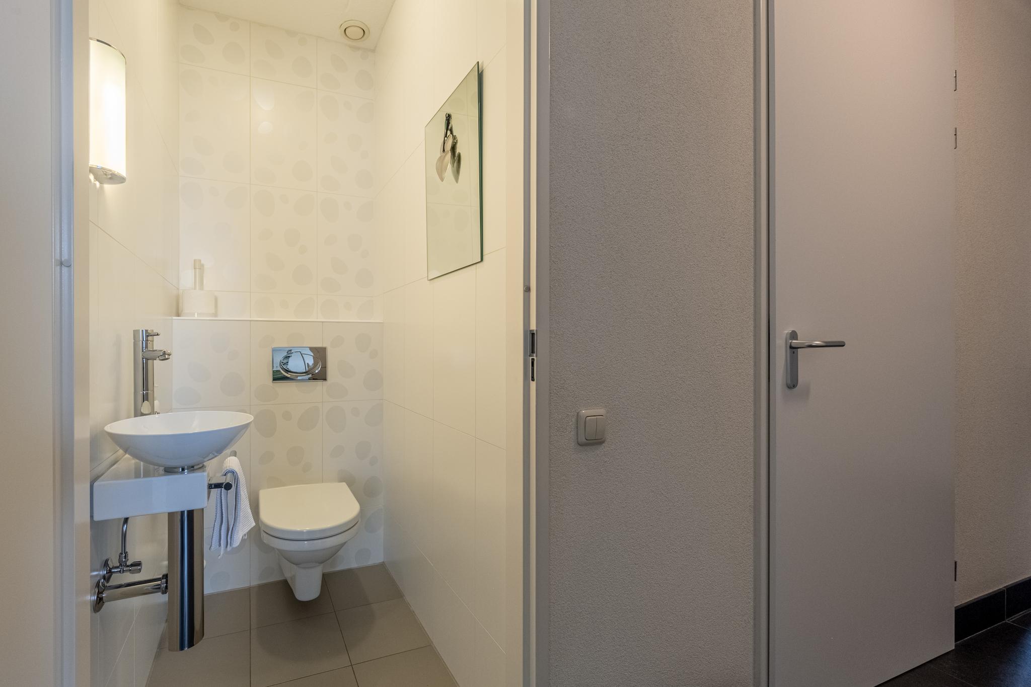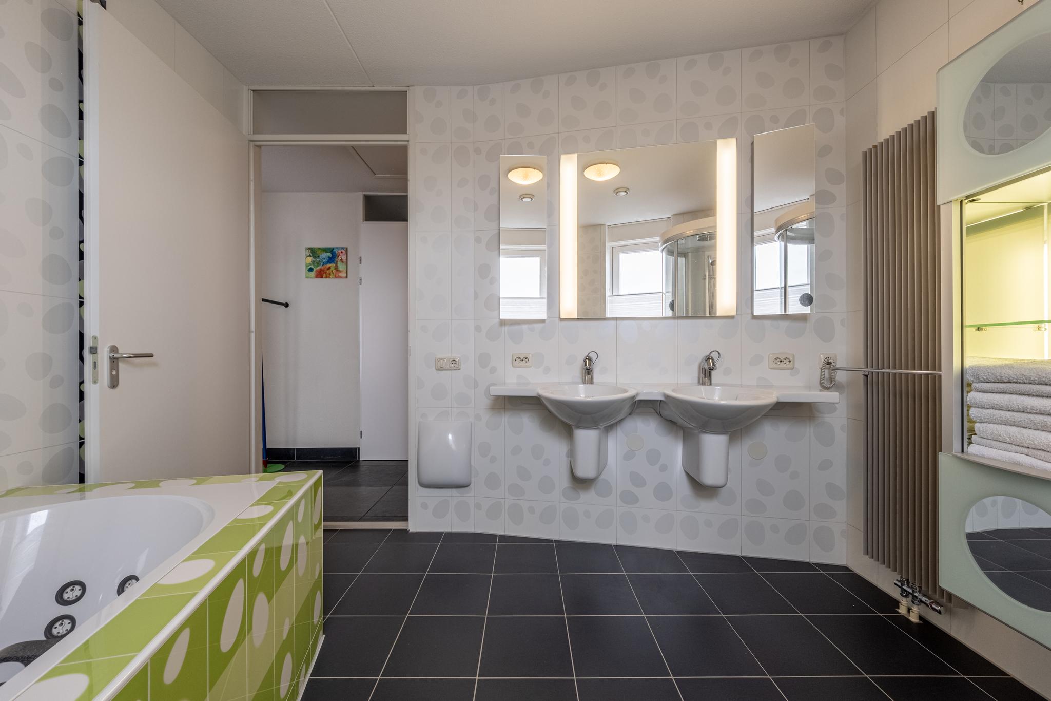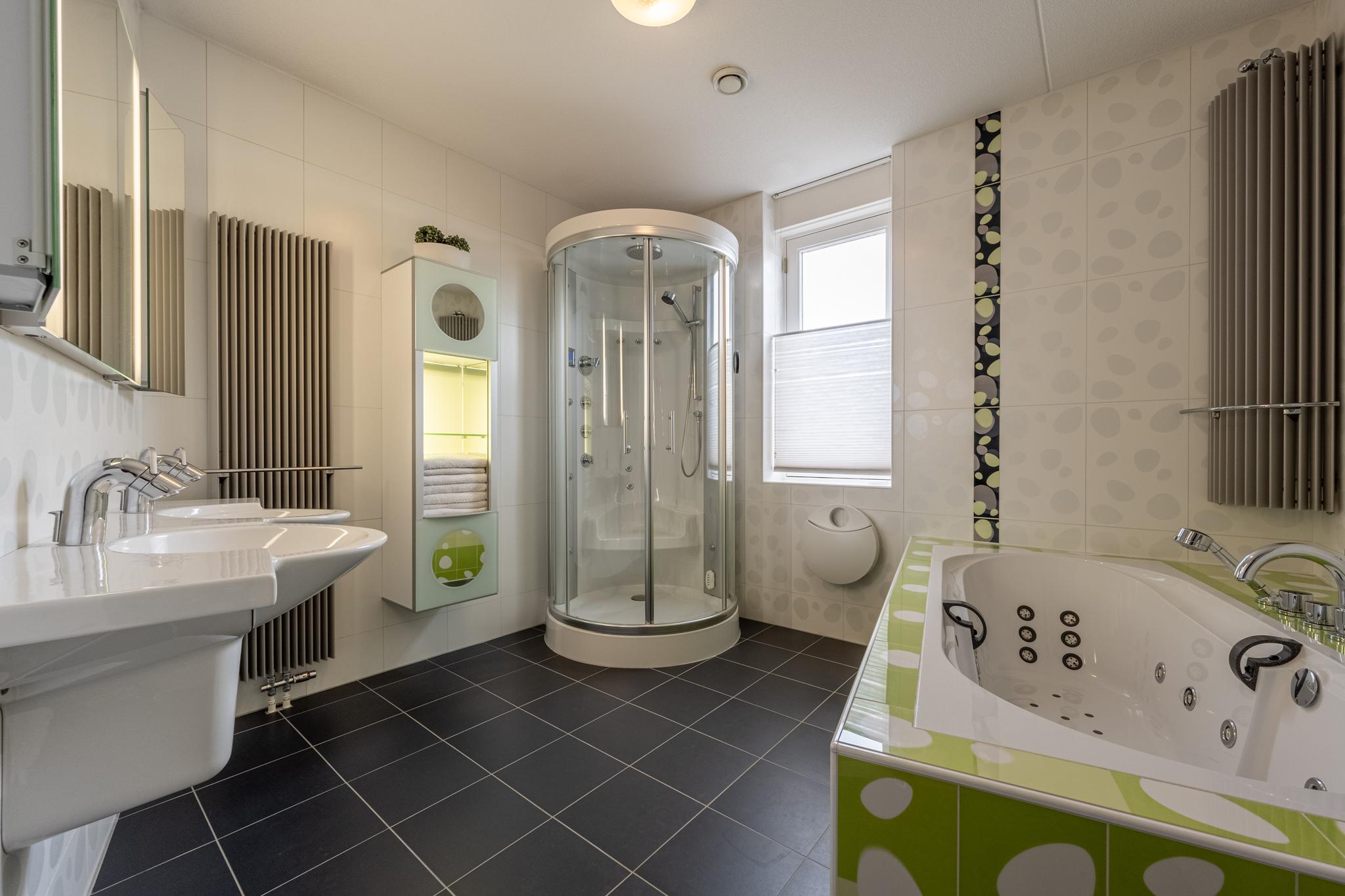 De volledig betegelde badkamer is voorzien van een stoom-/douchecabine, een dubbele wastafel en een groot karakteristiek ligbad. De douche en het ligbad beschikken beide over jetstreams.