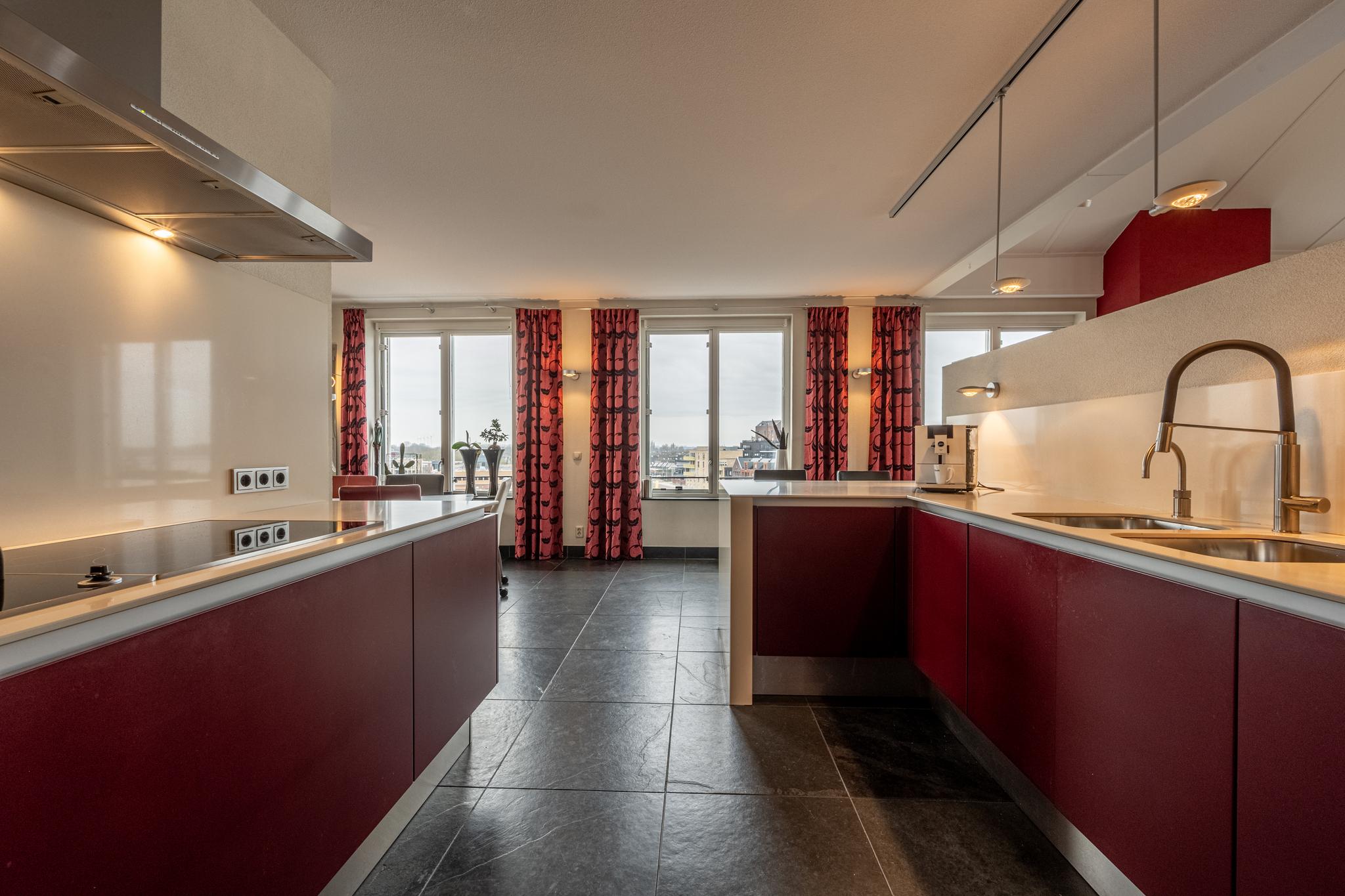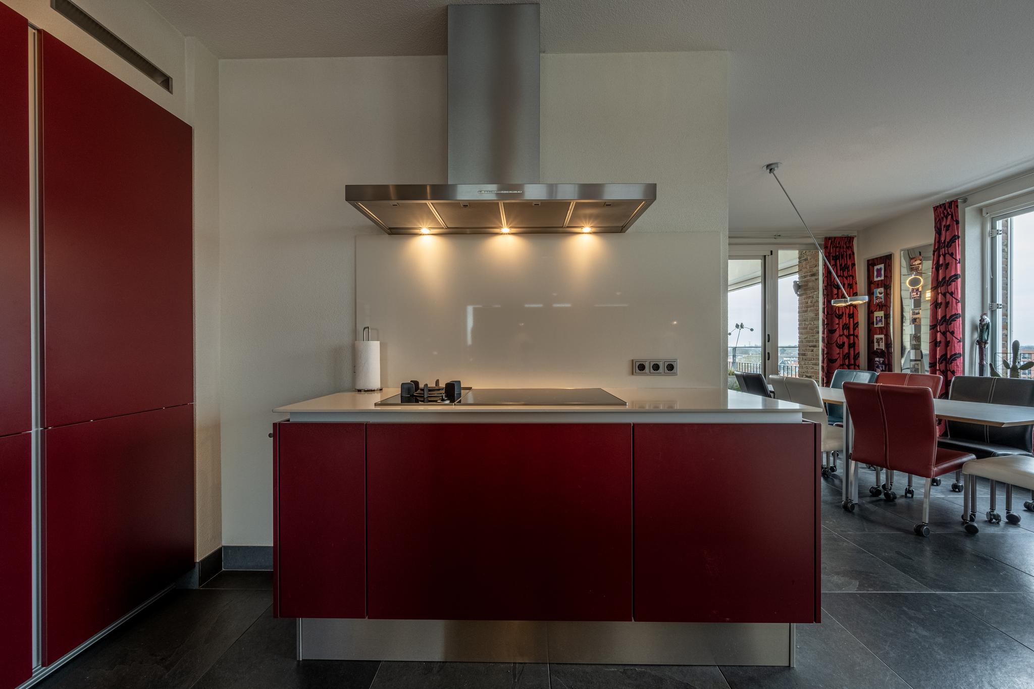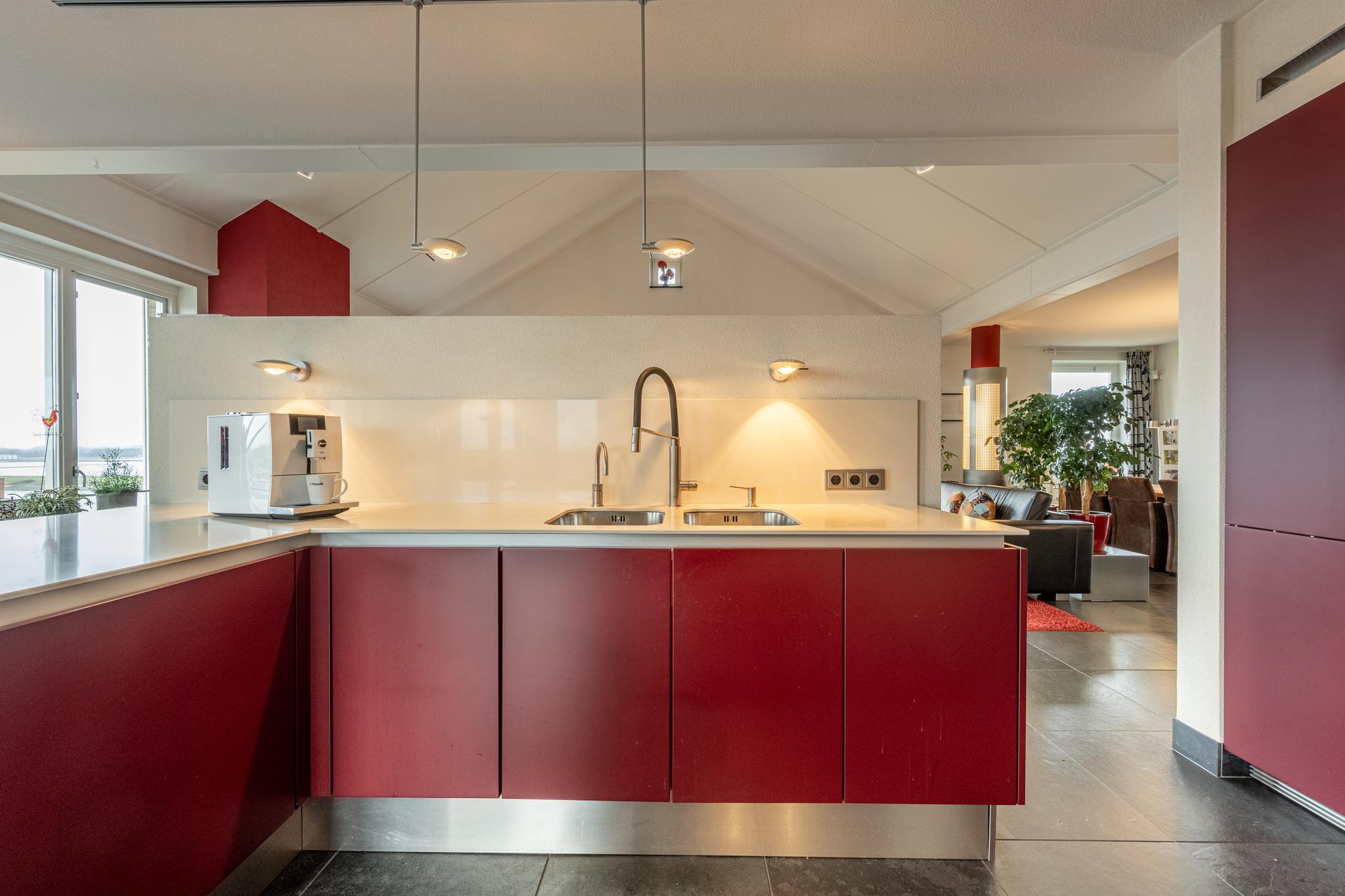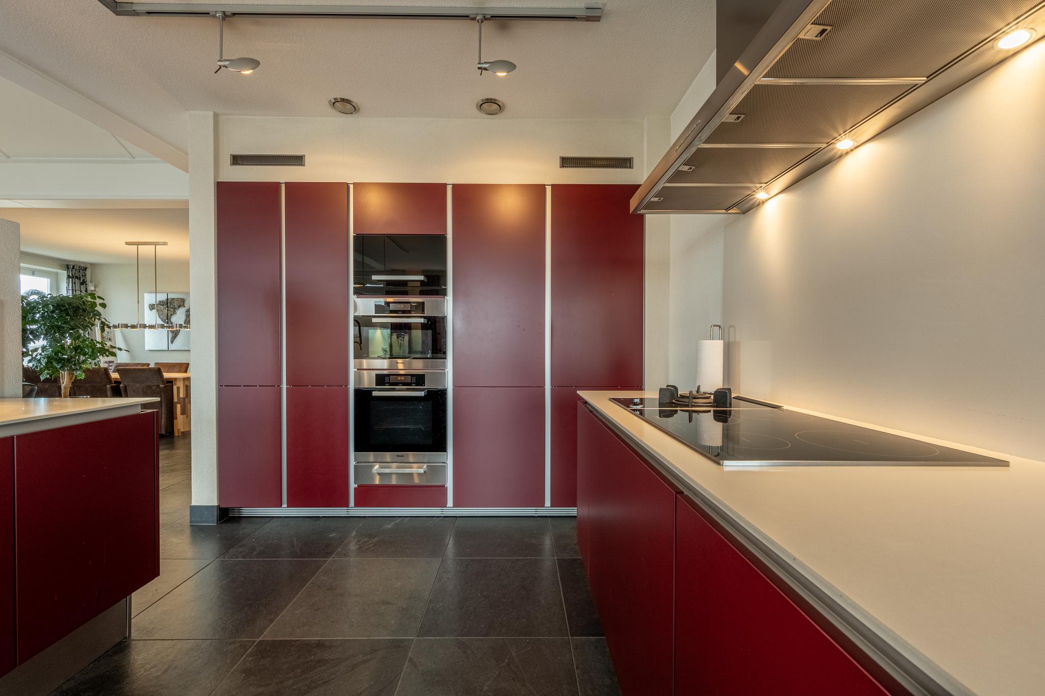 De open keuken is voorzien van moderne inbouwapparatuur, waaronder een inductiekookplaat met wokbrander en afzuigkap, een vaatwasser, twee ingebouwde koel-/vriescombinaties en een dubbele spoelbak met een Quooker.