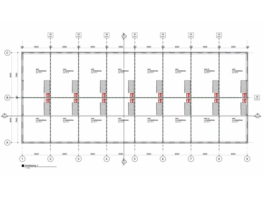 Bedrijfsunit 18 (bouwnummer 4) is circa 76 m². De bedrijfsunit bestaat uit 2 bouwlagen met een begane grond van 39 m² en een verdieping van 37 m². Op de begane grond is een spoelbak gesitueerd en de verdieping beschikt over een pantry en een toilet.