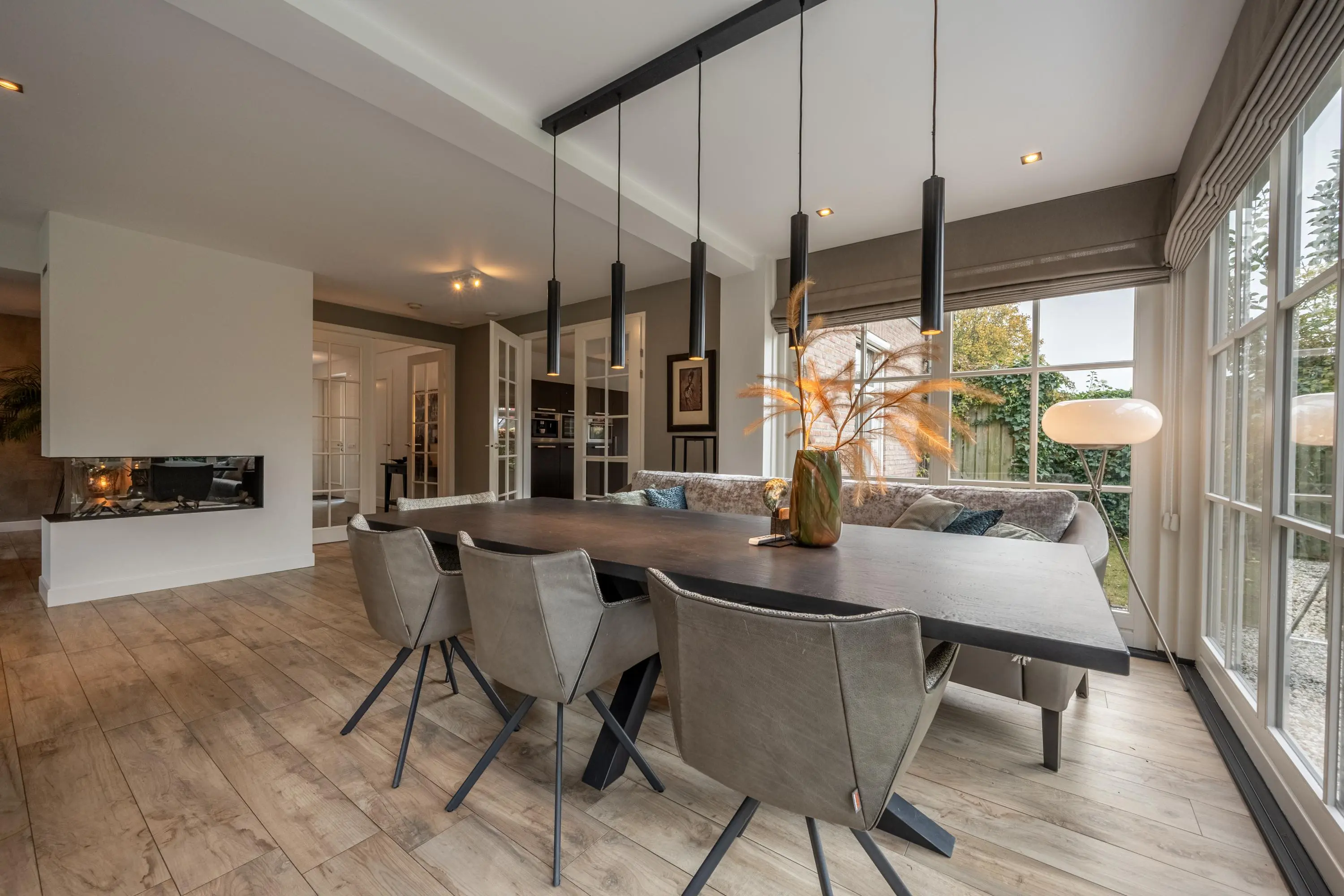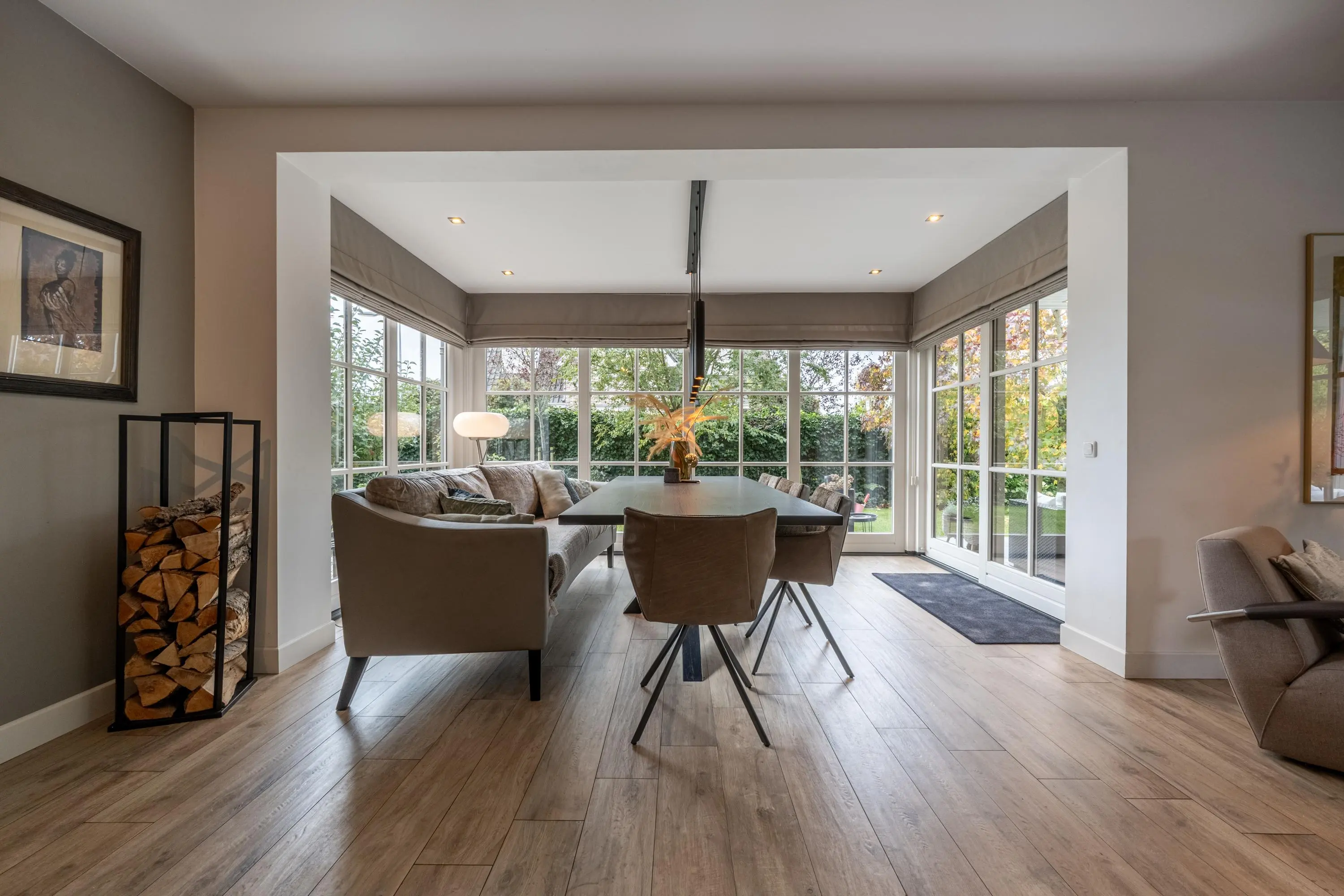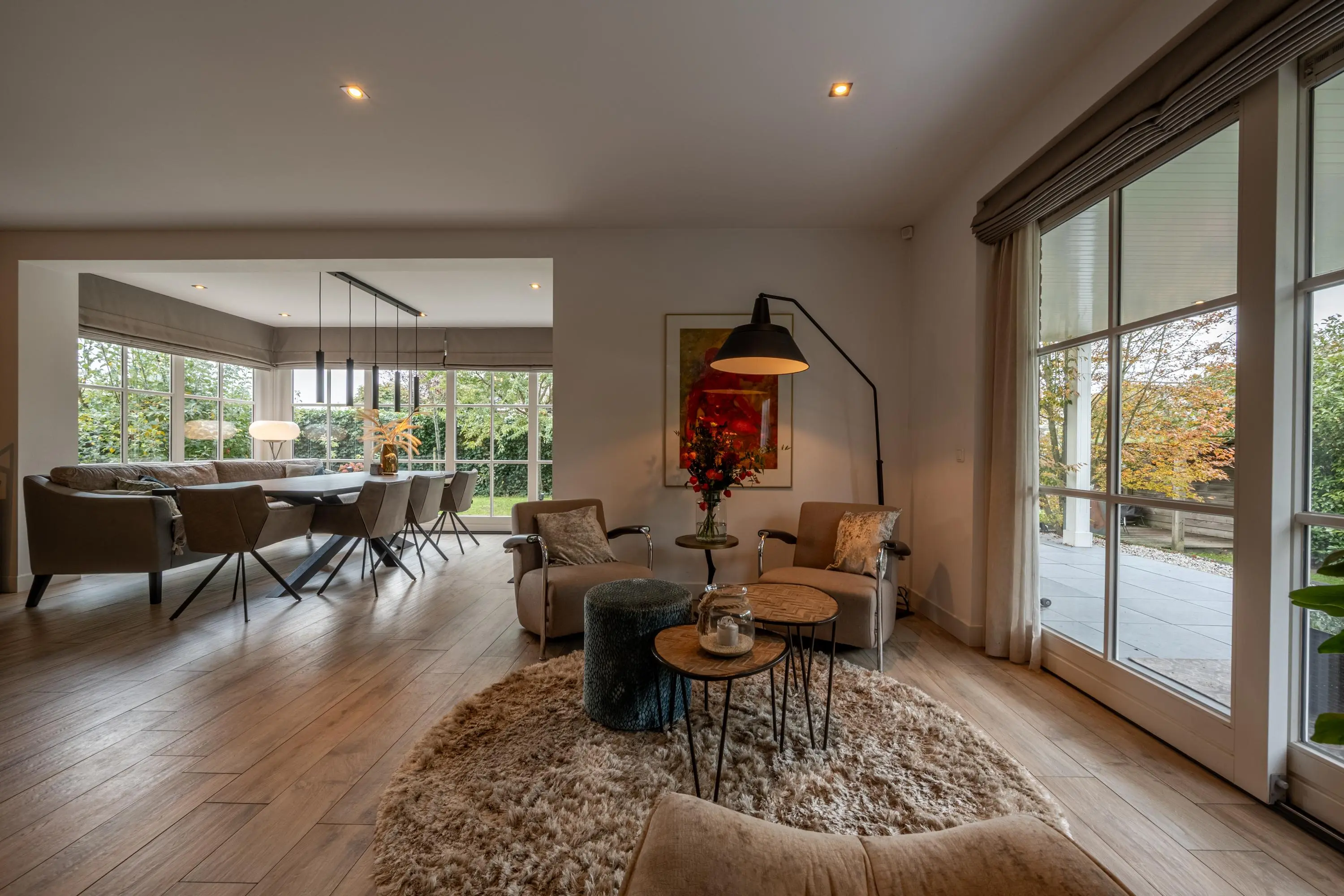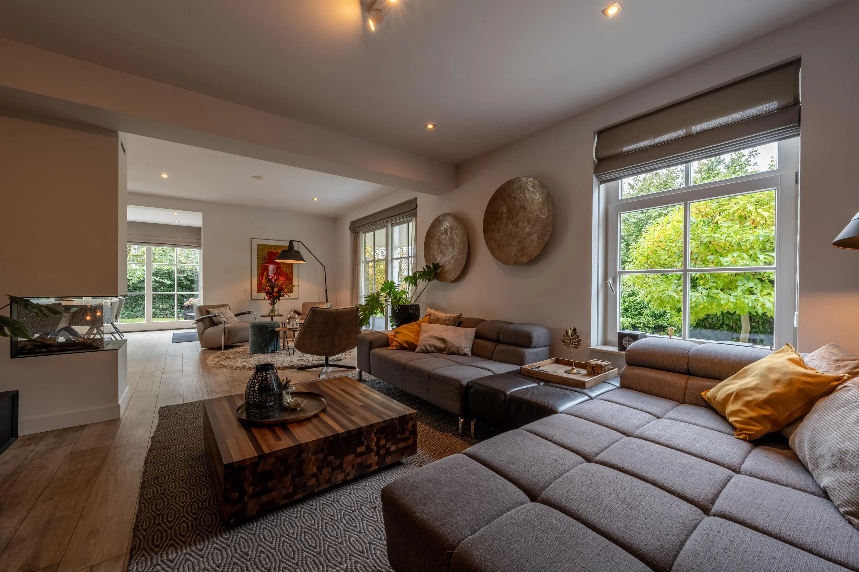 De royale living is een oase van licht en comfort. Het zitgedeelte aan de achterzijde is voorzien van een sfeervolle haard en biedt via grote raampartijen een prachtig uitzicht op de tuin. Het eetgedeelte is ruim genoeg voor een grote eettafel en vormt samen met de woonkamer één sfeervol geheel.