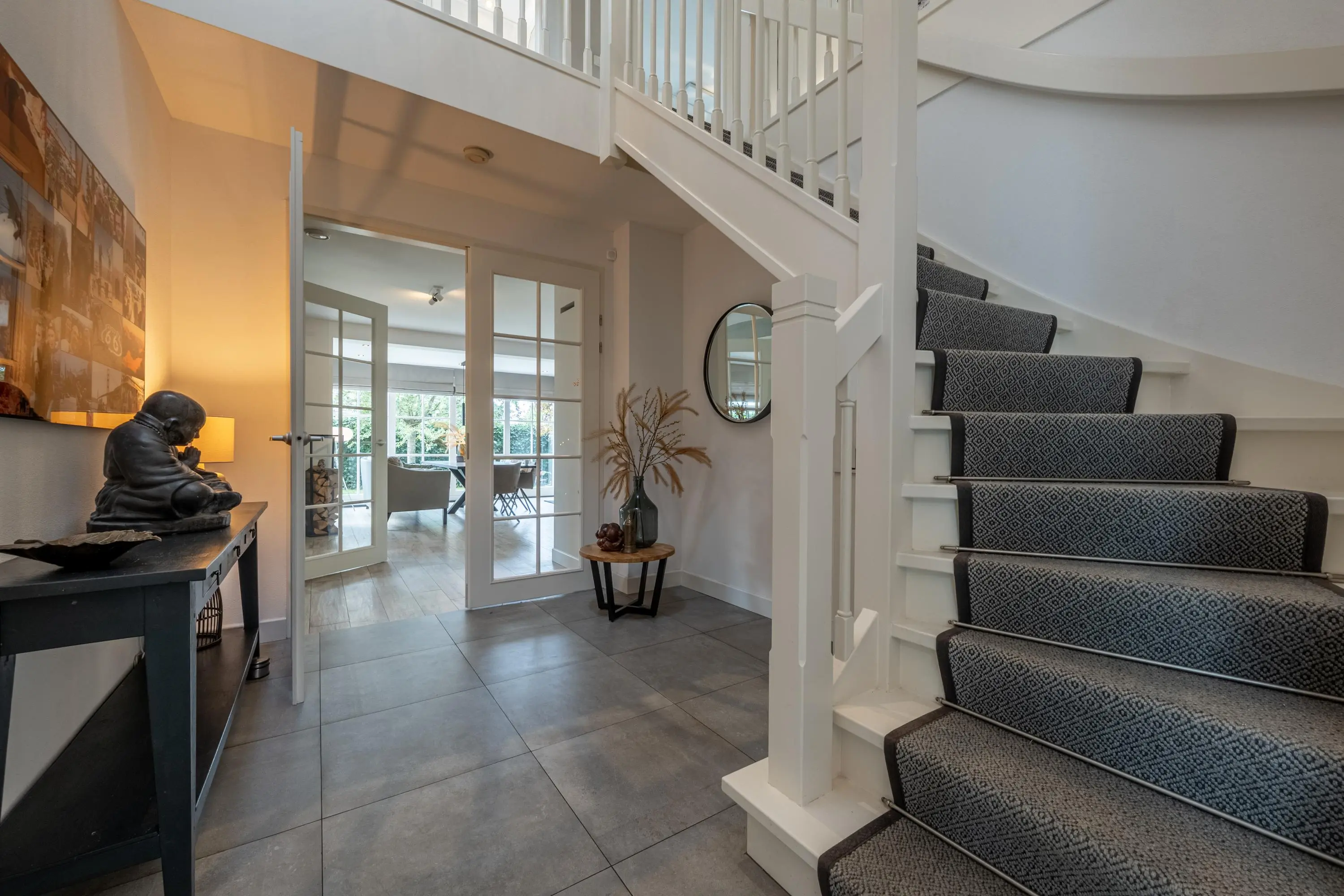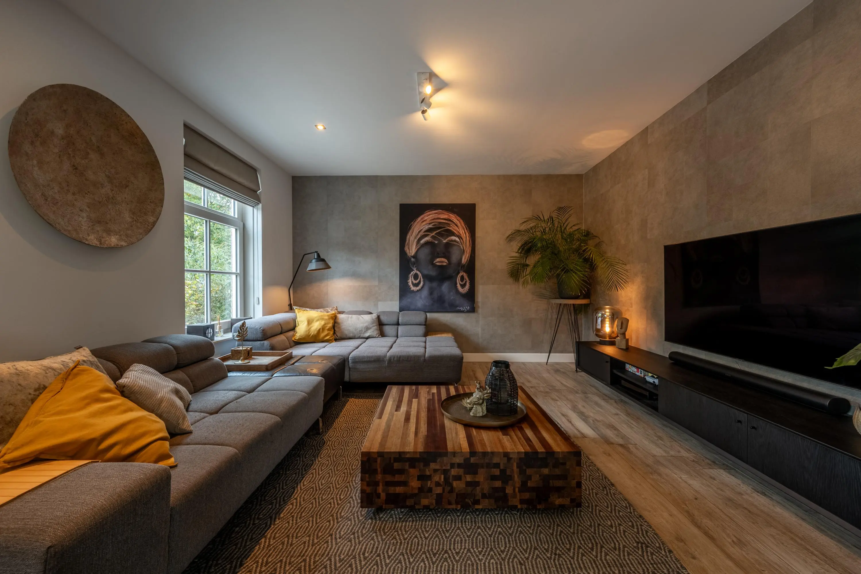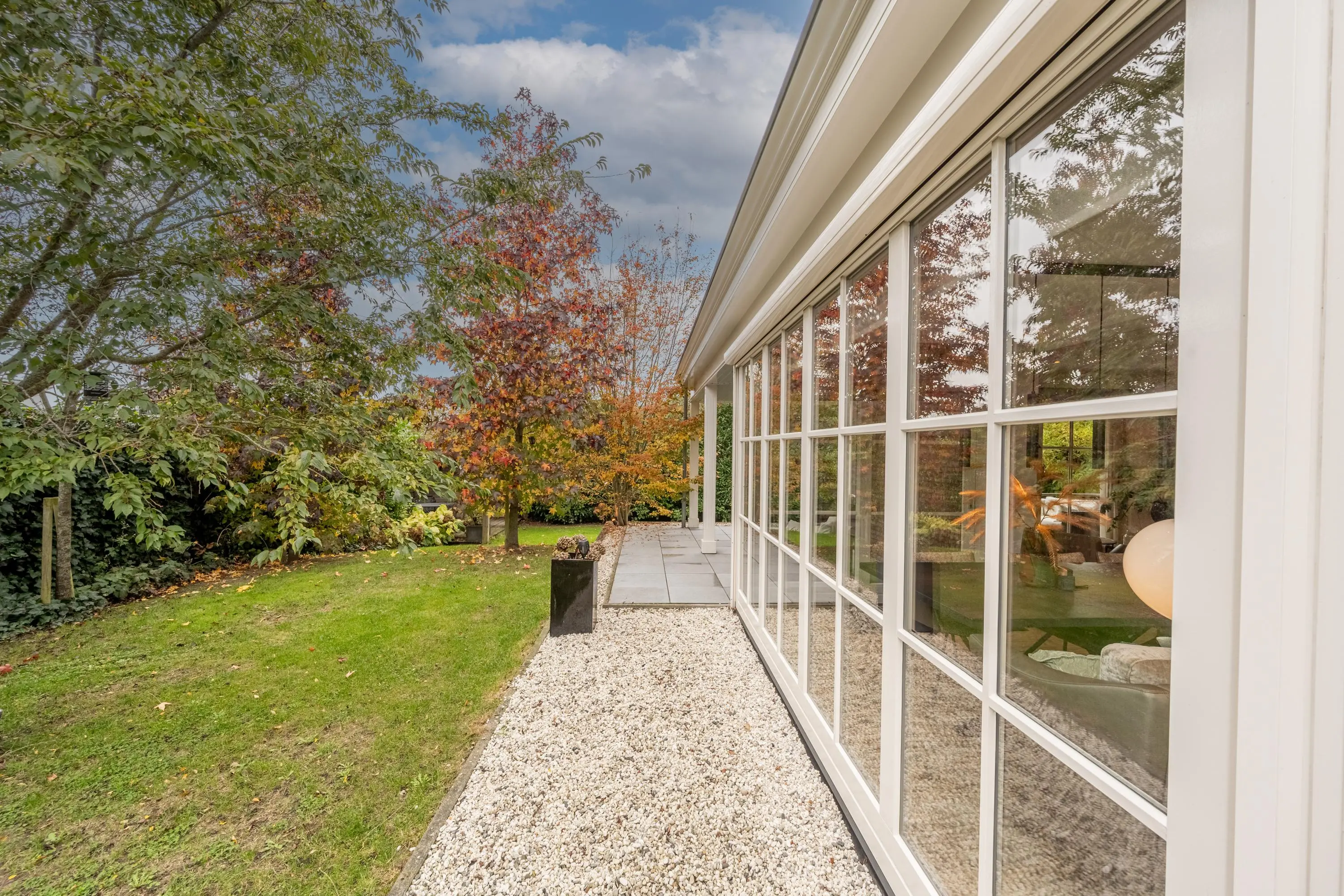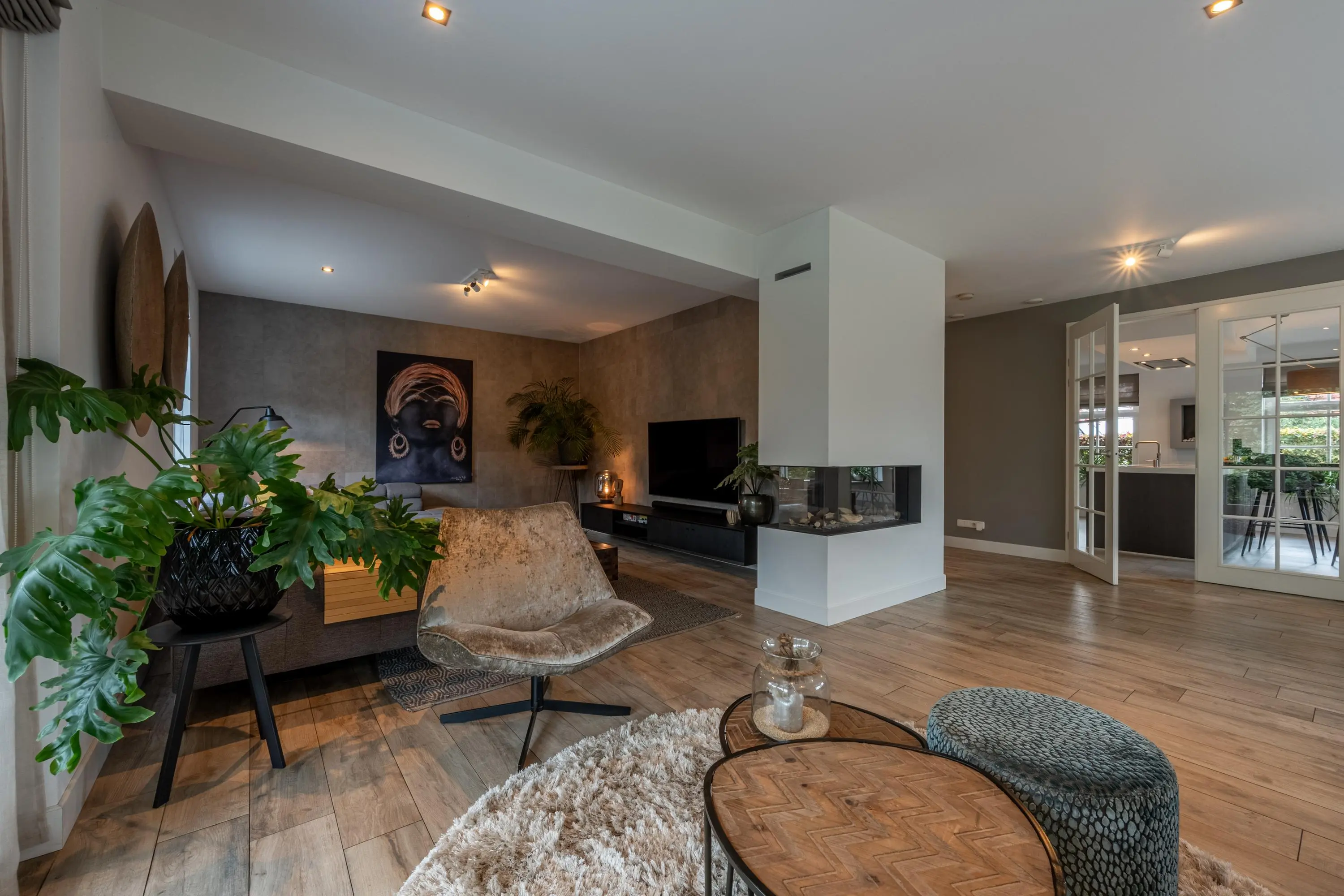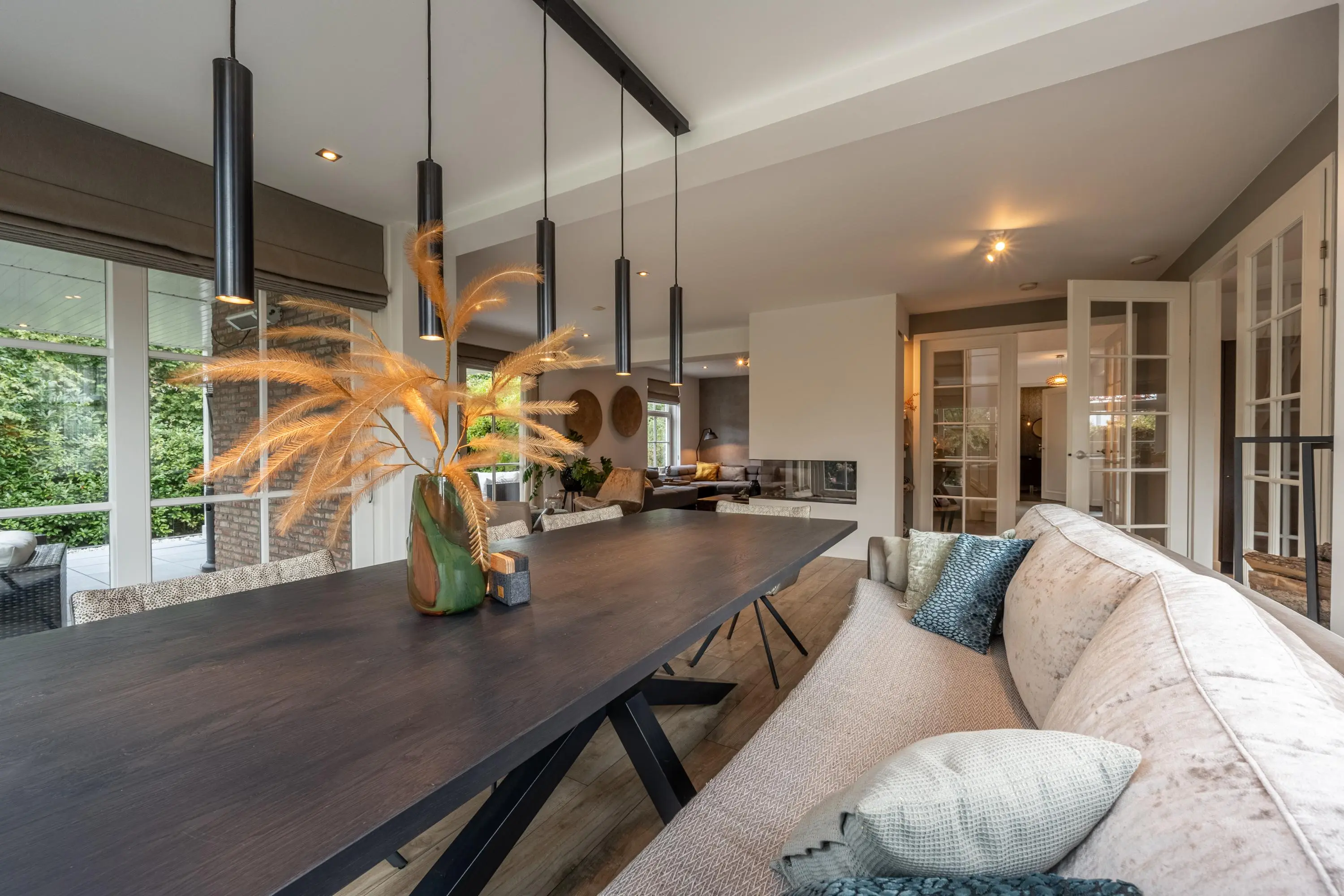 De royale living is een oase van licht en comfort. Het zitgedeelte aan de achterzijde is voorzien van een sfeervolle haard en biedt via grote raampartijen een prachtig uitzicht op de tuin. Het eetgedeelte is ruim genoeg voor een grote eettafel en vormt samen met de woonkamer één sfeervol geheel.