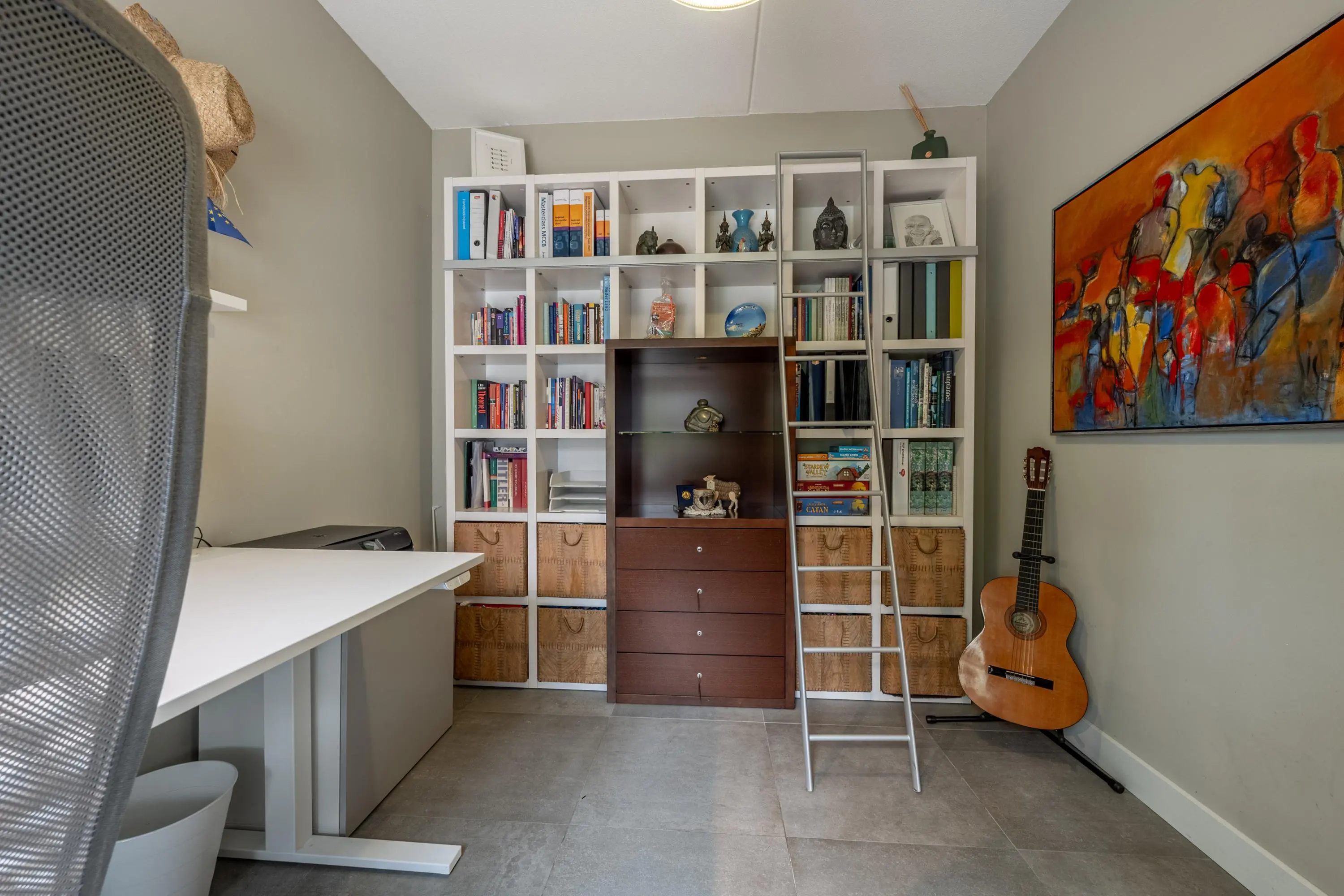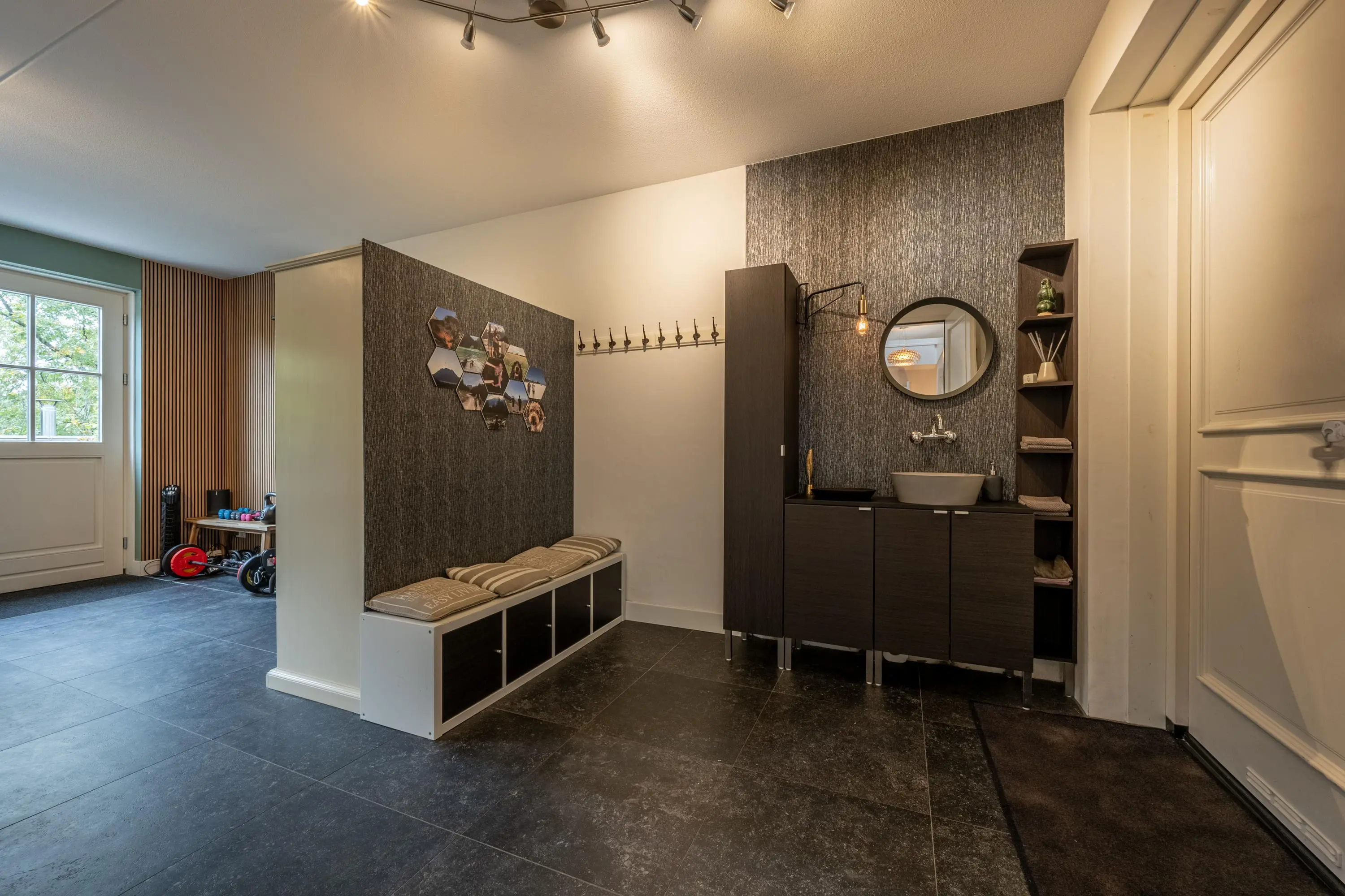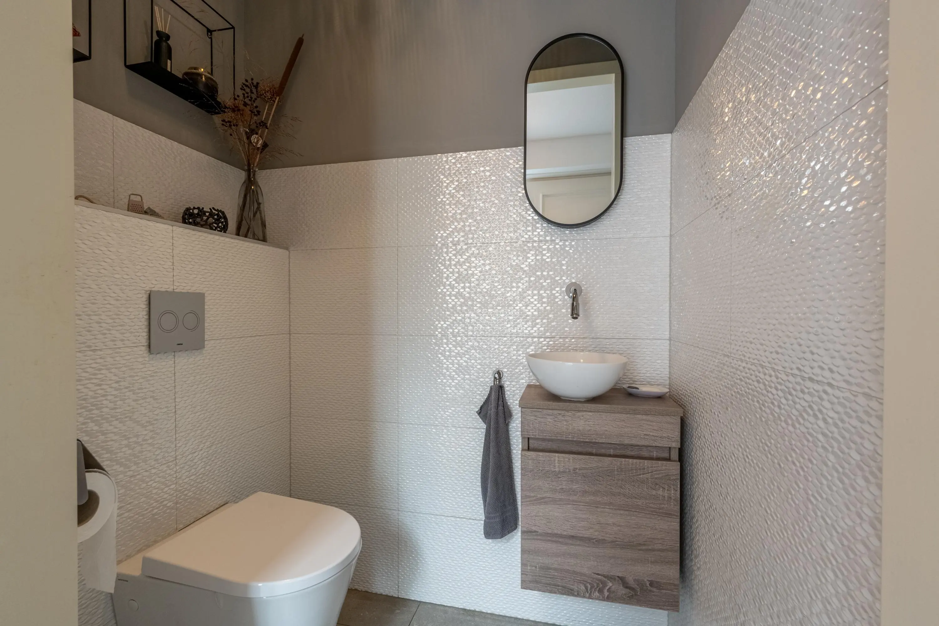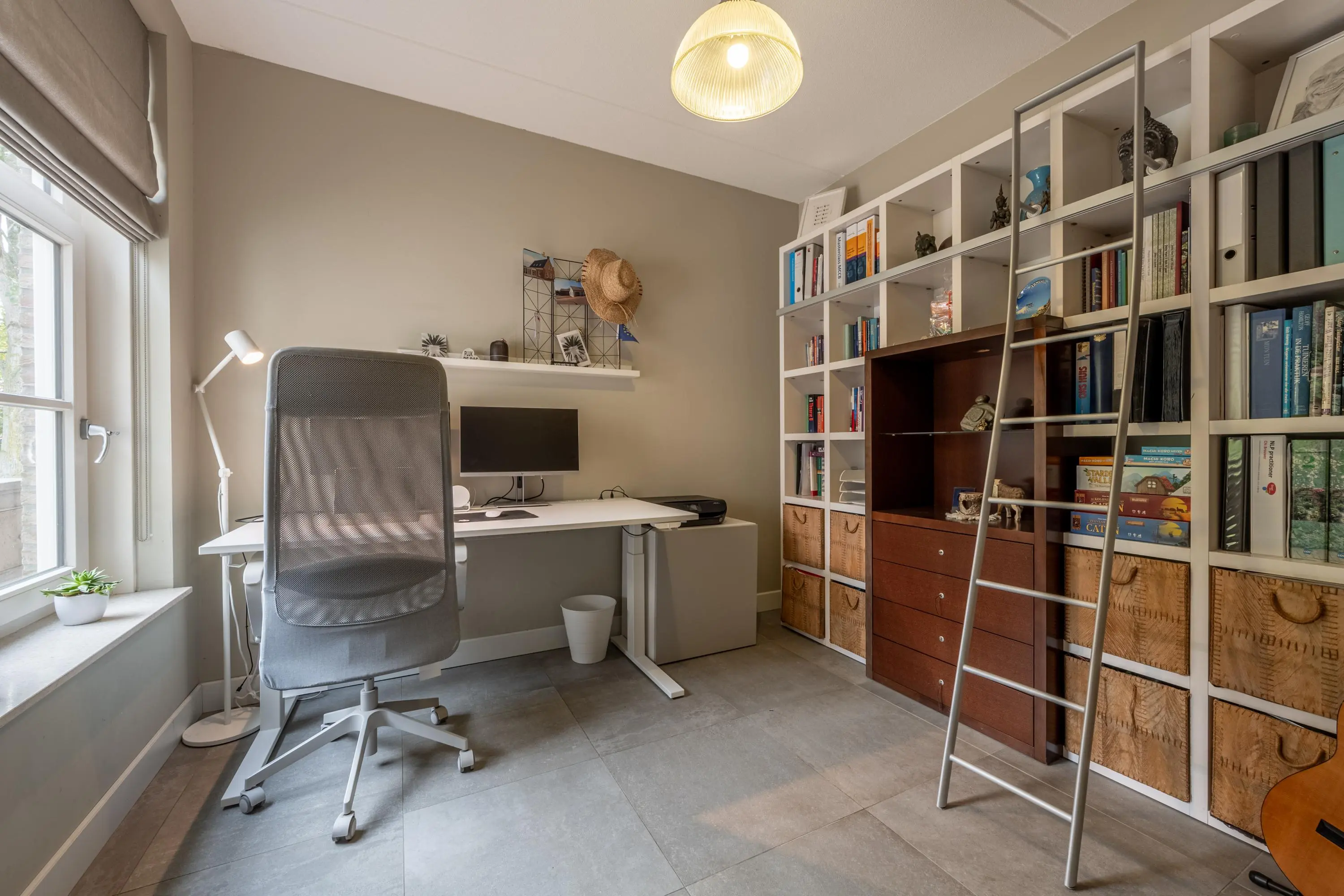 De hal beschikt over een moderne toiletruimte met zwevend toilet en fonteintje. Vanuit hier bereikt u tevens de separate kantoorruimte – ideaal voor werken aan huis.