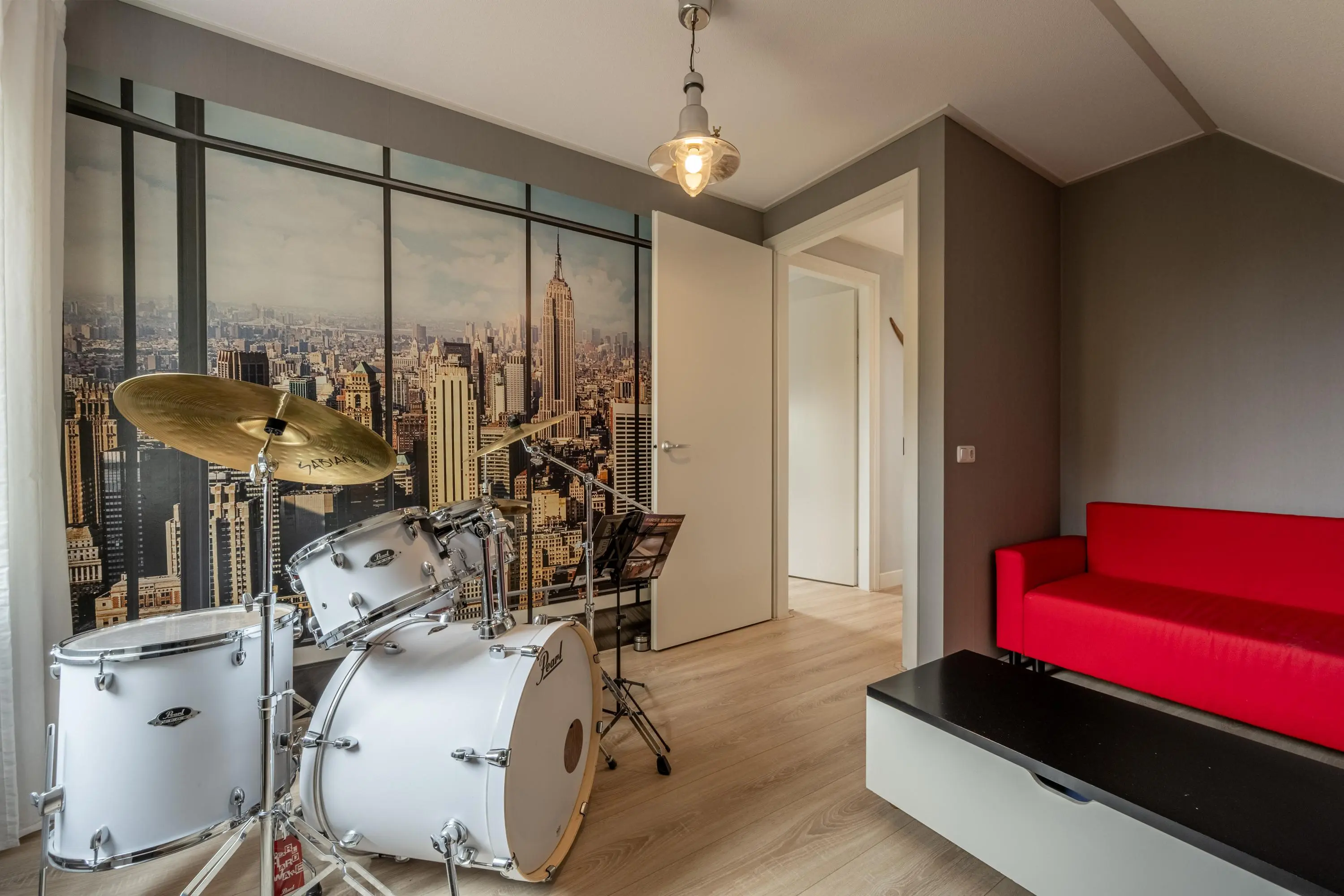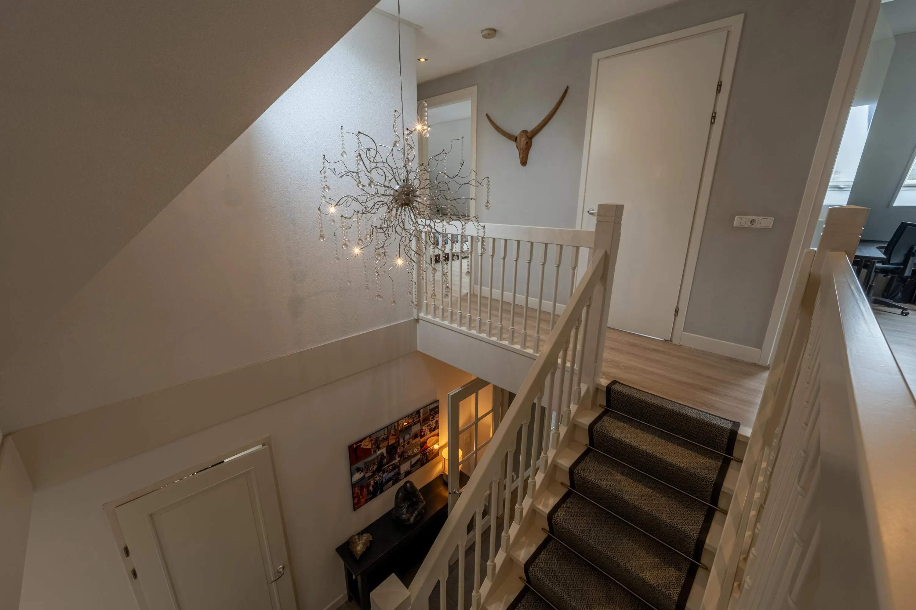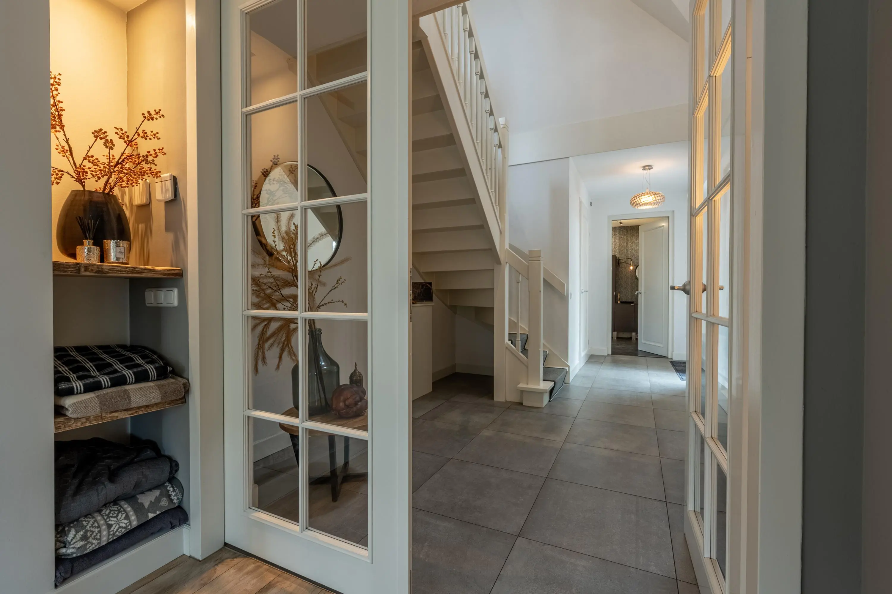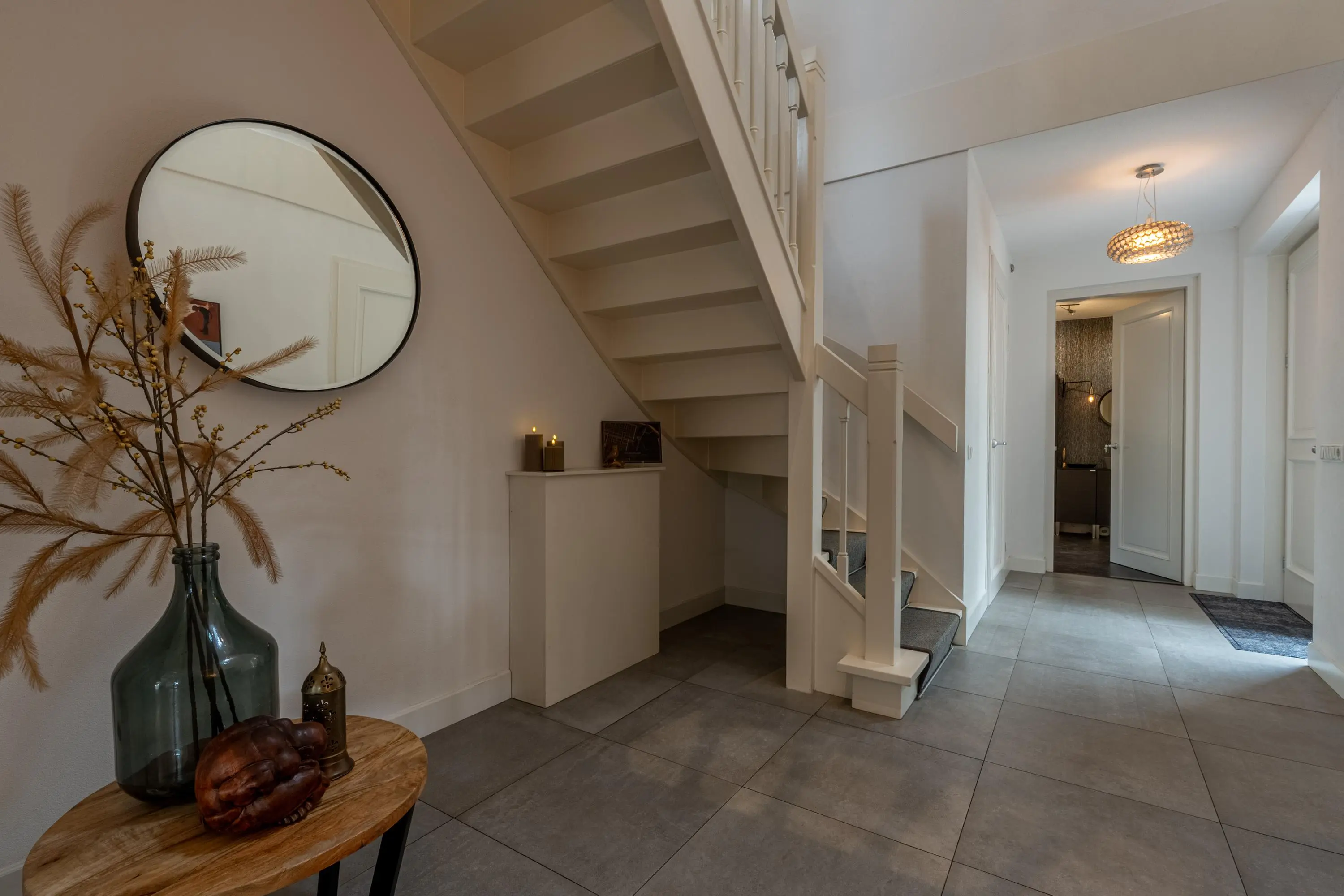 De hal beschikt over een moderne toiletruimte met zwevend toilet en fonteintje. Vanuit hier bereikt u tevens de separate kantoorruimte – ideaal voor werken aan huis.