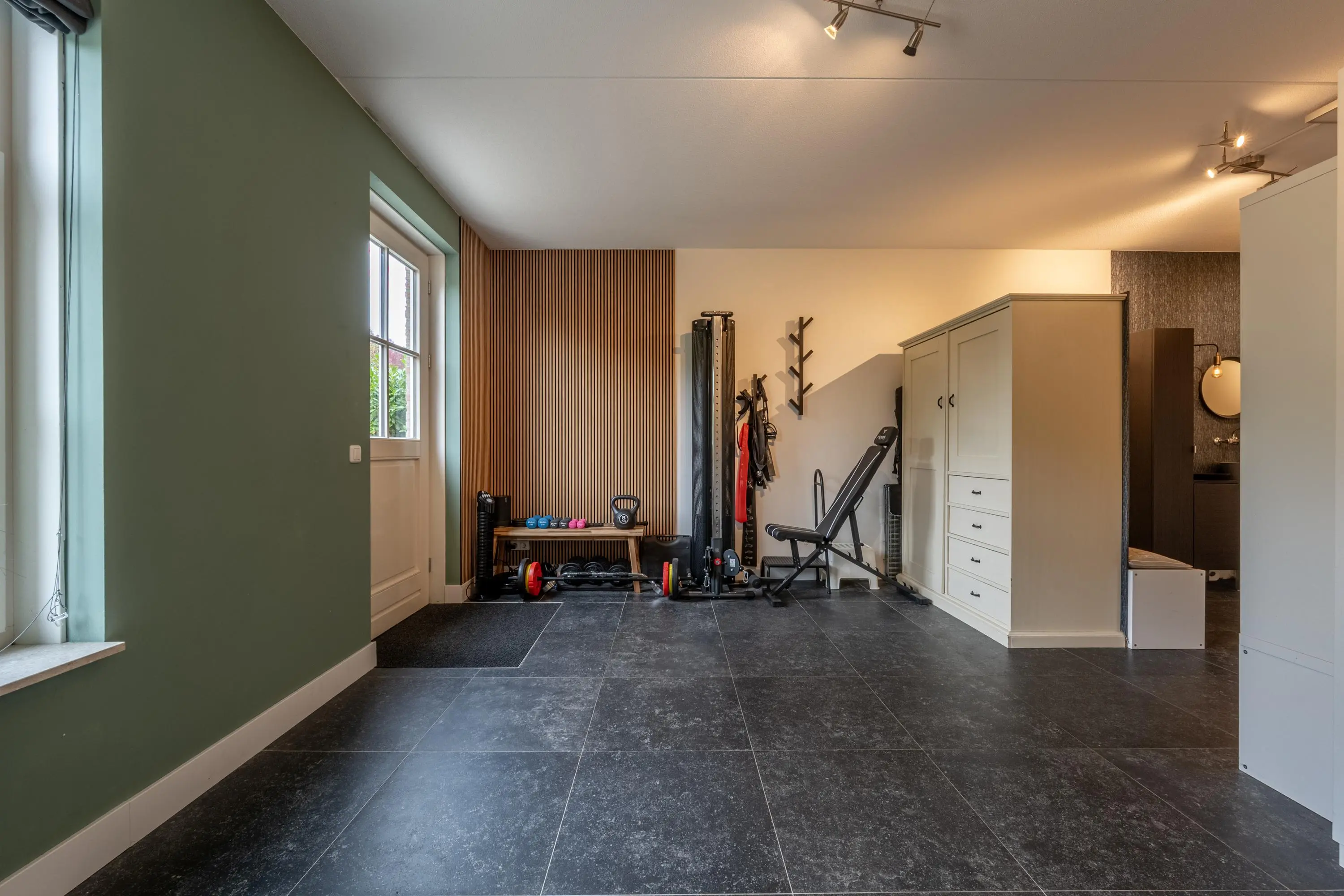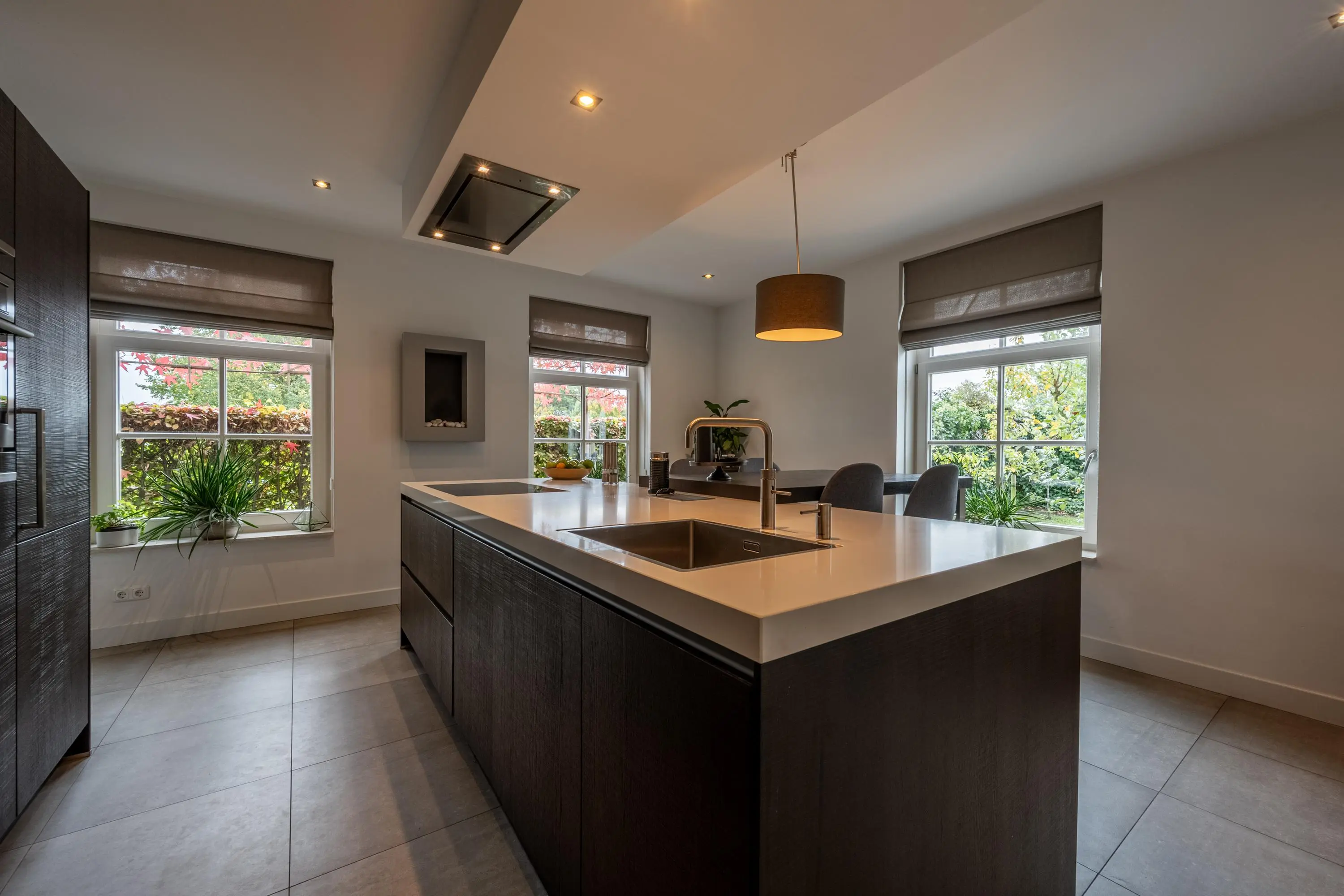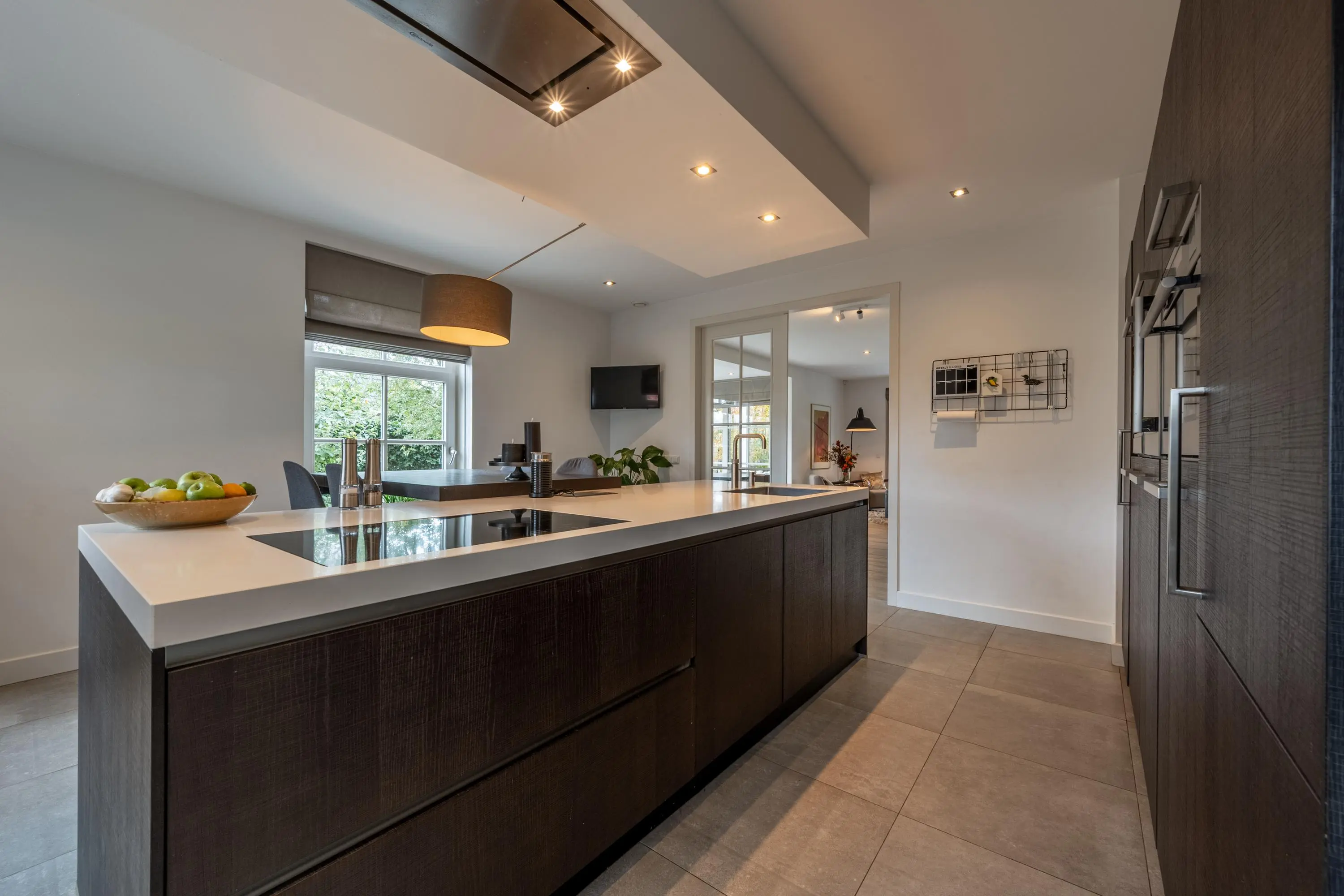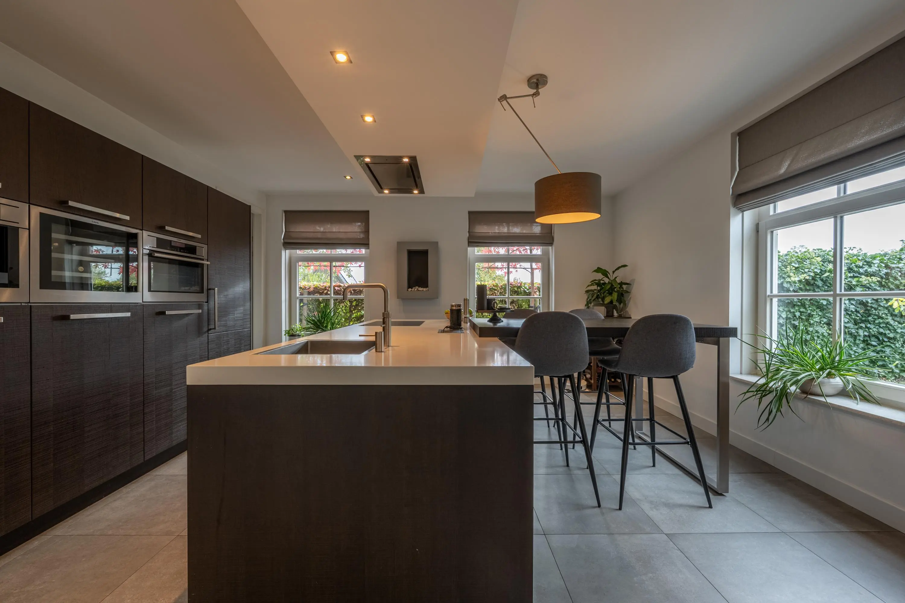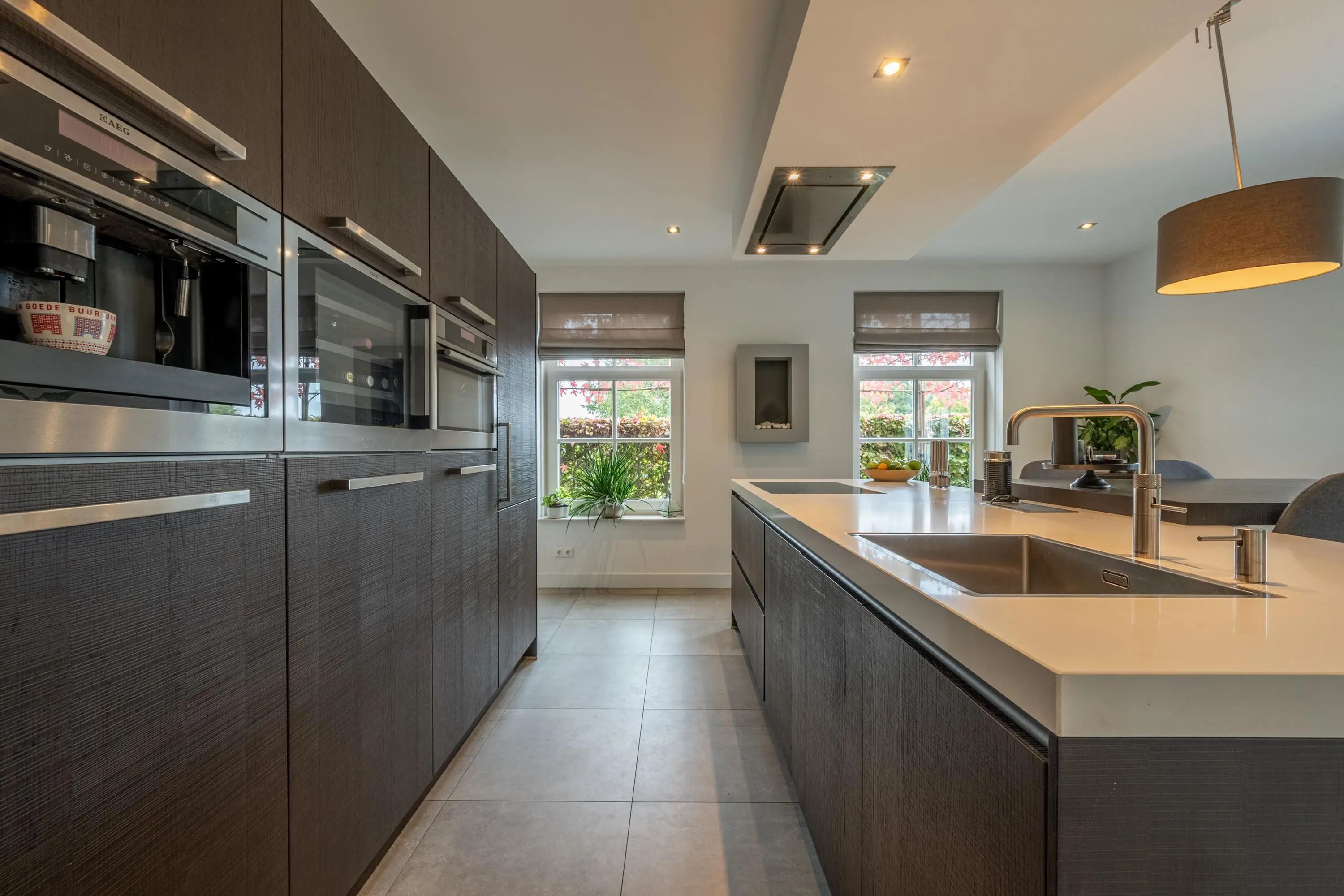 De moderne woonkeuken vormt het hart van de woning. De keuken beschikt over een groot kookeiland met barachtig zitgedeelte en een wandopstelling met diverse inbouwapparatuur (deels vernieuwd in 2023). De keuken is uitgerust met o.a. een inductiekookplaat, combi-oven, koffiemachine, wijnklimaatkast, vaatwasser, koelkast en vriezer. Vanuit de keuken heeft u toegang tot de praktische bijkeuken, waar extra bergruimte en de opstelplaats van de cv-ketel zijn te vinden.