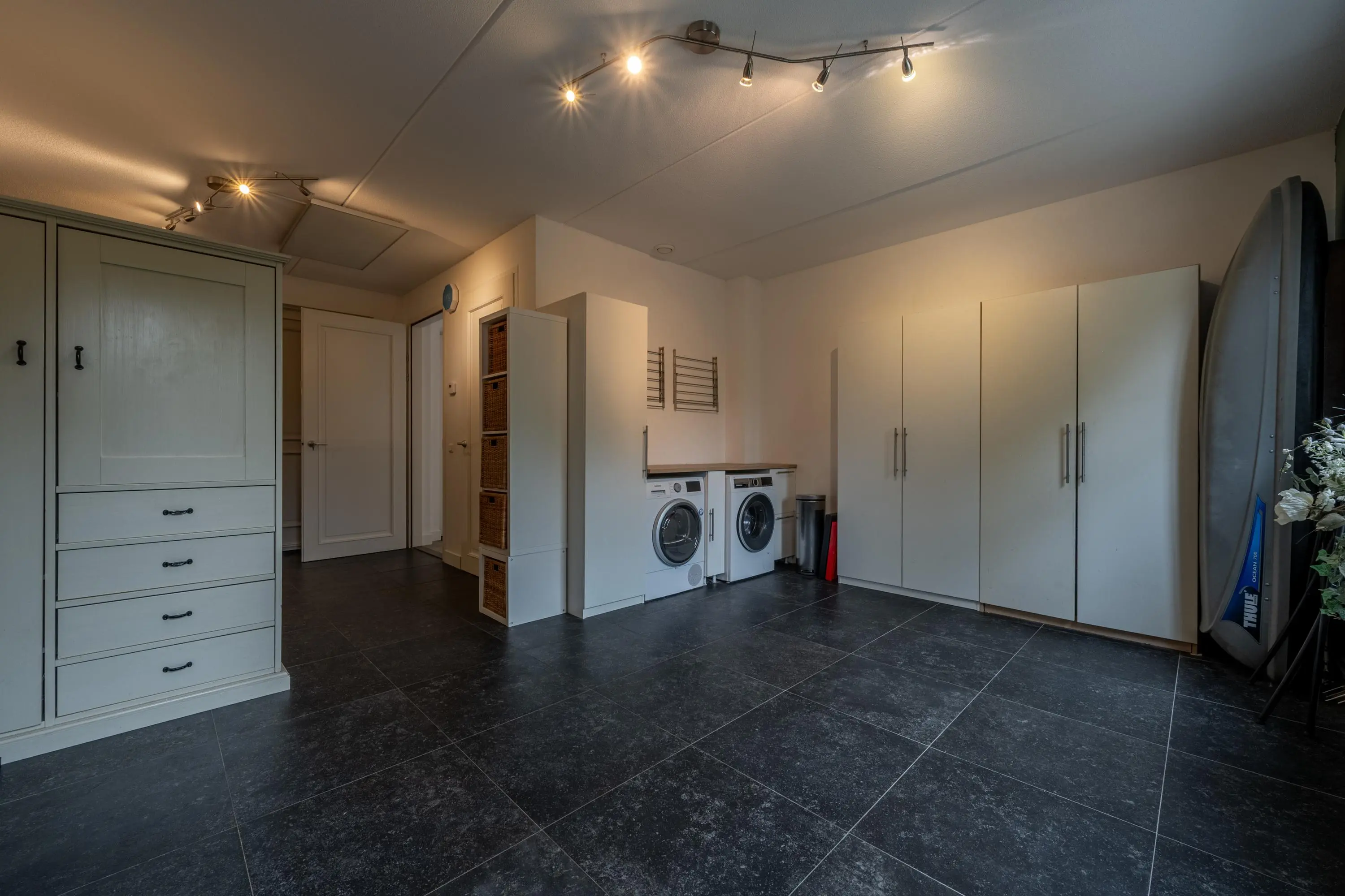 De garage is voorzien van een wasmachine- en drogeraansluiting en biedt via een loopdeur directe toegang tot de achtertuin. Dankzij de dubbele openslaande deuren is er voldoende ruimte voor het parkeren van een auto of extra opslag.
