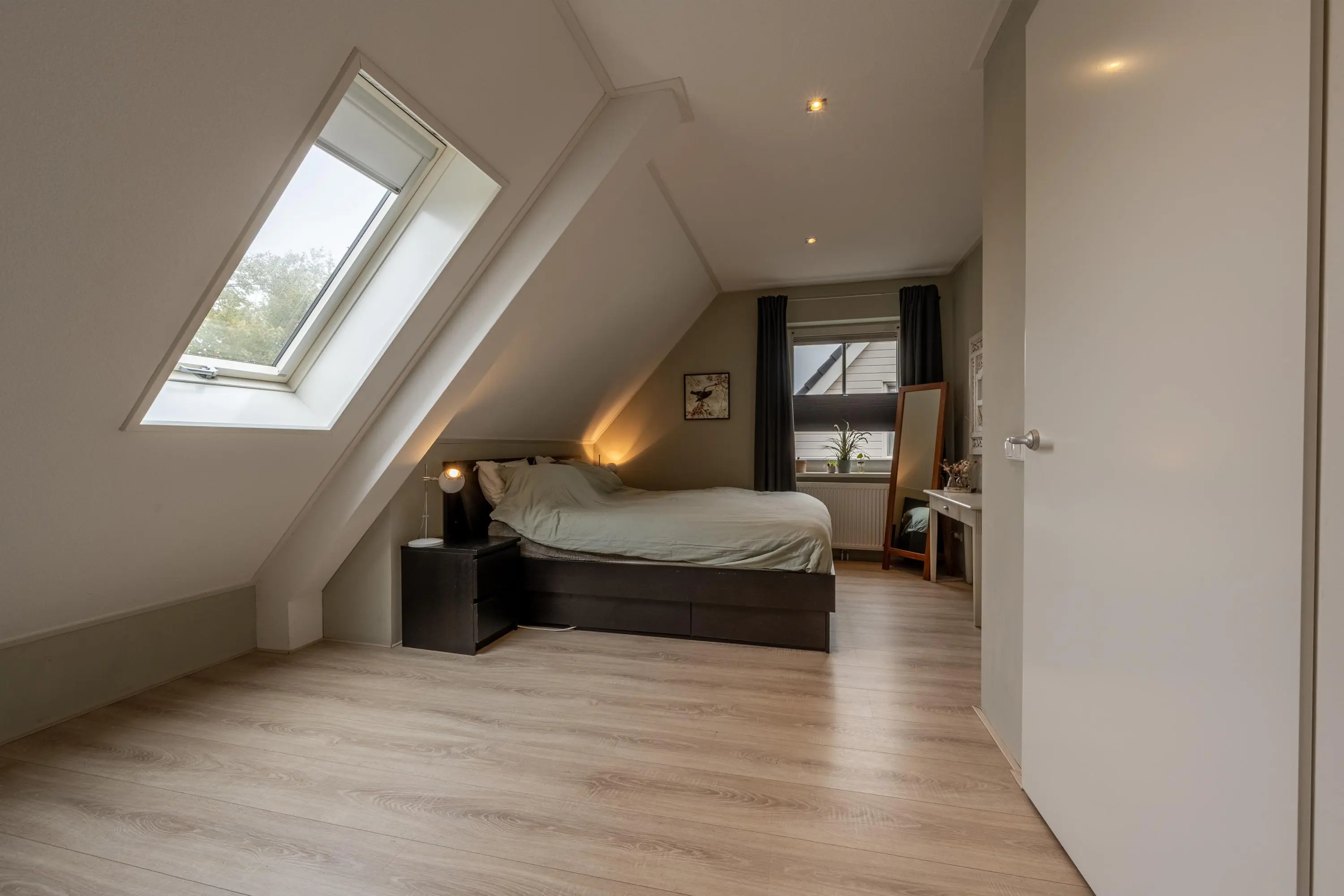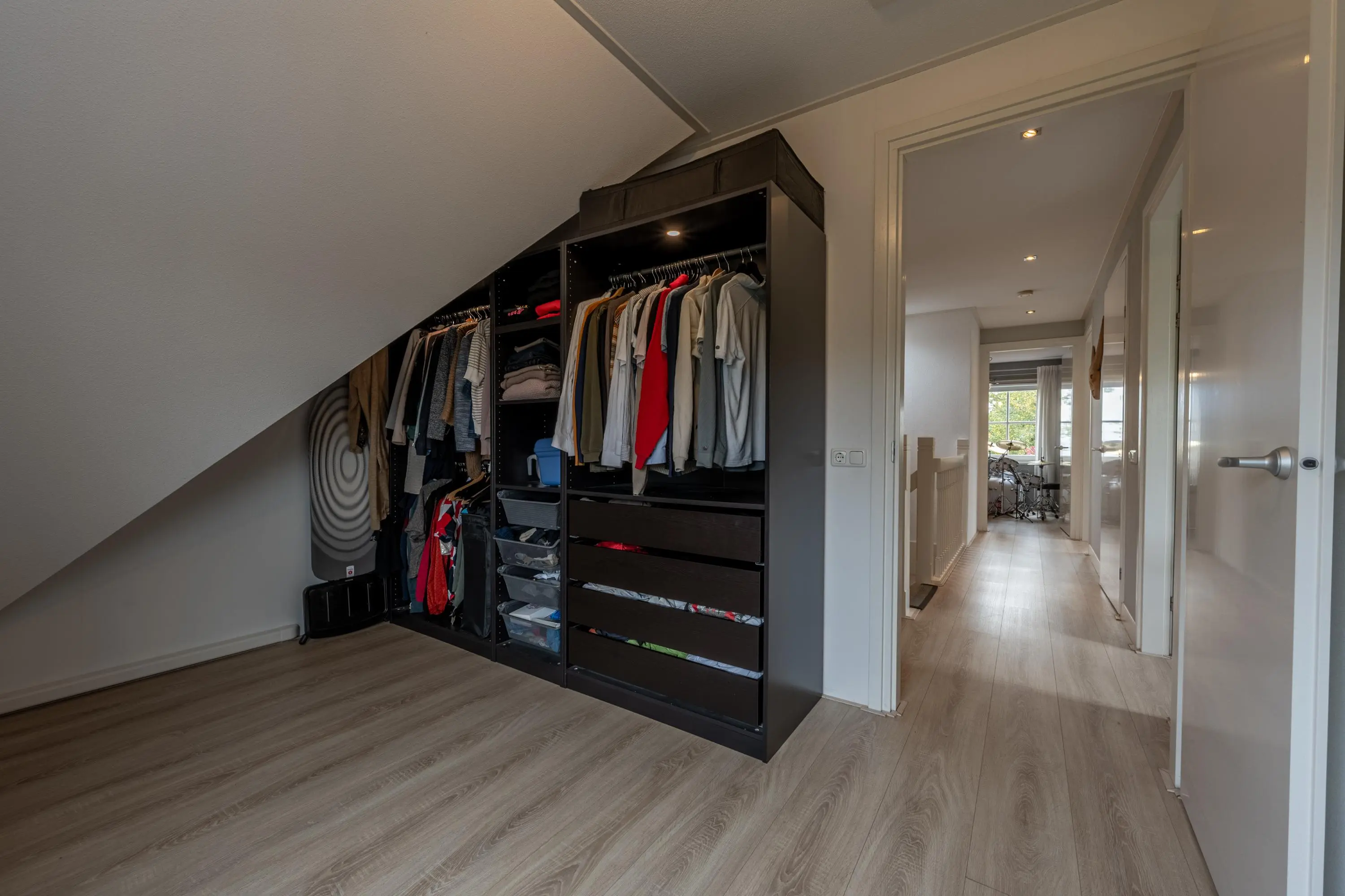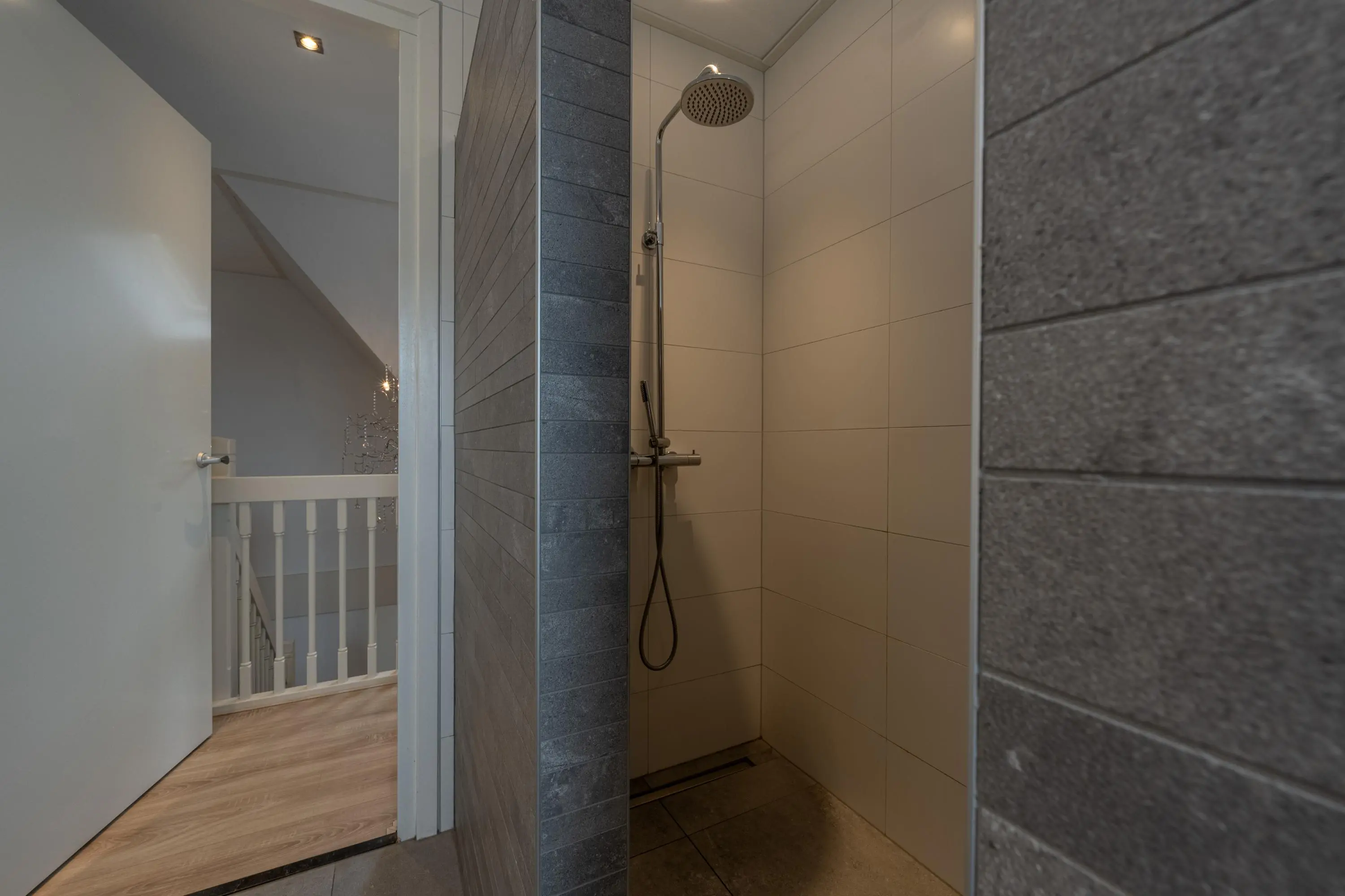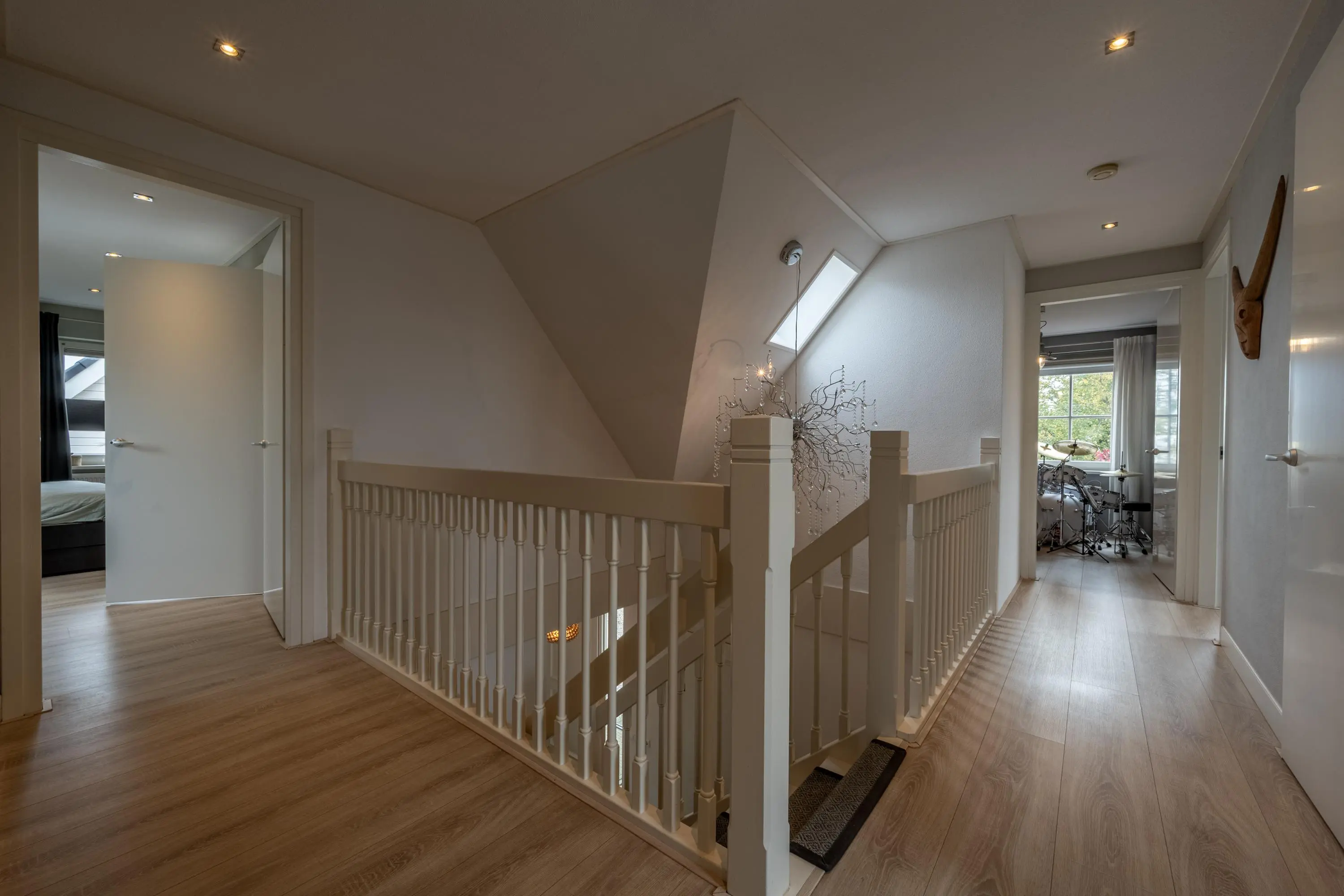 De overloop biedt toegang tot maar liefst vijf slaapkamers en twee badkamers. De hoofdslaapkamer beschikt over een royale walk-in closet en een eigen badkamer, compleet met inloopdouche, wastafelmeubel en toilet.