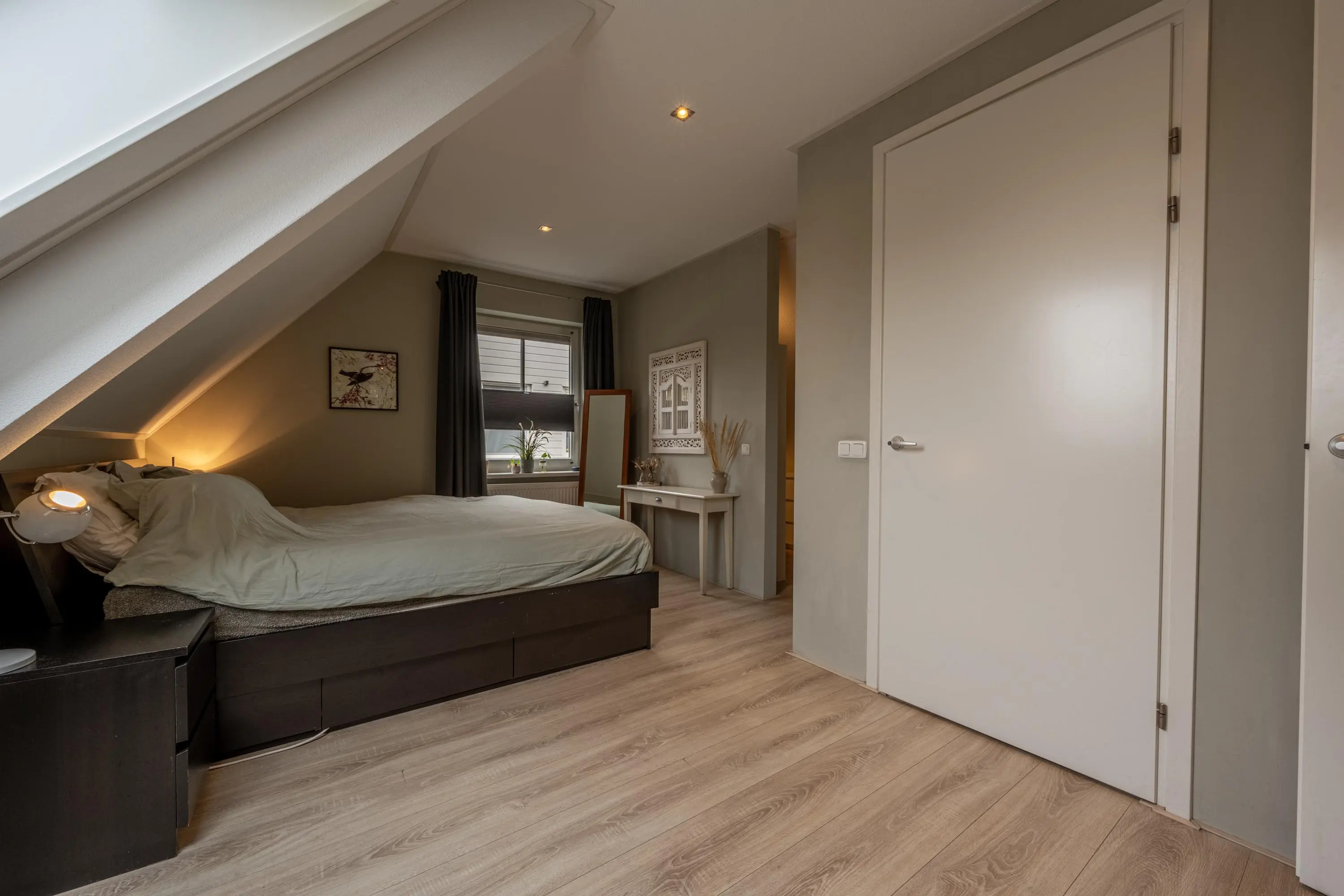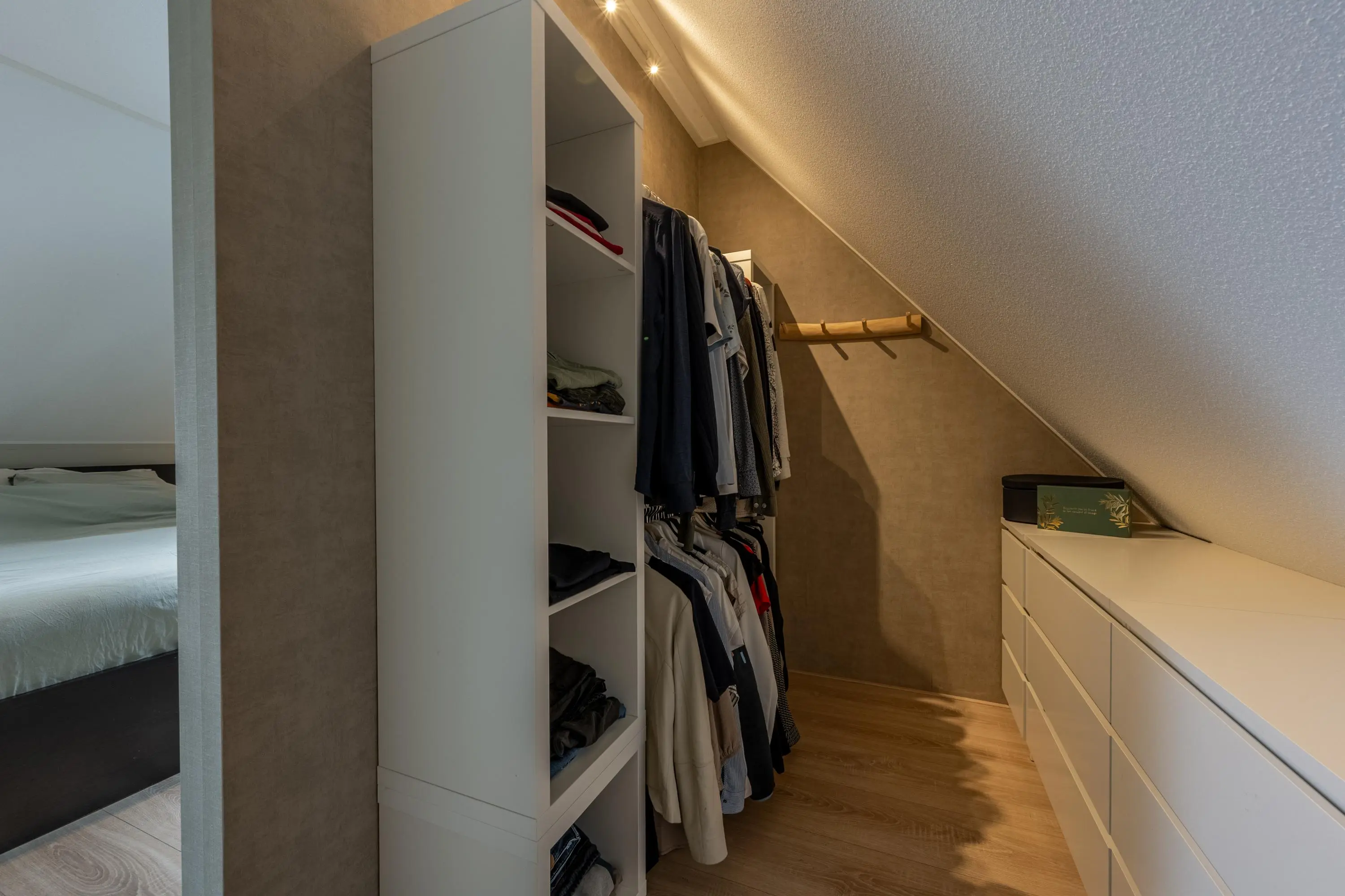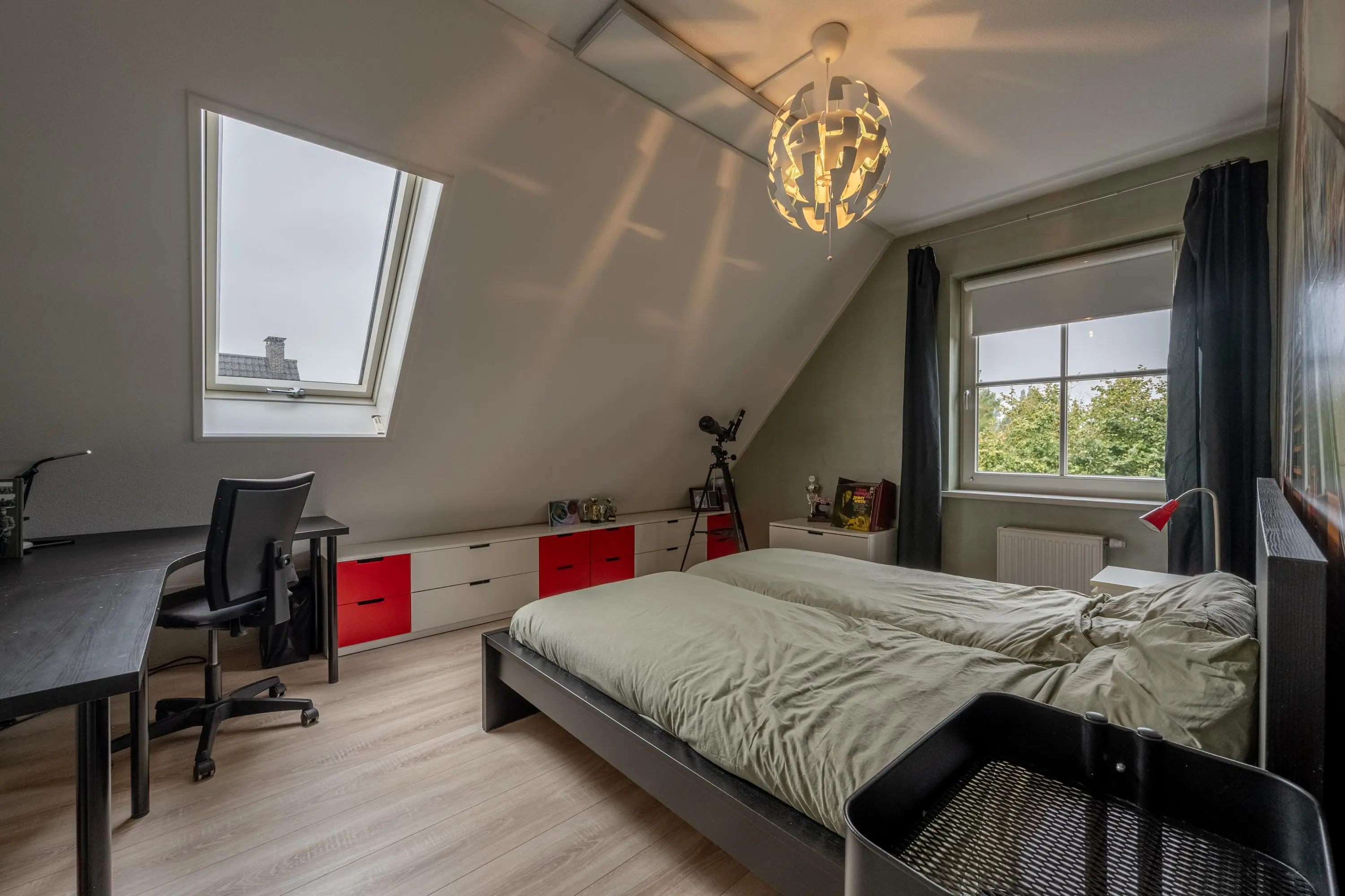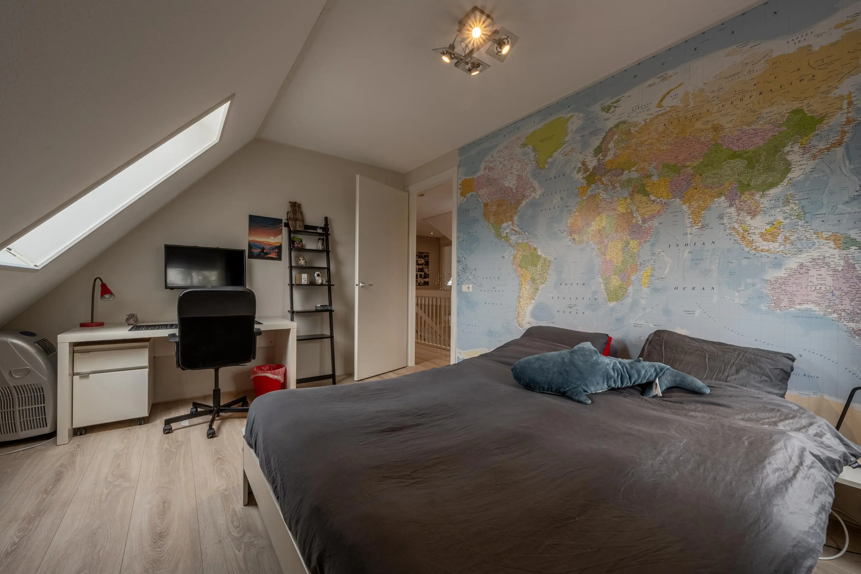 De overloop biedt toegang tot maar liefst vijf slaapkamers en twee badkamers. De hoofdslaapkamer beschikt over een royale walk-in closet en een eigen badkamer, compleet met inloopdouche, wastafelmeubel en toilet.
