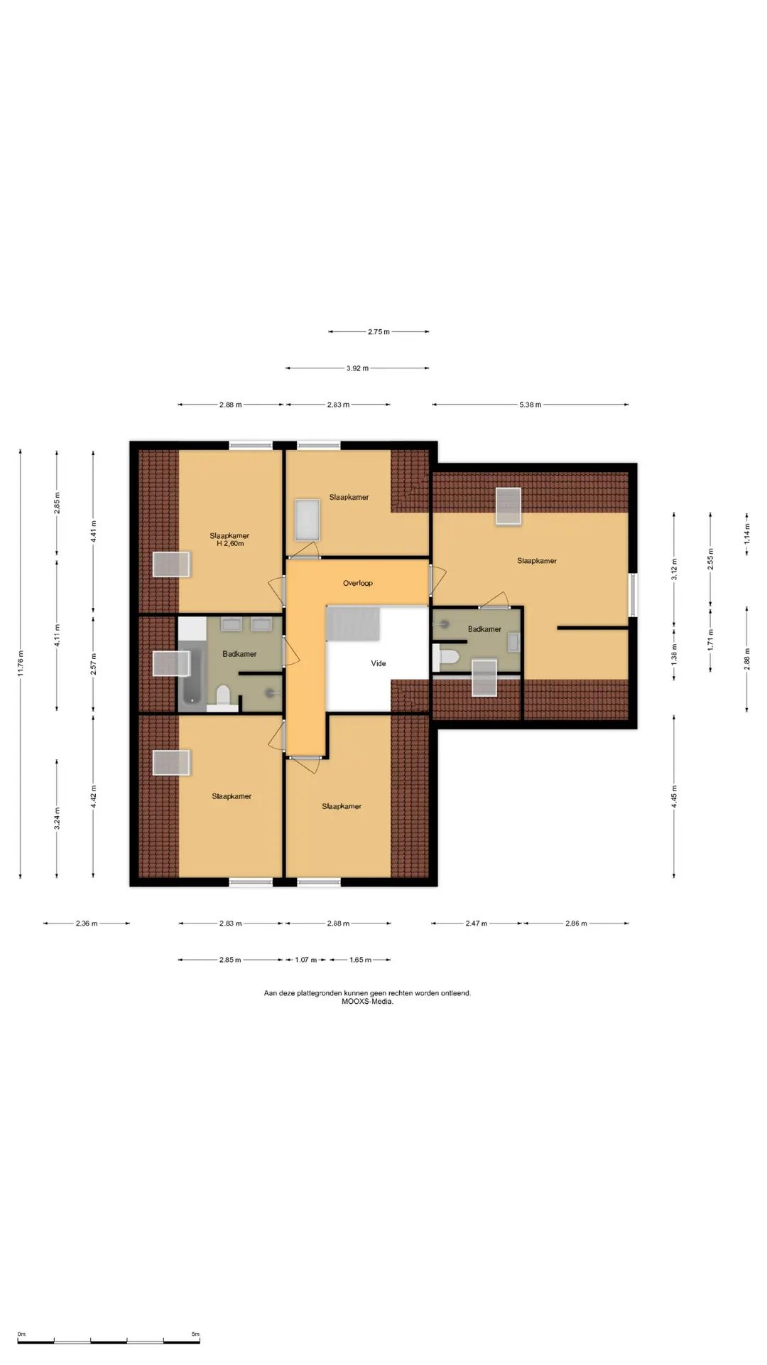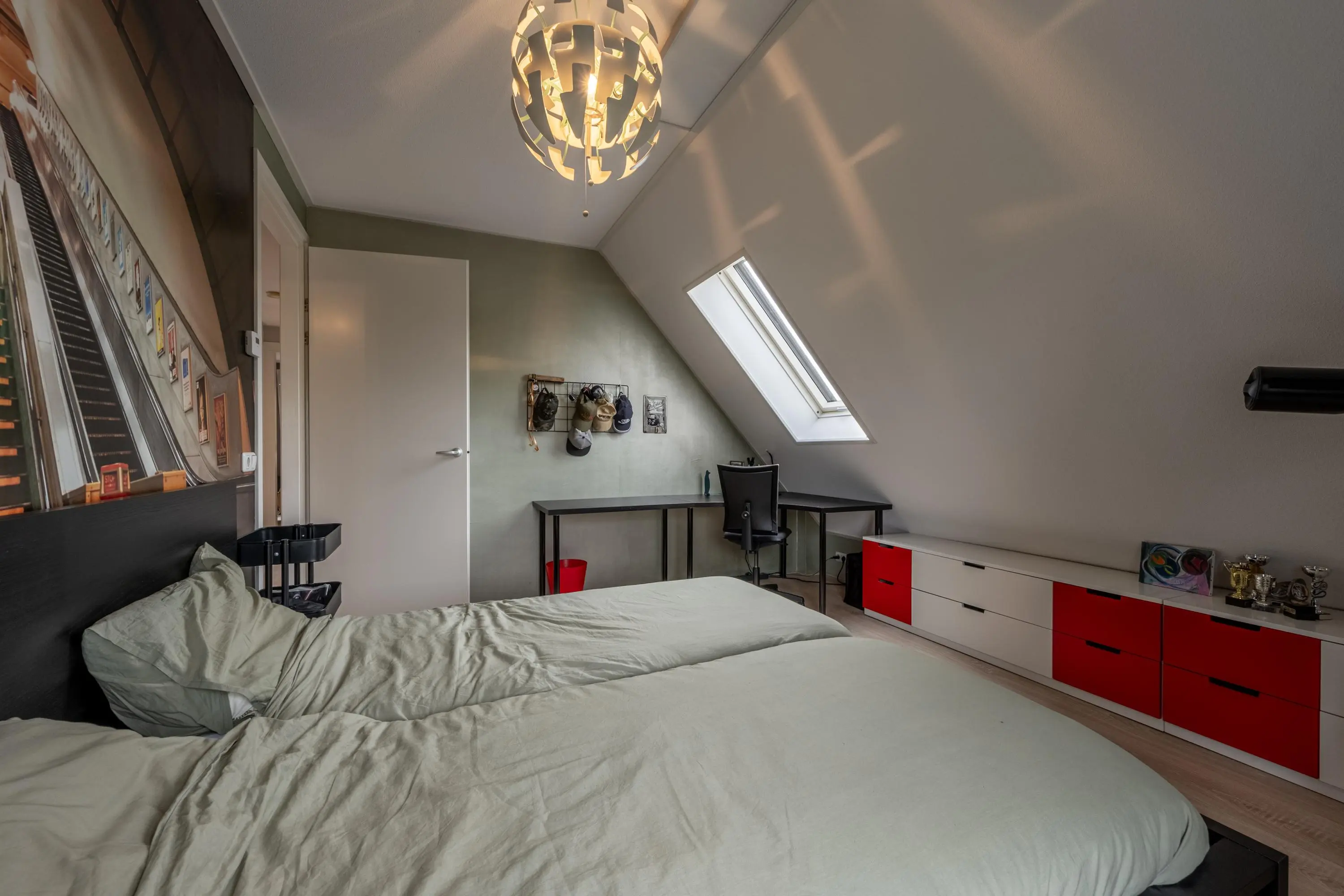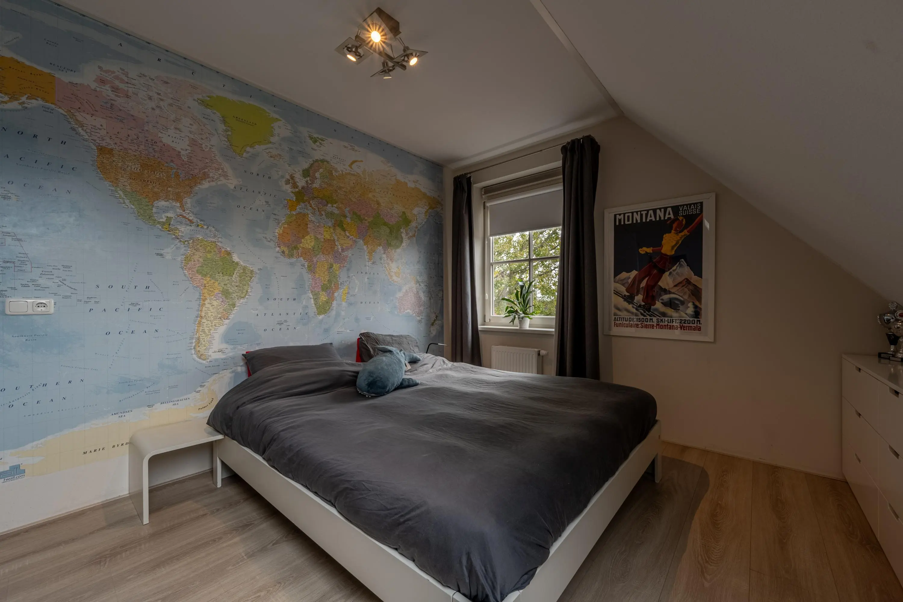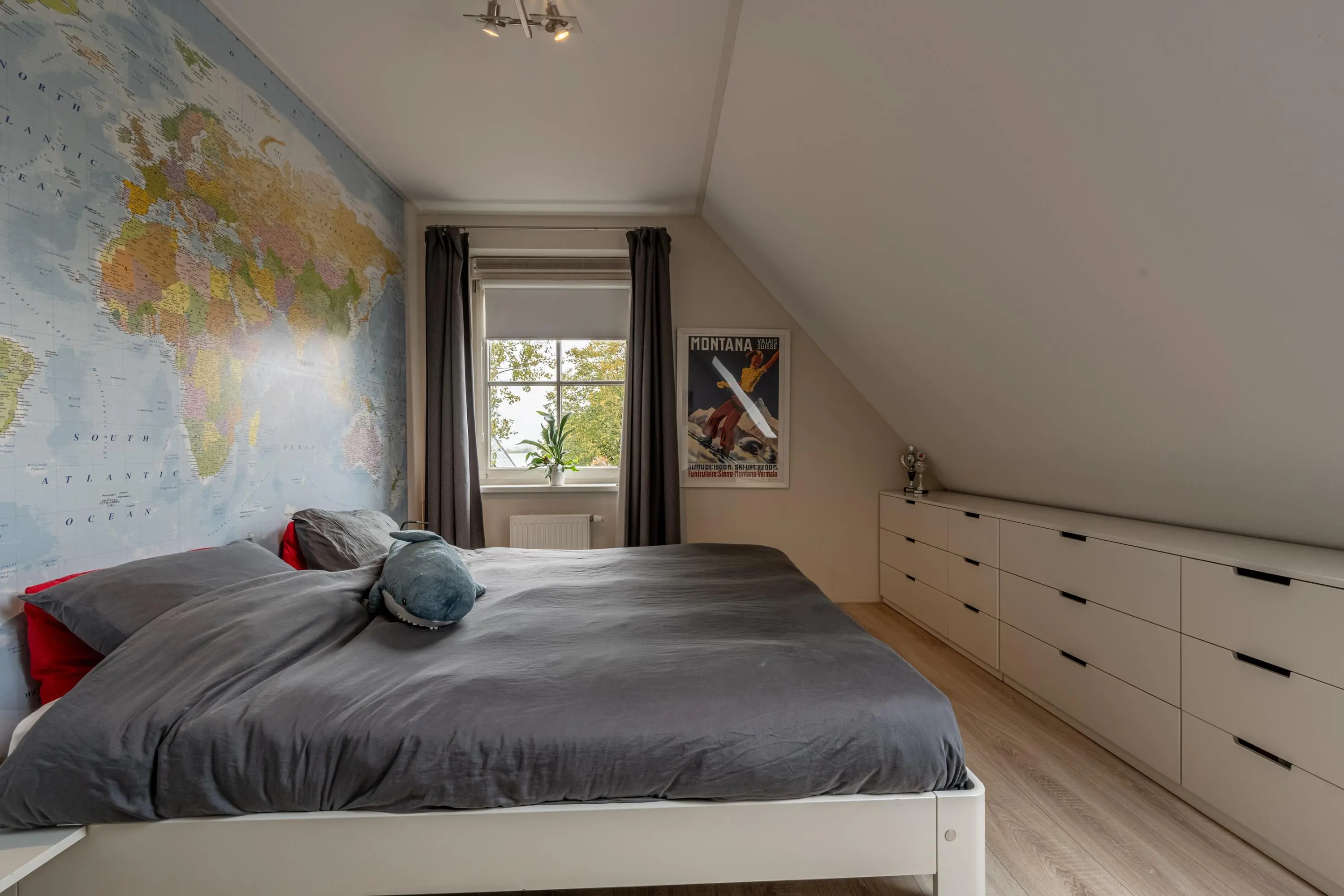 De overloop biedt toegang tot maar liefst vijf slaapkamers en twee badkamers. De hoofdslaapkamer beschikt over een royale walk-in closet en een eigen badkamer, compleet met inloopdouche, wastafelmeubel en toilet.