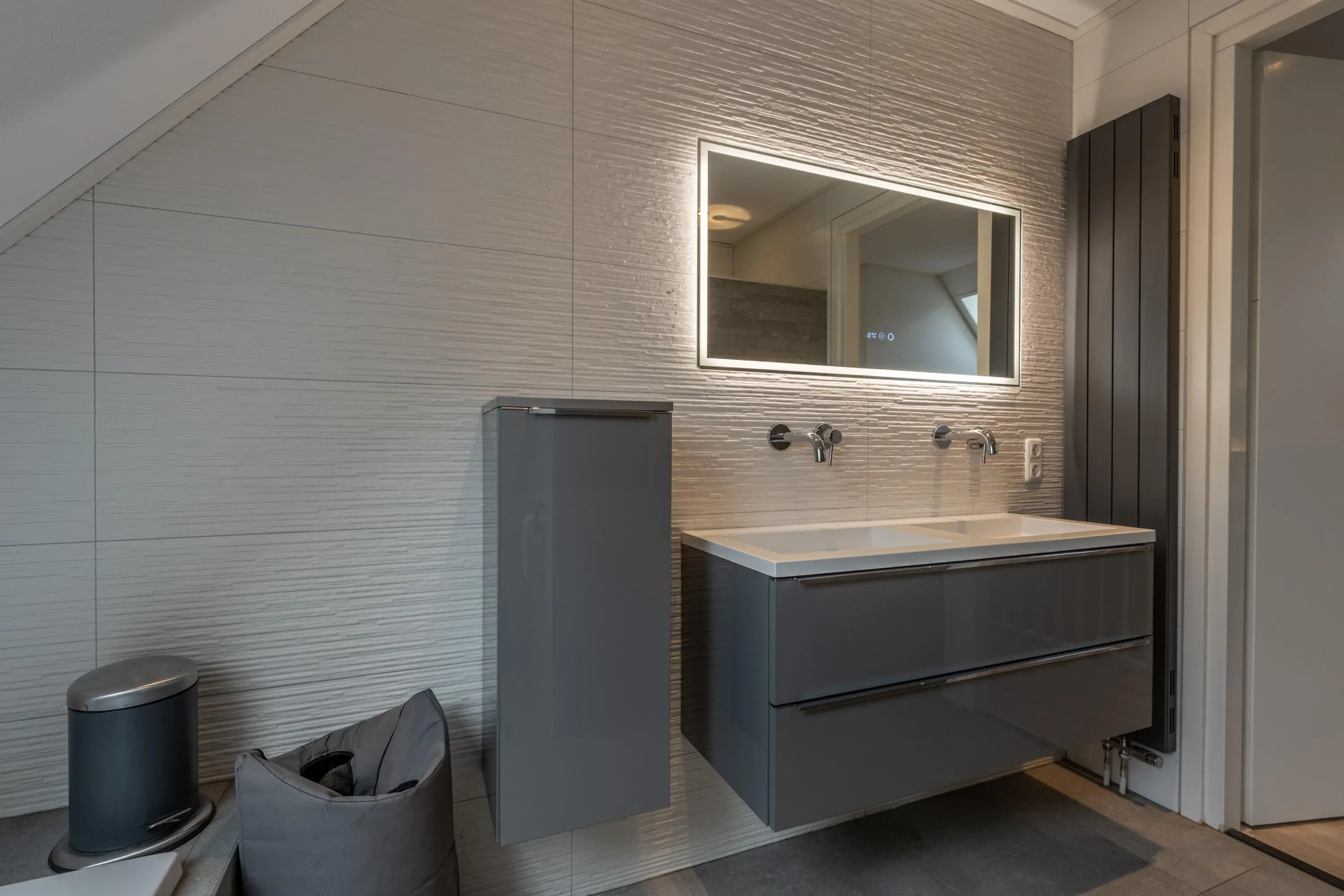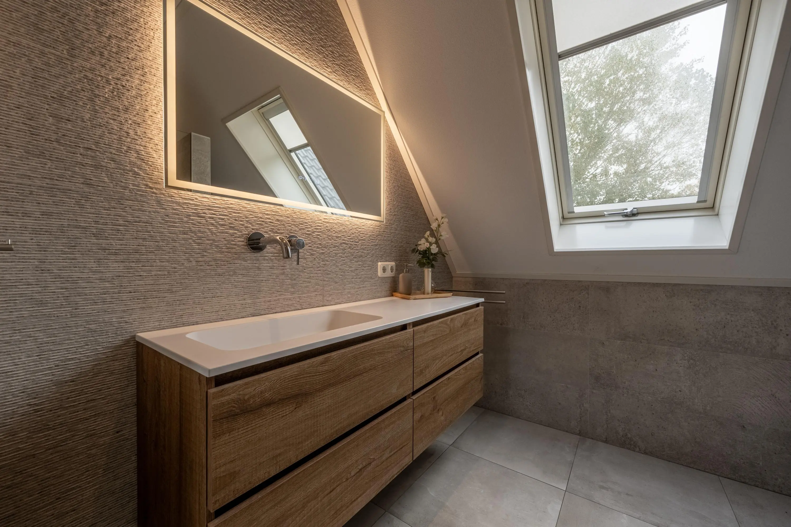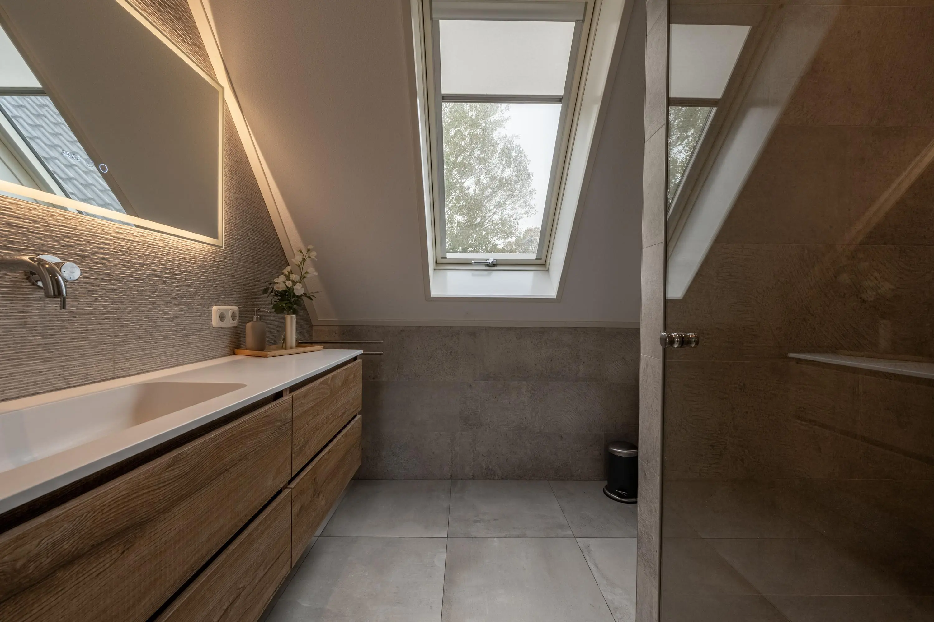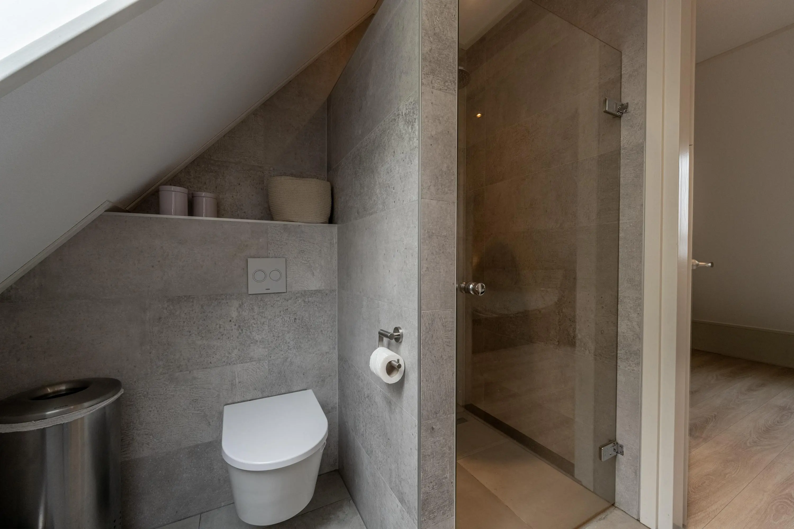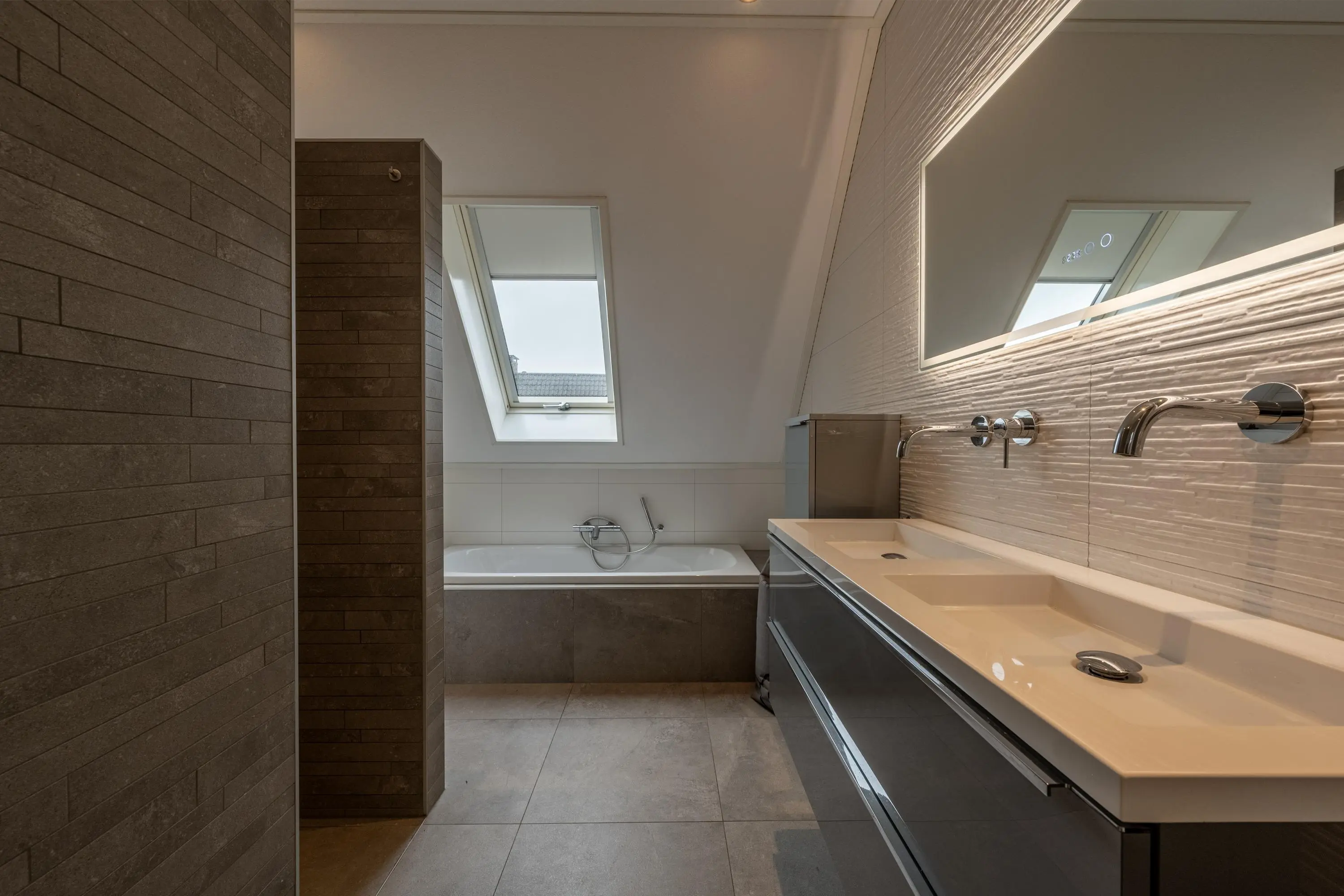 De separate badkamer is modern en stijlvol ingericht met een ligbad, inloopdouche, dubbele wastafel en toilet – volledig in lijn met de hoogwaardige afwerking van de rest van de woning.