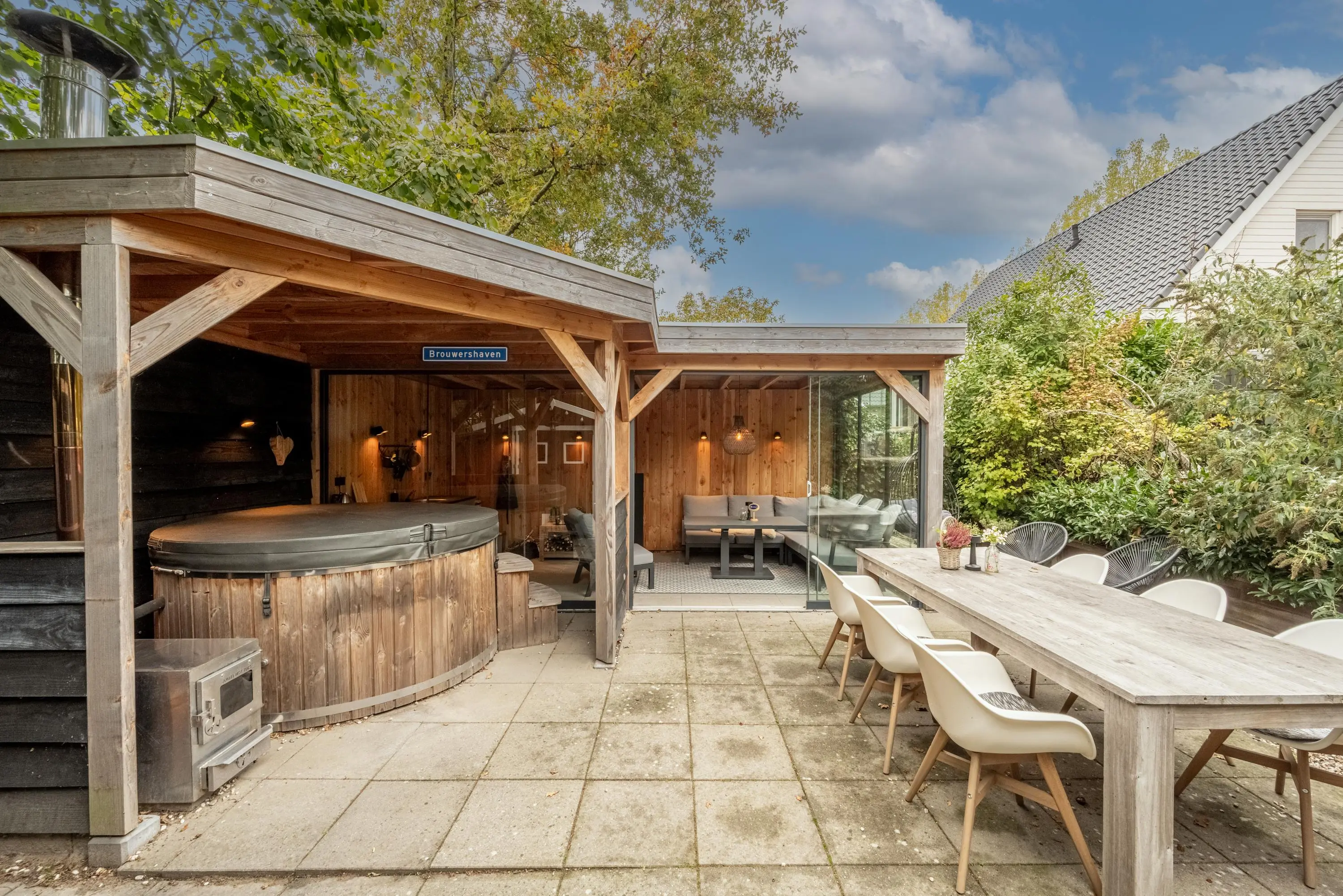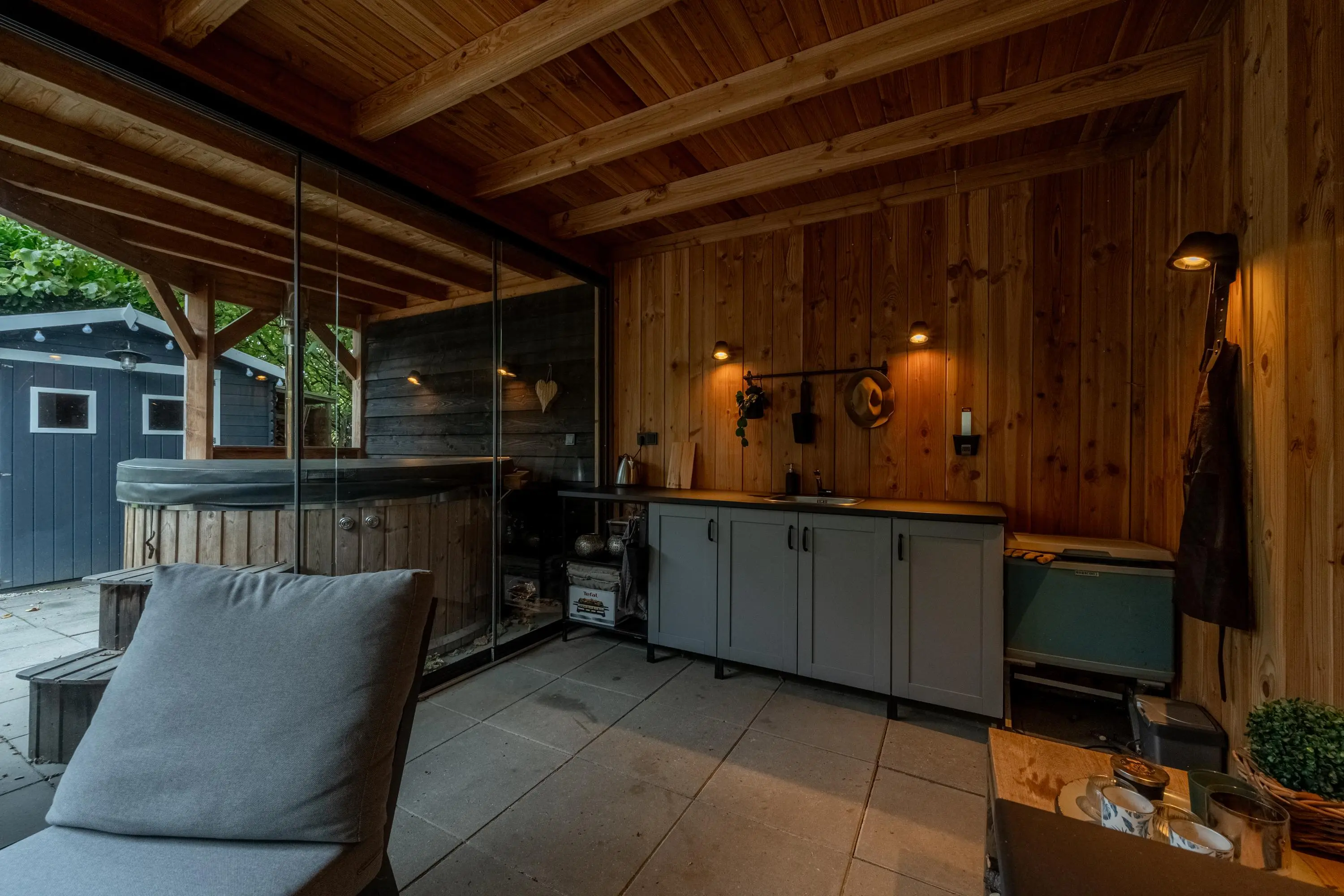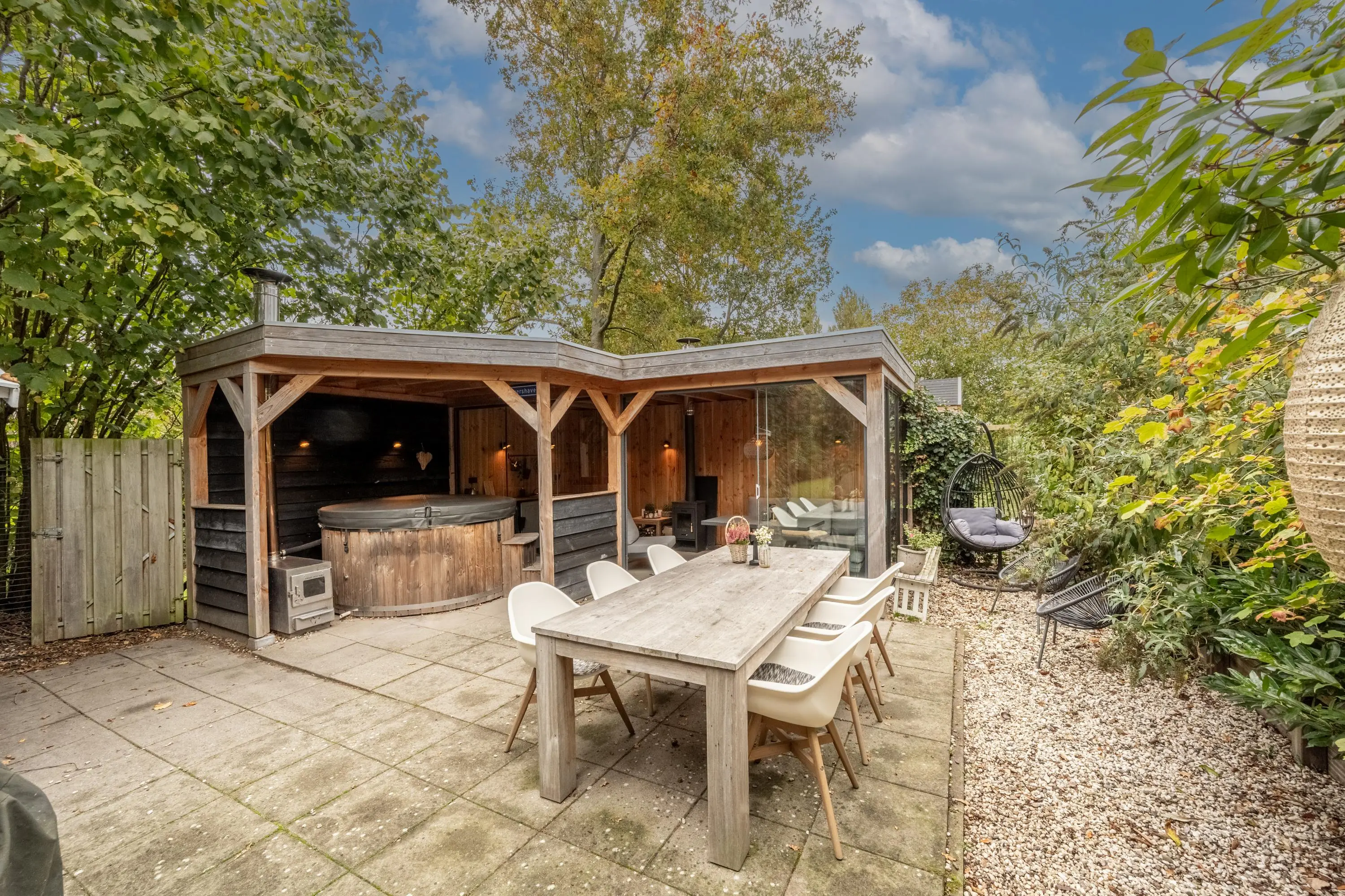 De verzorgde achtertuin biedt volop privacy en diverse zitgelegenheden waar u in alle rust kunt genieten van het buitenleven. Tevens is er een mooie royale overkapping met houtkachel voor gezelligheid en warmte in elk seizoen. Graag benoemen wij de hout gestookte hottub welke in de overkapping aanwezig is.