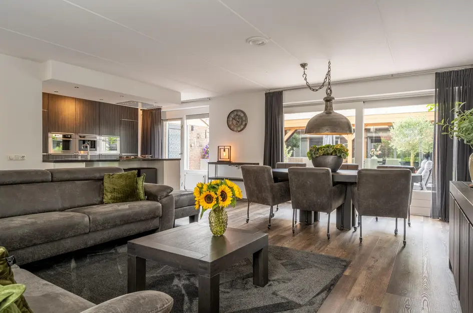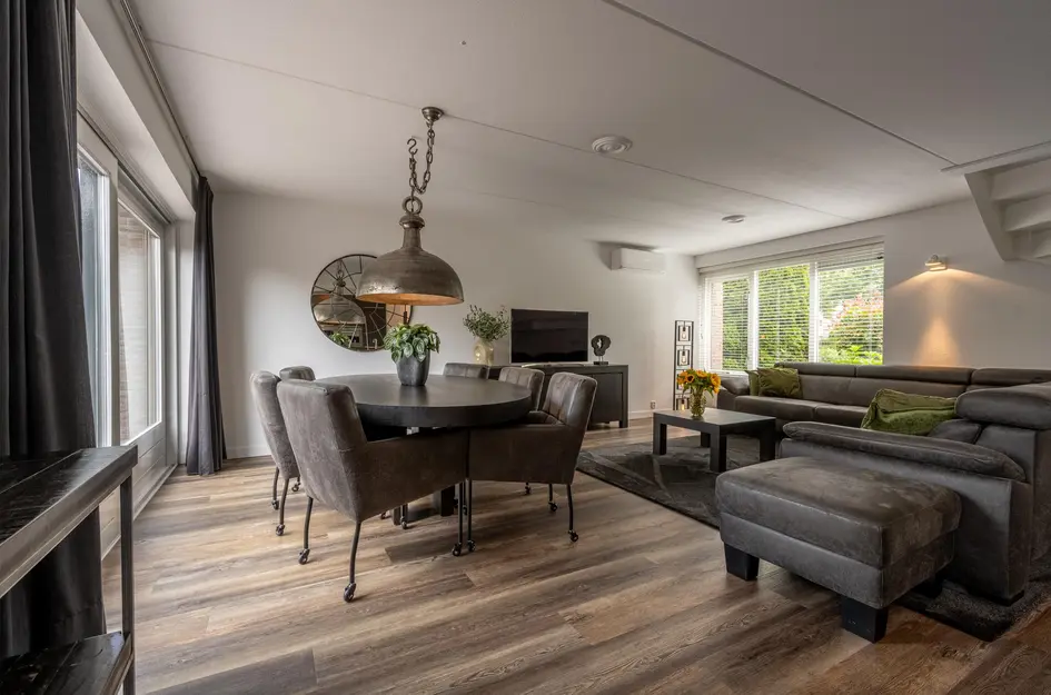 De idyllische woonkamer met eetgedeelte baadt in het licht dankzij de grote raampartijen. De ruimte is voorzien van een airco-installatie en een fijne schuifpui die direct toegang biedt tot de tuin. Het geheel is afgewerkt met een nette PVC-vloer én vloerverwarming.