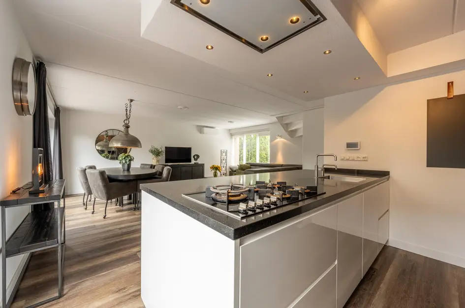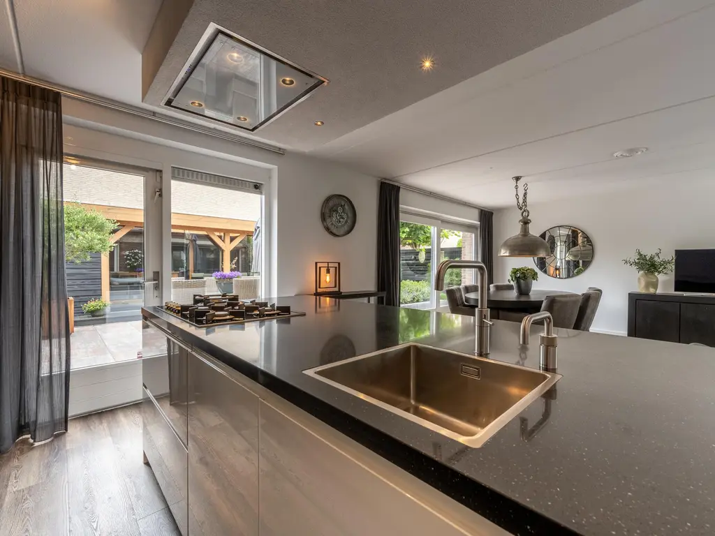 Het kookeiland is voorzien van 5-pits gascomfort in combinatie met stijlvolle ingebouwde plafondafzuiging en spots. Verder zijn een koelkast, vriezer, oven, magnetron, vaatwasser, Quooker en een ingebouwd koffieapparaat aanwezig. Vanuit de keuken is er directe toegang tot de achtertuin.