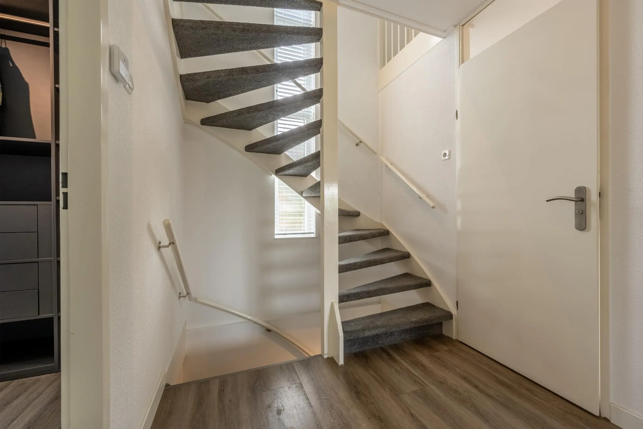 Entree/hal met toegang tot de trapopgang, een nette toiletruimte met zwevend toilet en fonteintje, een complete meterkast, de garage en de woonkamer.