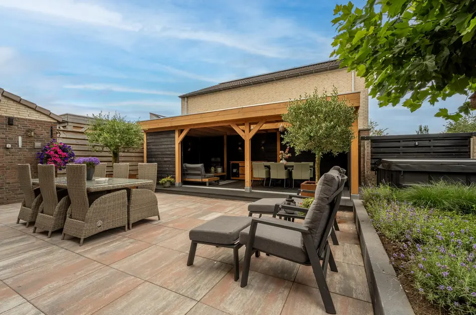Absolute blikvanger is de stijlvolle serre-overkapping met glazen schuifdeuren, voorzien van een lichtkoepel die zorgt voor extra daglicht. De overkapping is ingericht met een comfortabele lounge, een keukenblok met onder meer een wijnkoeler en ook heaters – perfect om ook op koelere dagen volop van het buitenleven te genieten. Kortom een heerlijke tuin die uitnodigt tot ontspanning, elke dag opnieuw.