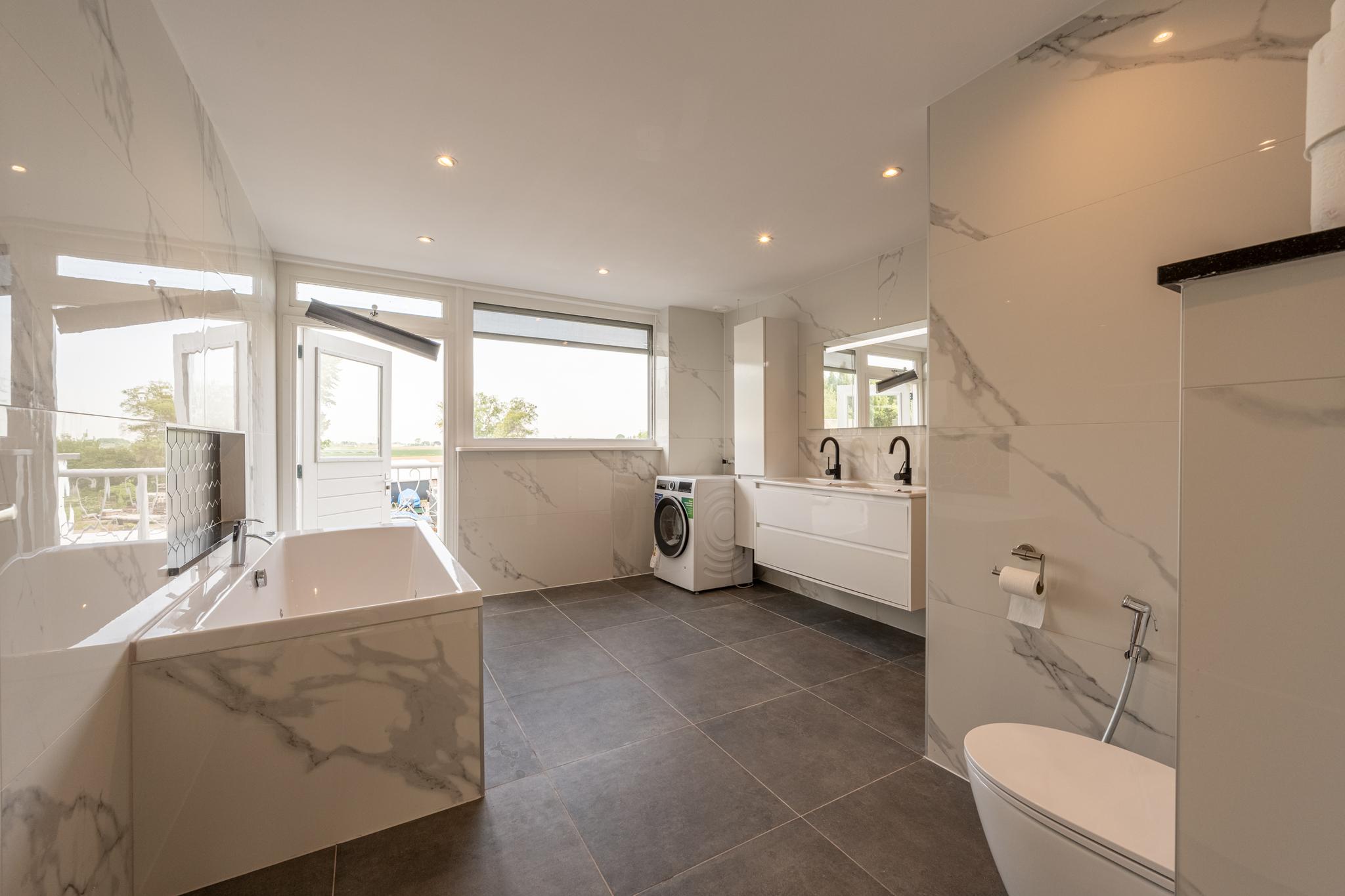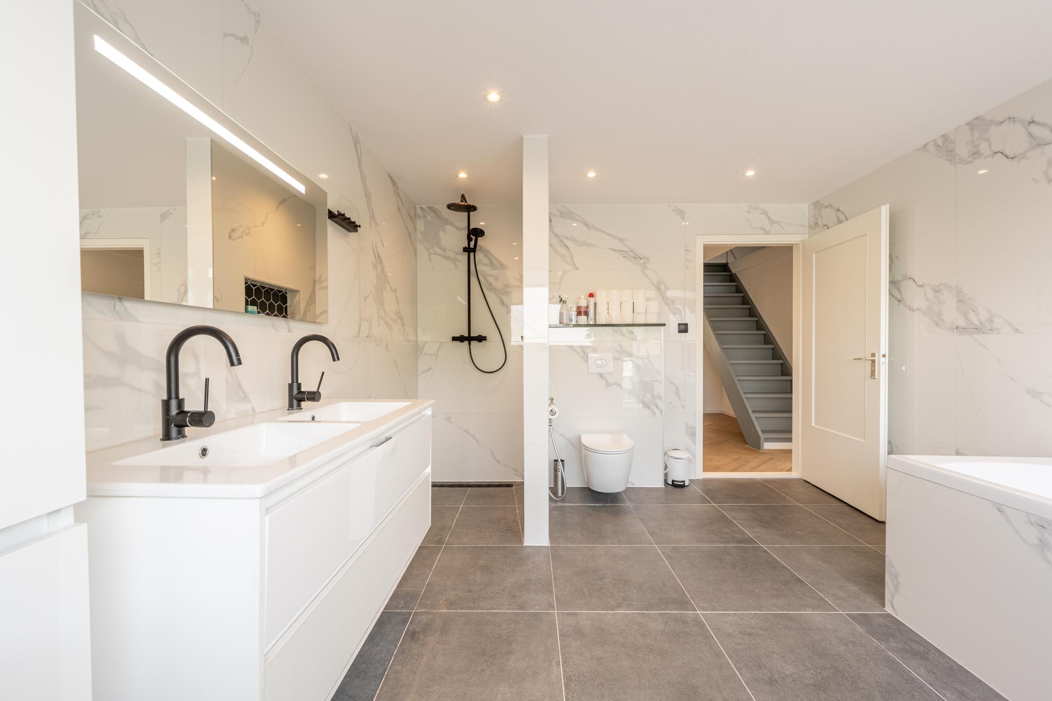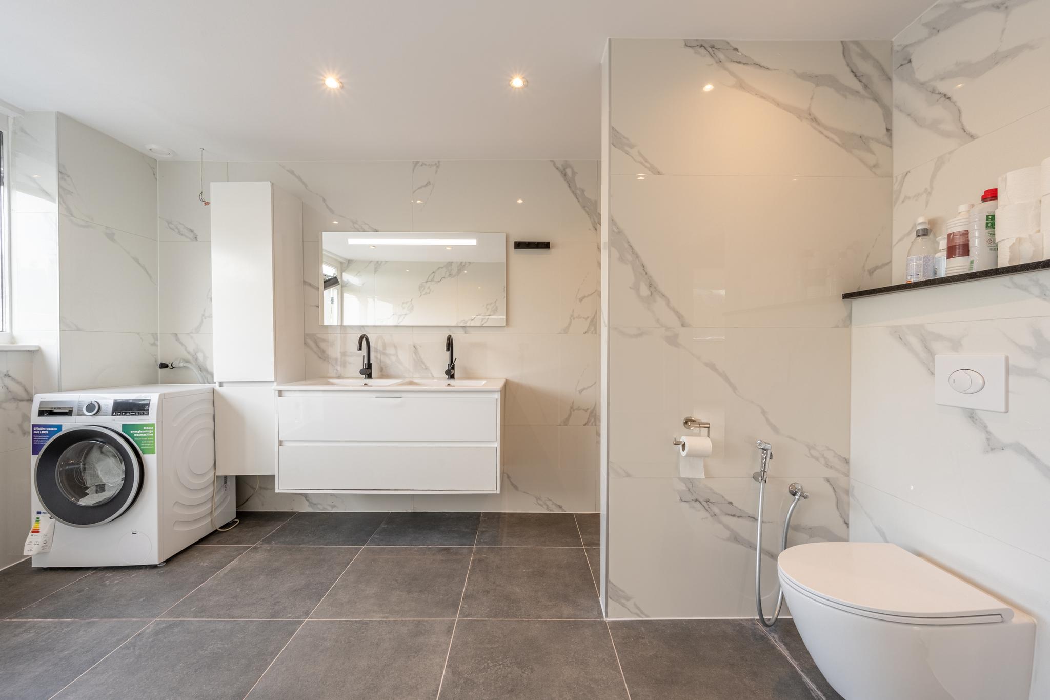 De royale badkamer is stijlvol vormgegeven en volledig betegeld met marmerlook accenten. De badkamer is ingericht met een 2e toilet, een wastafelmeubel met dubbele wastafel, een ligbad met jetstreams, een ruime inloopdouche met stortdouche en de aansluitingen voor de wasapparatuur. Via de badkamer is er directe toegang tot het balkon, wat een gevoel van extra ruimte en luxe biedt.