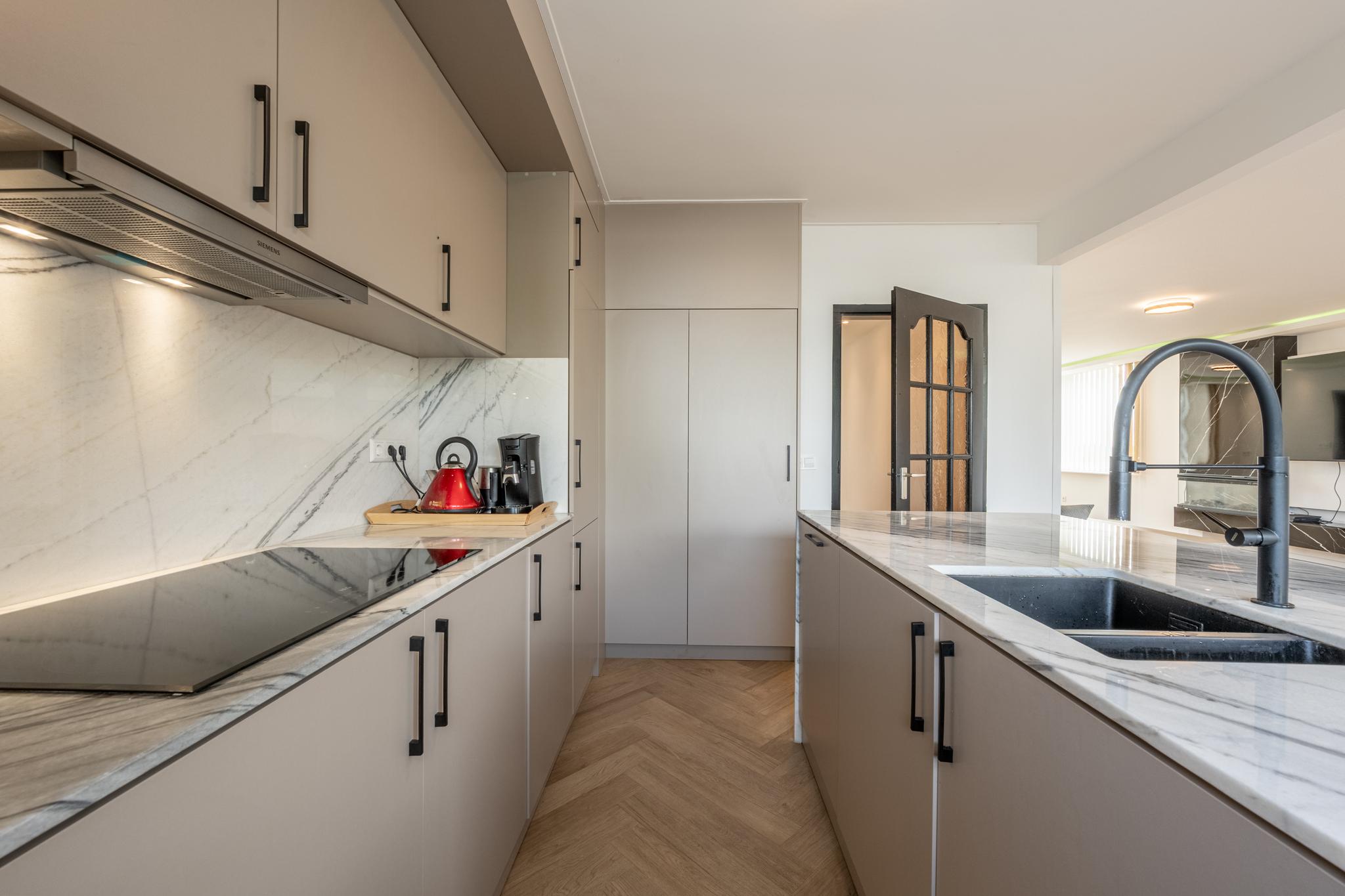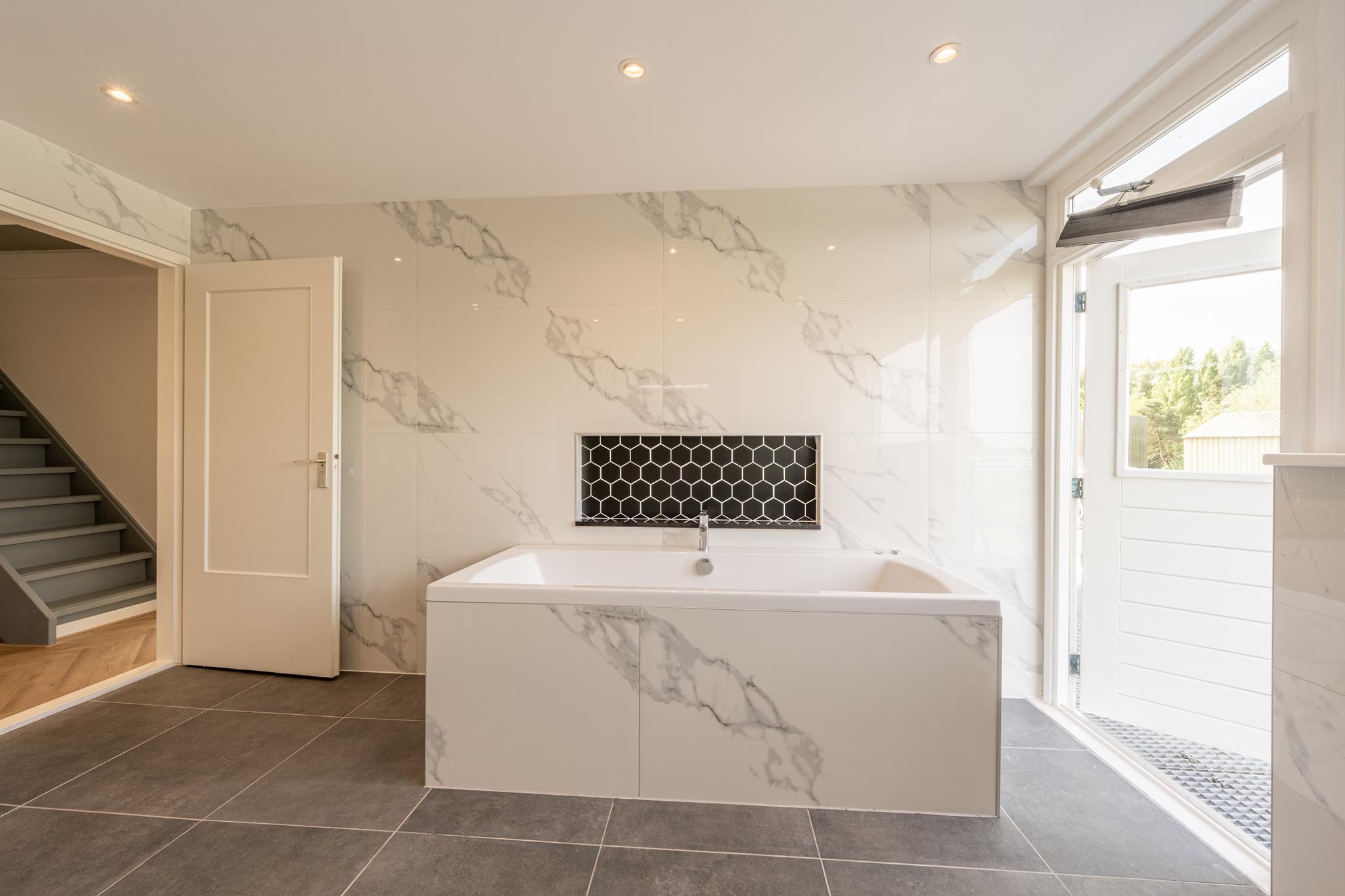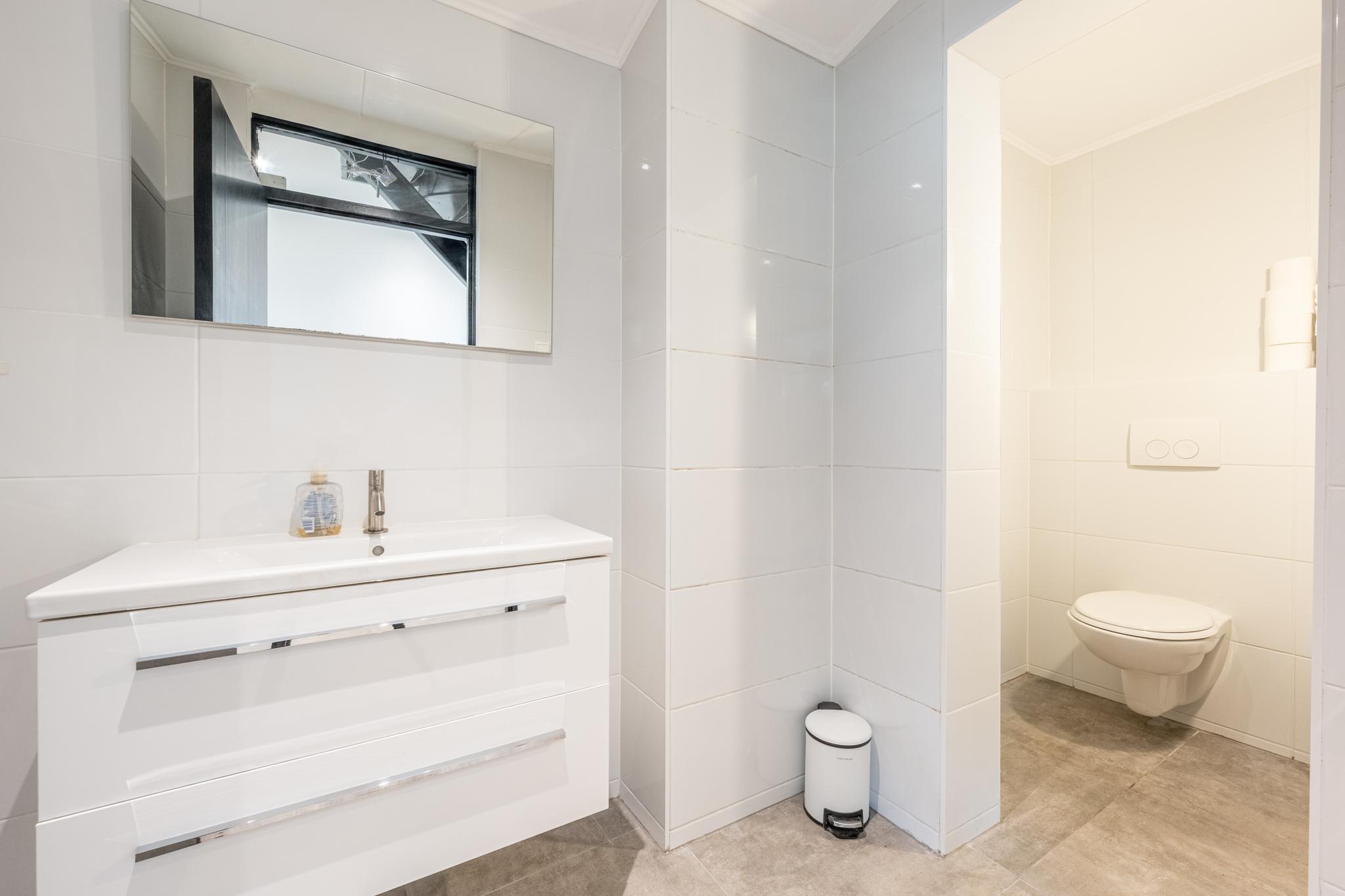 De royale badkamer is stijlvol vormgegeven en volledig betegeld met marmerlook accenten. De badkamer is ingericht met een 2e toilet, een wastafelmeubel met dubbele wastafel, een ligbad met jetstreams, een ruime inloopdouche met stortdouche en de aansluitingen voor de wasapparatuur. Via de badkamer is er directe toegang tot het balkon, wat een gevoel van extra ruimte en luxe biedt.